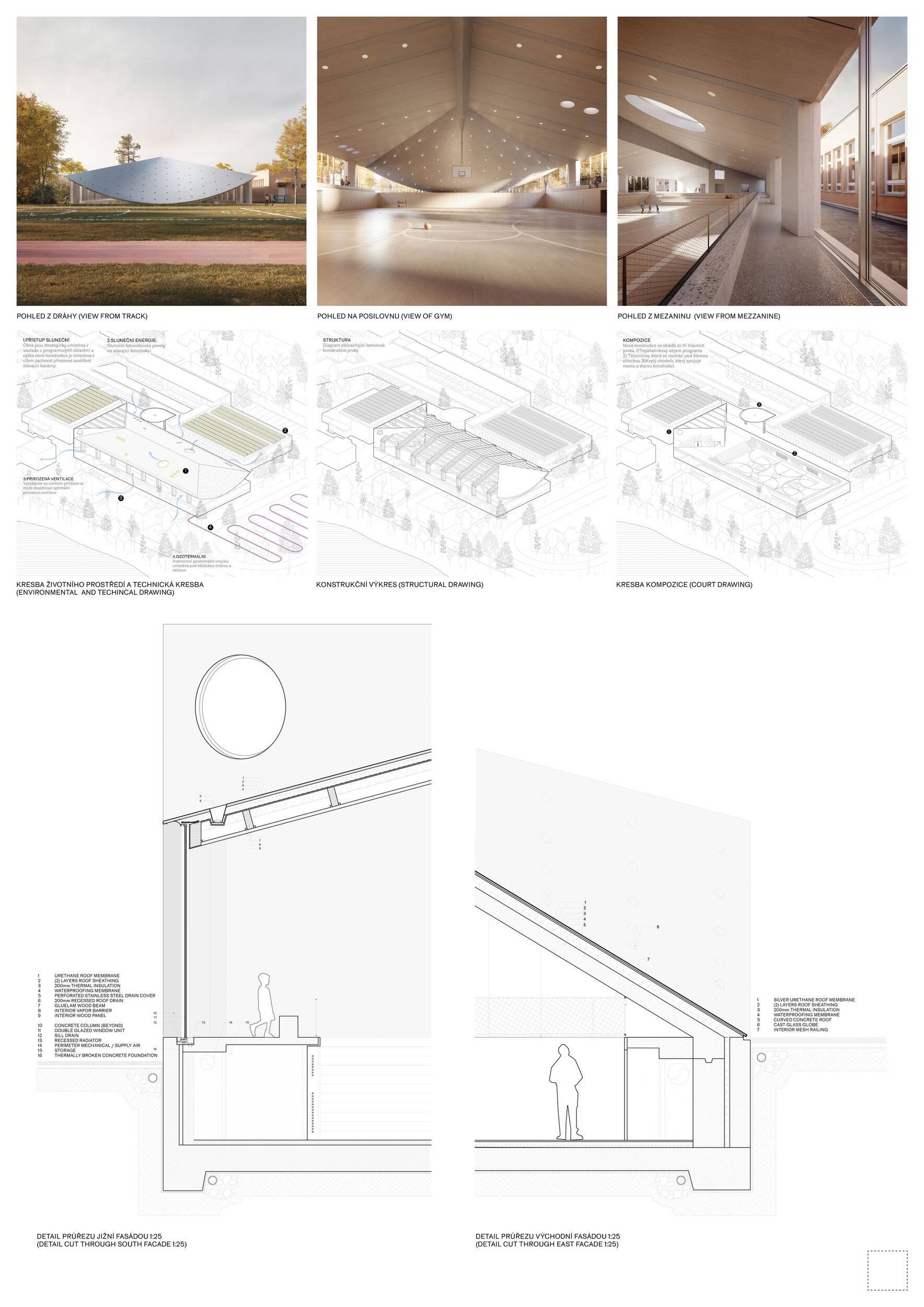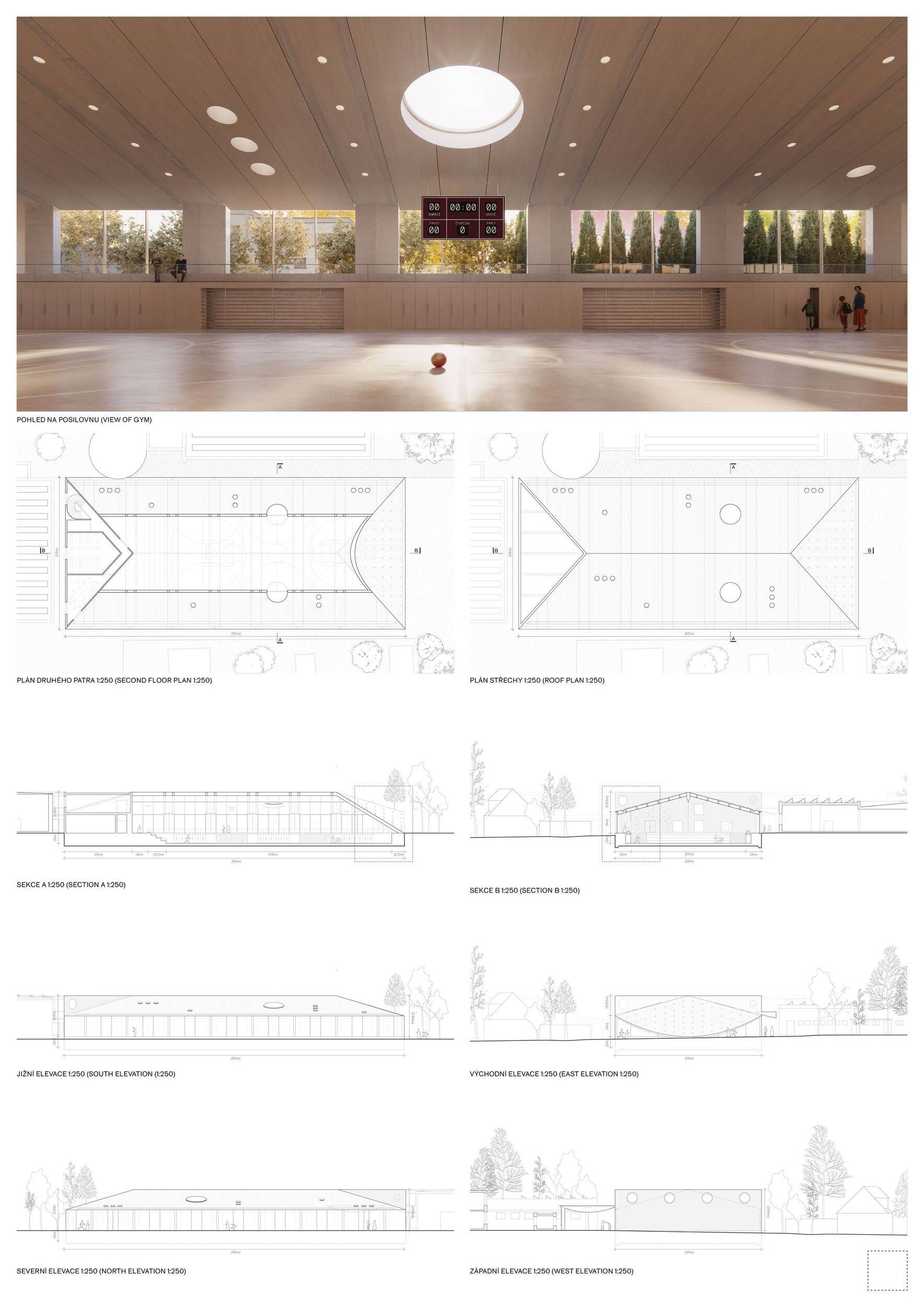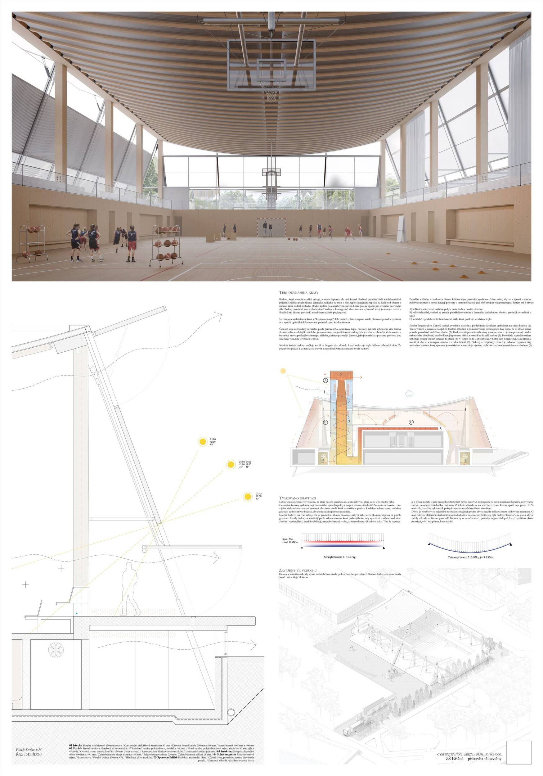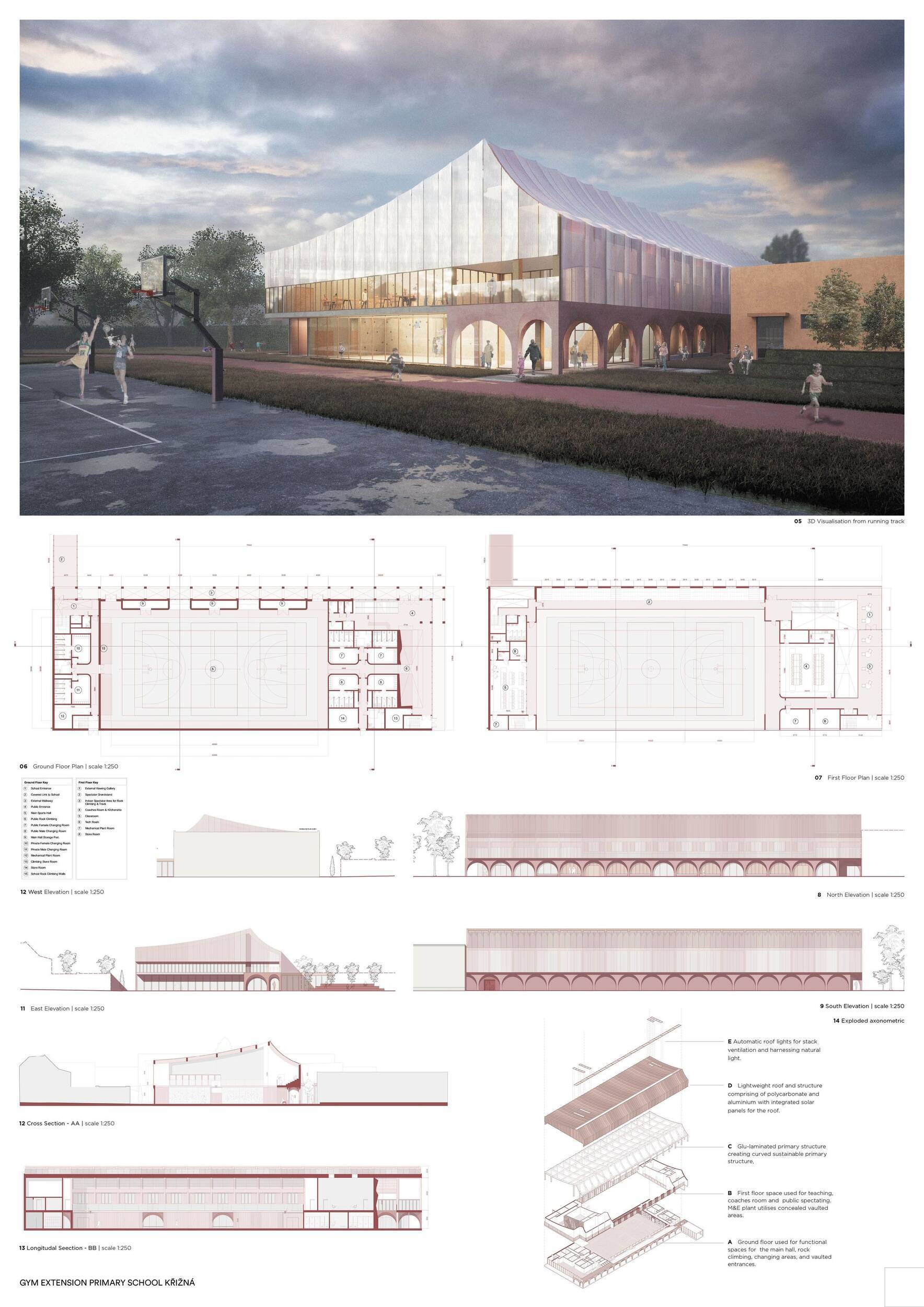 Návrh umisťuje budovu vedle jídelny. Stavba se odehrává na obdélníkovém nekomplikovaném půdoryse. S elegancí kombinuje betonovou podnož, dřevěný nosný konstrukční systém a lehký obvodový plášť. Její vzhled je skromný, s velmi dobře čitelnou konstrukcí, která do celkového vzhledu vnáší příjemný detail. Umístění budovy bylo vyhodnoceno jako vhodné, ovšem jeho negativem je problematické zajištění přístupu pro žáky. Propojení otevřenou pasáží nebylo porotou hodnoceno kladně, bylo upřednostňováno zajištění přístupu žáků „suchou nohou“. Návrh pracuje s terénem a zapouští halu o jedno podlaží, díky čemuž zajistí potřebnou vnitřní světlou výšku, aniž by hala výrazně čněla nad okolními domy. Navržené vizuální propojení z ulice Křižná má potenciál fungovat jako možná atrakce pro kolemjdoucí. Porota ocenila práci s propojením obytné zástavby s břehem řeky a vzniklý předprostor před budovou směrem ke stávajícímu dětskému hřišti. Krajinářsky se jedná o příjemné řešení se zachováním stávajících stromů a jejich citlivým doplněním. Vyvážené, harmonické, pozitivní.