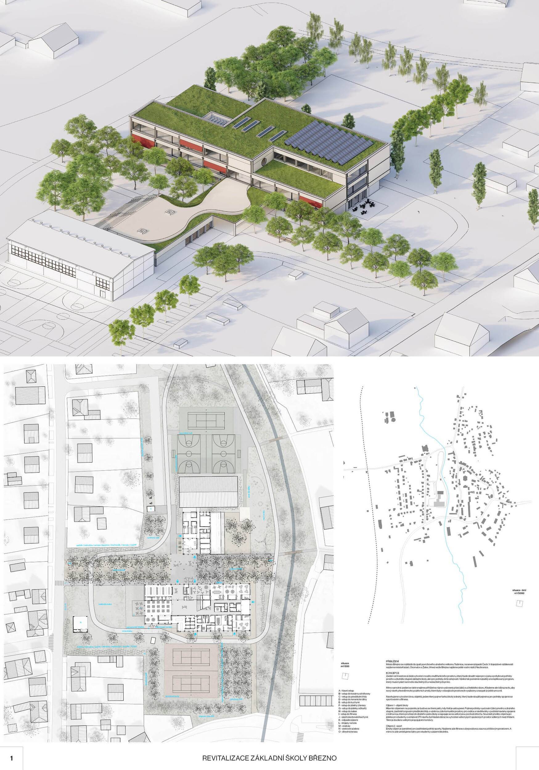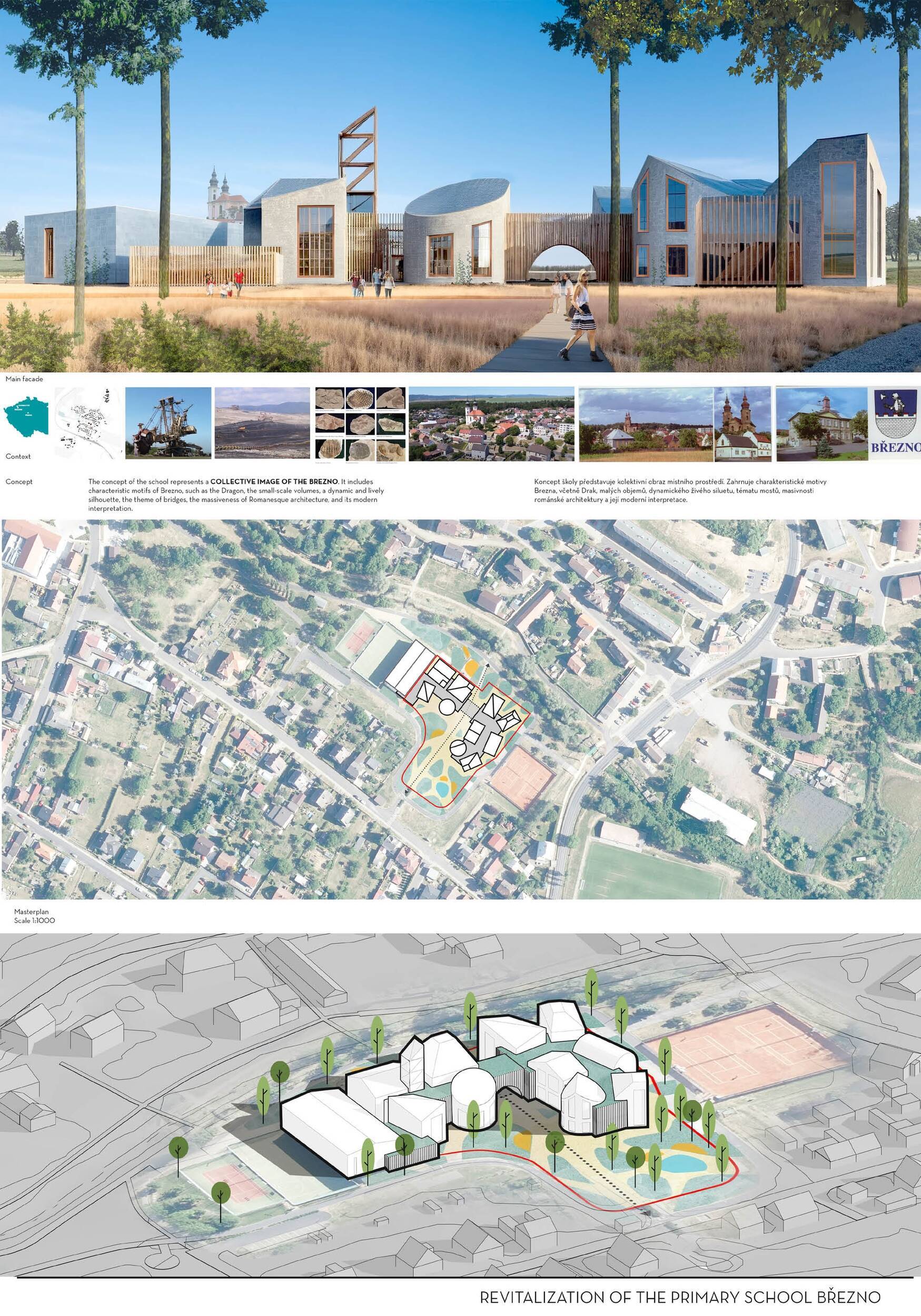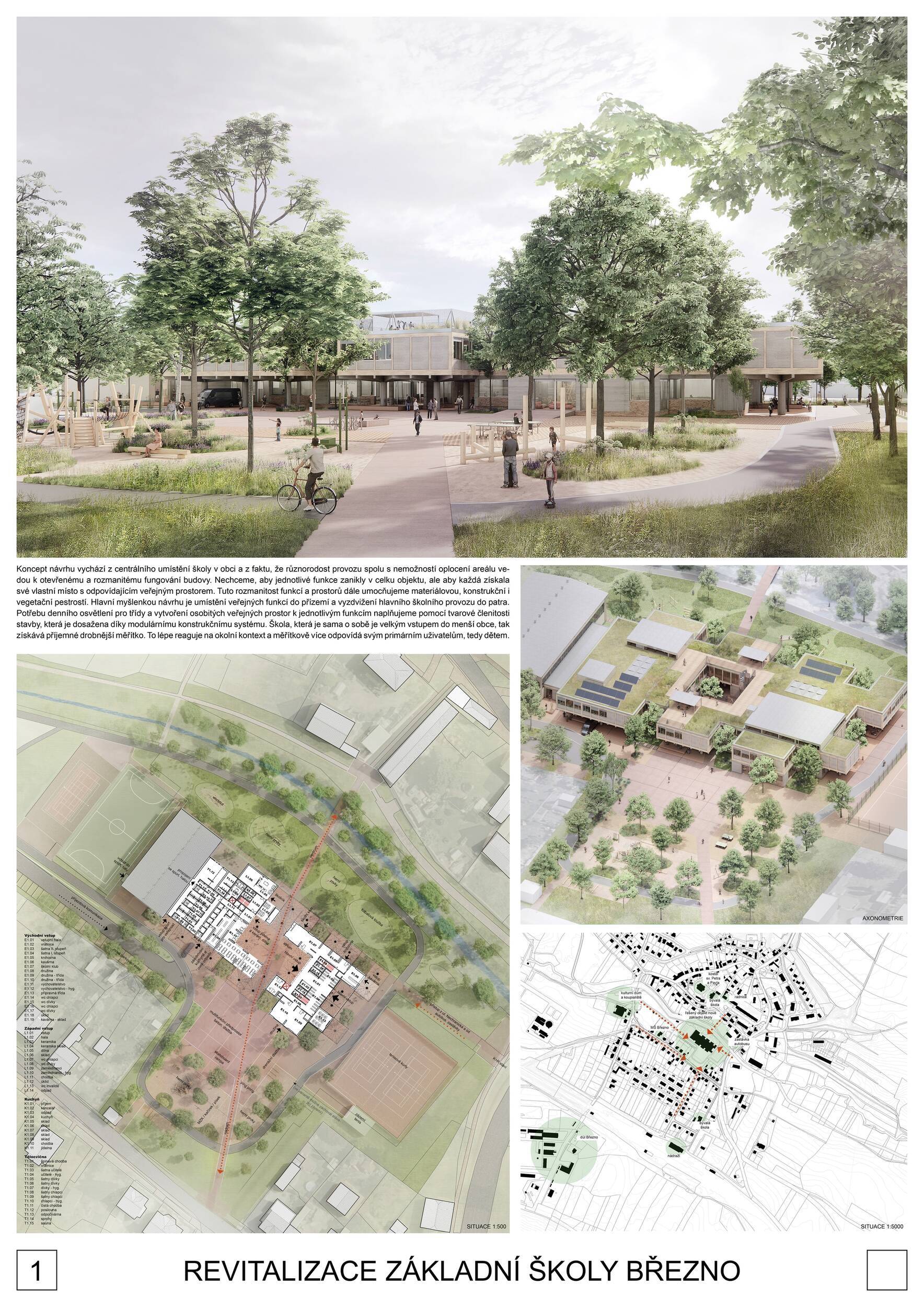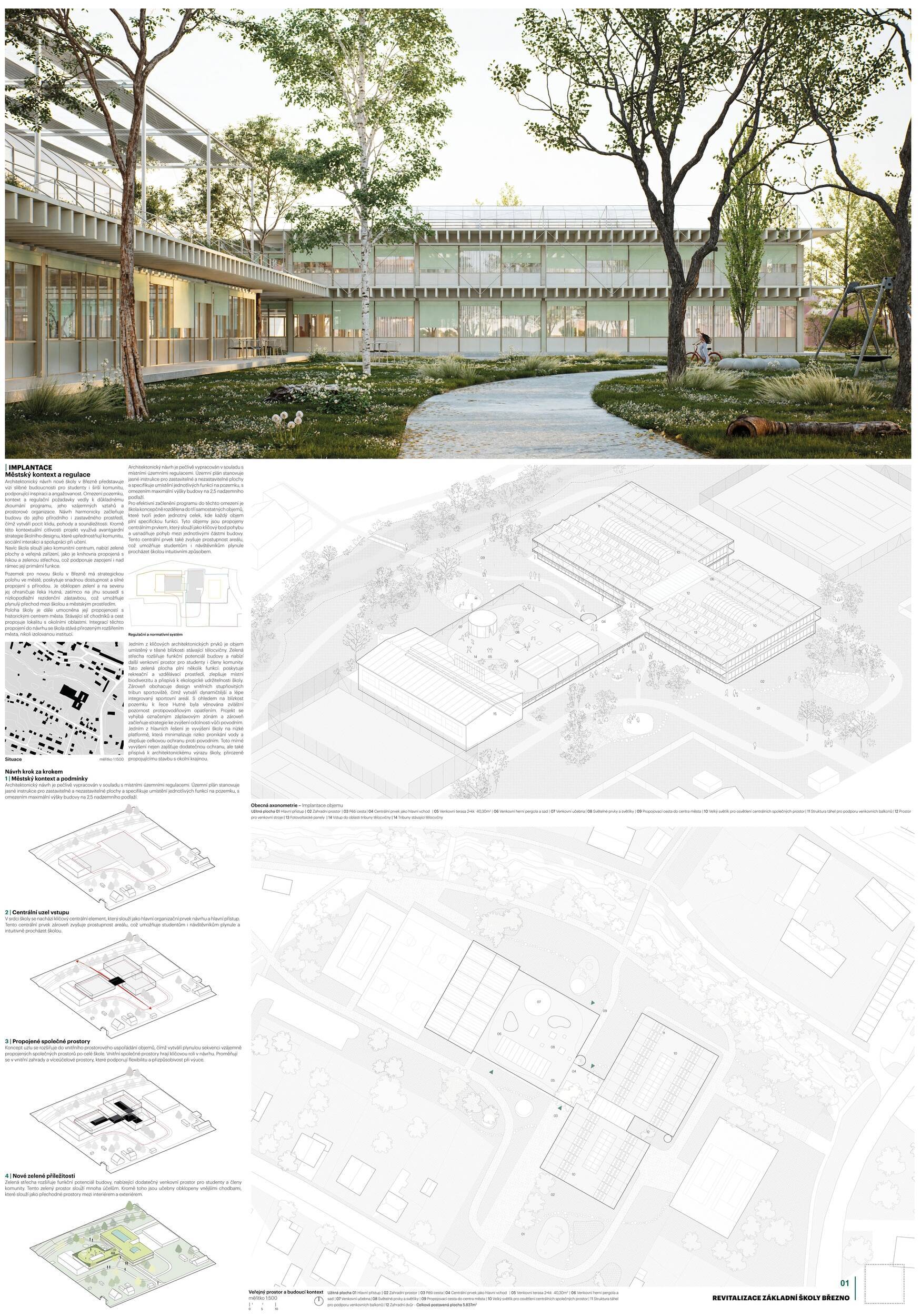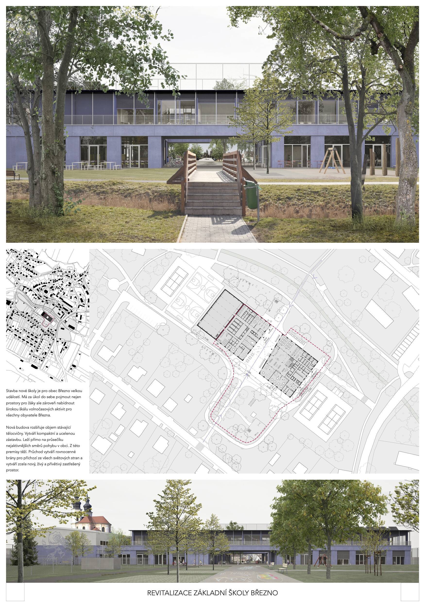 Návrh představuje dobře promyšlené řešení, které reaguje na poptávku nejen po nové škole, ale vlastně i lokální centrum obce. Jedná se o kompaktní dvoupodlažní budovu, která logicky navazuje na stávající tělocvičnu a je orientovaná podél potoka Hutná. V přízemí je objem budovy rozdělen na dvě části dostatečně prostorným a částečně krytým průchodem, na který jsou na jedné straně provozně navázány funkce jako knihovna, kavárna, v návaznosti pak posilovna, sauna, tělocvična. Do průchodu – veřejného prostoru – je také orientovaný hlavní vstup do školy, jídelna a družina. Tento prostor má ambice obohatit život v Březně. Ve druhém nadzemním podlaží se nachází třídy a jejich zázemí.