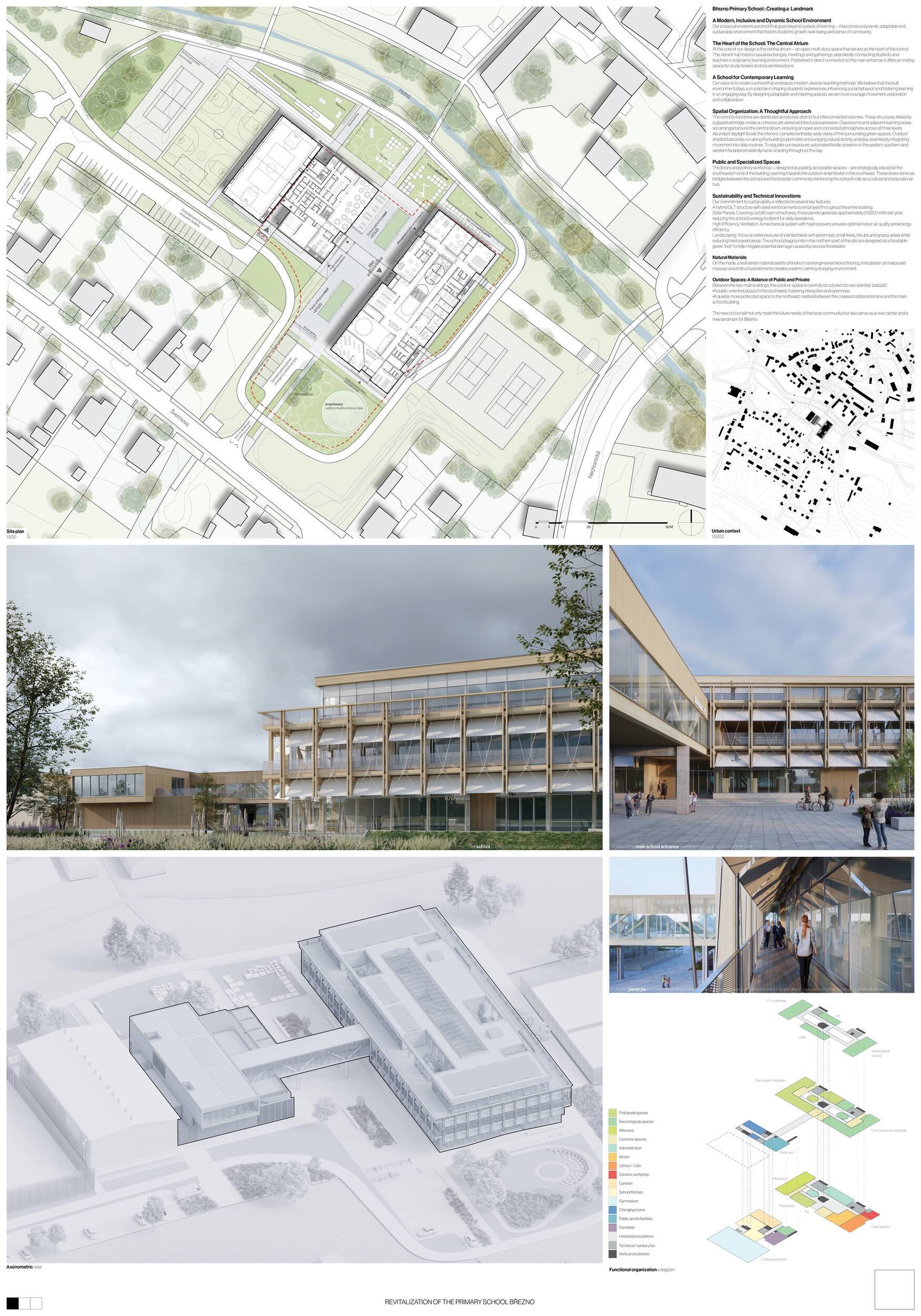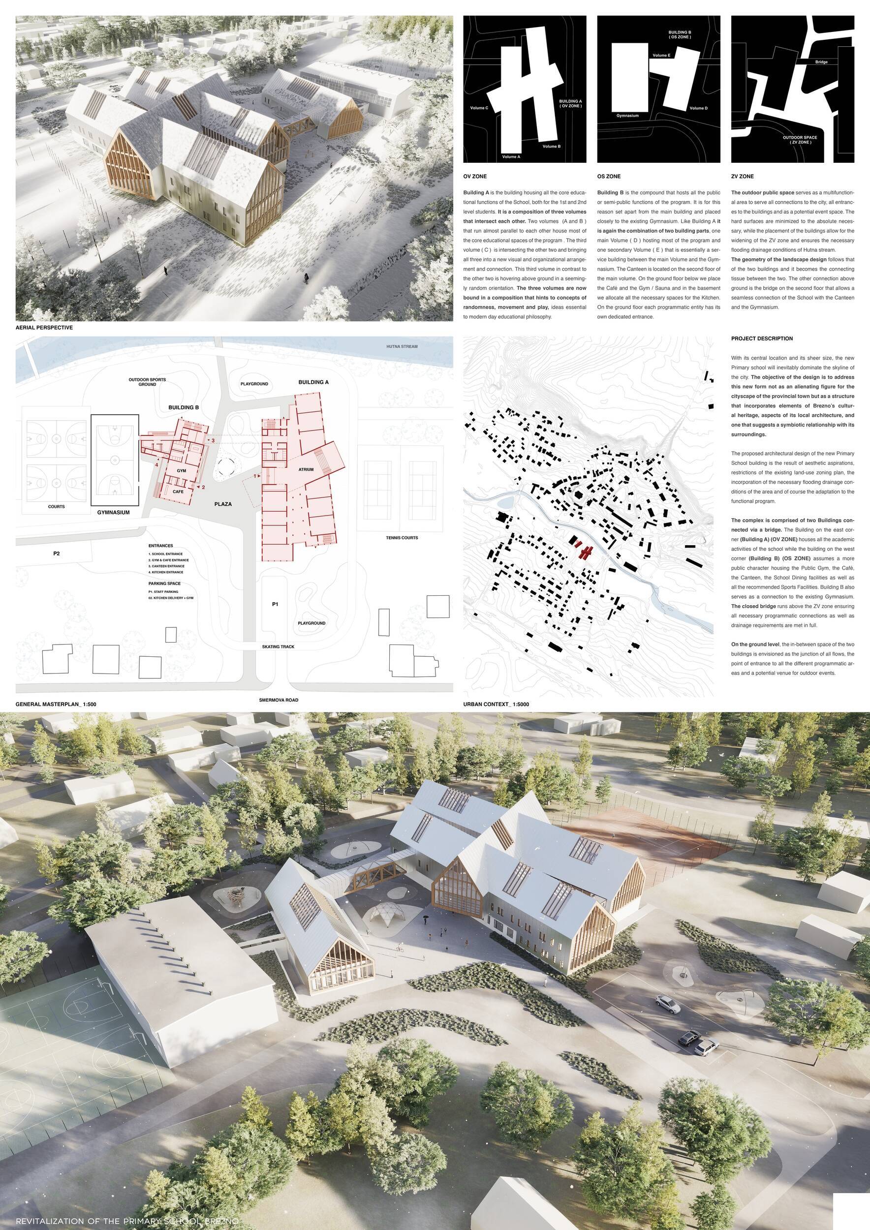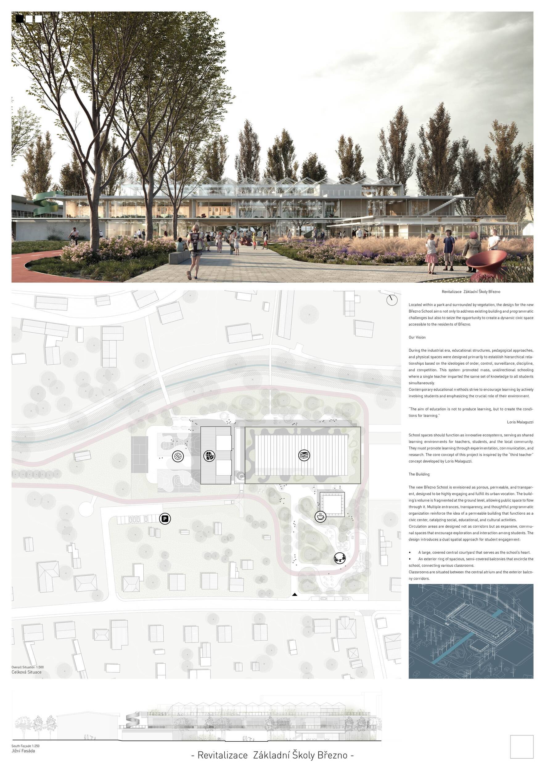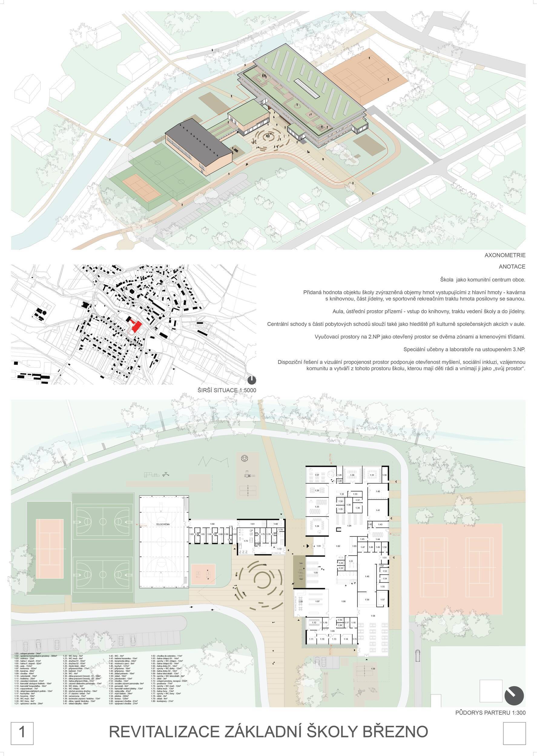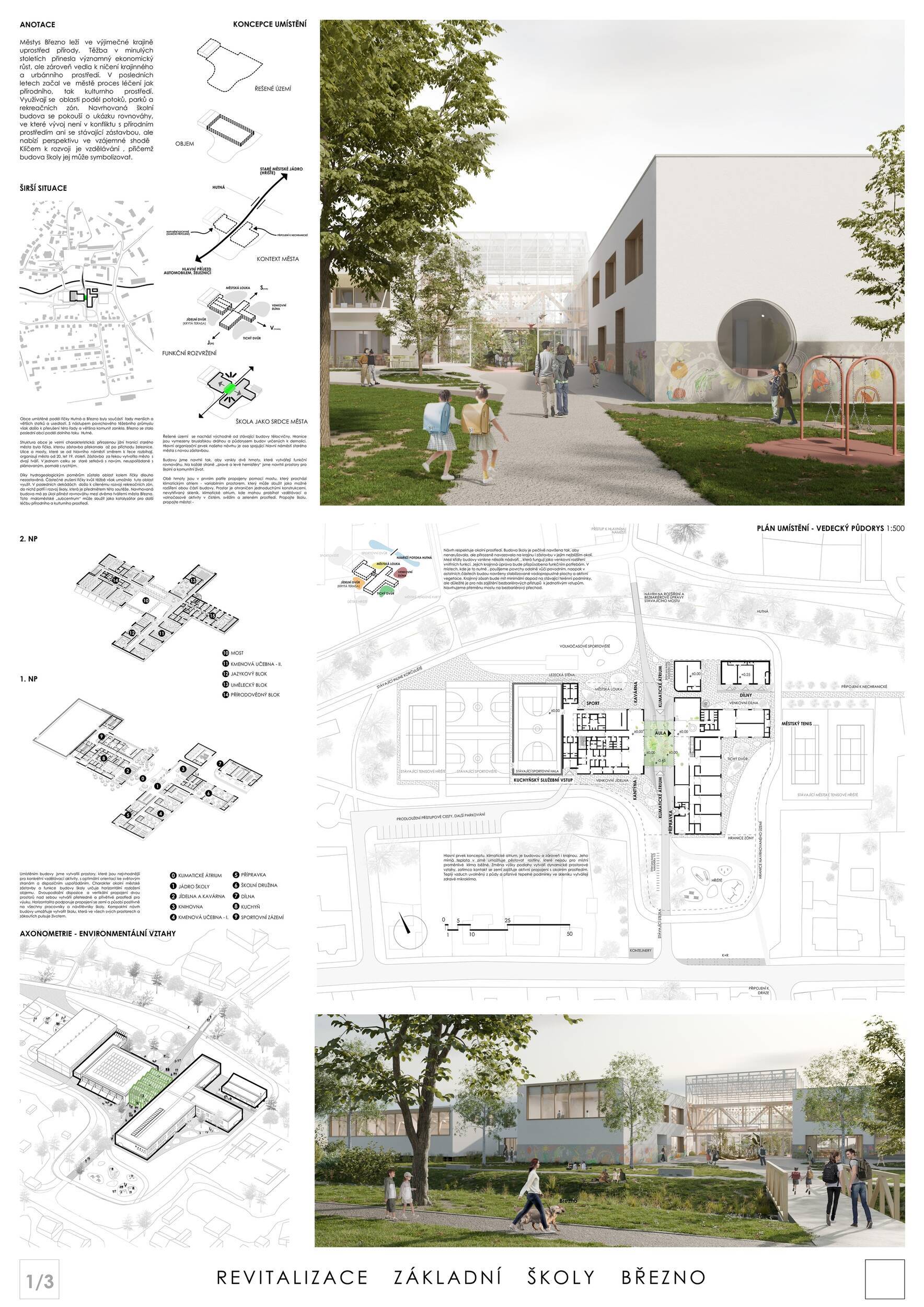 Návrh představuje dobře promyšlené řešení, které reaguje na poptávku nejen po nové škole, ale vlastně i lokální centrum obce. Jedná se o kompaktní dvoupodlažní budovu, která logicky navazuje na stávající tělocvičnu a je orientovaná podél potoka Hutná. V přízemí je objem budovy rozdělen na dvě části dostatečně prostorným a částečně krytým průchodem, na který jsou na jedné straně provozně navázány funkce jako knihovna, kavárna, v návaznosti pak posilovna, sauna, tělocvična. Do průchodu – veřejného prostoru – je také orientovaný hlavní vstup do školy, jídelna a družina. Tento prostor má ambice obohatit život v Březně. Ve druhém nadzemním podlaží se nachází třídy a jejich zázemí.