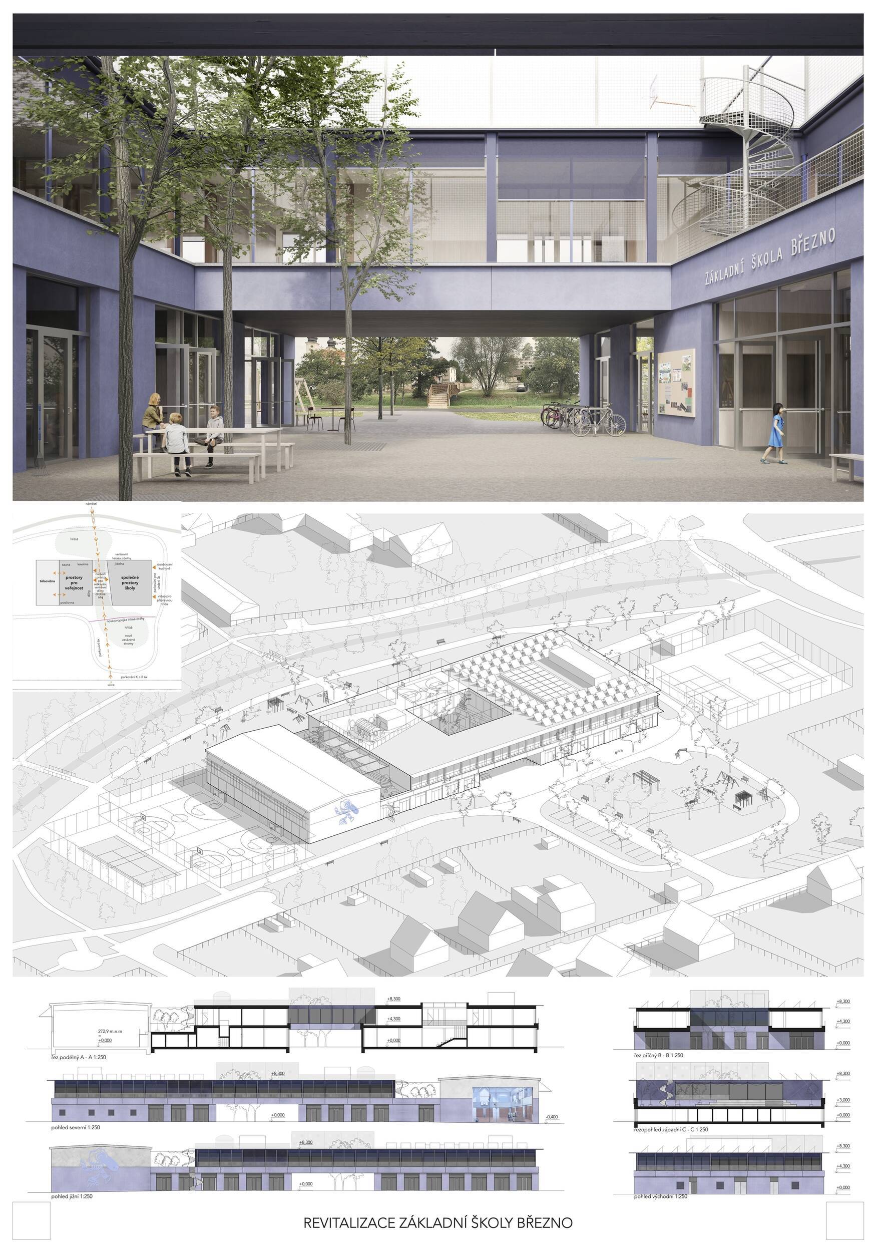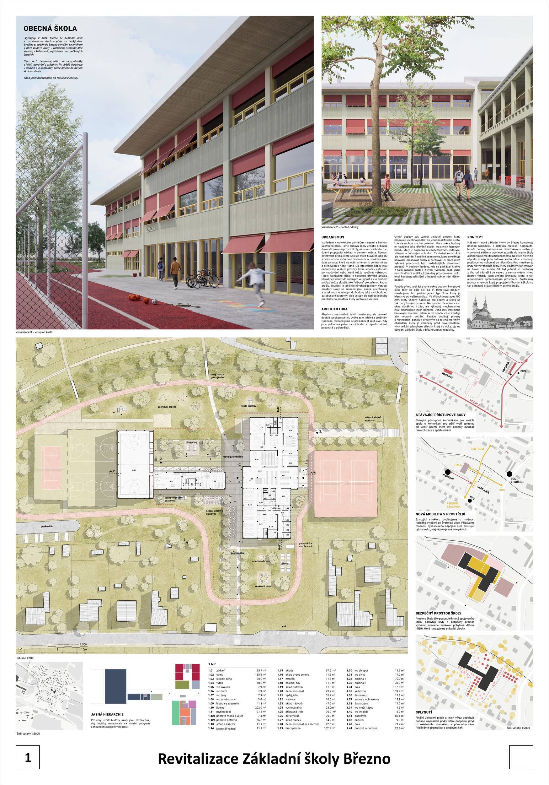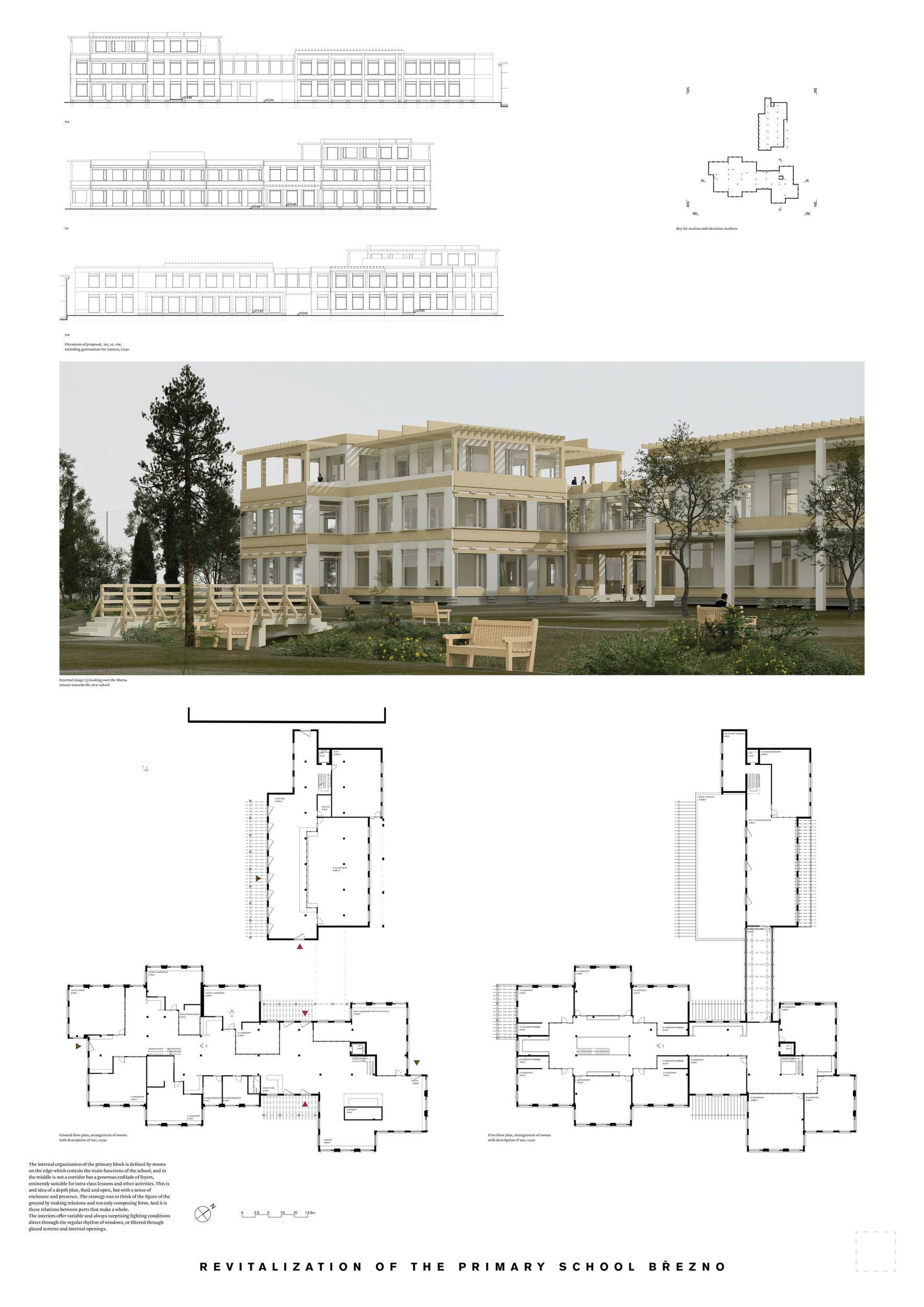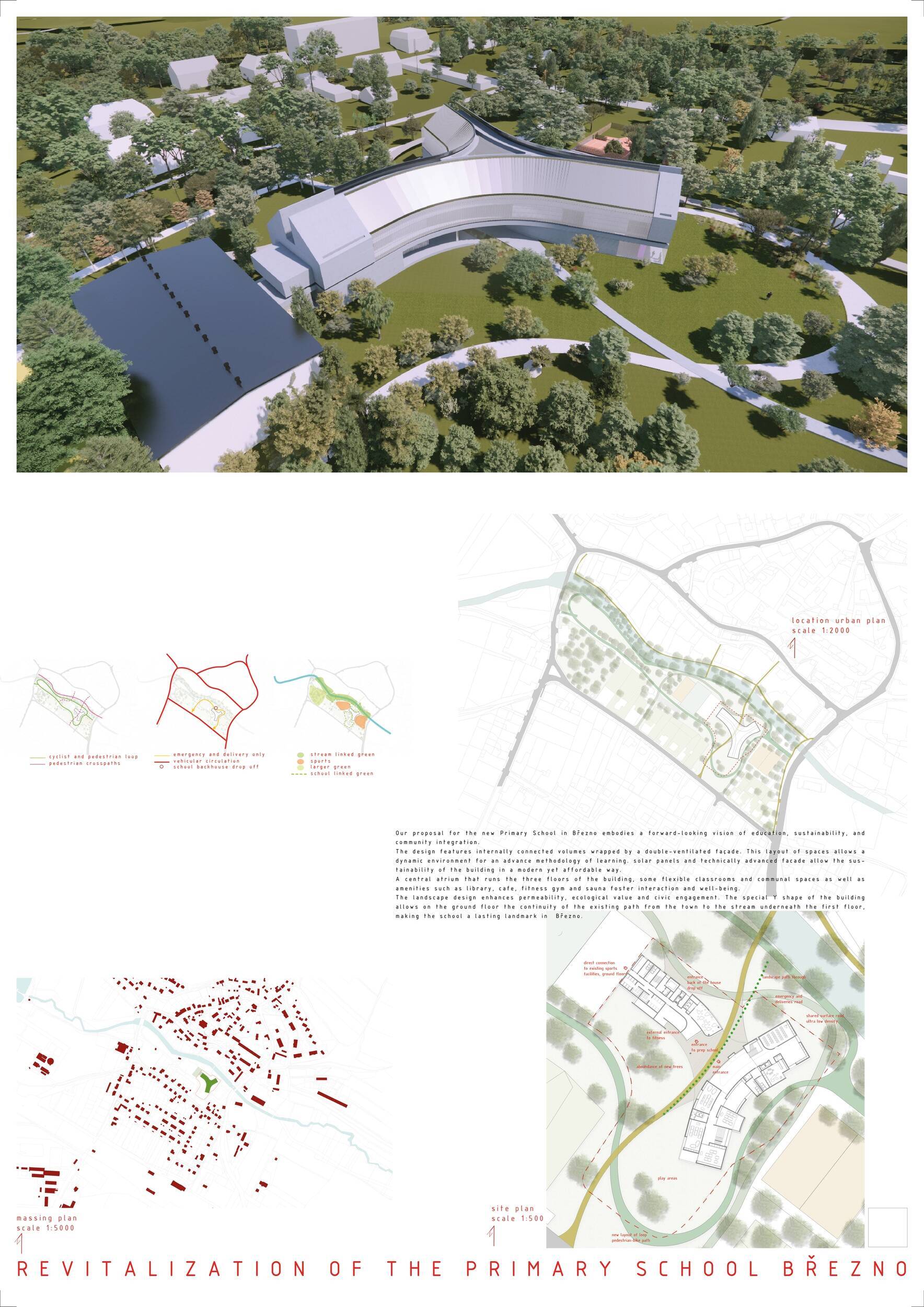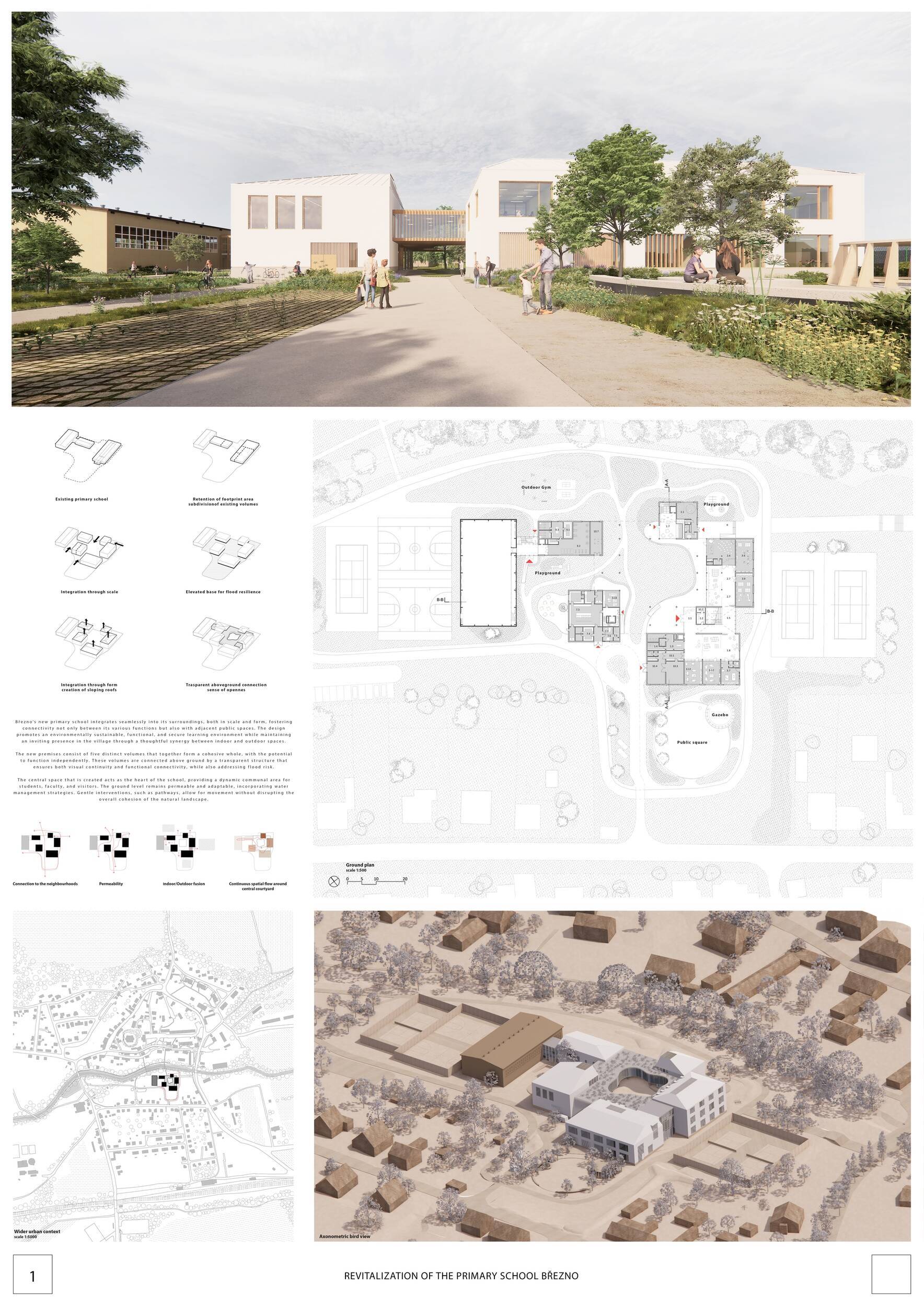 Návrh představuje dobře promyšlené řešení, které reaguje na poptávku nejen po nové škole, ale vlastně i lokální centrum obce. Jedná se o kompaktní dvoupodlažní budovu, která logicky navazuje na stávající tělocvičnu a je orientovaná podél potoka Hutná. V přízemí je objem budovy rozdělen na dvě části dostatečně prostorným a částečně krytým průchodem, na který jsou na jedné straně provozně navázány funkce jako knihovna, kavárna, v návaznosti pak posilovna, sauna, tělocvična. Do průchodu – veřejného prostoru – je také orientovaný hlavní vstup do školy, jídelna a družina. Tento prostor má ambice obohatit život v Březně. Ve druhém nadzemním podlaží se nachází třídy a jejich zázemí.