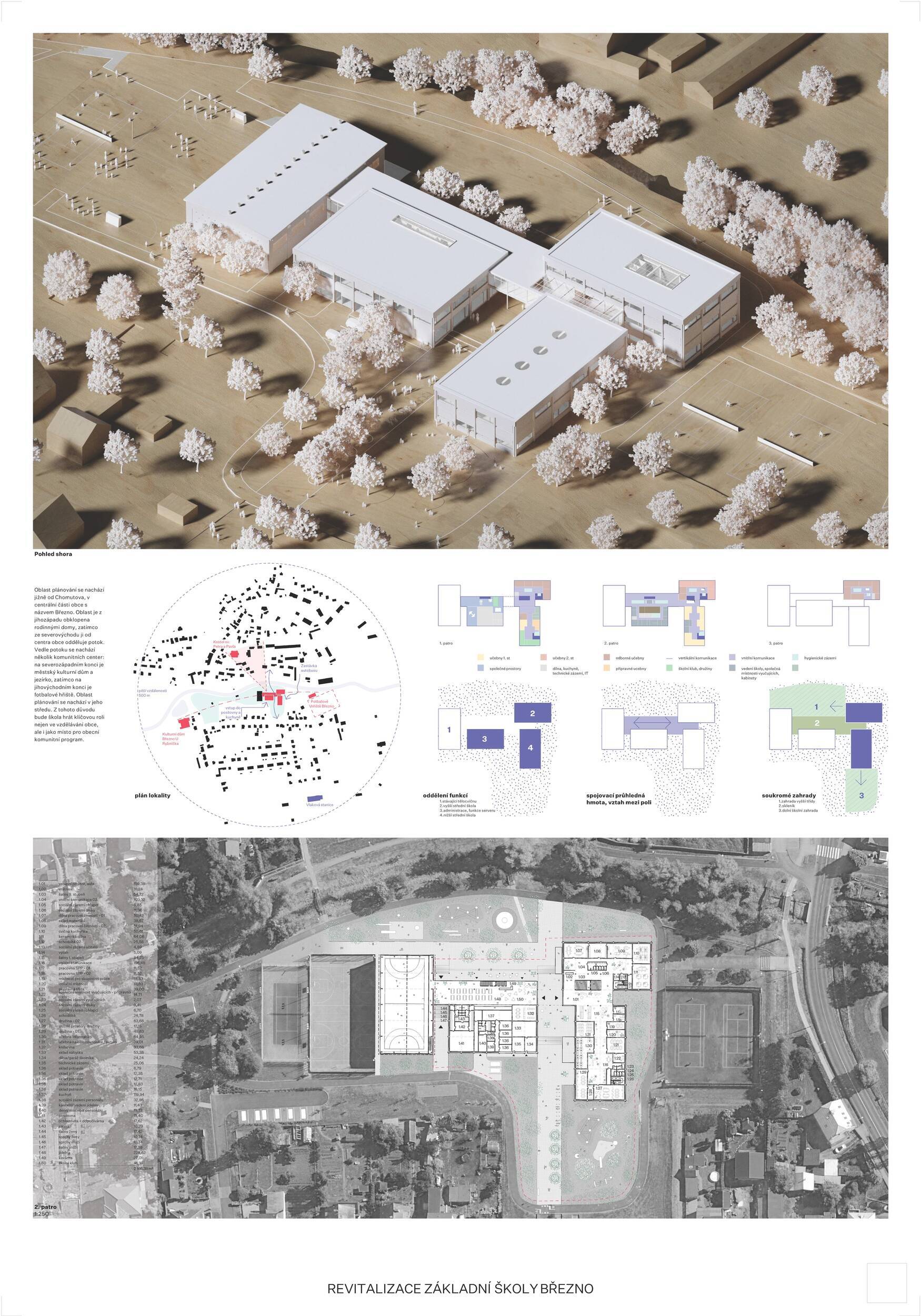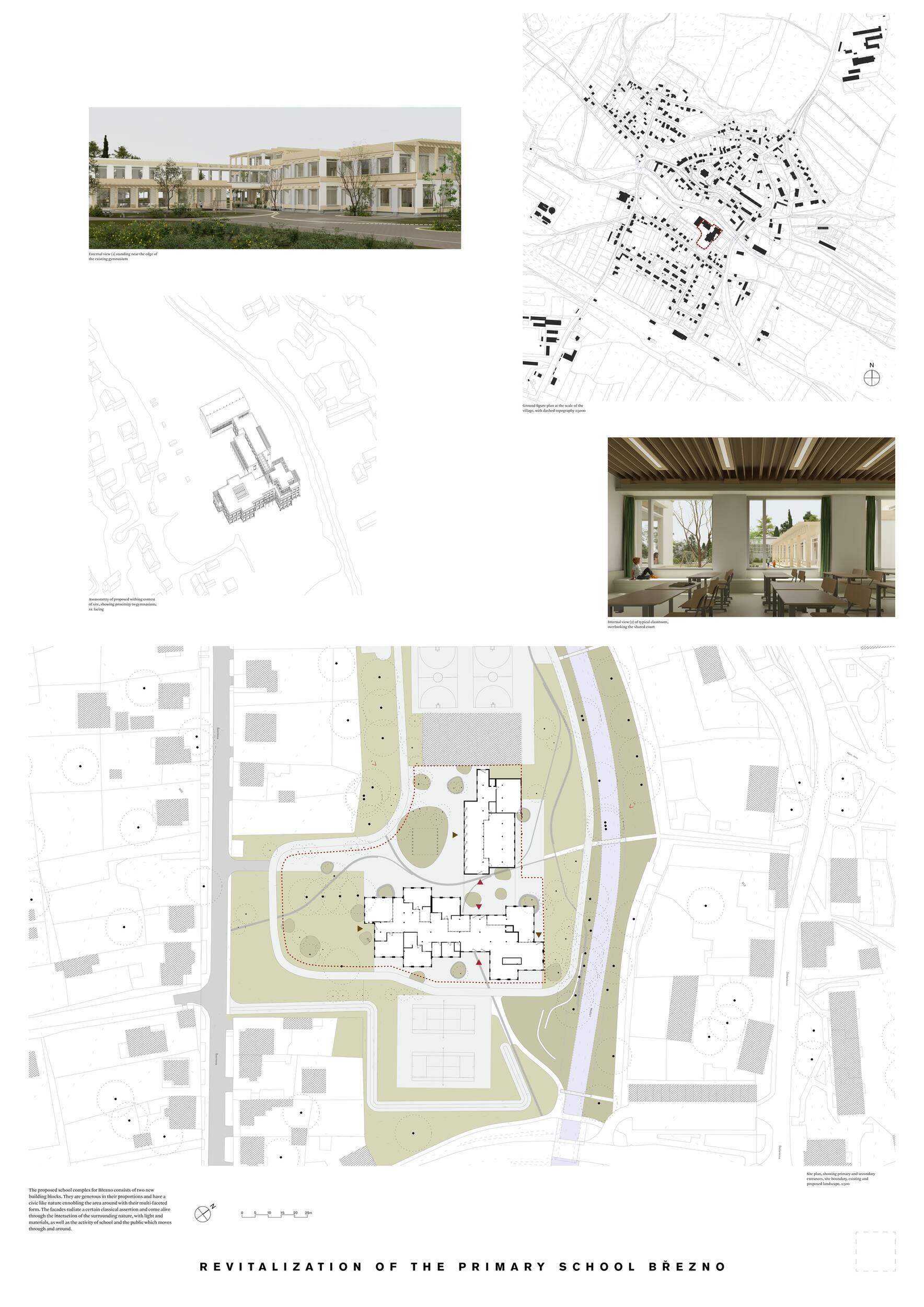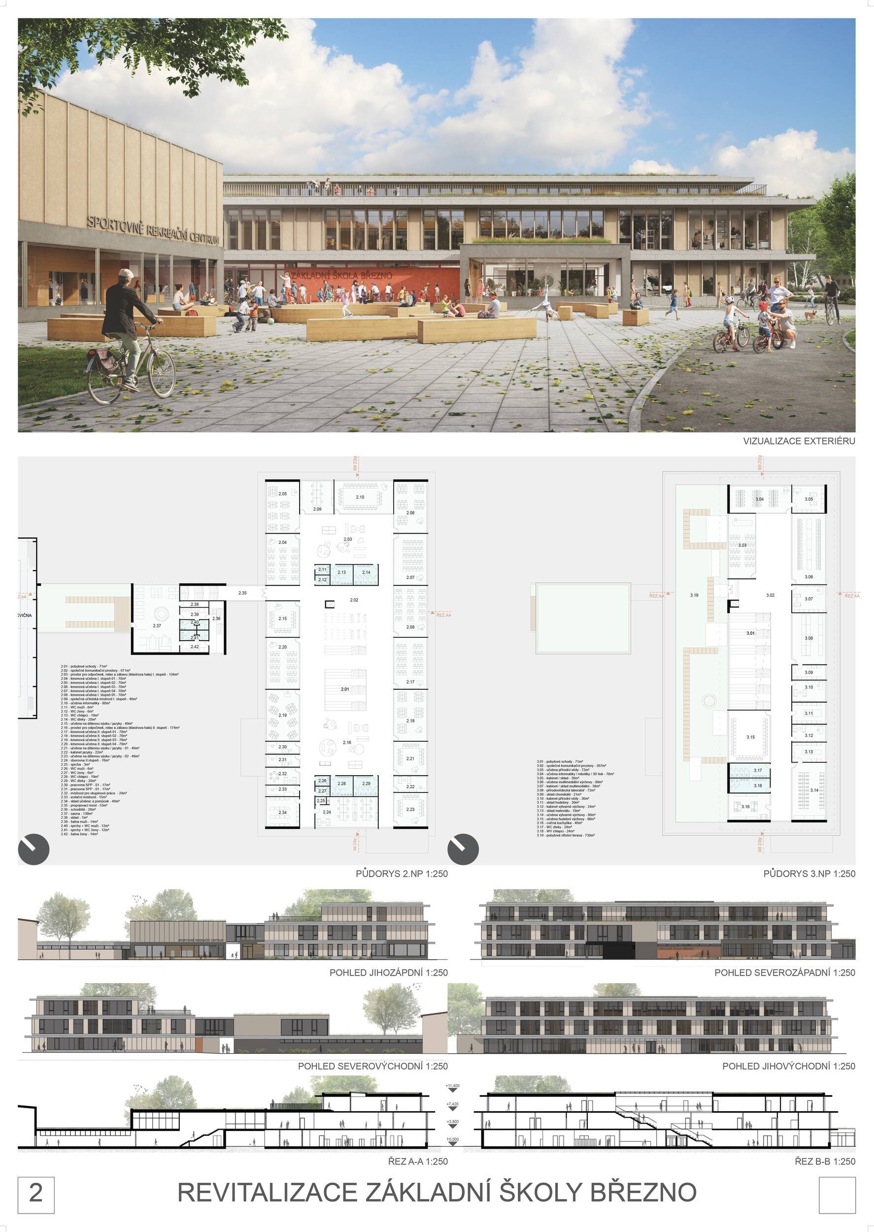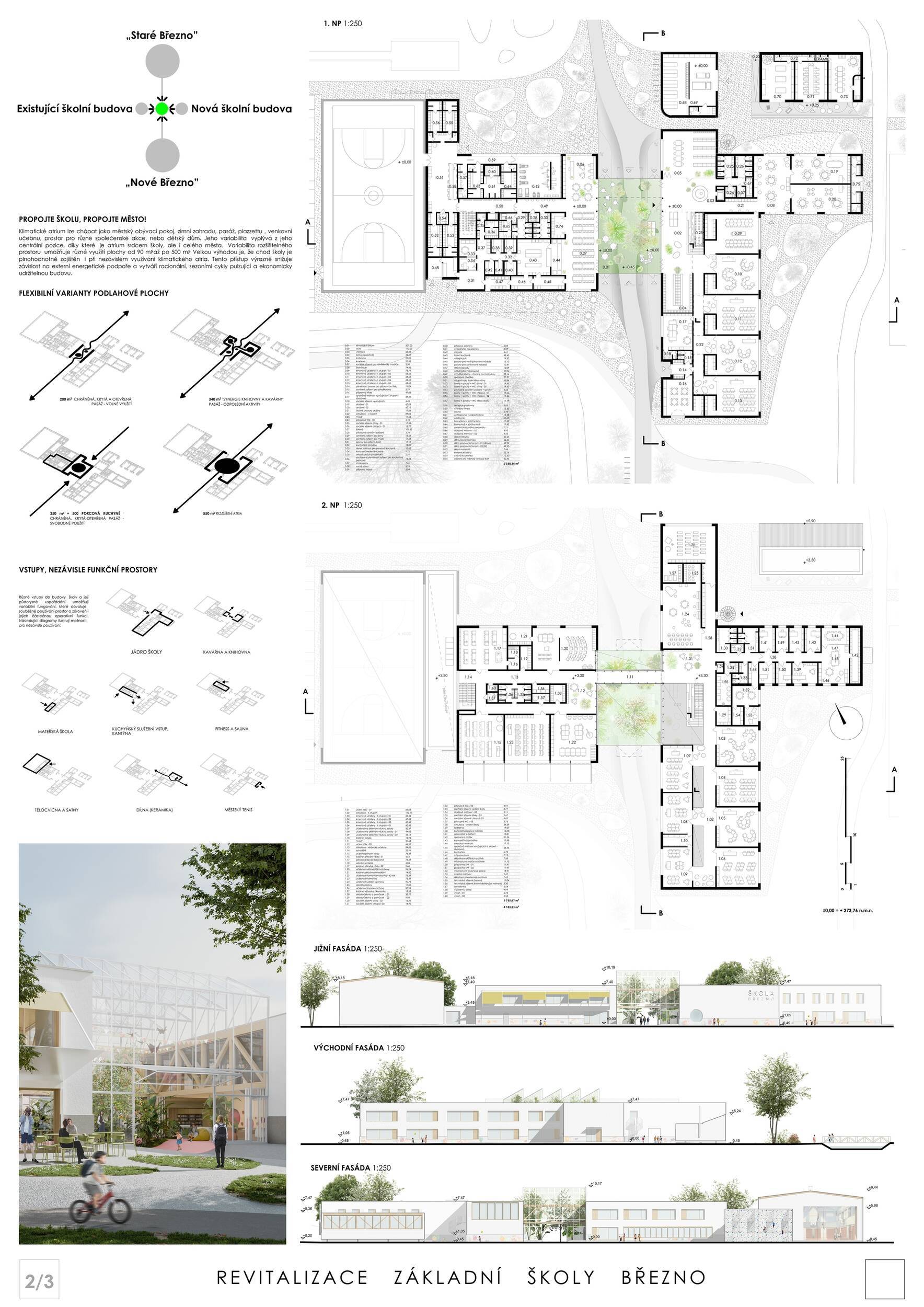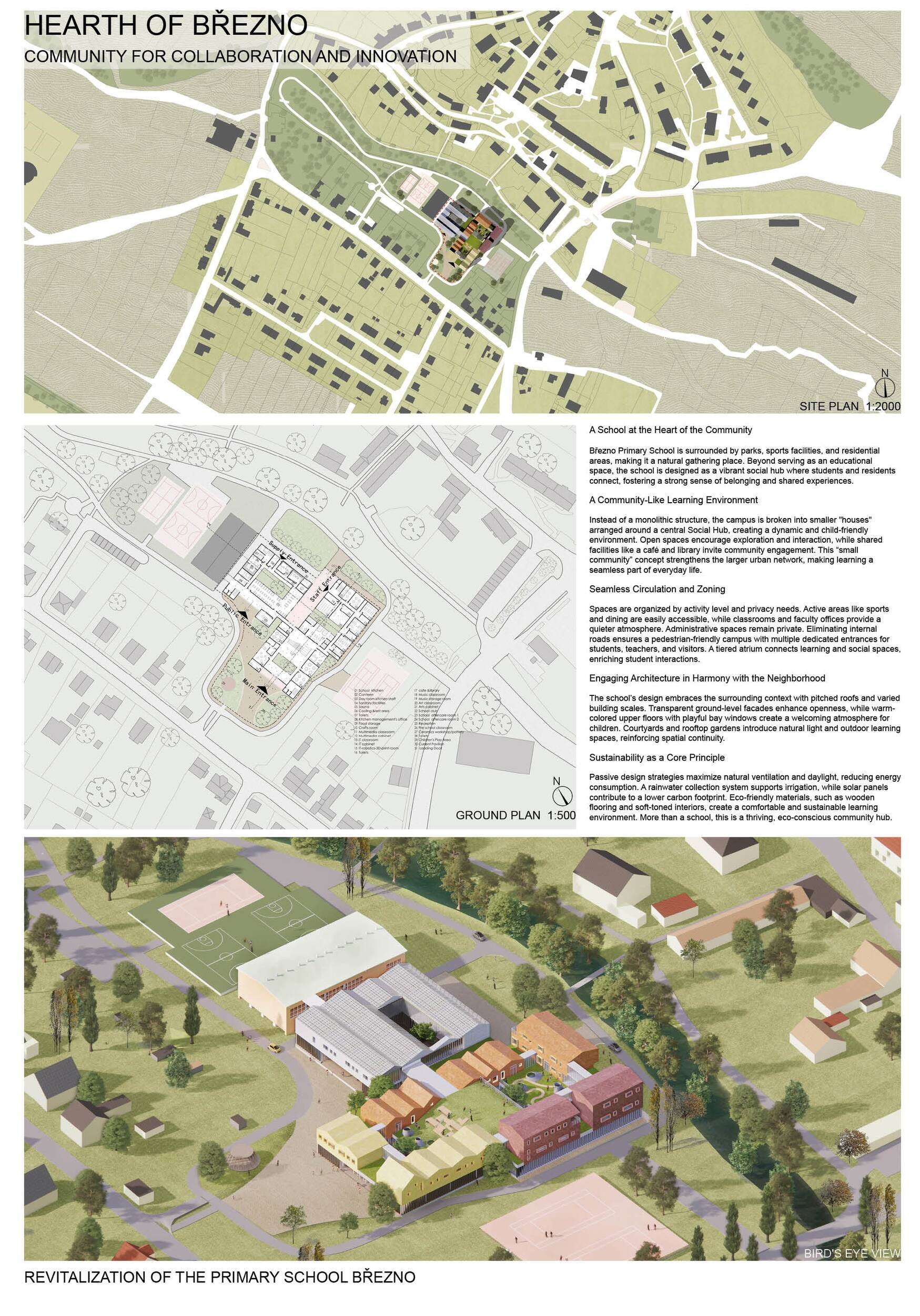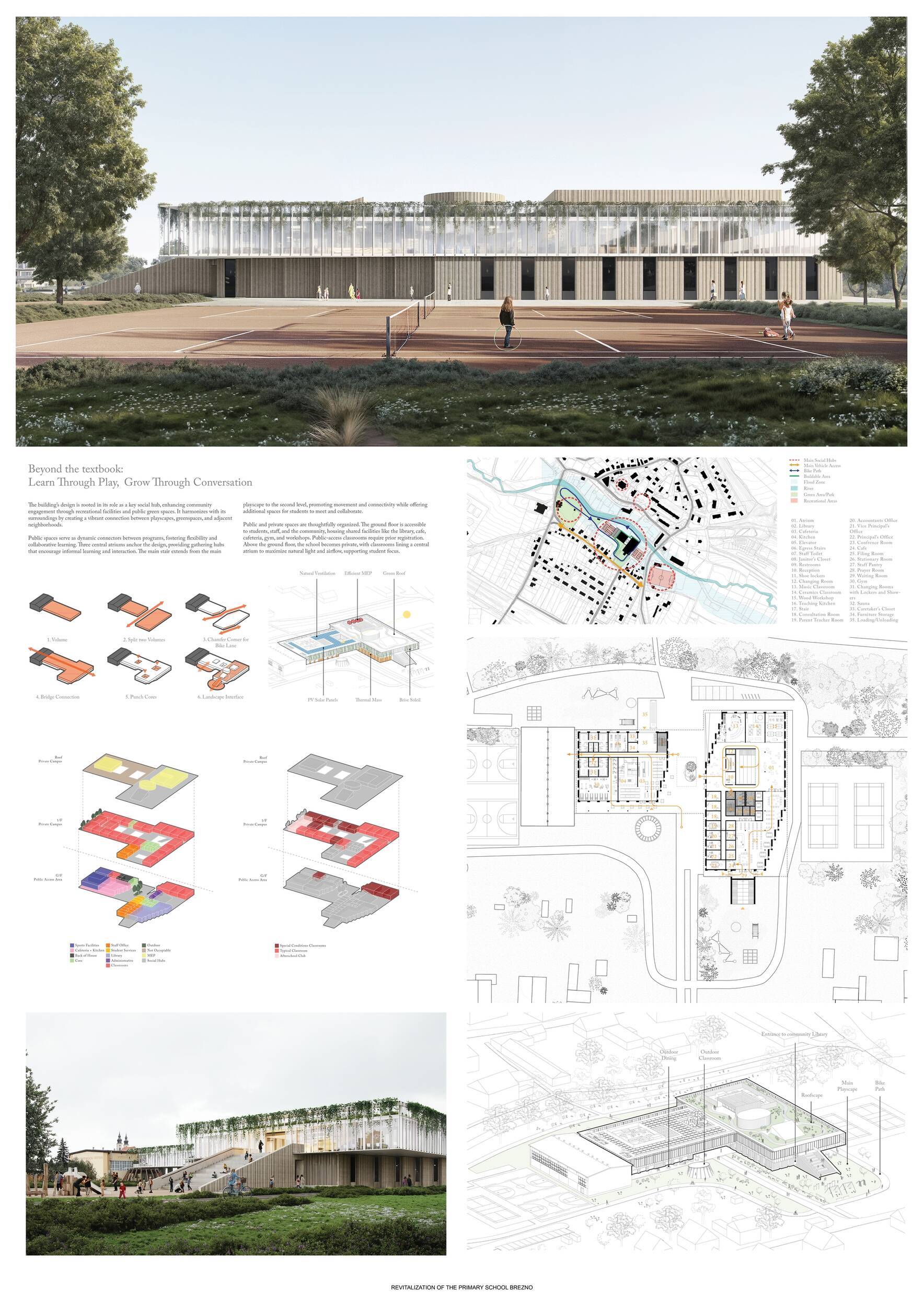 Návrh představuje dobře promyšlené řešení, které reaguje na poptávku nejen po nové škole, ale vlastně i lokální centrum obce. Jedná se o kompaktní dvoupodlažní budovu, která logicky navazuje na stávající tělocvičnu a je orientovaná podél potoka Hutná. V přízemí je objem budovy rozdělen na dvě části dostatečně prostorným a částečně krytým průchodem, na který jsou na jedné straně provozně navázány funkce jako knihovna, kavárna, v návaznosti pak posilovna, sauna, tělocvična. Do průchodu – veřejného prostoru – je také orientovaný hlavní vstup do školy, jídelna a družina. Tento prostor má ambice obohatit život v Březně. Ve druhém nadzemním podlaží se nachází třídy a jejich zázemí.