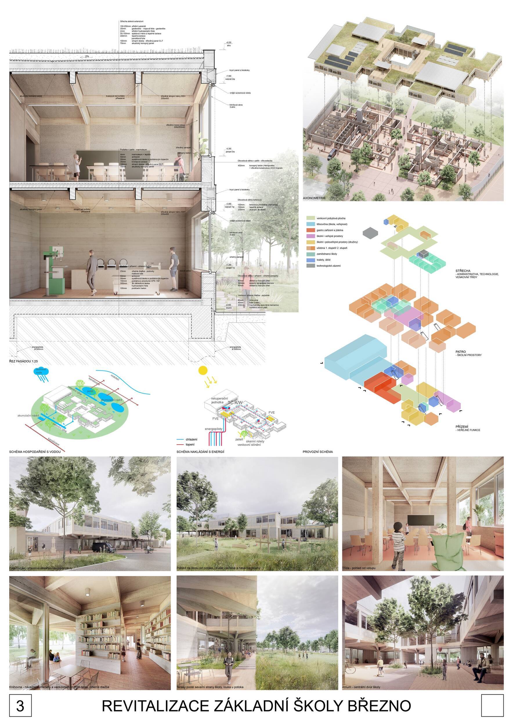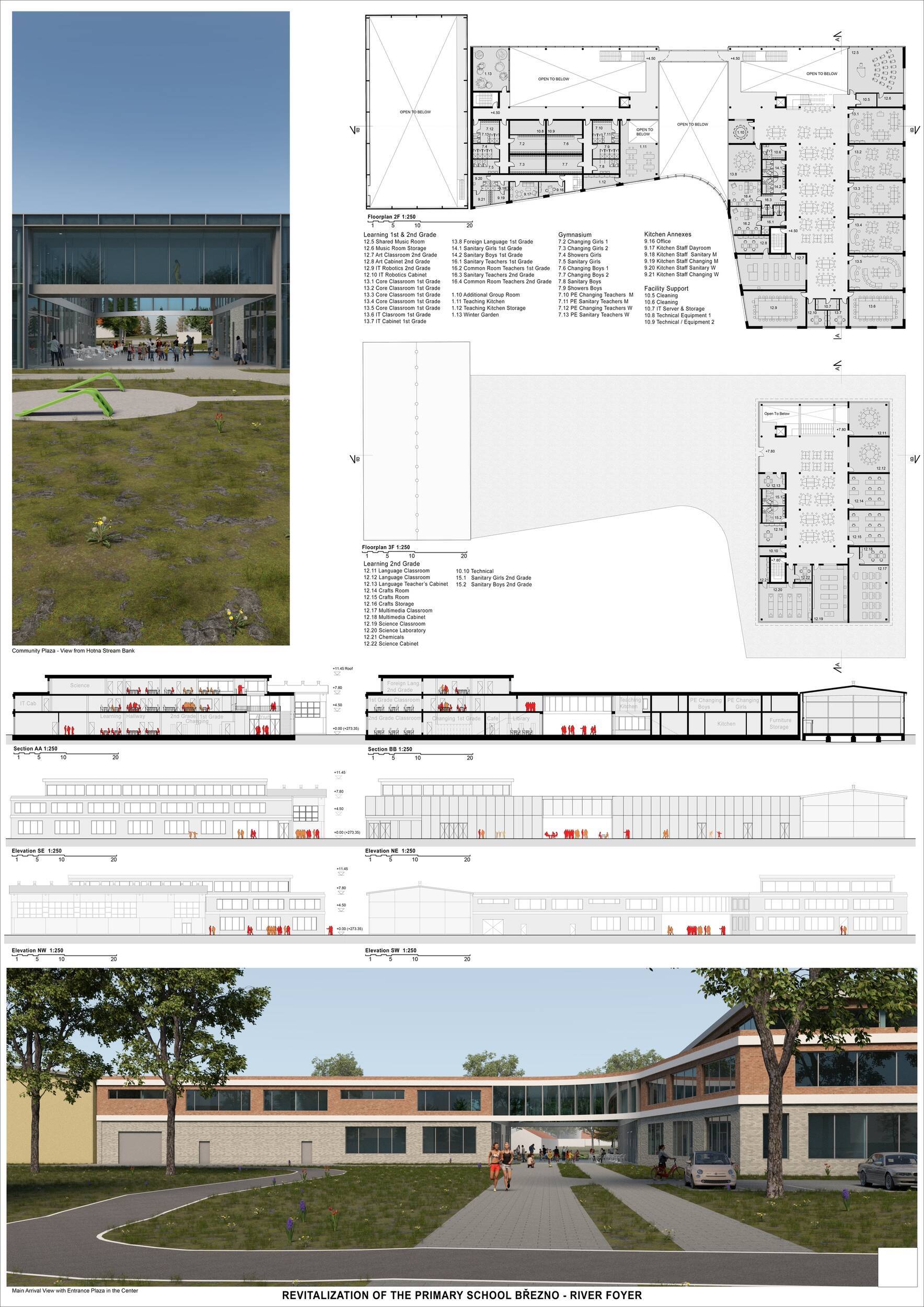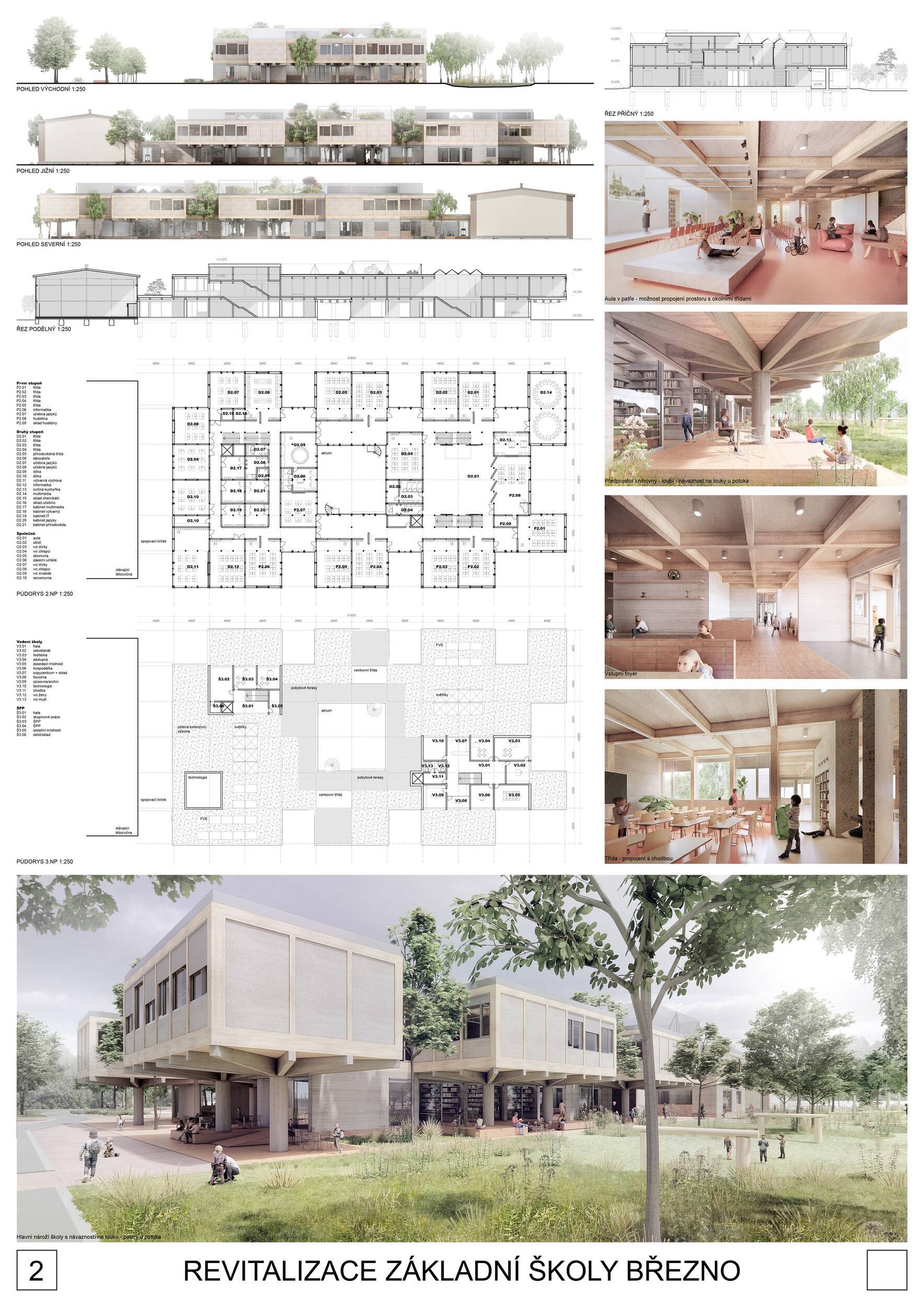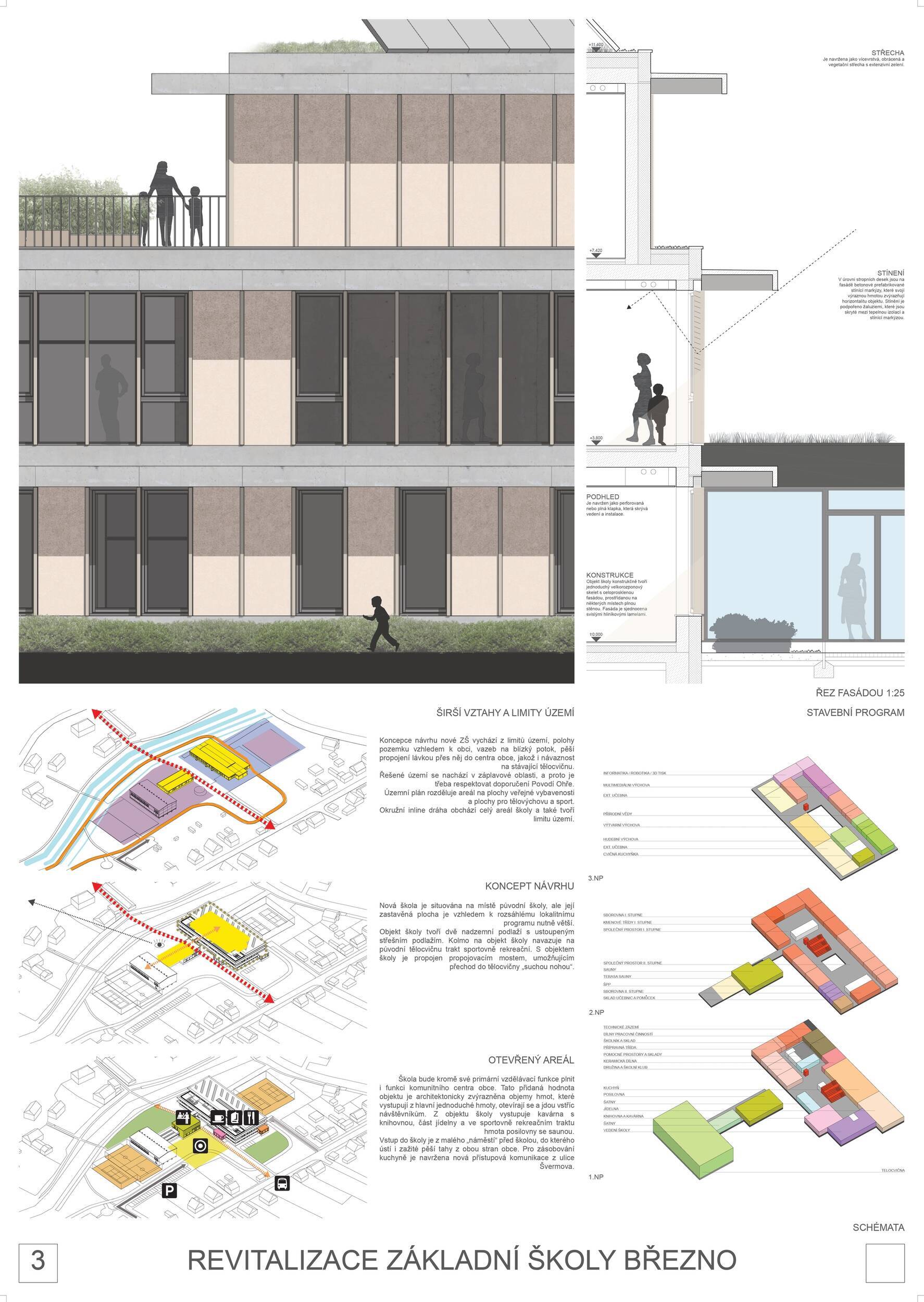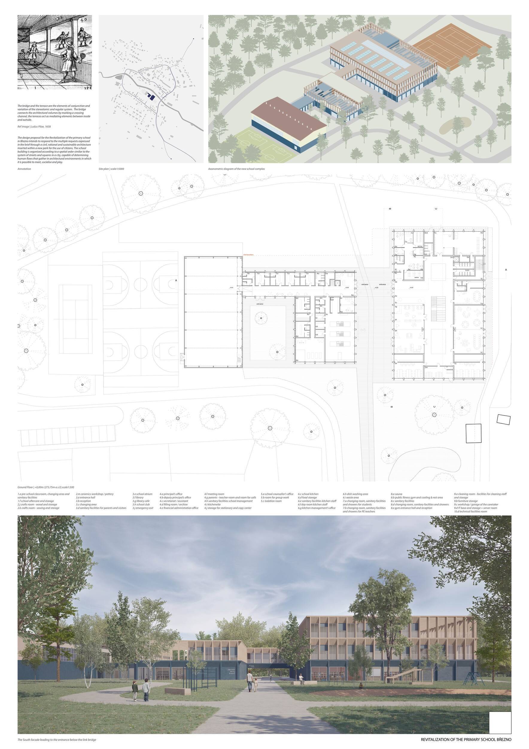 Návrh představuje dobře promyšlené řešení, které reaguje na poptávku nejen po nové škole, ale vlastně i lokální centrum obce. Jedná se o kompaktní dvoupodlažní budovu, která logicky navazuje na stávající tělocvičnu a je orientovaná podél potoka Hutná. V přízemí je objem budovy rozdělen na dvě části dostatečně prostorným a částečně krytým průchodem, na který jsou na jedné straně provozně navázány funkce jako knihovna, kavárna, v návaznosti pak posilovna, sauna, tělocvična. Do průchodu – veřejného prostoru – je také orientovaný hlavní vstup do školy, jídelna a družina. Tento prostor má ambice obohatit život v Březně. Ve druhém nadzemním podlaží se nachází třídy a jejich zázemí.