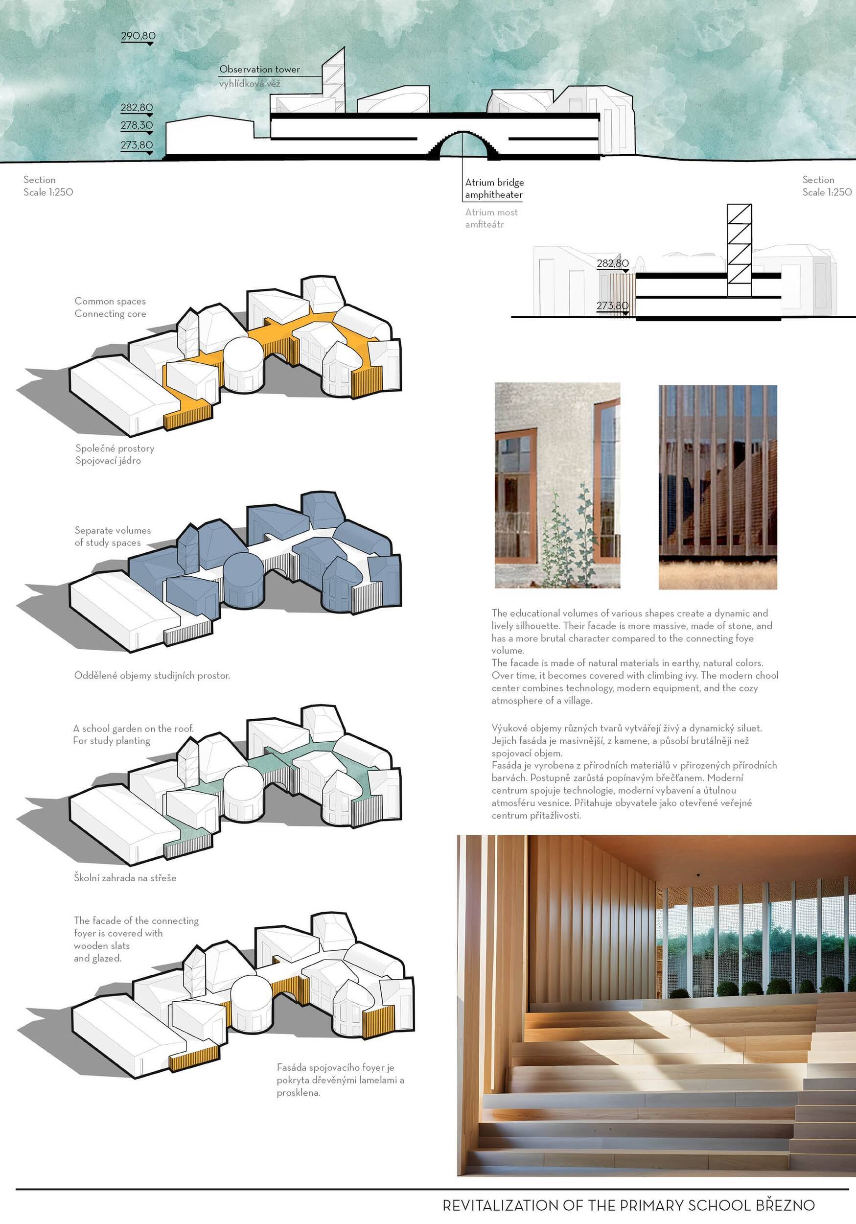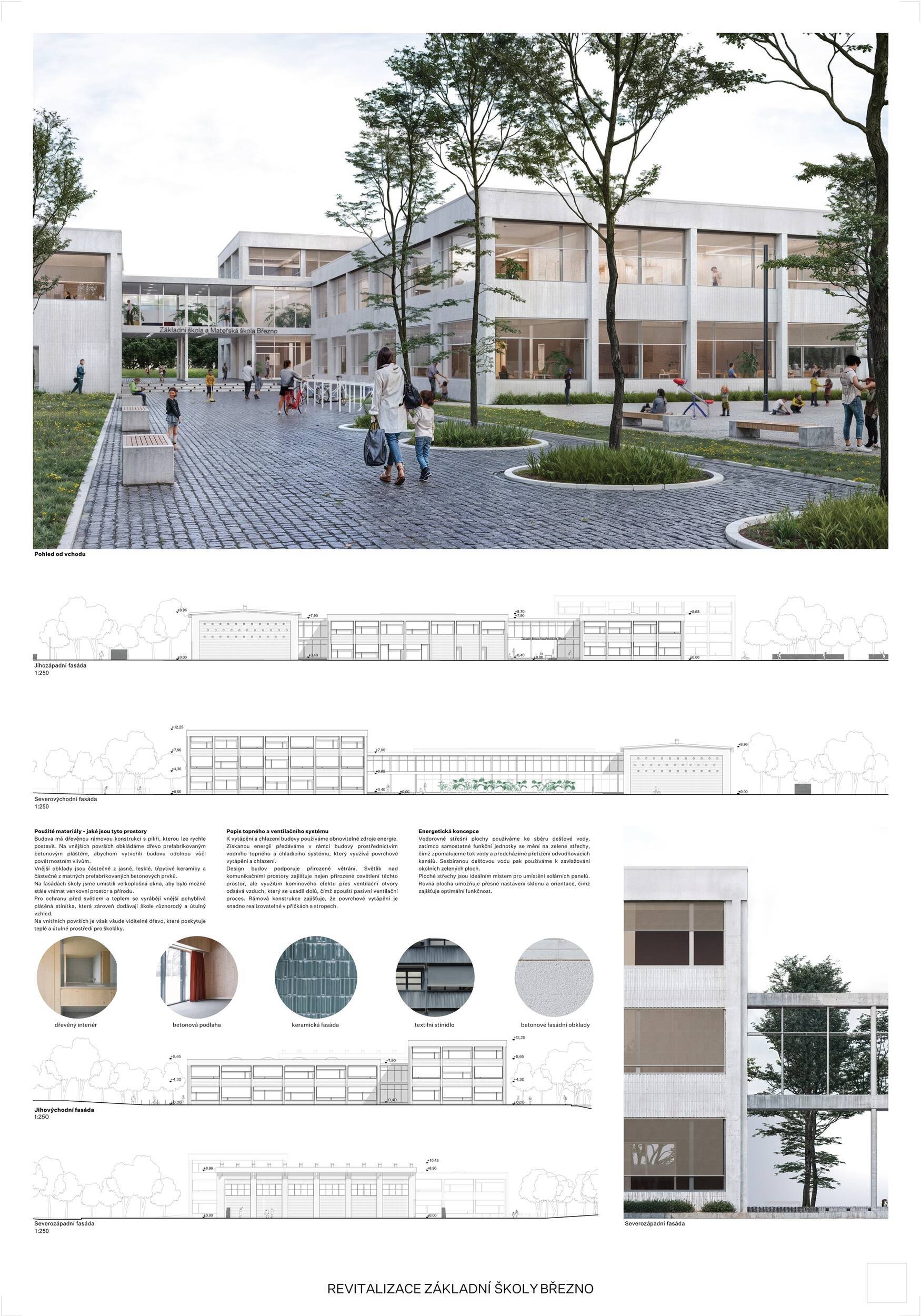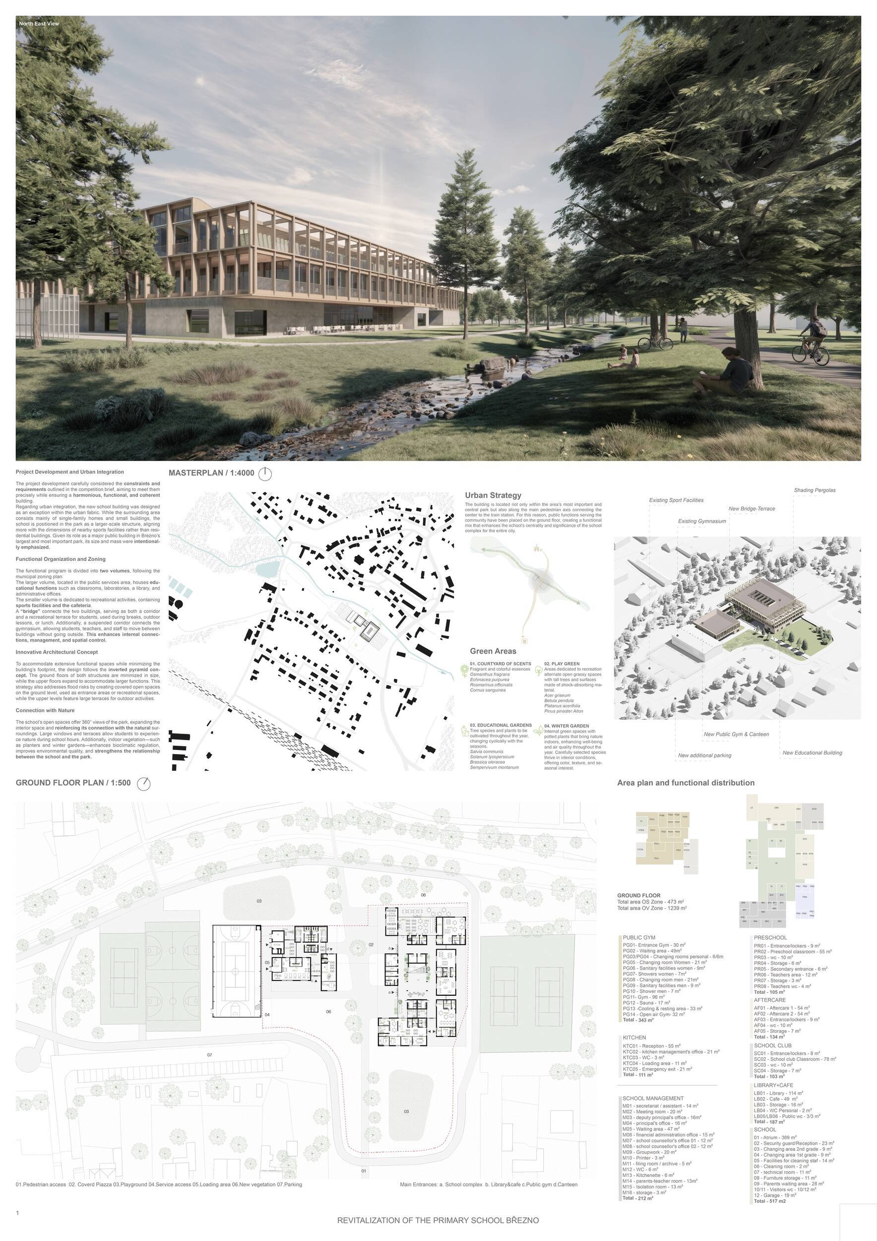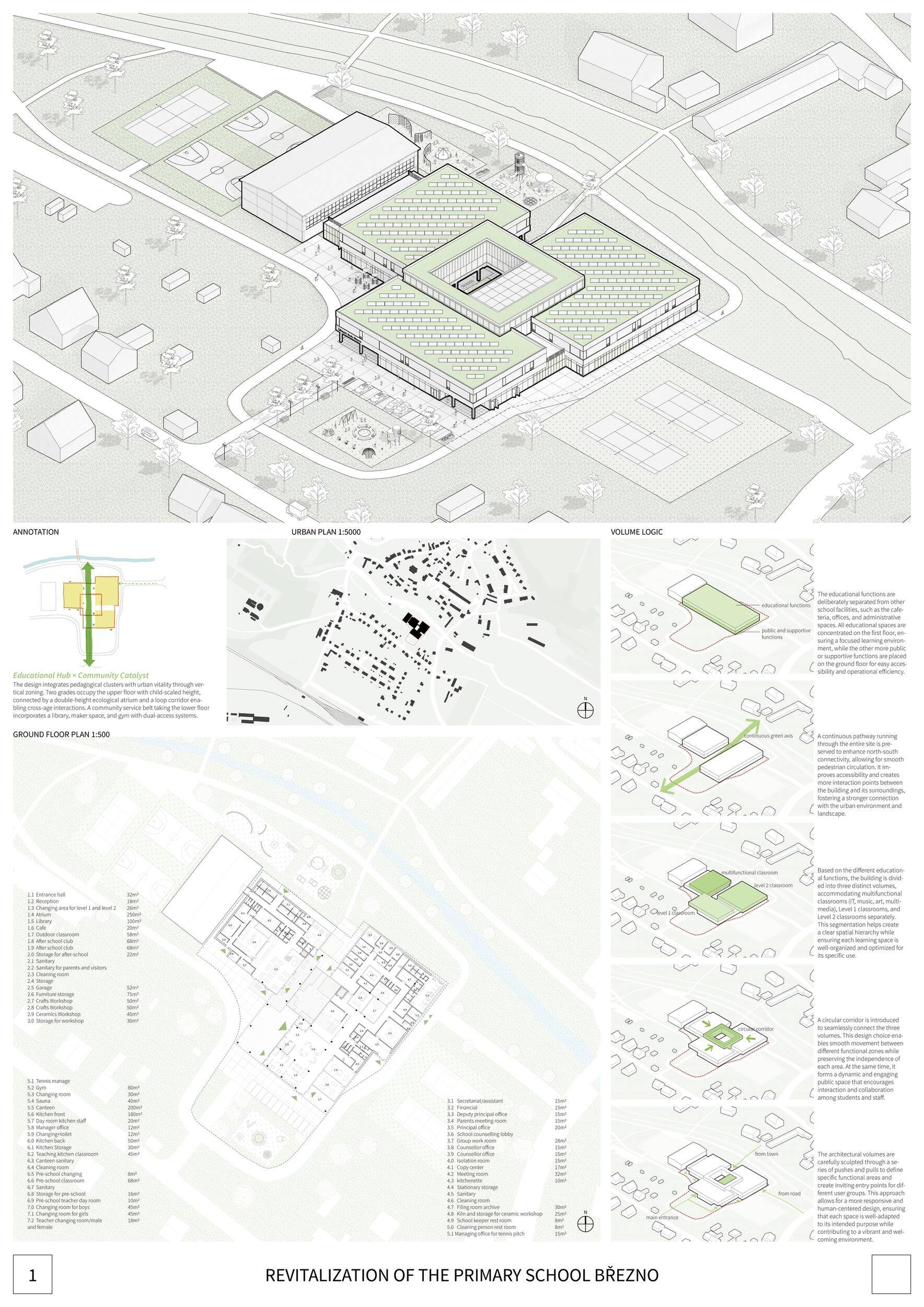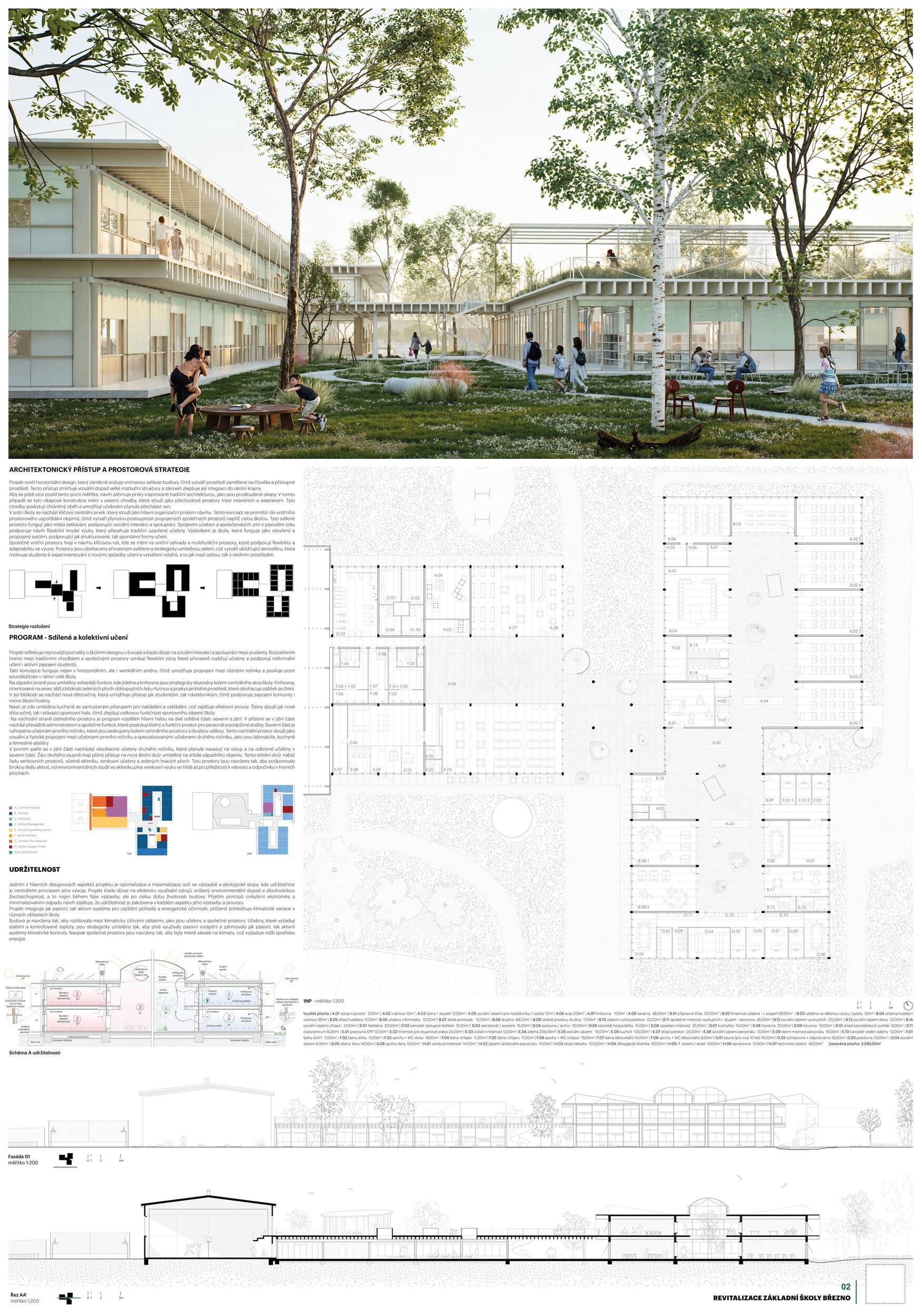 Návrh představuje dobře promyšlené řešení, které reaguje na poptávku nejen po nové škole, ale vlastně i lokální centrum obce. Jedná se o kompaktní dvoupodlažní budovu, která logicky navazuje na stávající tělocvičnu a je orientovaná podél potoka Hutná. V přízemí je objem budovy rozdělen na dvě části dostatečně prostorným a částečně krytým průchodem, na který jsou na jedné straně provozně navázány funkce jako knihovna, kavárna, v návaznosti pak posilovna, sauna, tělocvična. Do průchodu – veřejného prostoru – je také orientovaný hlavní vstup do školy, jídelna a družina. Tento prostor má ambice obohatit život v Březně. Ve druhém nadzemním podlaží se nachází třídy a jejich zázemí.