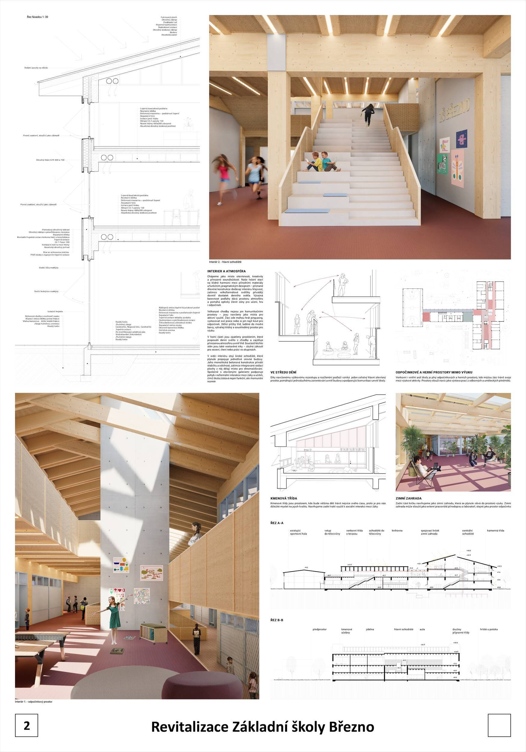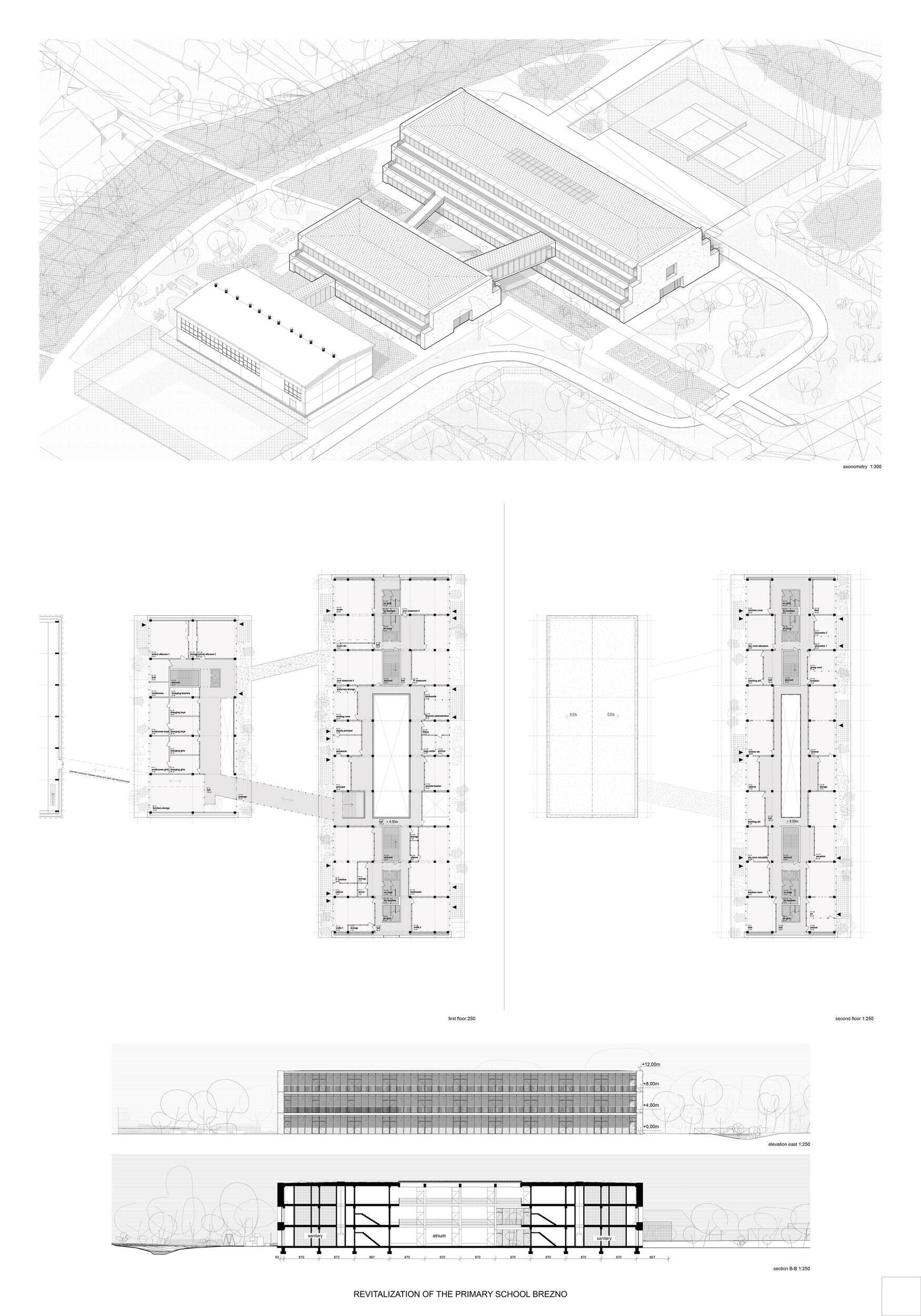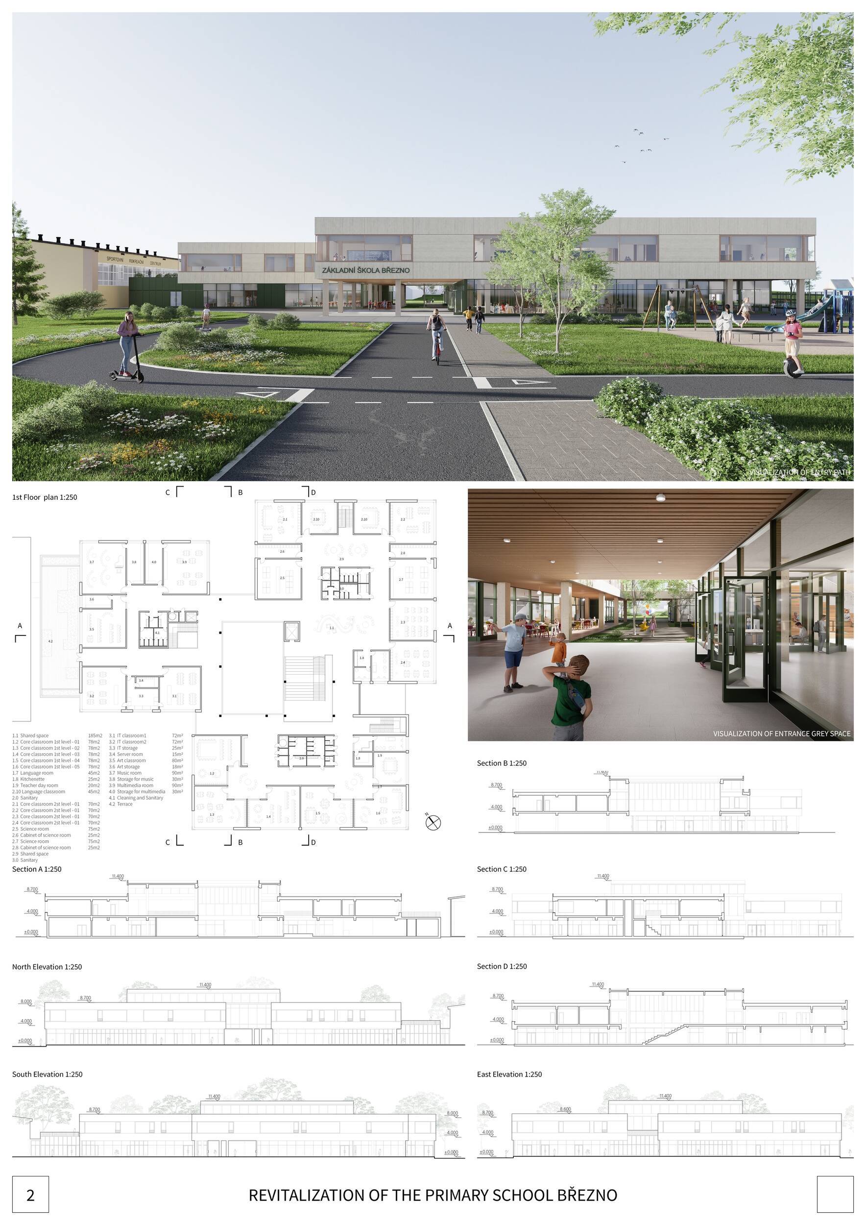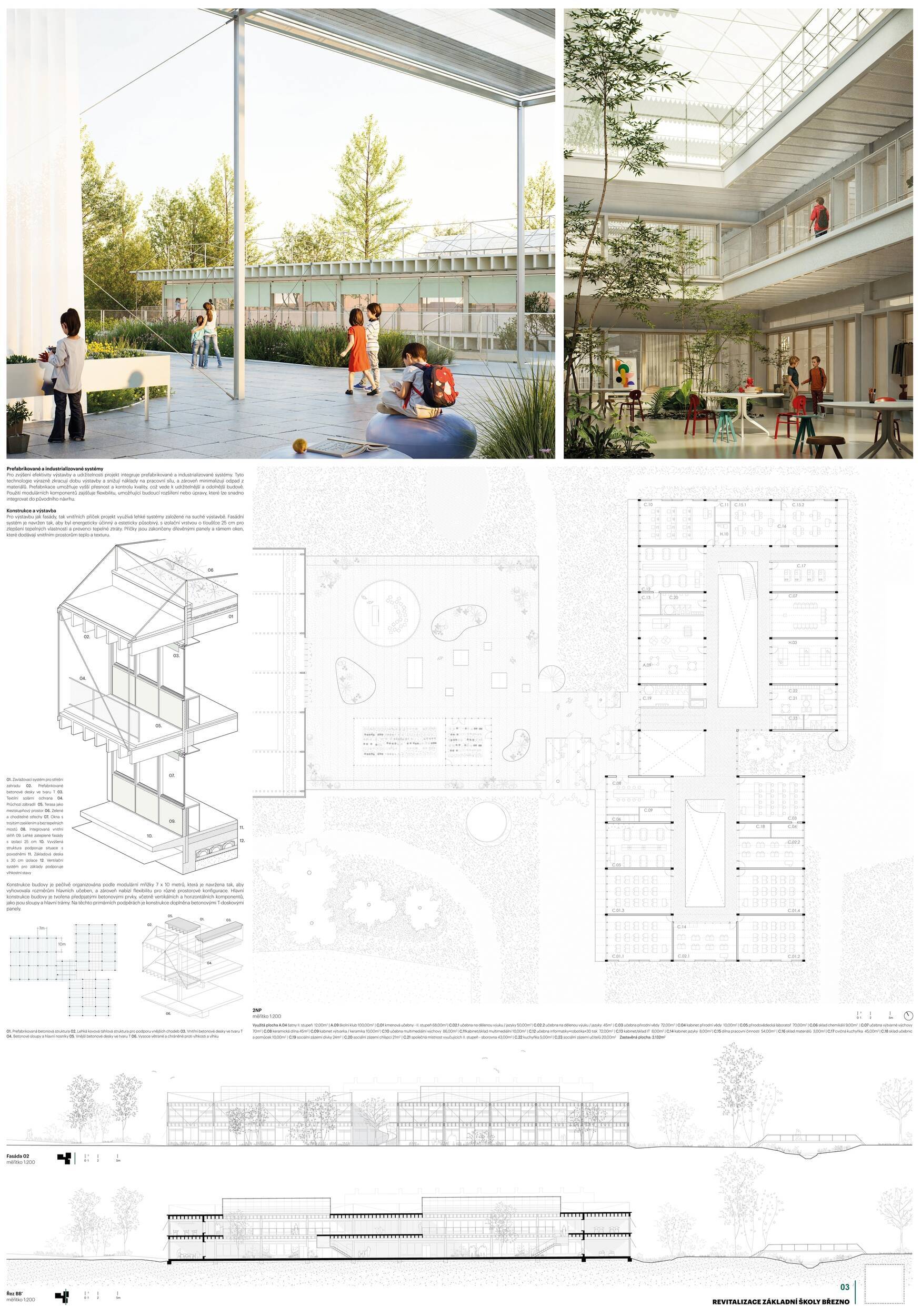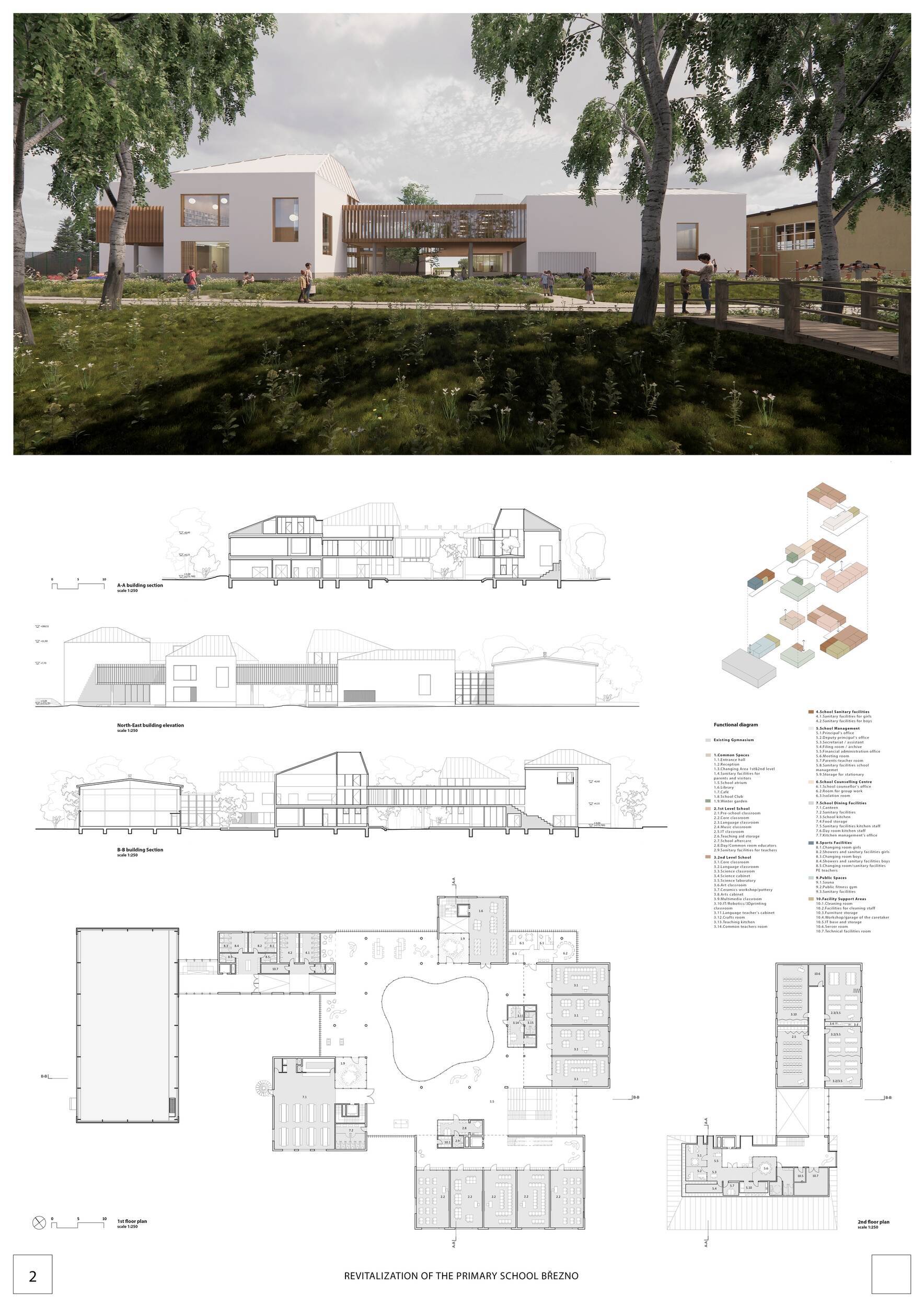 Návrh představuje dobře promyšlené řešení, které reaguje na poptávku nejen po nové škole, ale vlastně i lokální centrum obce. Jedná se o kompaktní dvoupodlažní budovu, která logicky navazuje na stávající tělocvičnu a je orientovaná podél potoka Hutná. V přízemí je objem budovy rozdělen na dvě části dostatečně prostorným a částečně krytým průchodem, na který jsou na jedné straně provozně navázány funkce jako knihovna, kavárna, v návaznosti pak posilovna, sauna, tělocvična. Do průchodu – veřejného prostoru – je také orientovaný hlavní vstup do školy, jídelna a družina. Tento prostor má ambice obohatit život v Březně. Ve druhém nadzemním podlaží se nachází třídy a jejich zázemí.