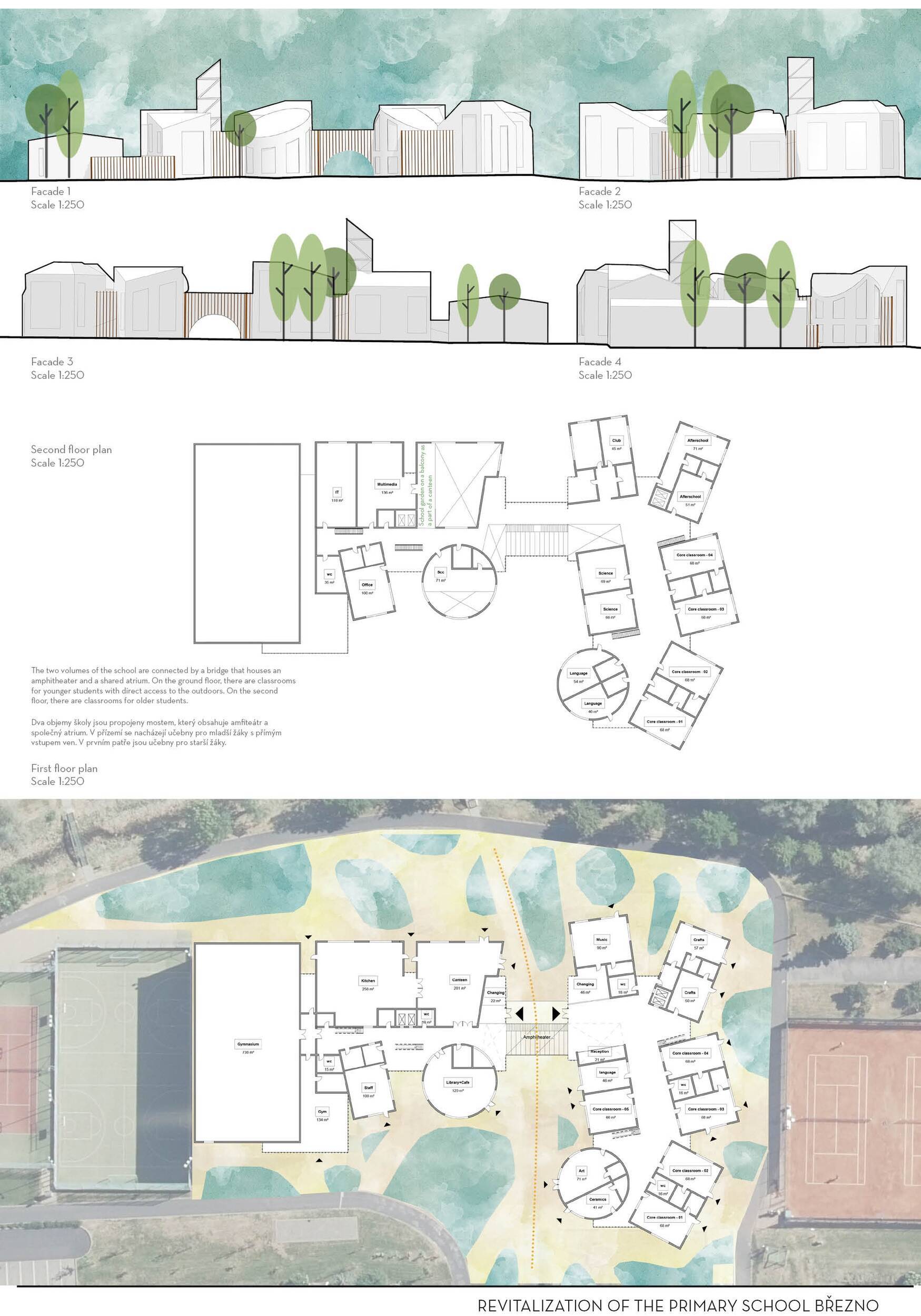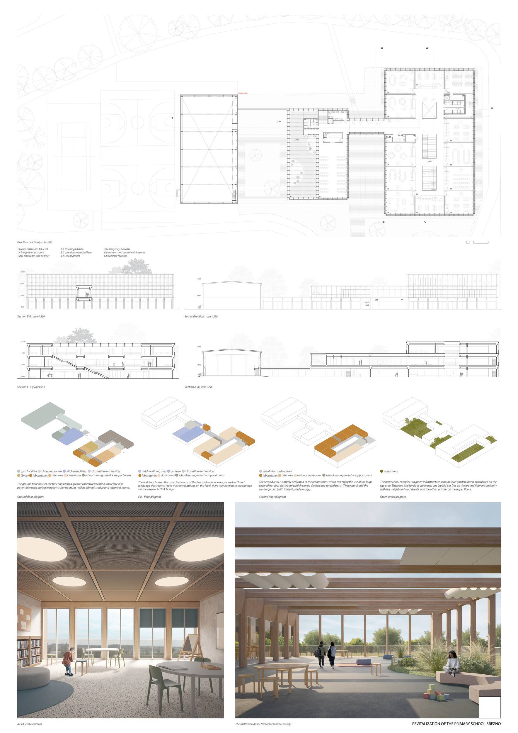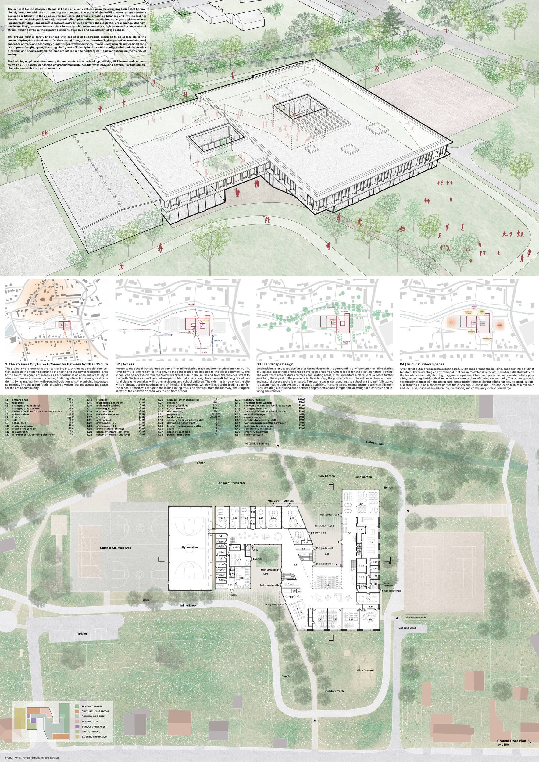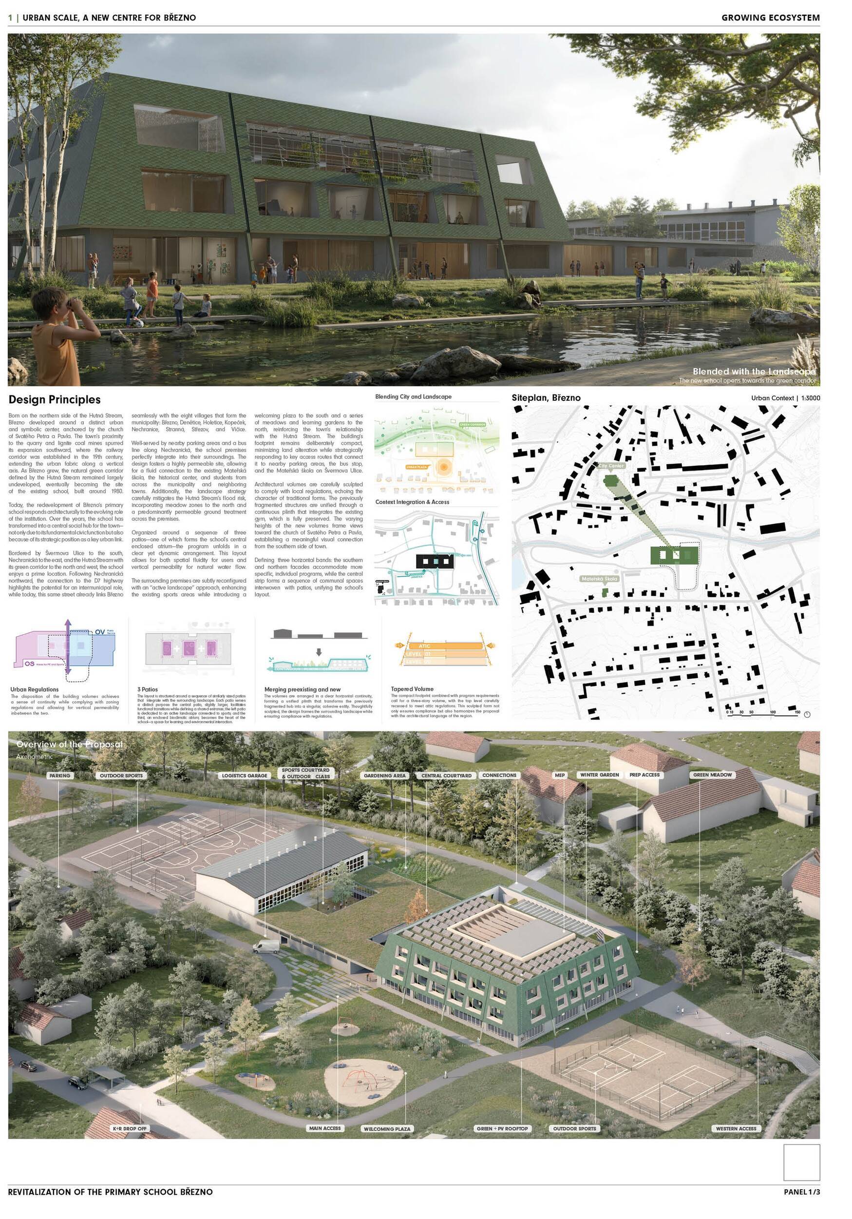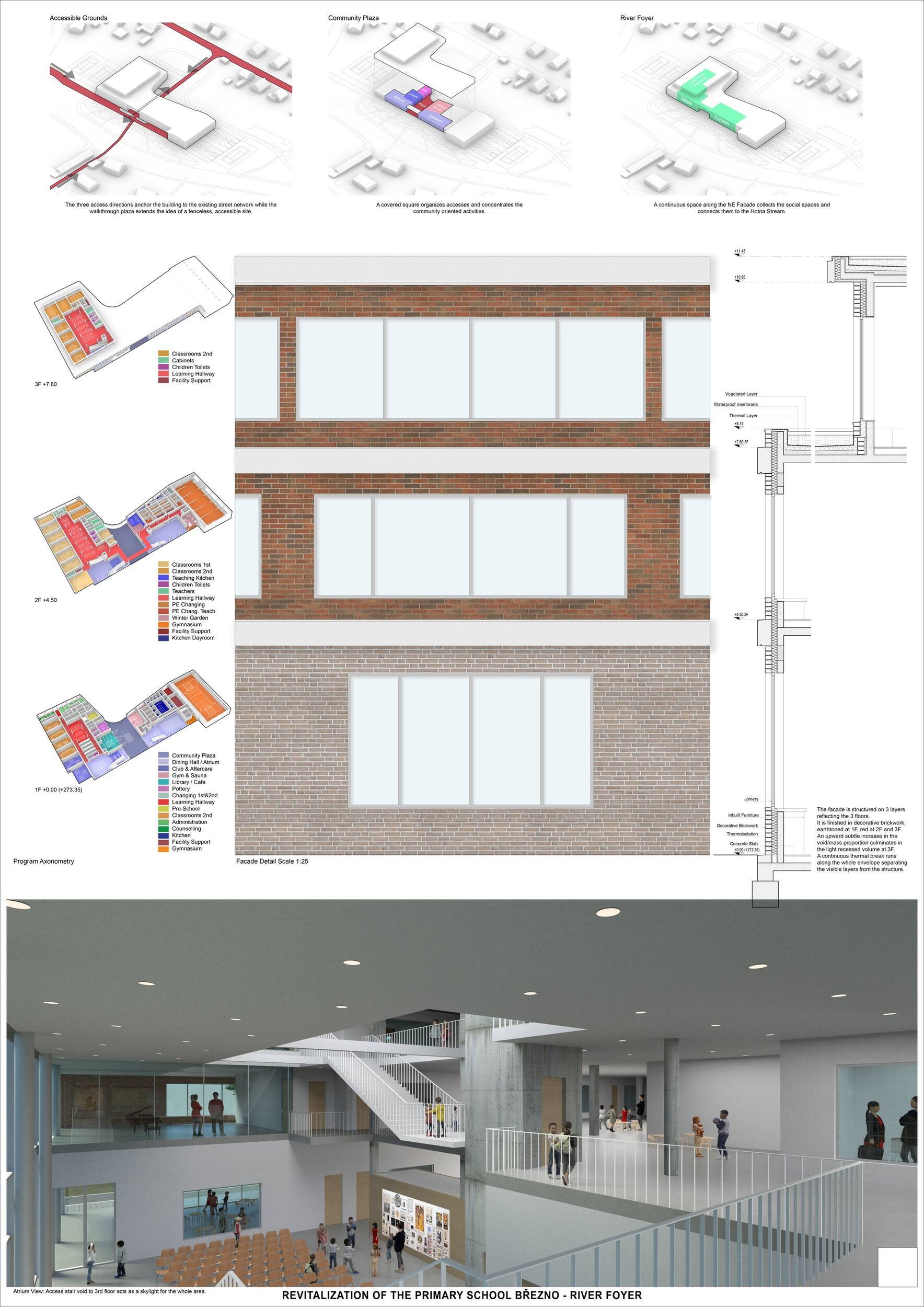 Návrh představuje dobře promyšlené řešení, které reaguje na poptávku nejen po nové škole, ale vlastně i lokální centrum obce. Jedná se o kompaktní dvoupodlažní budovu, která logicky navazuje na stávající tělocvičnu a je orientovaná podél potoka Hutná. V přízemí je objem budovy rozdělen na dvě části dostatečně prostorným a částečně krytým průchodem, na který jsou na jedné straně provozně navázány funkce jako knihovna, kavárna, v návaznosti pak posilovna, sauna, tělocvična. Do průchodu – veřejného prostoru – je také orientovaný hlavní vstup do školy, jídelna a družina. Tento prostor má ambice obohatit život v Březně. Ve druhém nadzemním podlaží se nachází třídy a jejich zázemí.