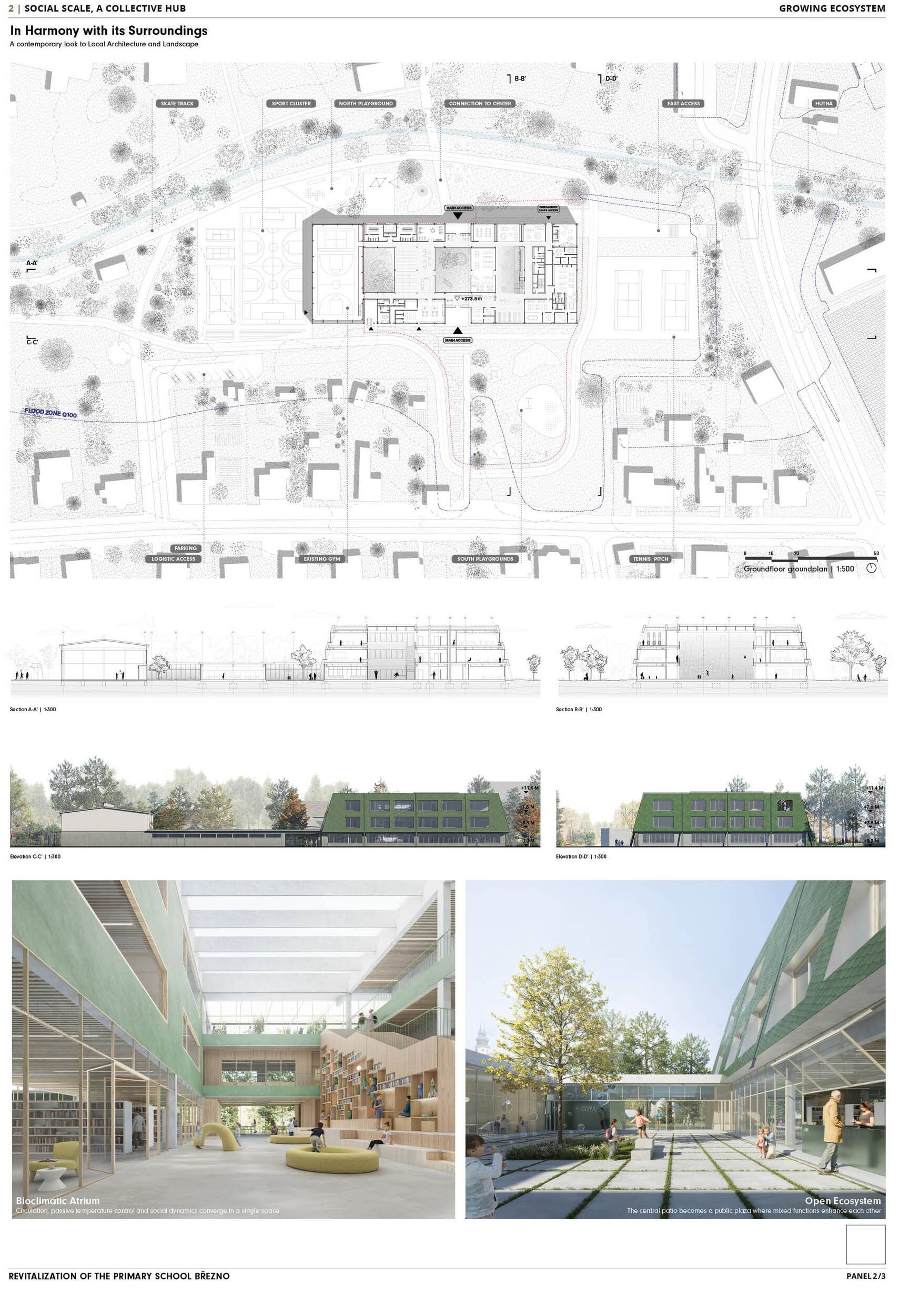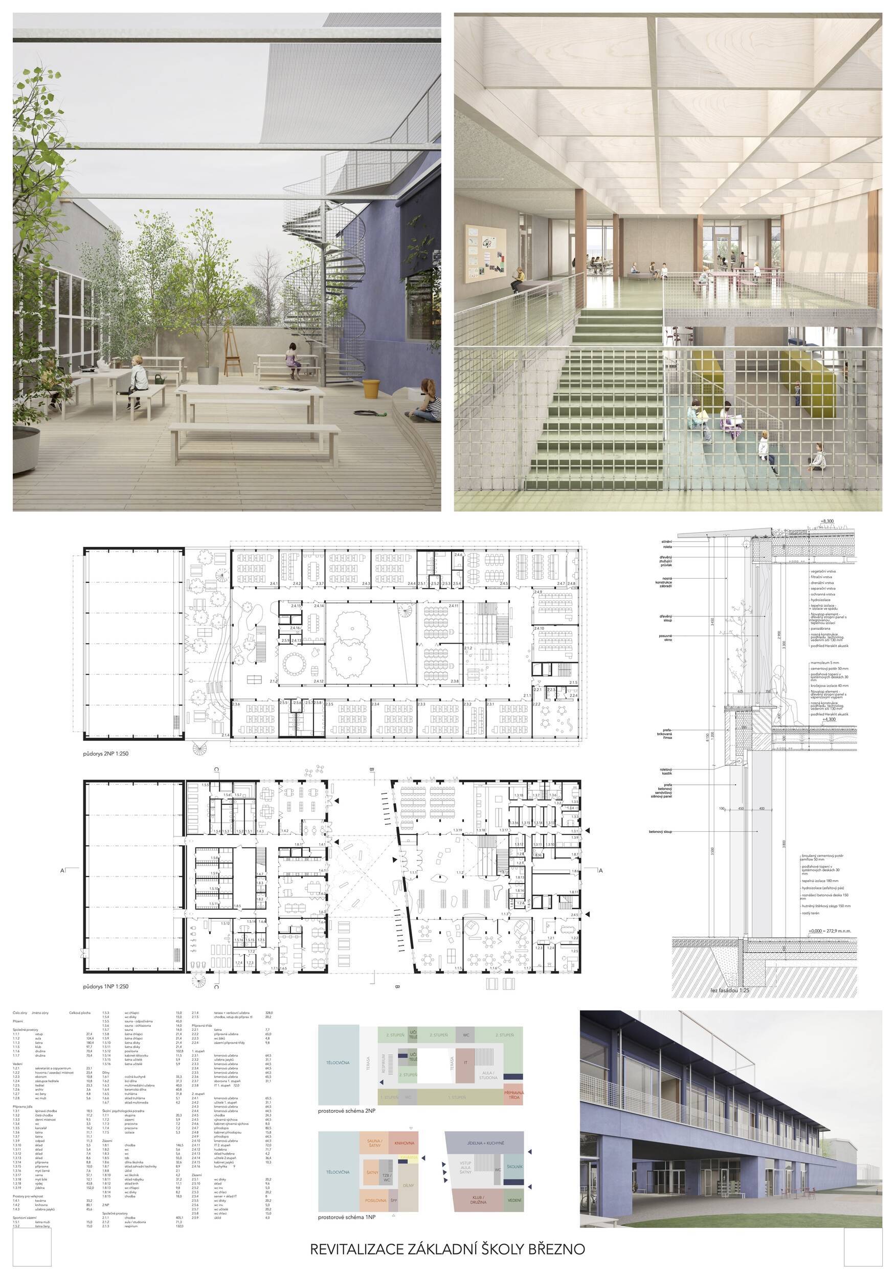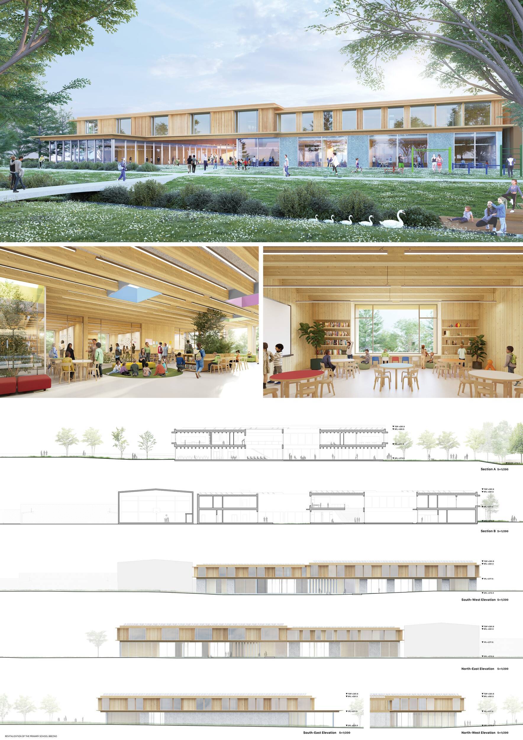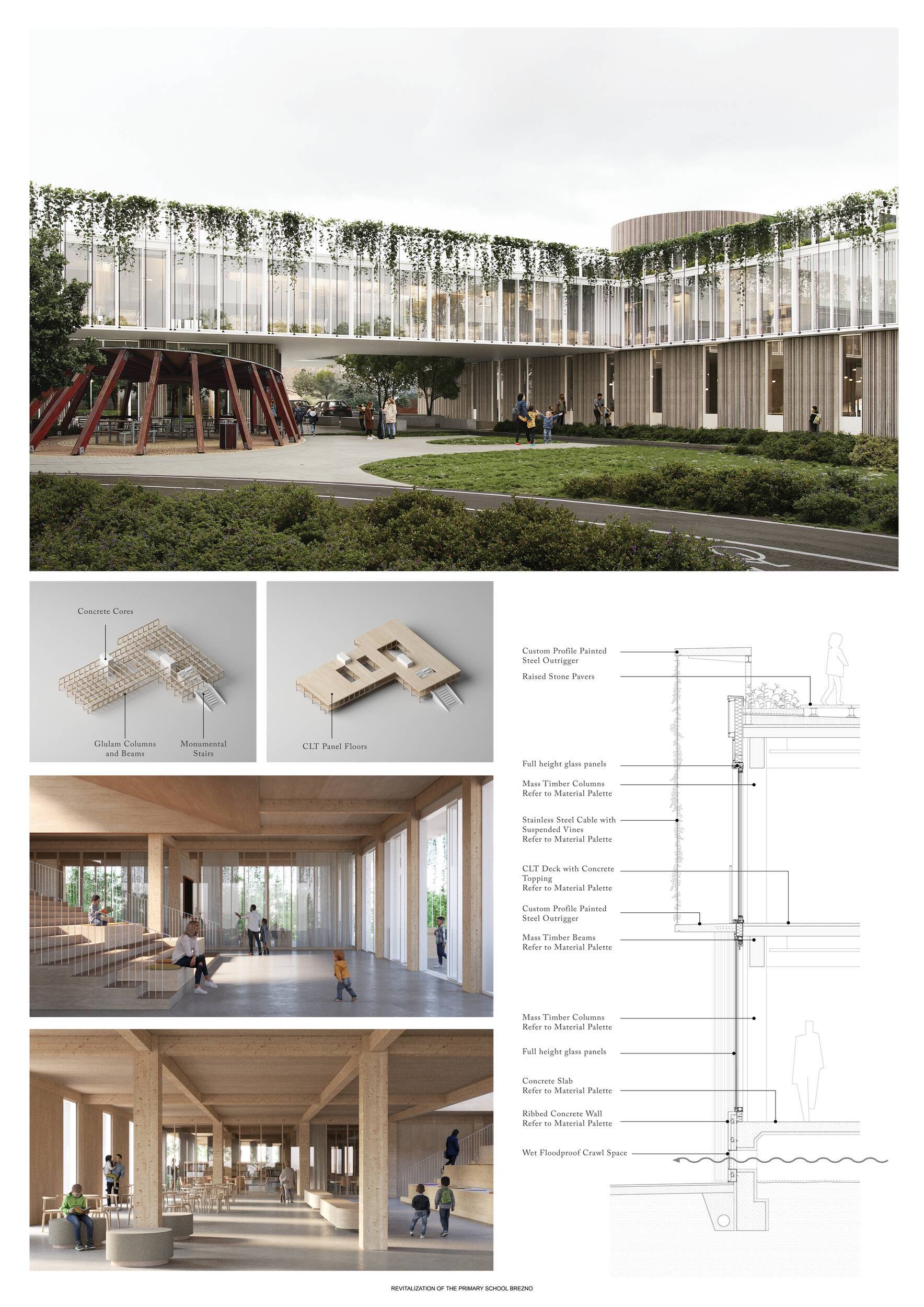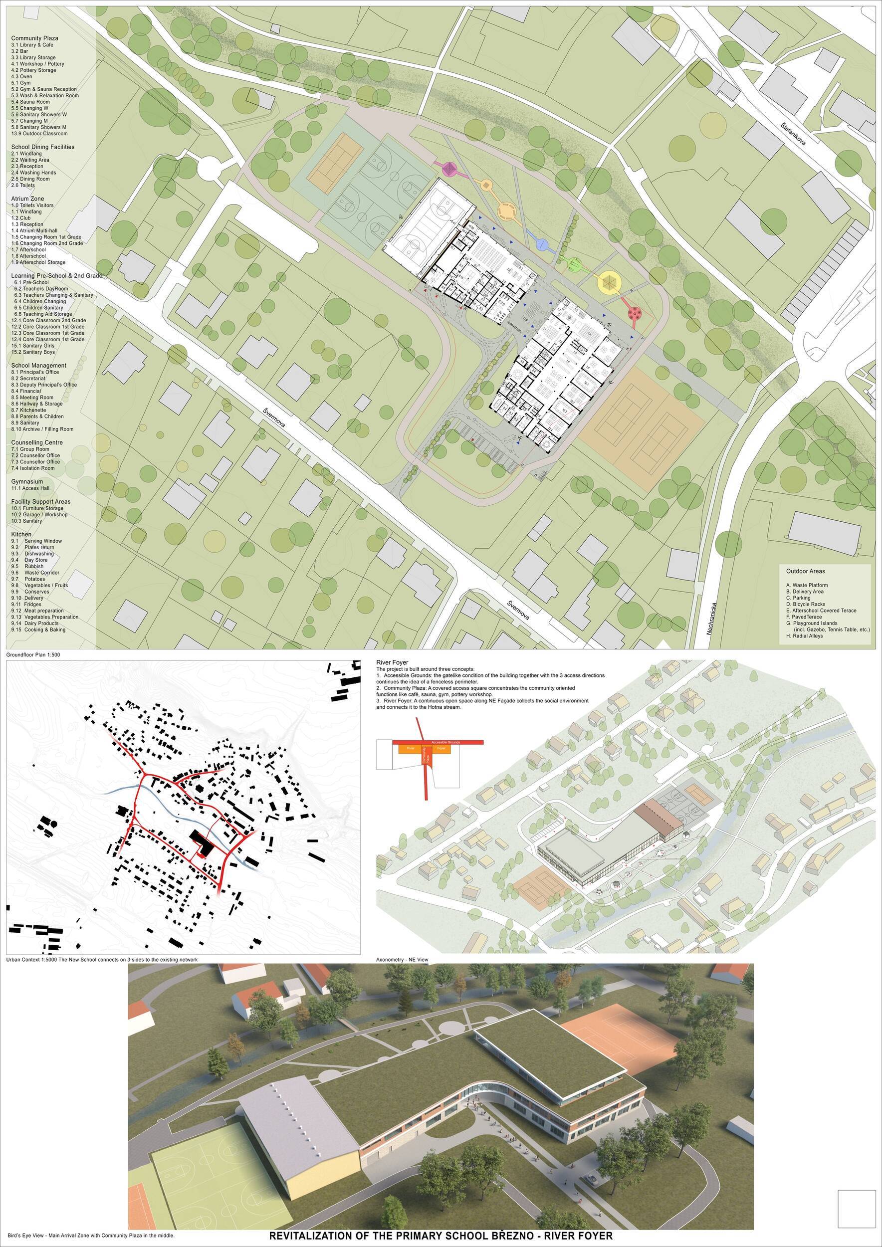 Návrh představuje dobře promyšlené řešení, které reaguje na poptávku nejen po nové škole, ale vlastně i lokální centrum obce. Jedná se o kompaktní dvoupodlažní budovu, která logicky navazuje na stávající tělocvičnu a je orientovaná podél potoka Hutná. V přízemí je objem budovy rozdělen na dvě části dostatečně prostorným a částečně krytým průchodem, na který jsou na jedné straně provozně navázány funkce jako knihovna, kavárna, v návaznosti pak posilovna, sauna, tělocvična. Do průchodu – veřejného prostoru – je také orientovaný hlavní vstup do školy, jídelna a družina. Tento prostor má ambice obohatit život v Březně. Ve druhém nadzemním podlaží se nachází třídy a jejich zázemí.