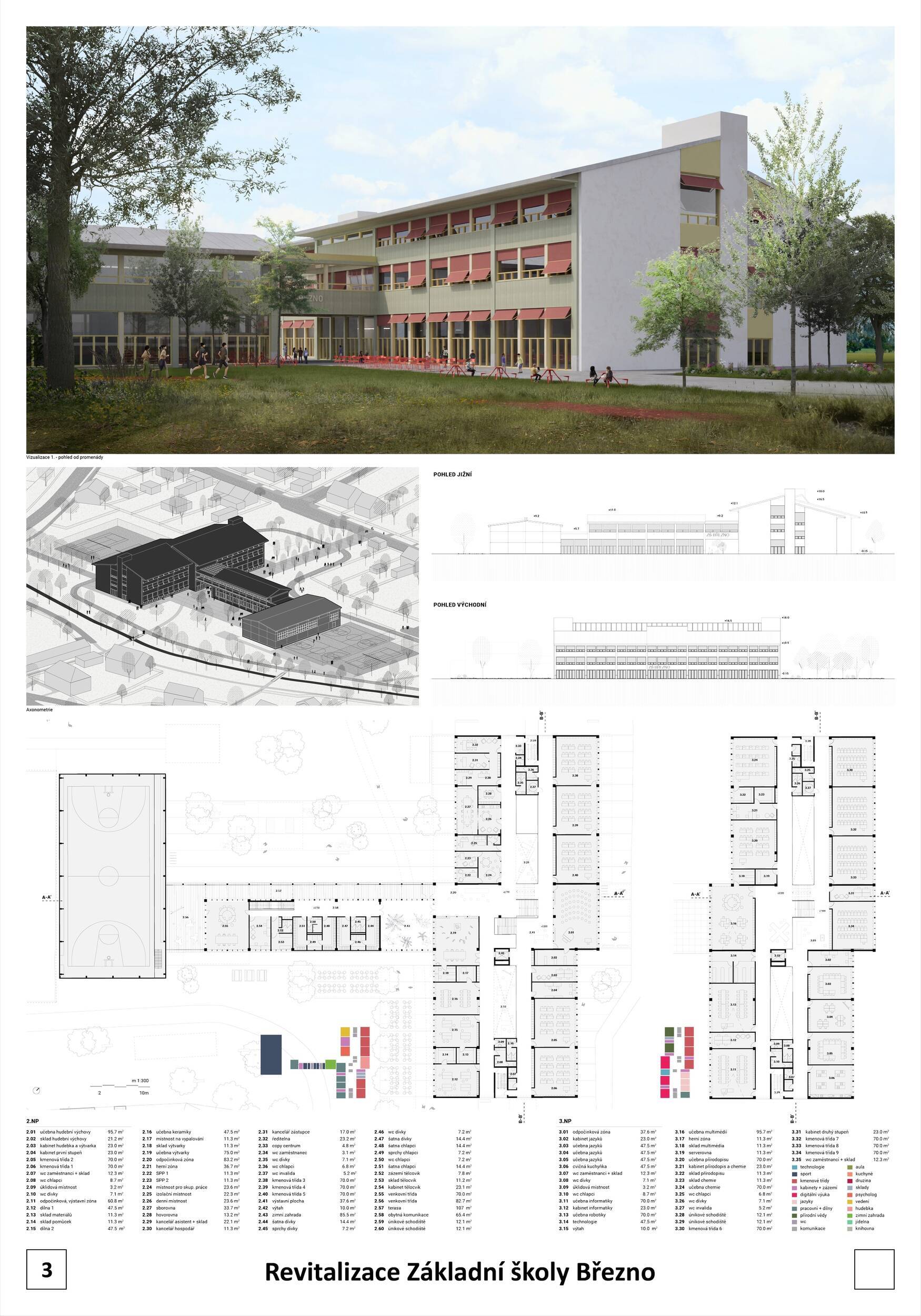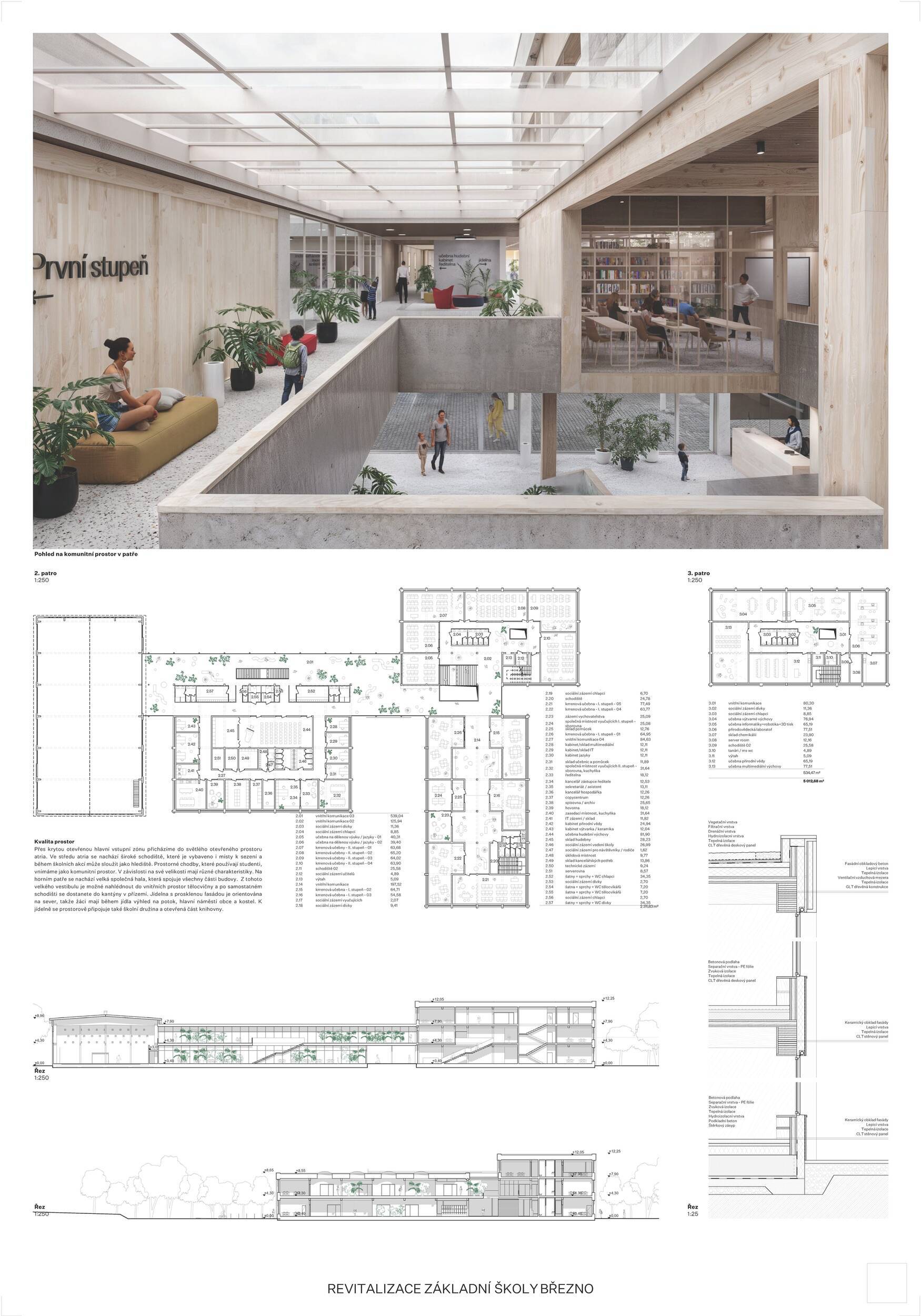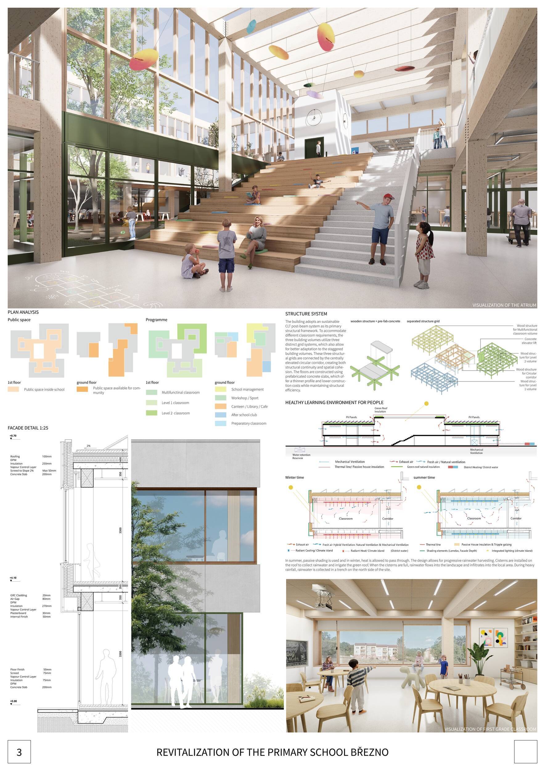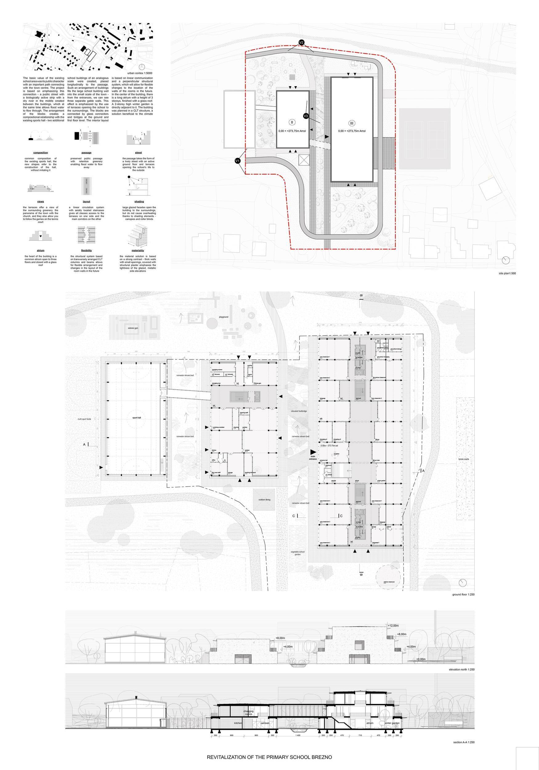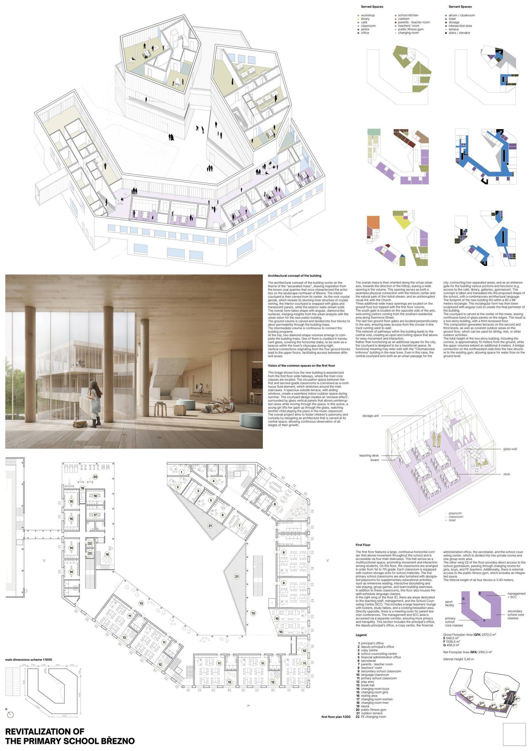 Návrh představuje dobře promyšlené řešení, které reaguje na poptávku nejen po nové škole, ale vlastně i lokální centrum obce. Jedná se o kompaktní dvoupodlažní budovu, která logicky navazuje na stávající tělocvičnu a je orientovaná podél potoka Hutná. V přízemí je objem budovy rozdělen na dvě části dostatečně prostorným a částečně krytým průchodem, na který jsou na jedné straně provozně navázány funkce jako knihovna, kavárna, v návaznosti pak posilovna, sauna, tělocvična. Do průchodu – veřejného prostoru – je také orientovaný hlavní vstup do školy, jídelna a družina. Tento prostor má ambice obohatit život v Březně. Ve druhém nadzemním podlaží se nachází třídy a jejich zázemí.
