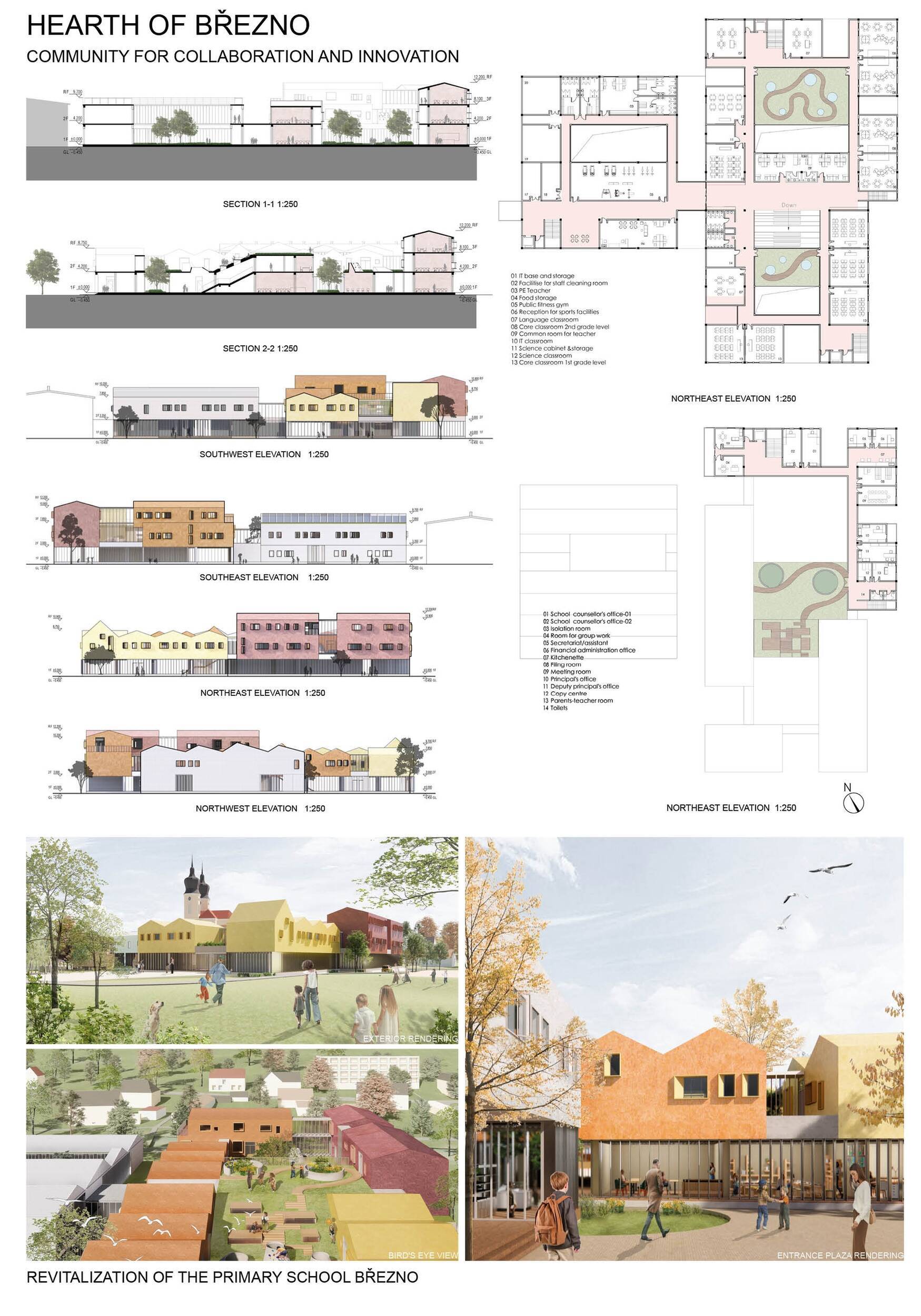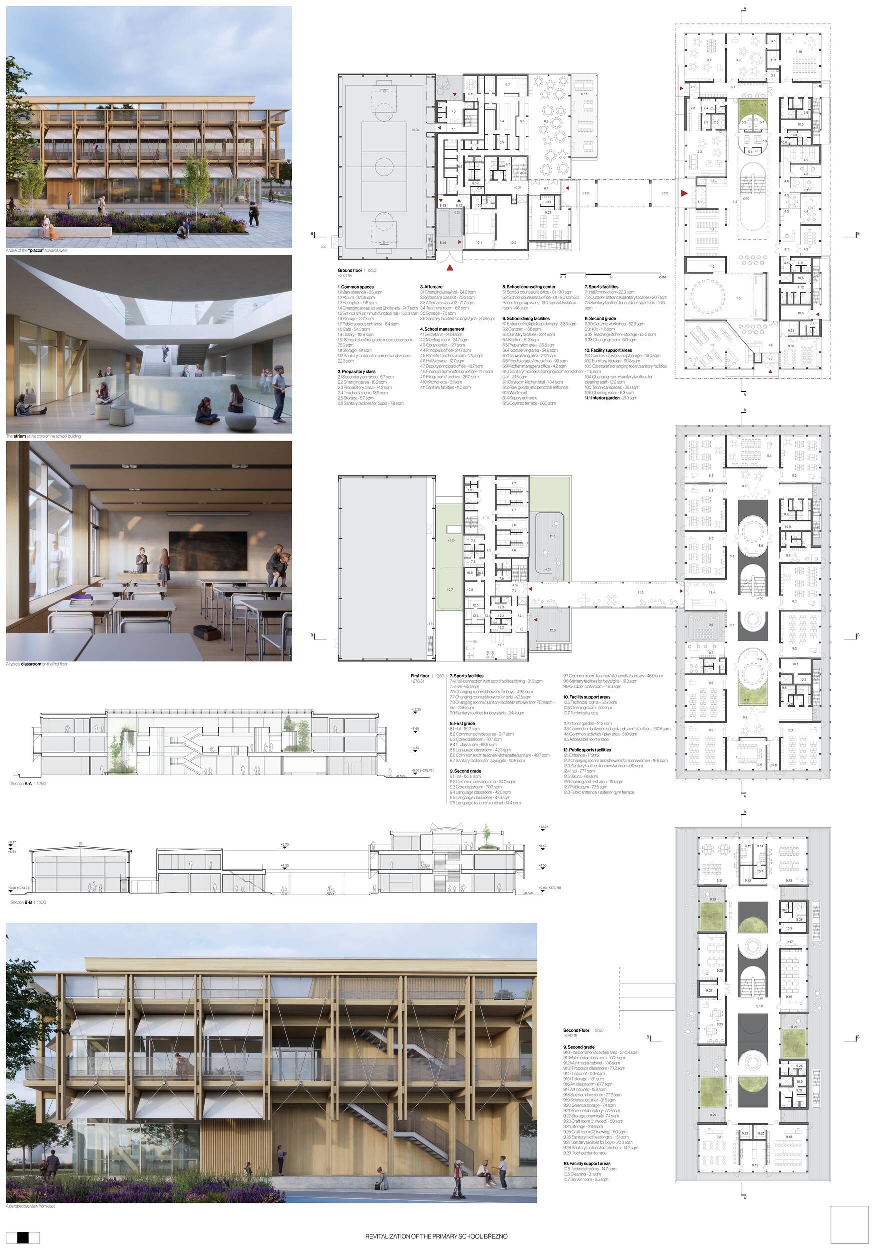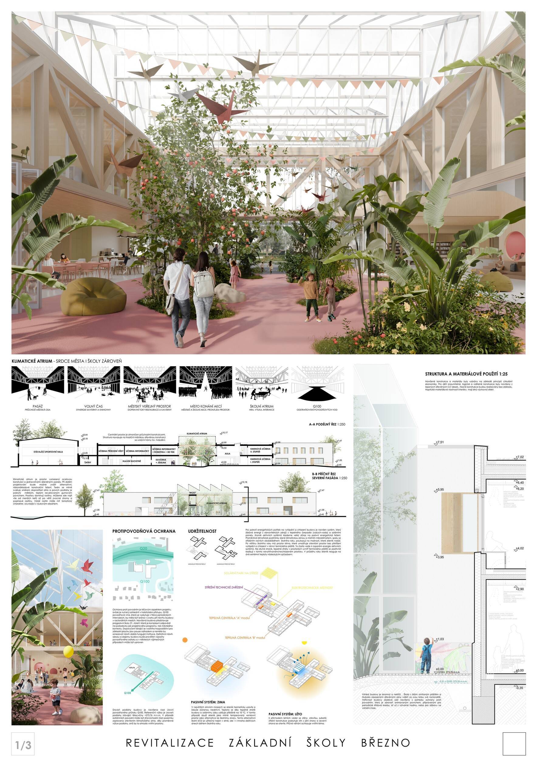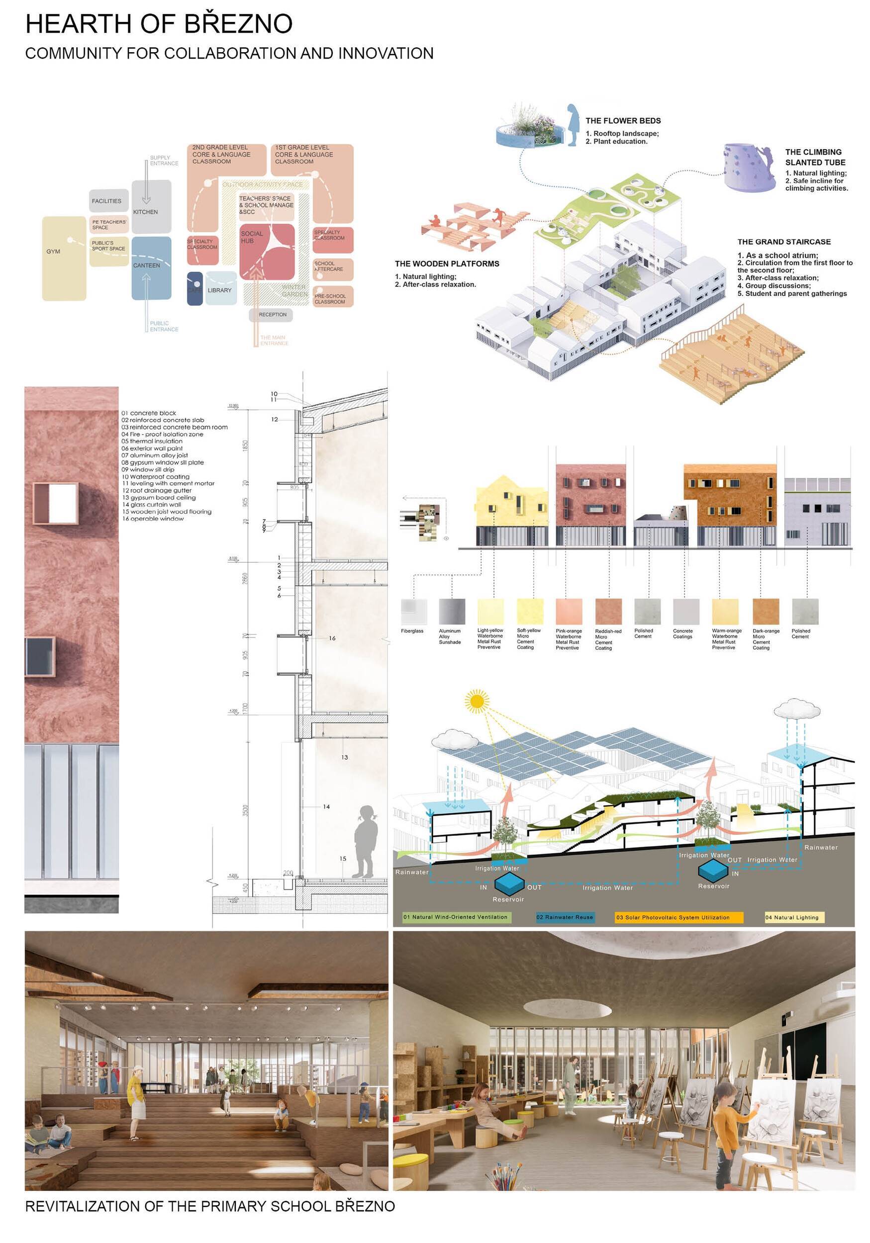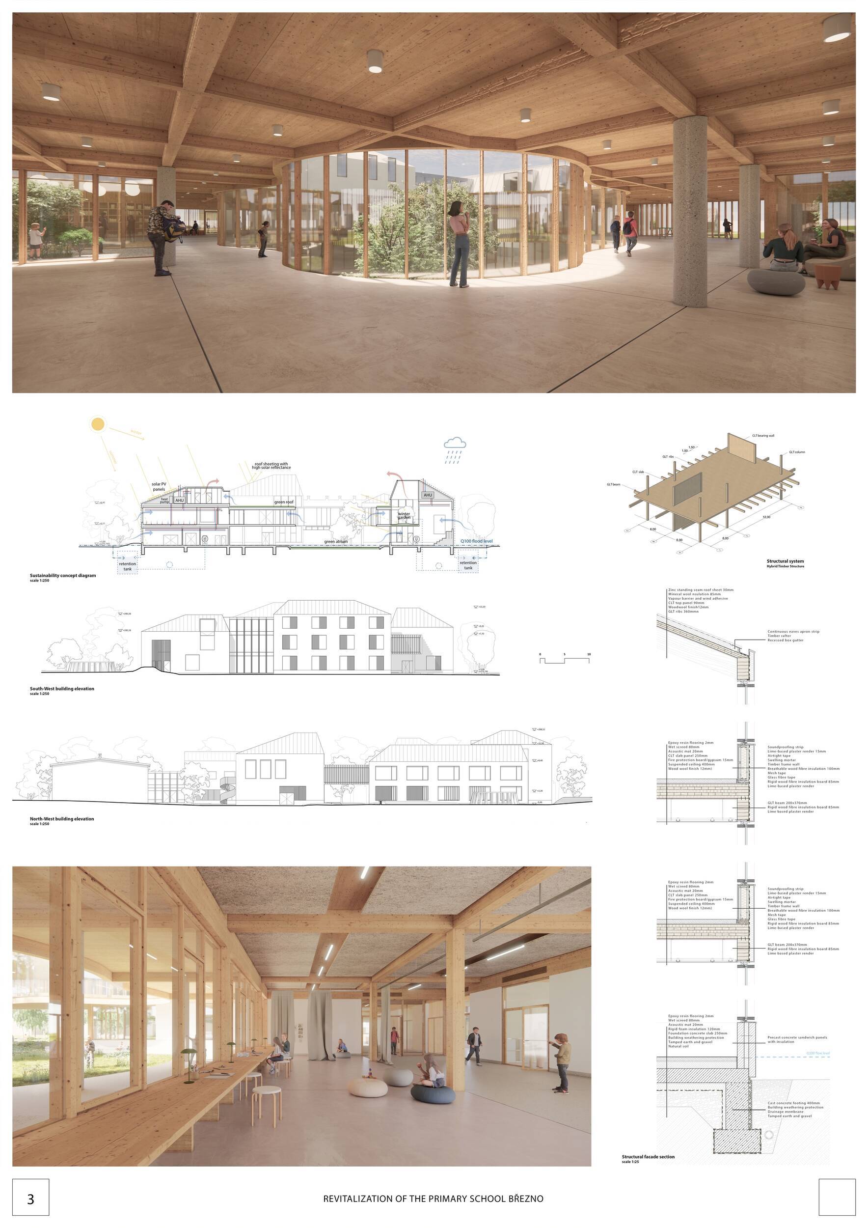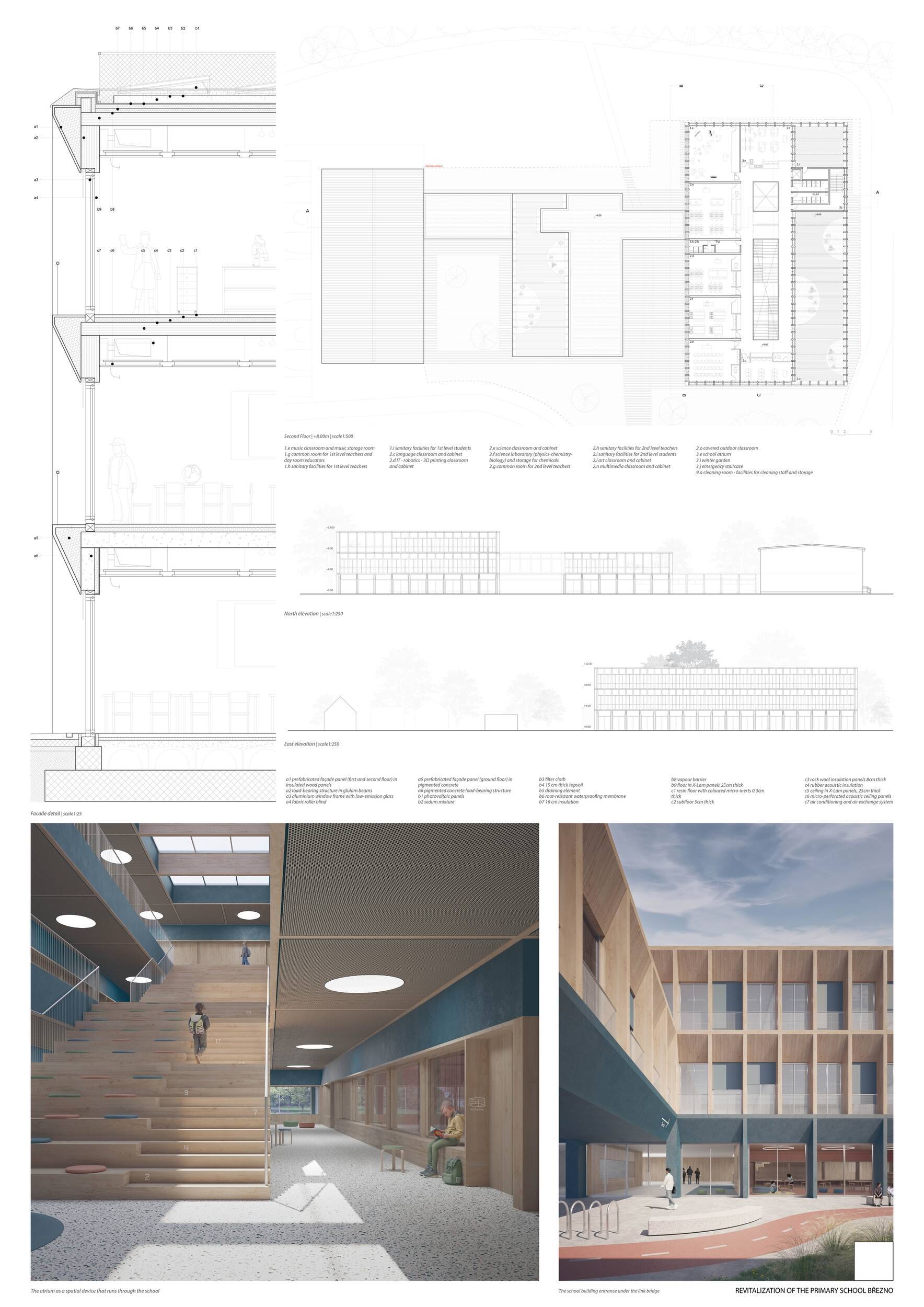 Návrh představuje dobře promyšlené řešení, které reaguje na poptávku nejen po nové škole, ale vlastně i lokální centrum obce. Jedná se o kompaktní dvoupodlažní budovu, která logicky navazuje na stávající tělocvičnu a je orientovaná podél potoka Hutná. V přízemí je objem budovy rozdělen na dvě části dostatečně prostorným a částečně krytým průchodem, na který jsou na jedné straně provozně navázány funkce jako knihovna, kavárna, v návaznosti pak posilovna, sauna, tělocvična. Do průchodu – veřejného prostoru – je také orientovaný hlavní vstup do školy, jídelna a družina. Tento prostor má ambice obohatit život v Březně. Ve druhém nadzemním podlaží se nachází třídy a jejich zázemí.