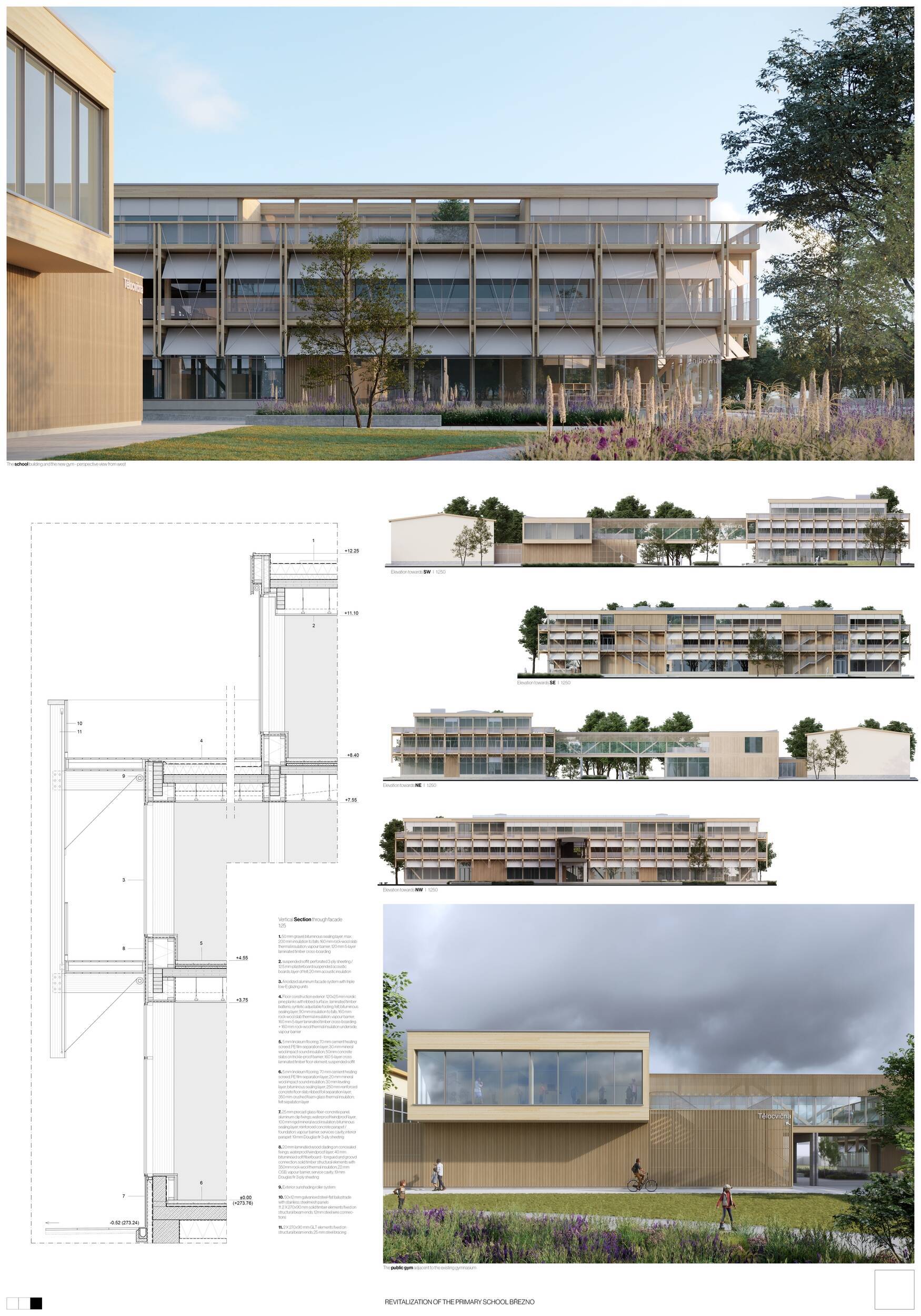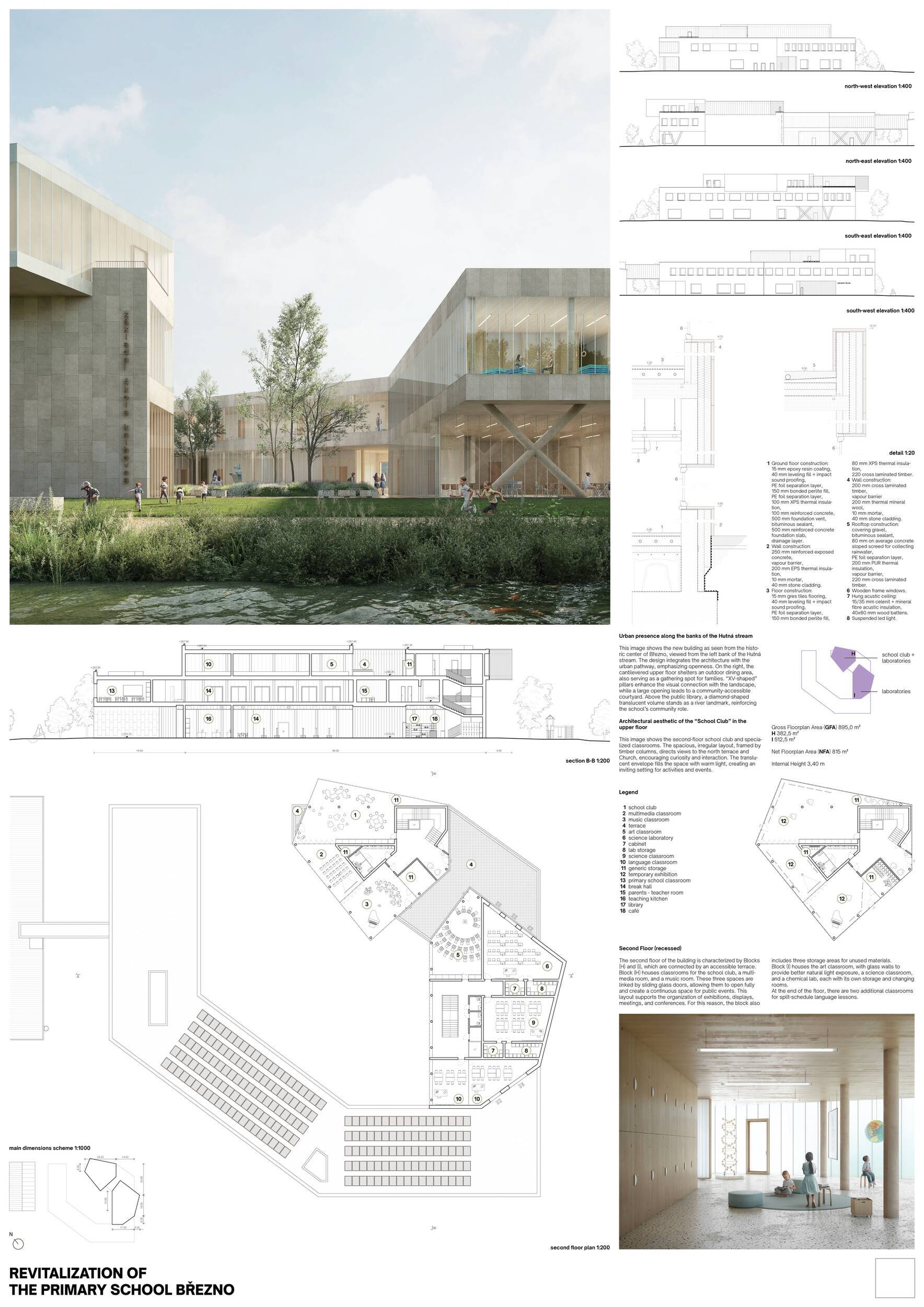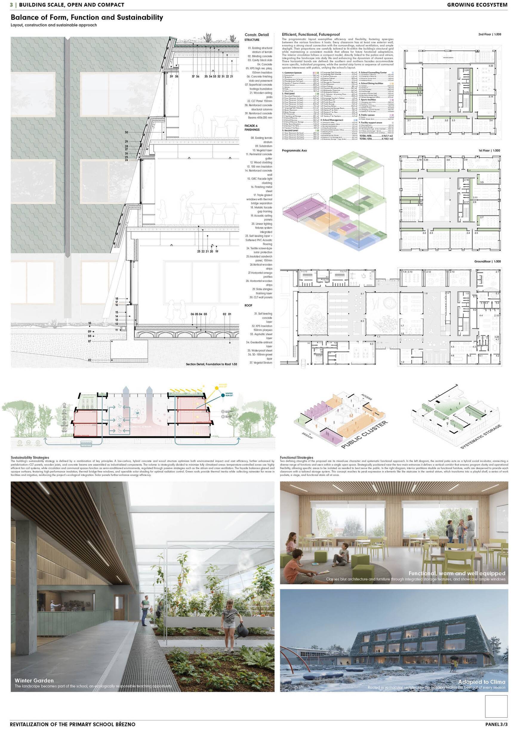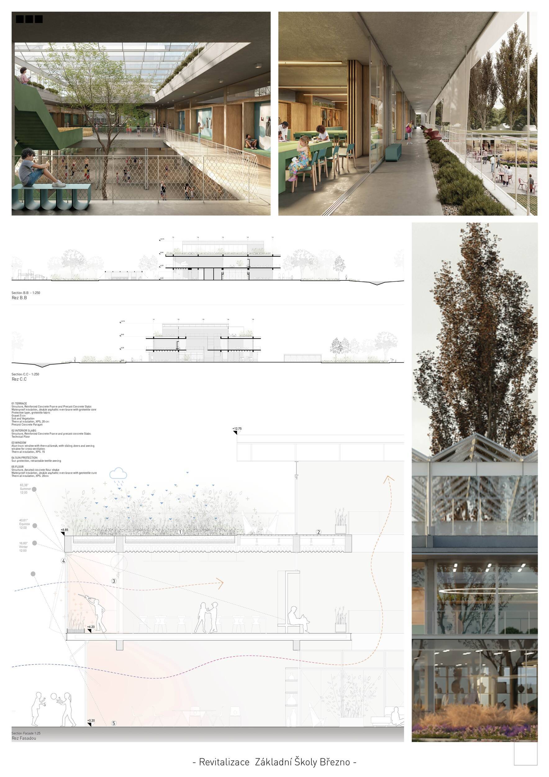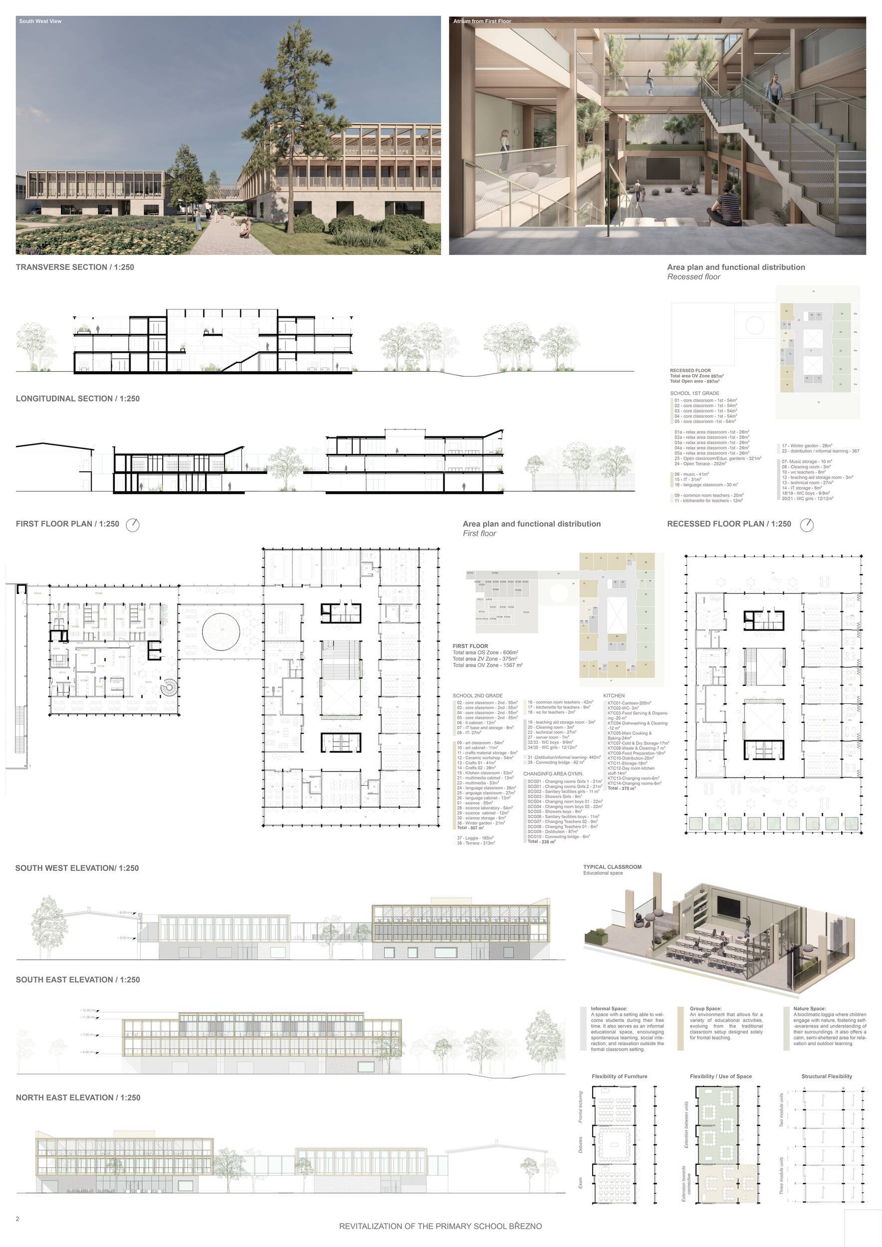 Návrh představuje dobře promyšlené řešení, které reaguje na poptávku nejen po nové škole, ale vlastně i lokální centrum obce. Jedná se o kompaktní dvoupodlažní budovu, která logicky navazuje na stávající tělocvičnu a je orientovaná podél potoka Hutná. V přízemí je objem budovy rozdělen na dvě části dostatečně prostorným a částečně krytým průchodem, na který jsou na jedné straně provozně navázány funkce jako knihovna, kavárna, v návaznosti pak posilovna, sauna, tělocvična. Do průchodu – veřejného prostoru – je také orientovaný hlavní vstup do školy, jídelna a družina. Tento prostor má ambice obohatit život v Březně. Ve druhém nadzemním podlaží se nachází třídy a jejich zázemí.