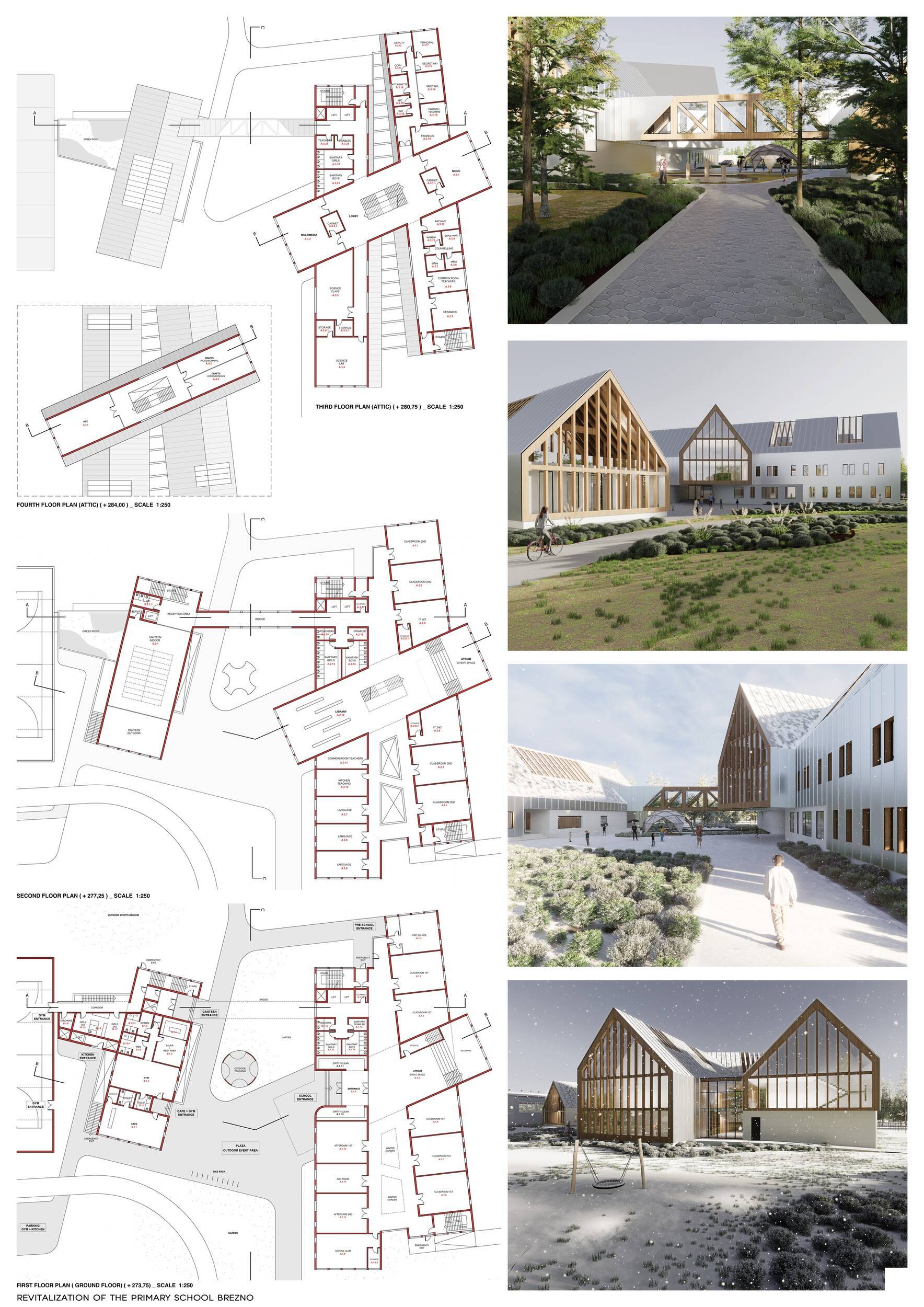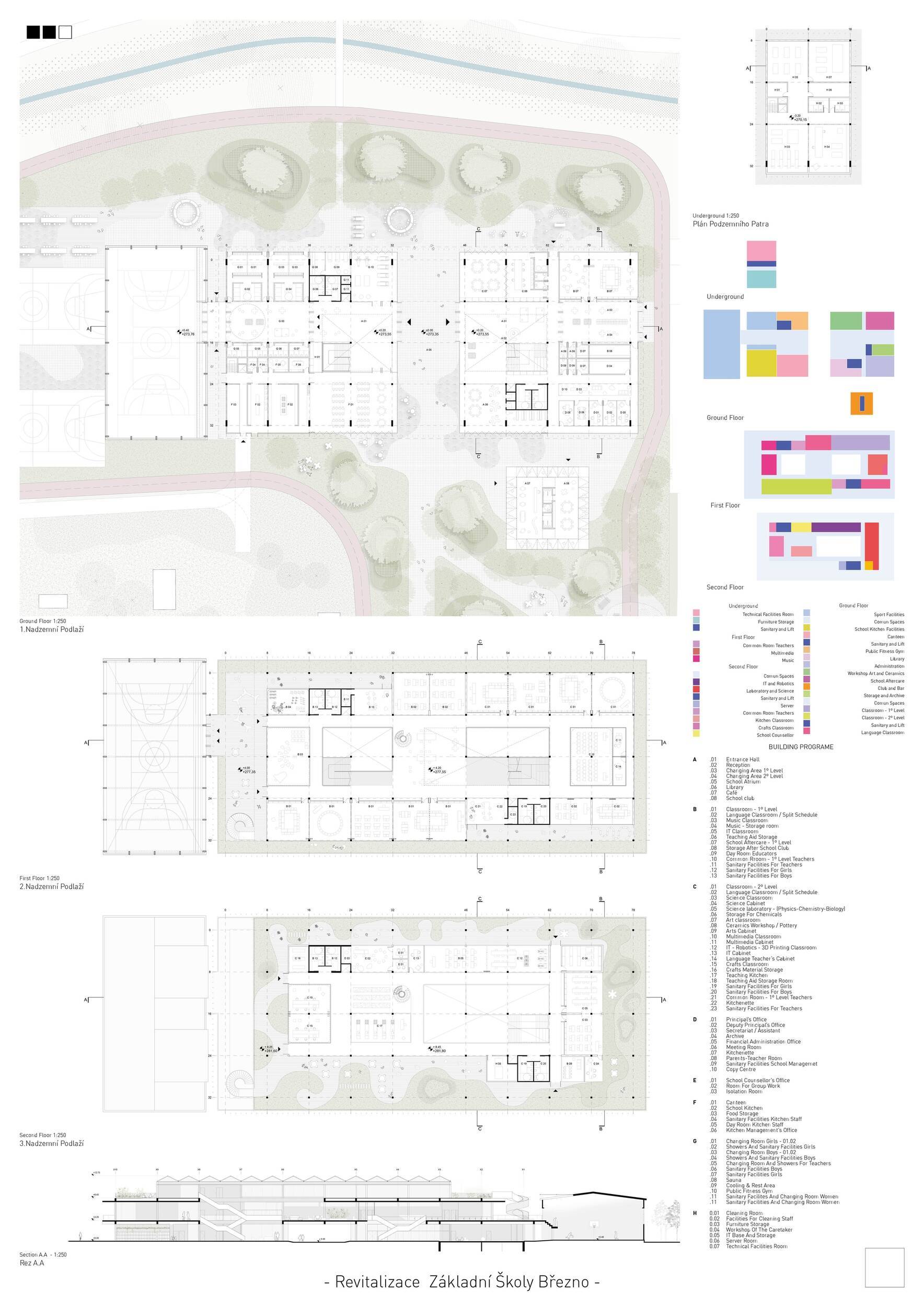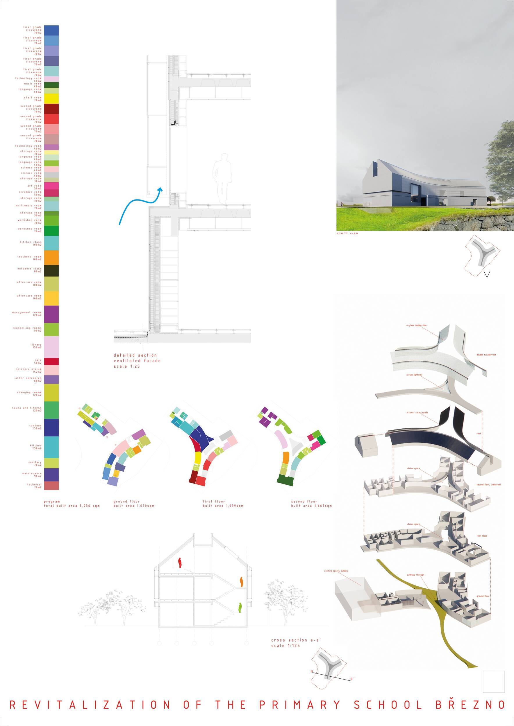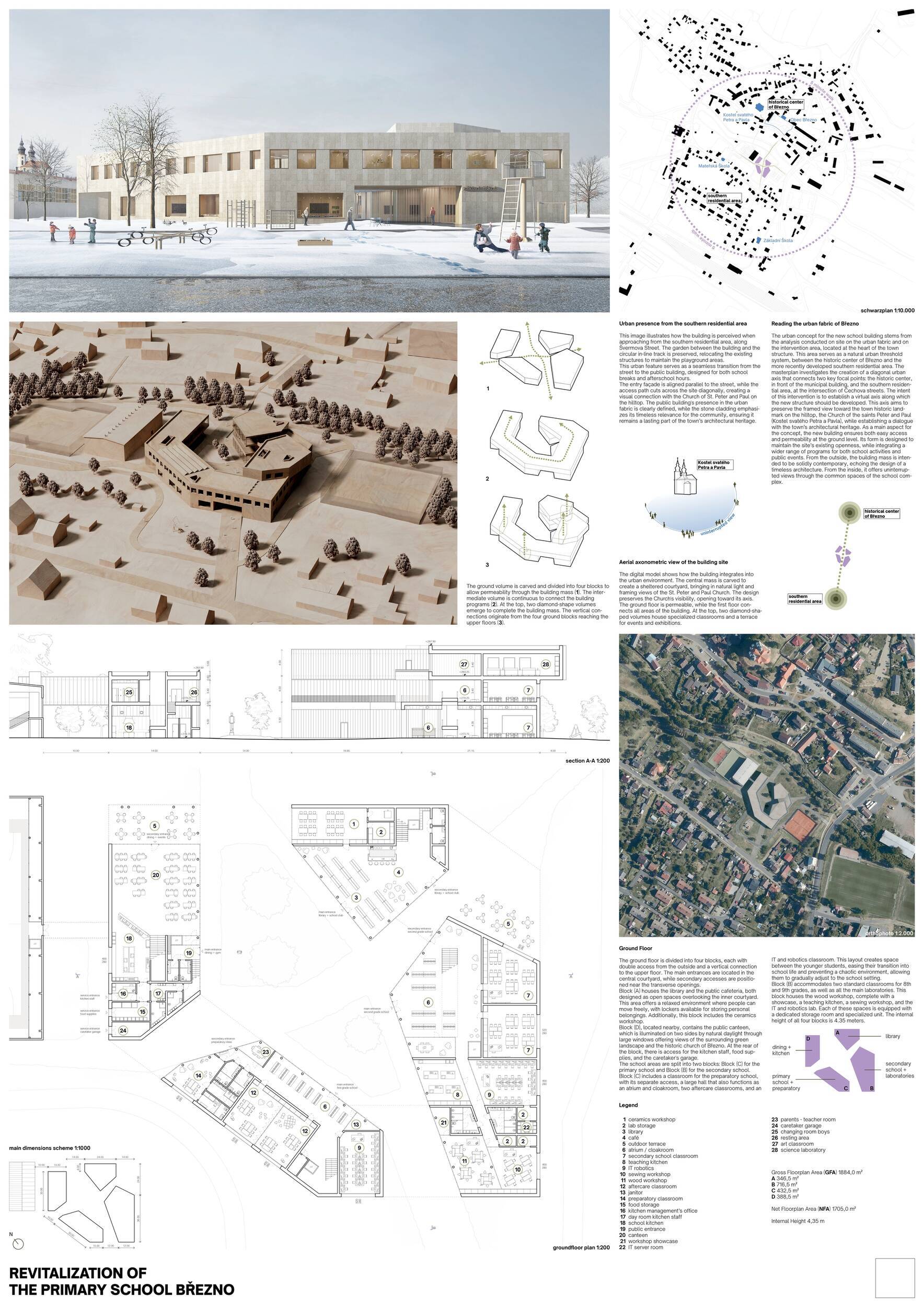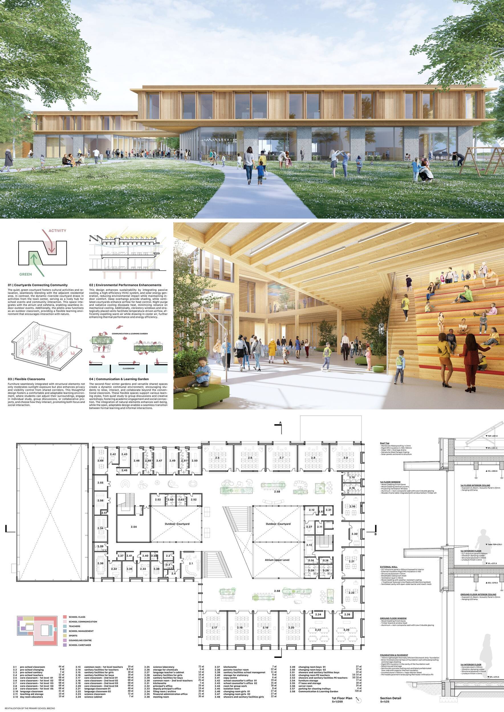 Návrh představuje dobře promyšlené řešení, které reaguje na poptávku nejen po nové škole, ale vlastně i lokální centrum obce. Jedná se o kompaktní dvoupodlažní budovu, která logicky navazuje na stávající tělocvičnu a je orientovaná podél potoka Hutná. V přízemí je objem budovy rozdělen na dvě části dostatečně prostorným a částečně krytým průchodem, na který jsou na jedné straně provozně navázány funkce jako knihovna, kavárna, v návaznosti pak posilovna, sauna, tělocvična. Do průchodu – veřejného prostoru – je také orientovaný hlavní vstup do školy, jídelna a družina. Tento prostor má ambice obohatit život v Březně. Ve druhém nadzemním podlaží se nachází třídy a jejich zázemí.