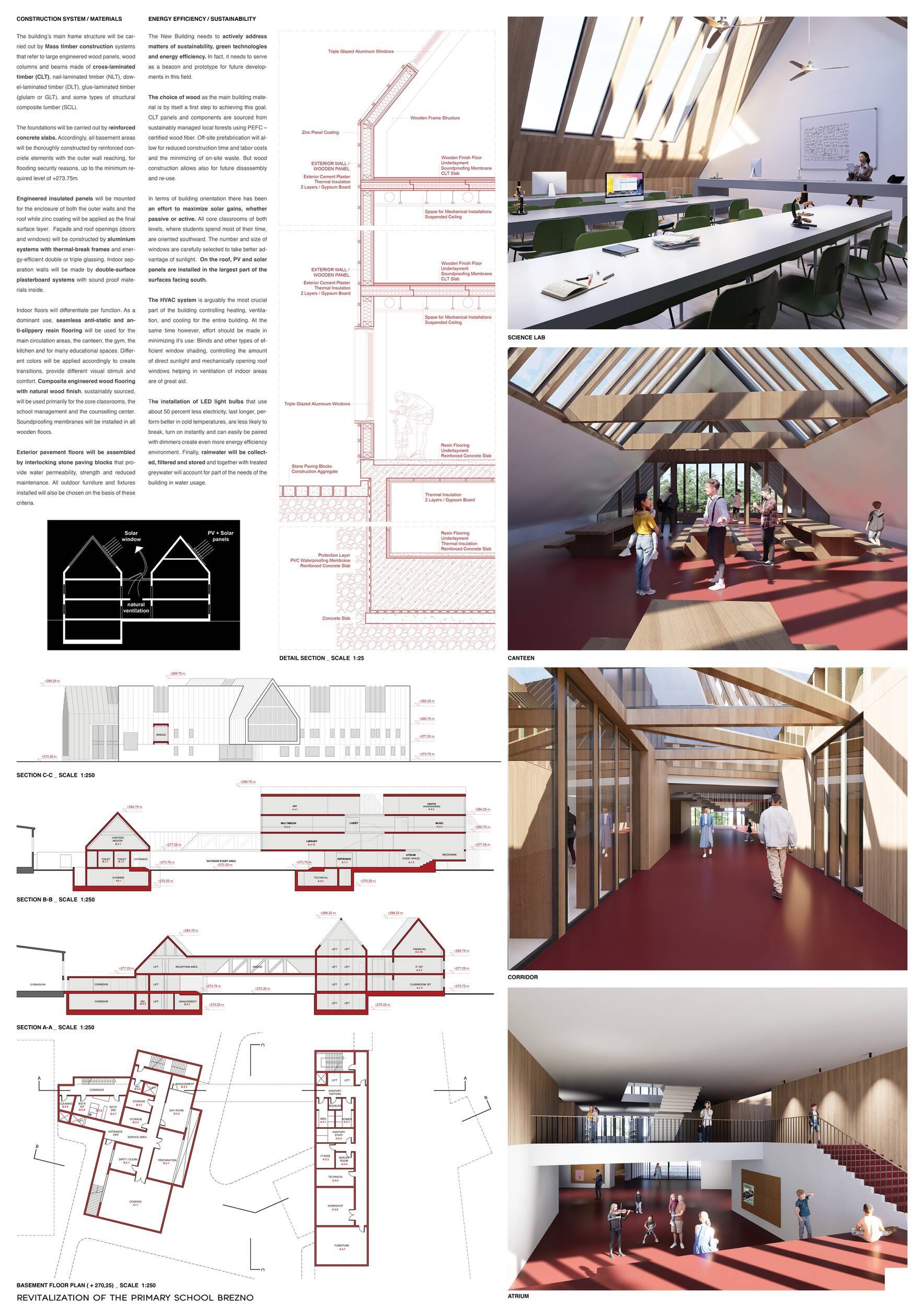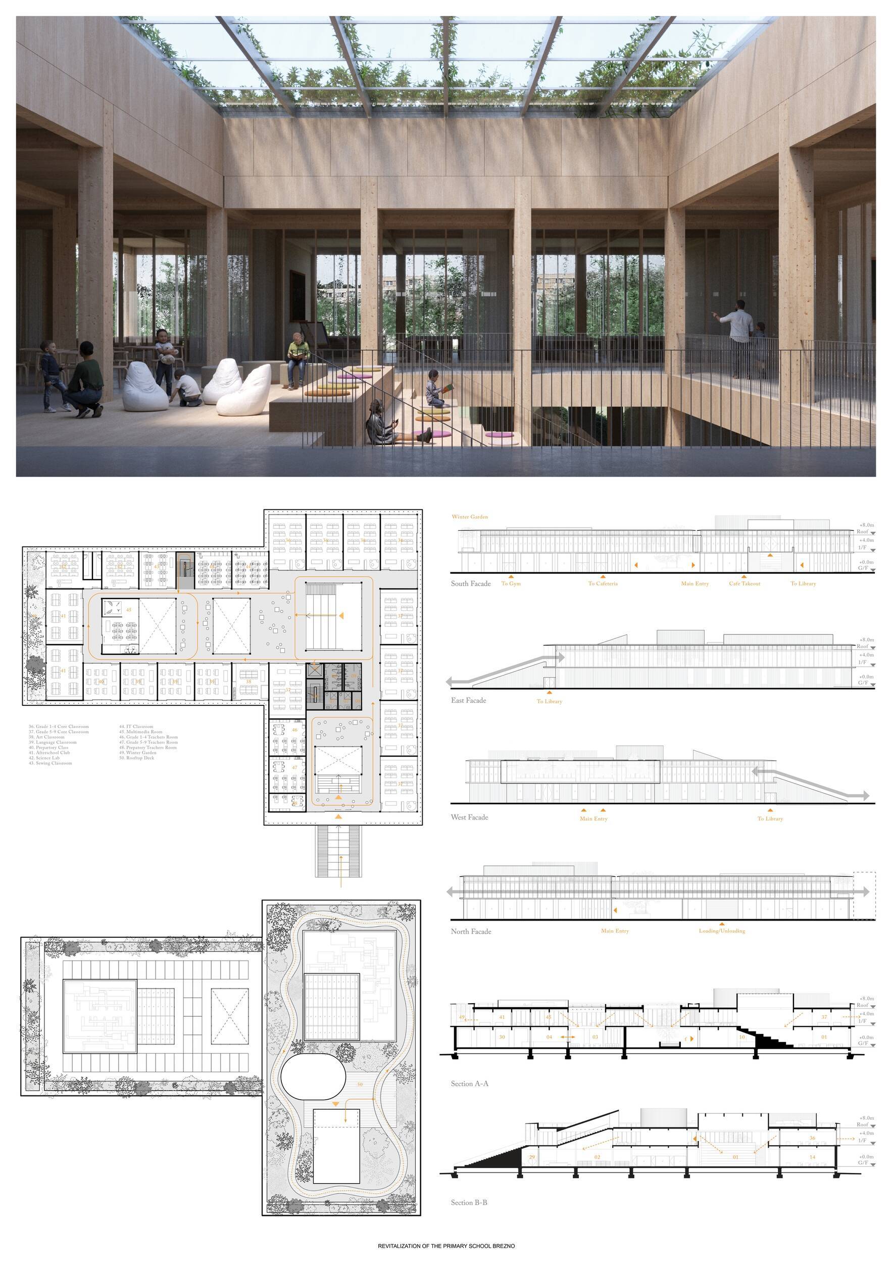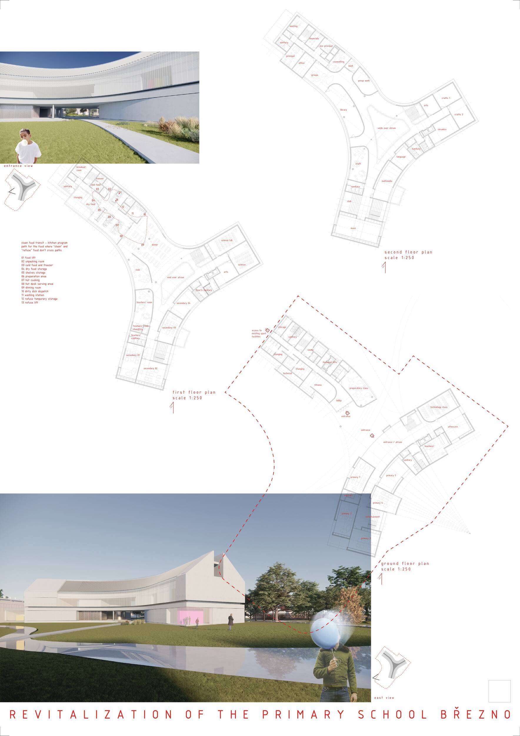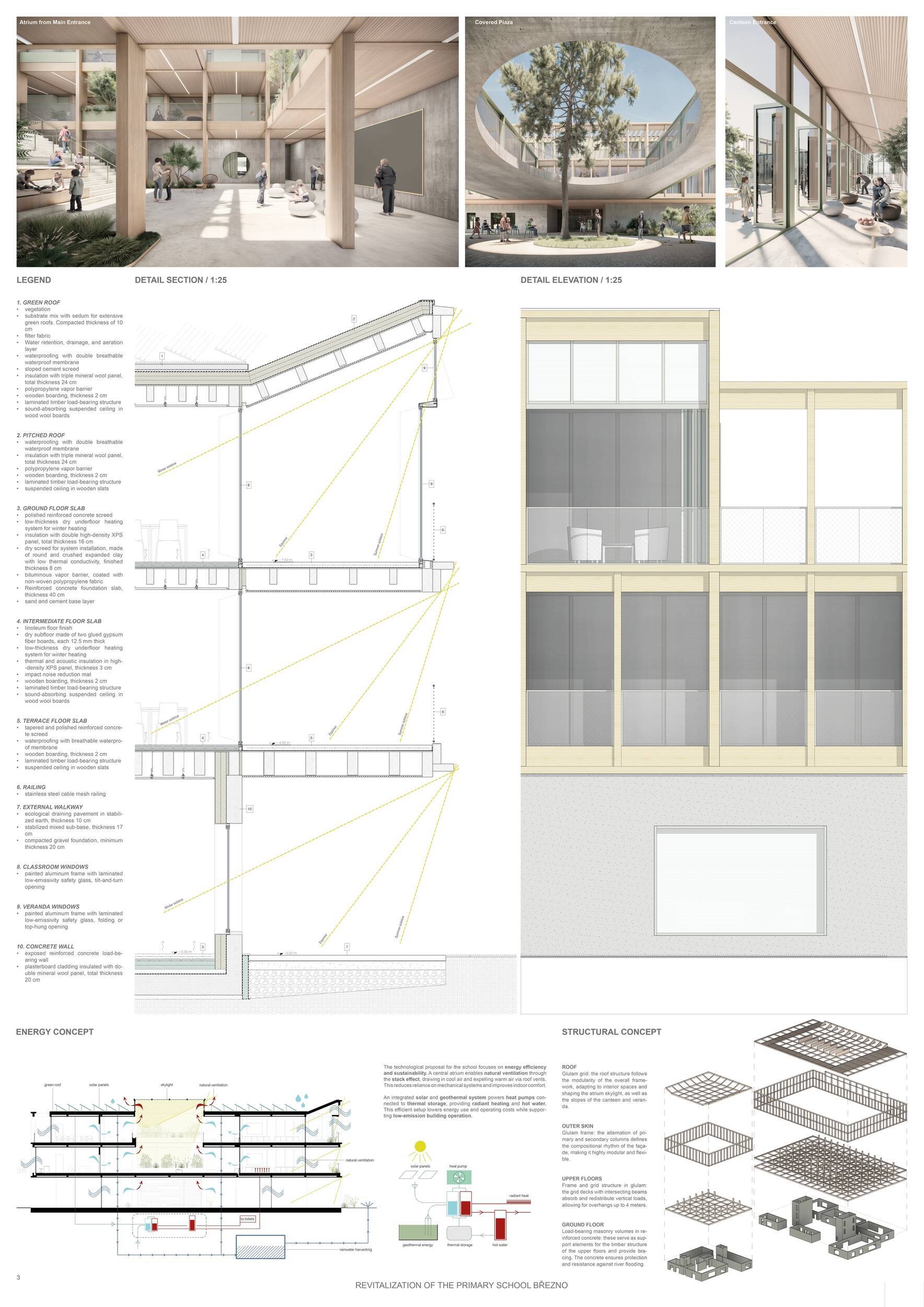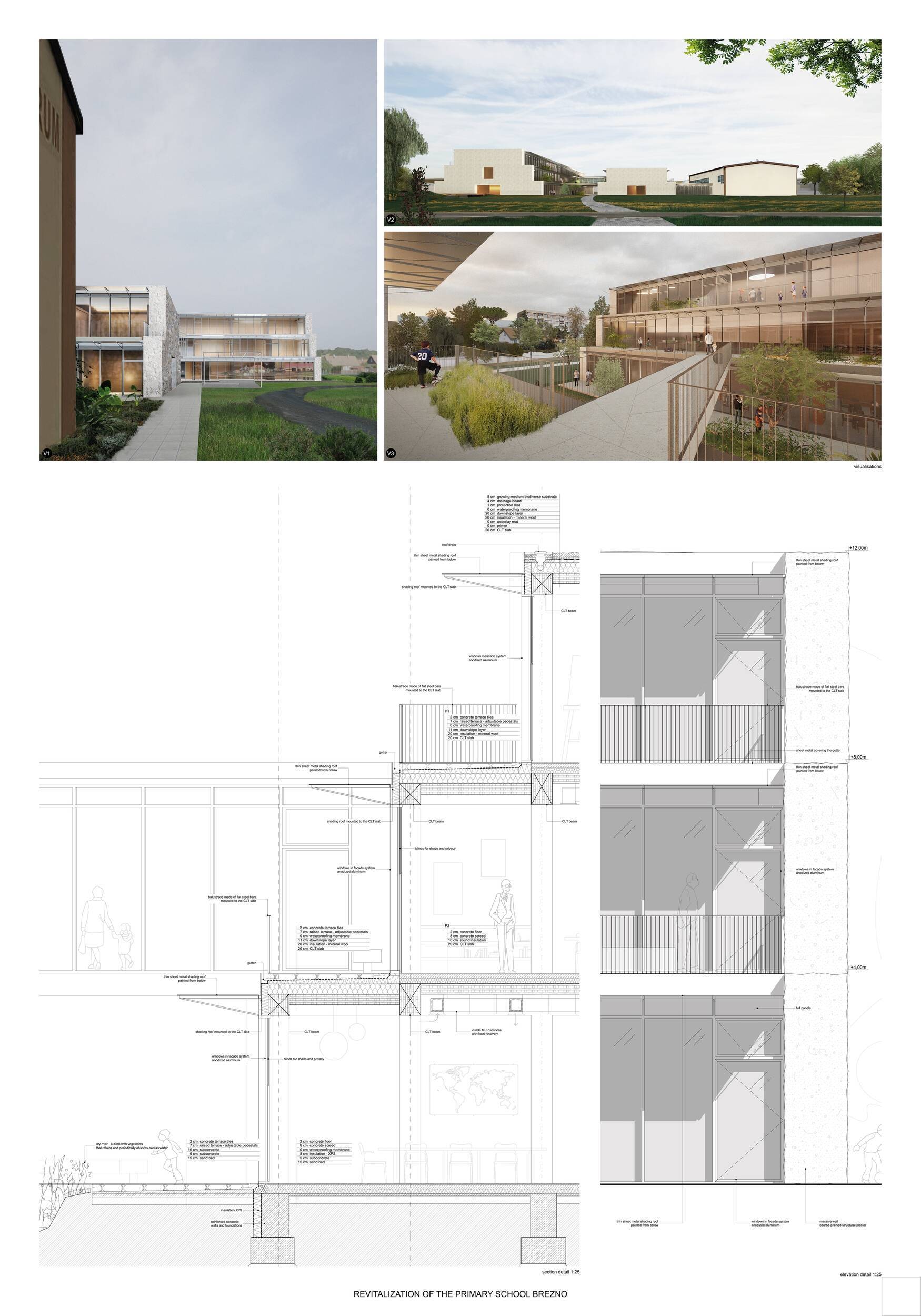Návrh představuje dobře promyšlené řešení, které reaguje na poptávku nejen po nové škole, ale vlastně i lokální centrum obce. Jedná se o kompaktní dvoupodlažní budovu, která logicky navazuje na stávající tělocvičnu a je orientovaná podél potoka Hutná. V přízemí je objem budovy rozdělen na dvě části dostatečně prostorným a částečně krytým průchodem, na který jsou na jedné straně provozně navázány funkce jako knihovna, kavárna, v návaznosti pak posilovna, sauna, tělocvična. Do průchodu – veřejného prostoru – je také orientovaný hlavní vstup do školy, jídelna a družina. Tento prostor má ambice obohatit život v Březně. Ve druhém nadzemním podlaží se nachází třídy a jejich zázemí.