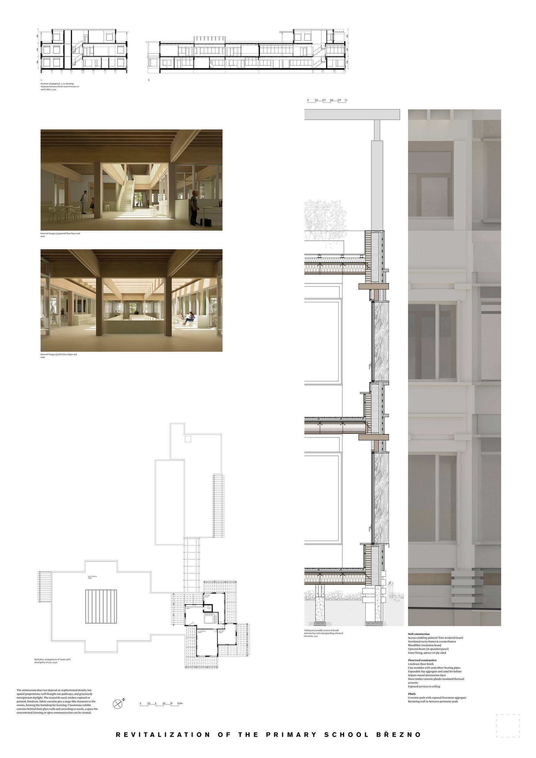 Dispozice je velmi přehledná, kombinace výukových prostor funkční a učebny dobře přirozeně prosvětlené. Poměr mezi prostory pro výuku a prostory pro oddech, setkávání a komunikaci je vyvážený. Velmi dobře je vyřešeno napojení na stávající tělocvičnu jak funkčně v přízemí, tak příjemnou terasou ve druhém nadzemním podlaží. Využití střechy pro hřiště bude zřejmě k diskusi.