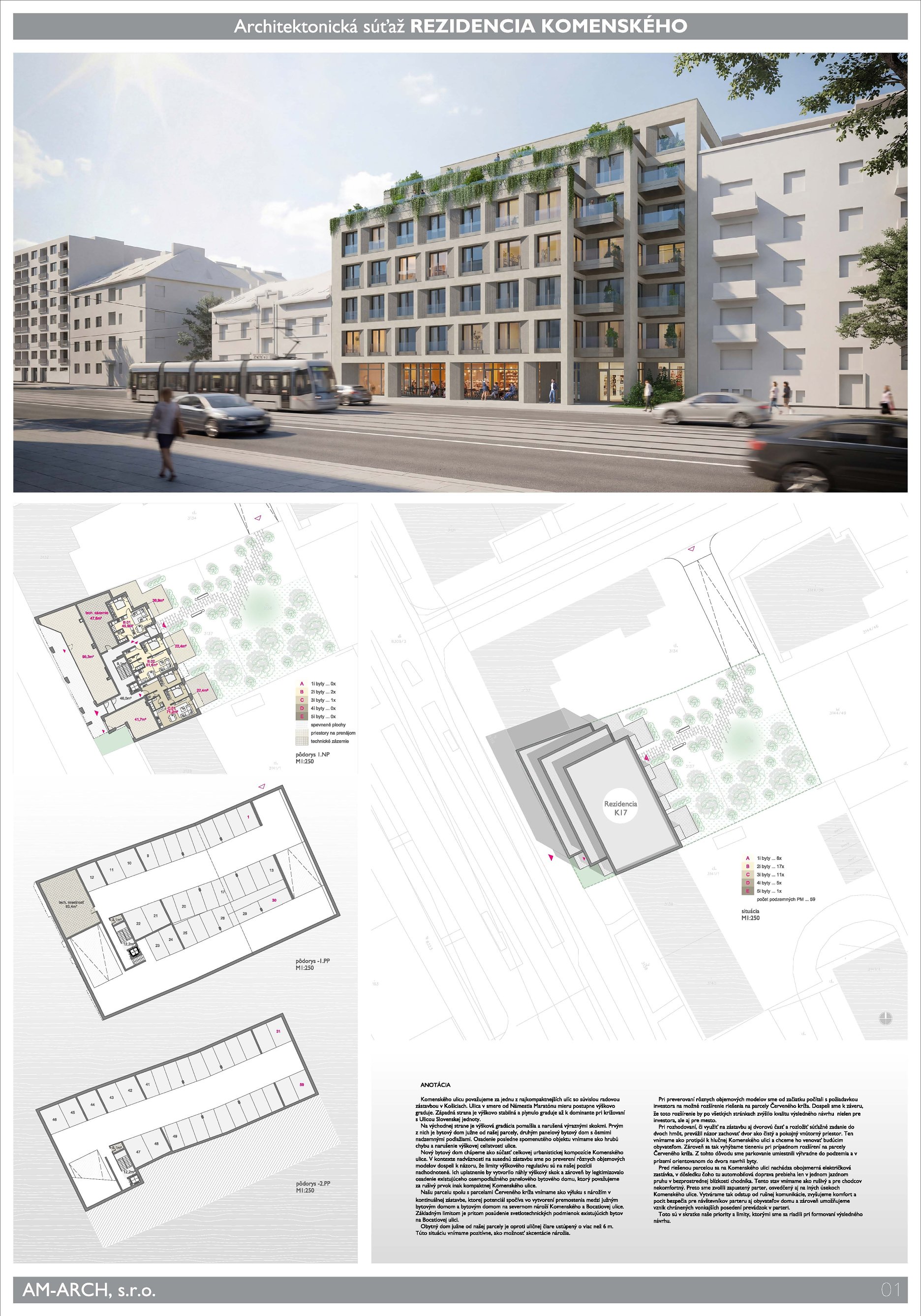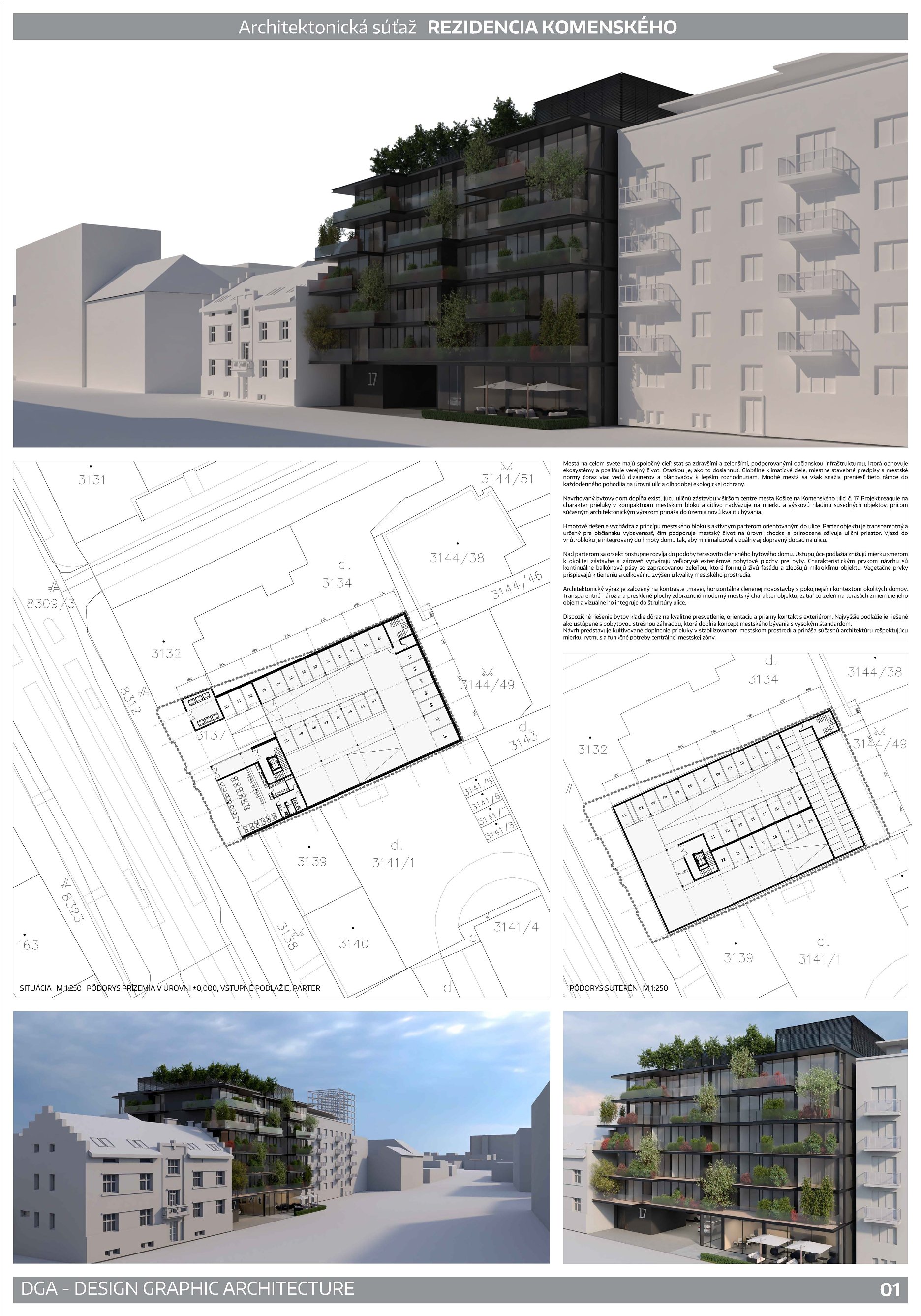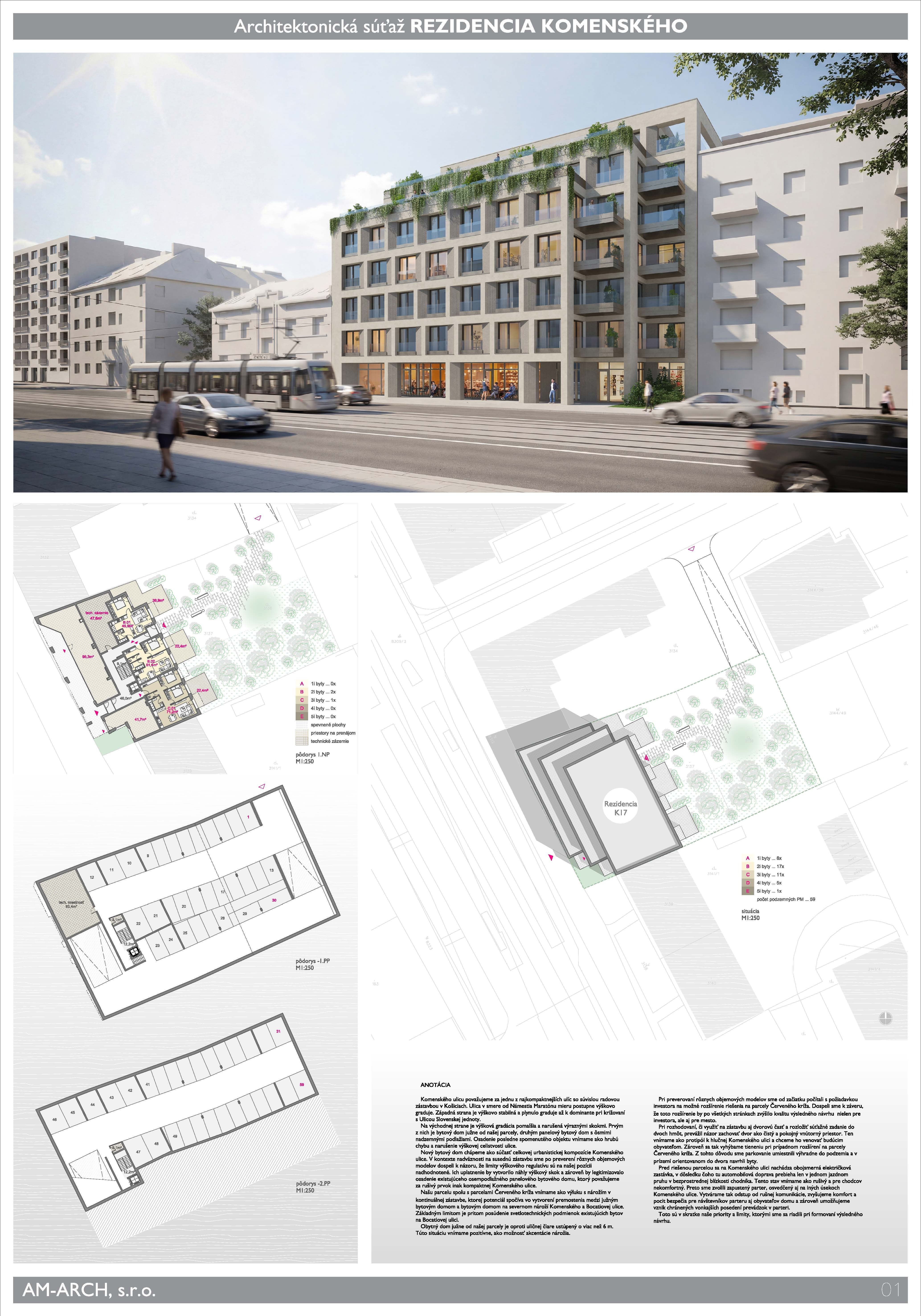 Predmetom bol architektonický návrh rezidenčného objektu s aktívnym uličným parterom na Komenského ulici v Košiciach, v bezprostrednej blízkosti Mestskej pamiatkovej rezervácie. Vyhlasovateľ očakával riešenie, ktoré doplní uličný rad a prinesie približne 41 bytov v rozpätí od menších jednoizbových a dvojizbových až po väčšie rodinné byty, vrátane dvoch veľkometrážnych jednotiek v na ustúpenom podlaží s výhľadmi na centrum a Bankov.