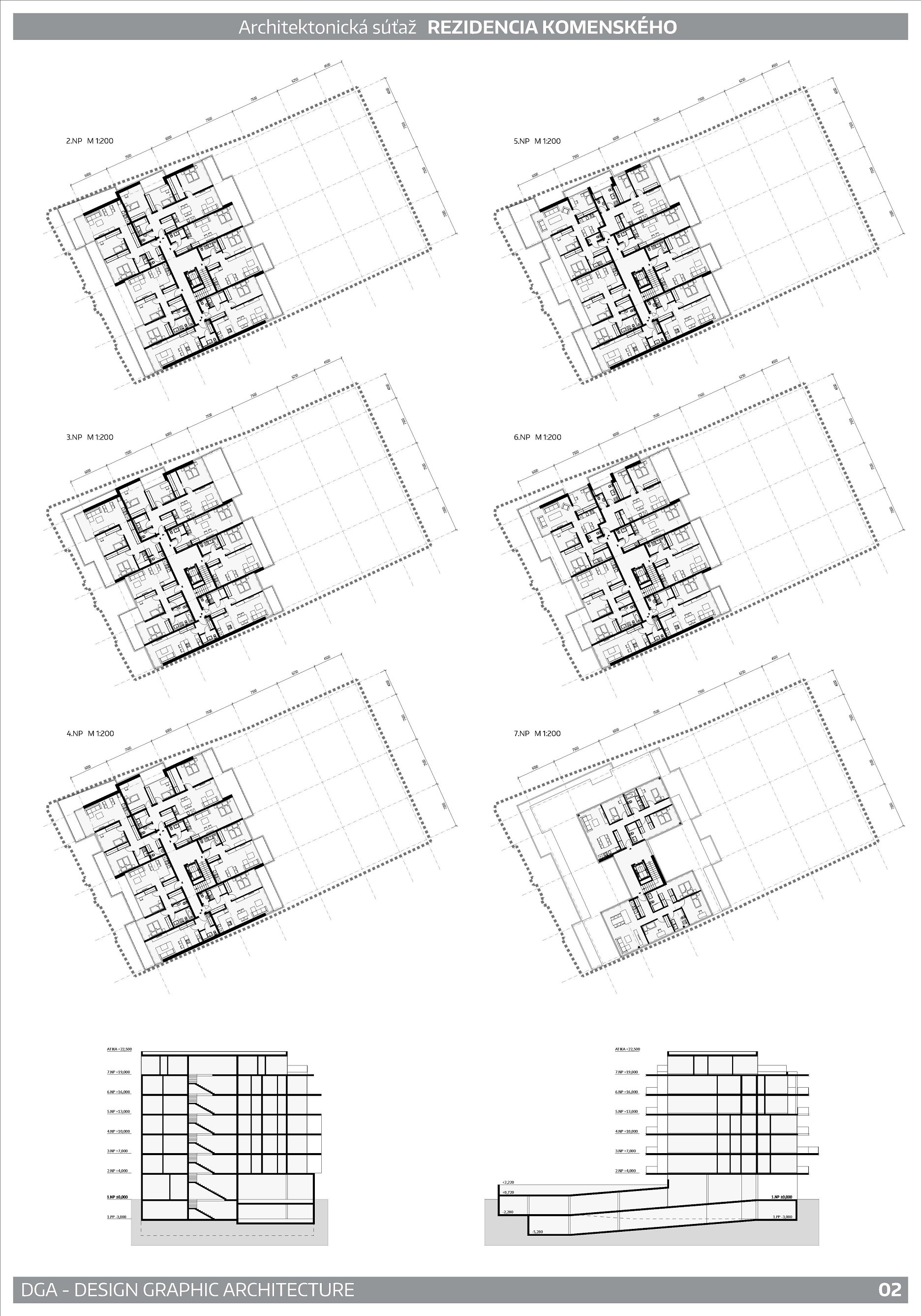 Zaujímavým koncepčným prvkom návrhu je použitie dvoch vertikálnych komunikačných jadier stavby. Okrem pozitívneho dopadu na podstatné zvýšenie výmery predajnej plochy bytov, však toto riešenie prináša aj veľmi dlhé, horšie presvetlené dispozície bytov a stiesnené spoločné priestory bytového domu. Navrhovanou zástavbou vhodne nadväzuje na existujúci bytový dom z južnej strany a vytvára dobré podmienky na dotvorenie ulice zo severnej strany.