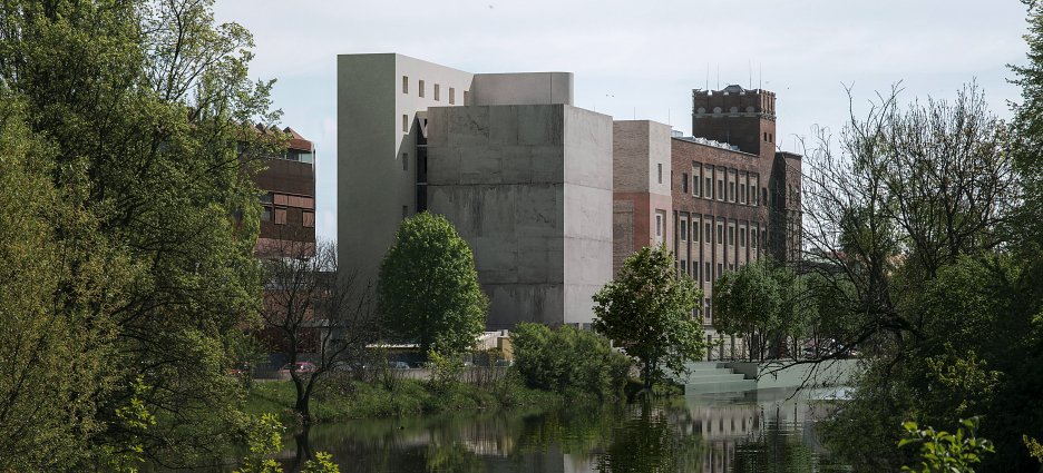 Soutěžní návrh získal odměnu za snahu o reminiscenci stávající budovy moučných sil a otevřený parter.