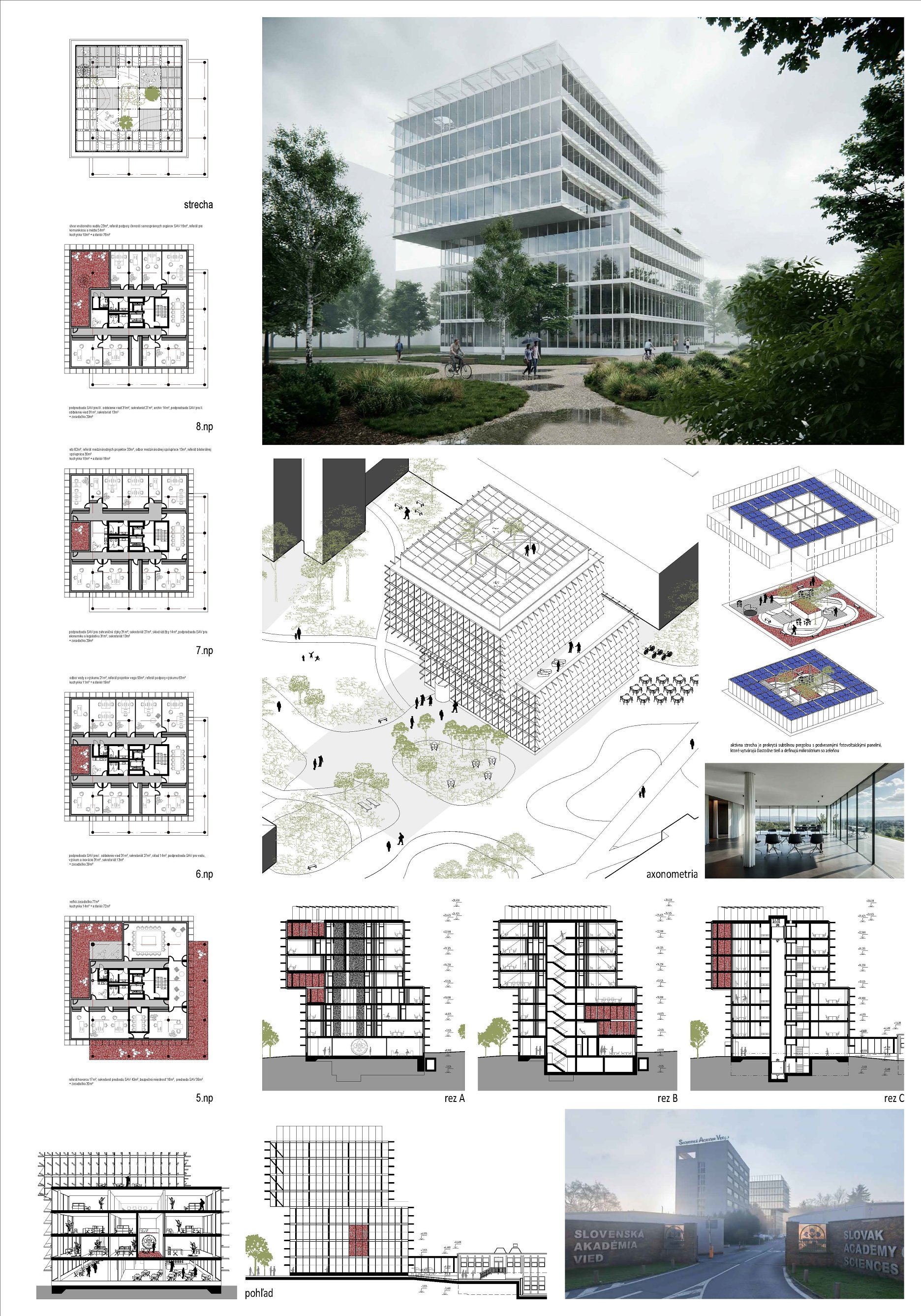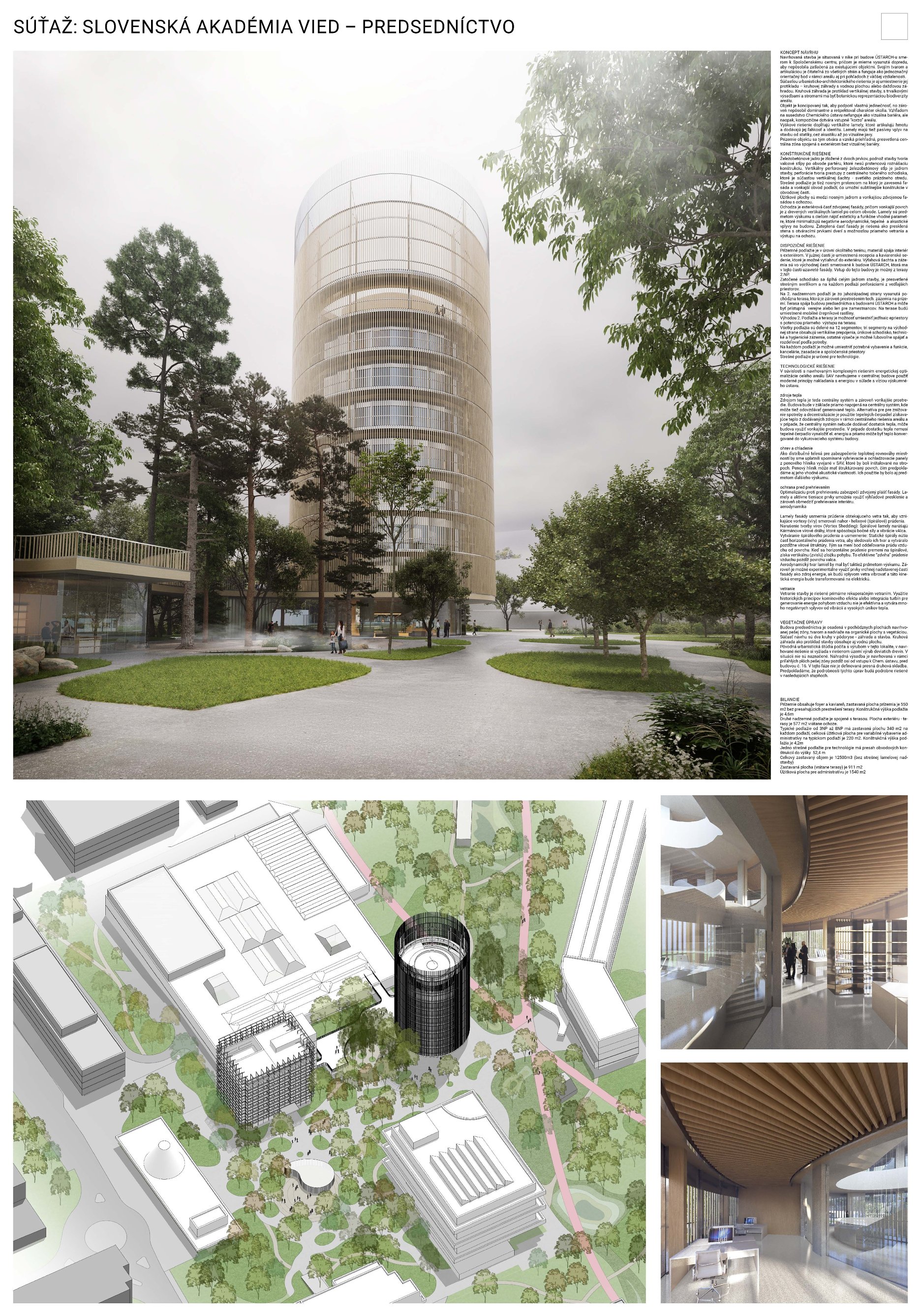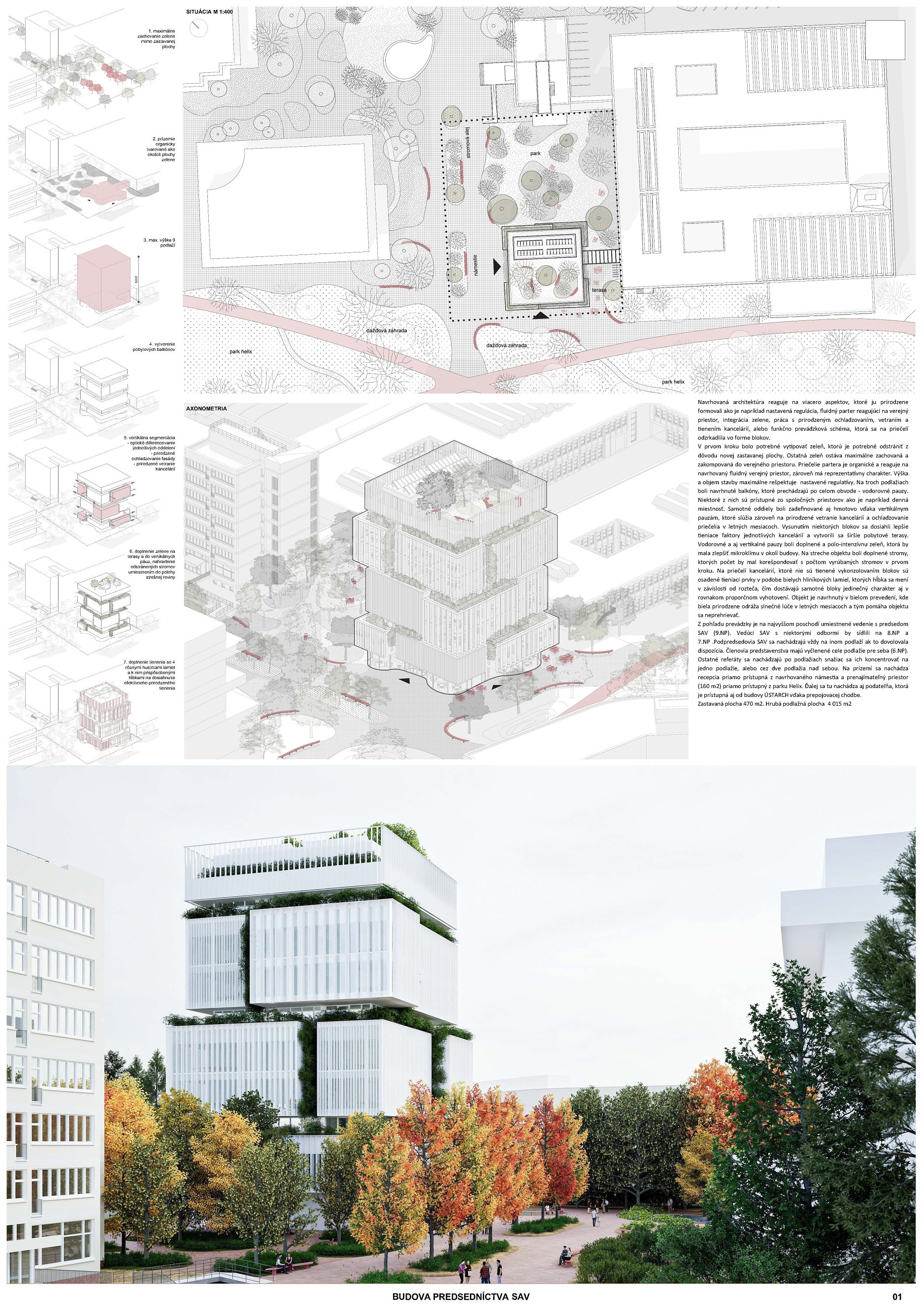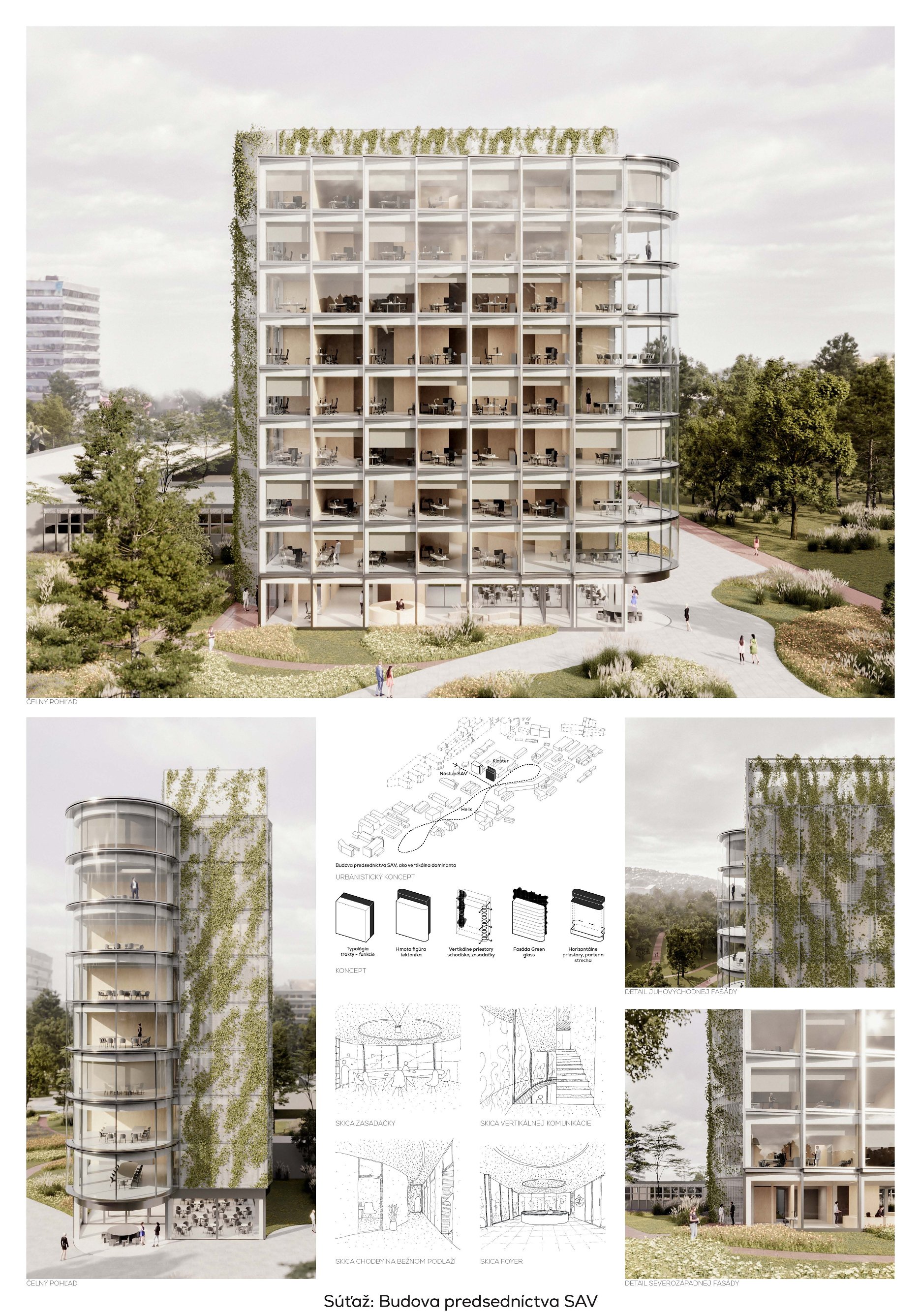 Návrh je hmotovo členený na tri jasne čitateľné objemy, ktoré tvoria kompozíciu hlavného traktu a dvojice bočných krídel. Hlavný trakt vystupuje ako deväťpodlažný objem za existujúcou vstupnou budovou SAV a v mierke aj urbanistickom osadení ju primerane dopĺňa. Za problematické však porota považuje riešenie hlavného preplávajúceho halového priestoru: jeho priestorové a kompozičné napojenie na hlavné urbanistické osi územia nie je presvedčivé a svojou výškou a proporciami pôsobí neprimerane monumentalizovaným, až chrámovým dojmom, ktorý prekračuje mierku a charakter požadovaného zadania. Architektonické, materiálové a farebné stvárnenie fasád ostatných častí objektu pôsobí dôstojne a kultivovane, v zásade v súlade s reprezentatívnymi požiadavkami predsedníctva SAV. Napriek tomu typické dispozičné členenie jednotlivých podlaží nepôsobí priestorovo vyzrete a „vyčistene“ - nadmerný počet zalomení a nároží a presvetlenej komunikácie generuje komplikovanú a málo prehľadnú vnútornú štruktúru.