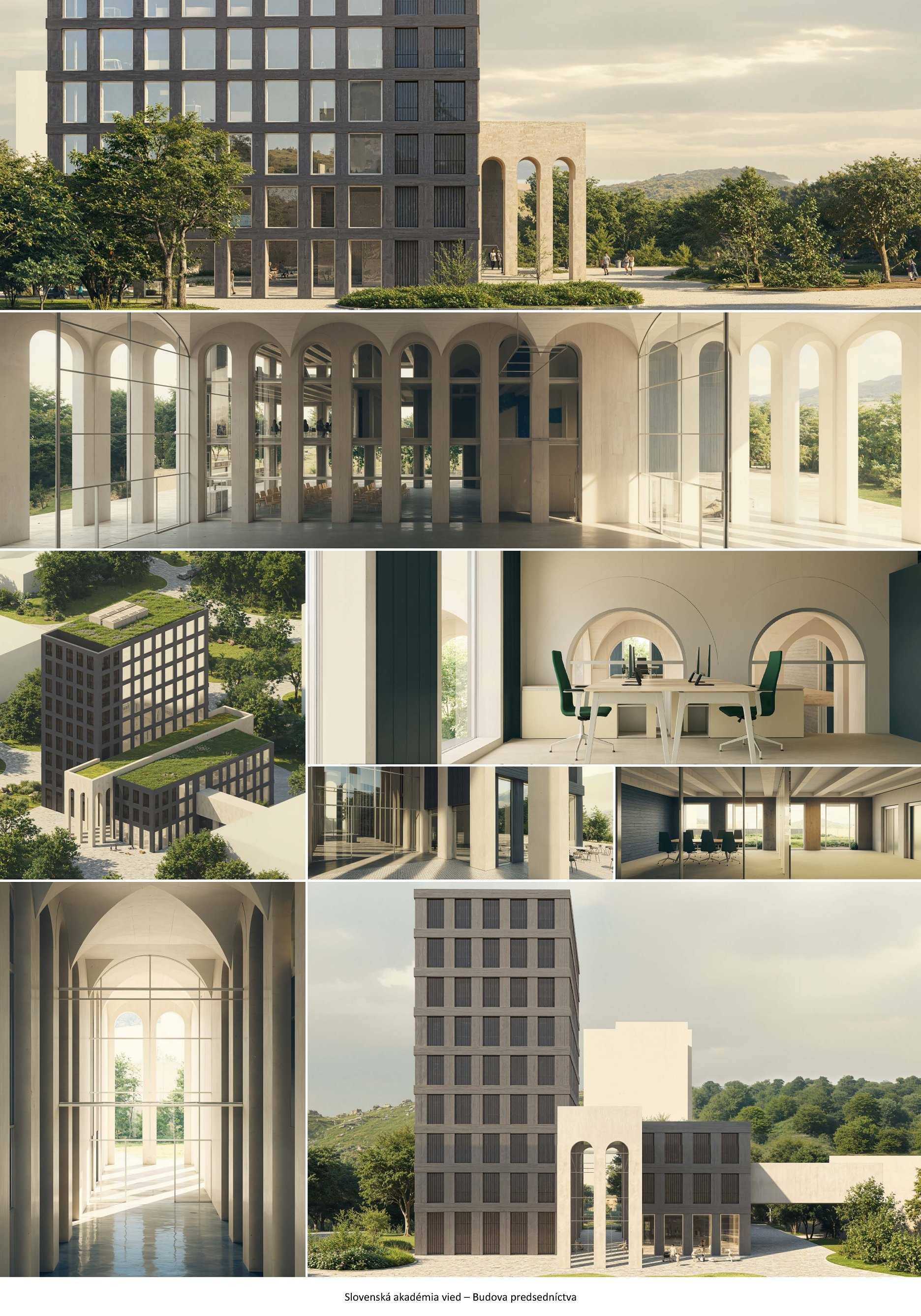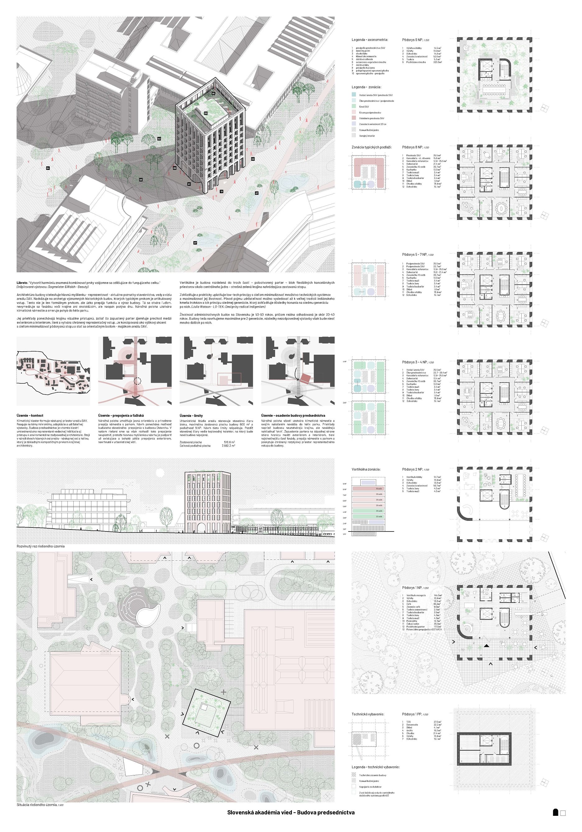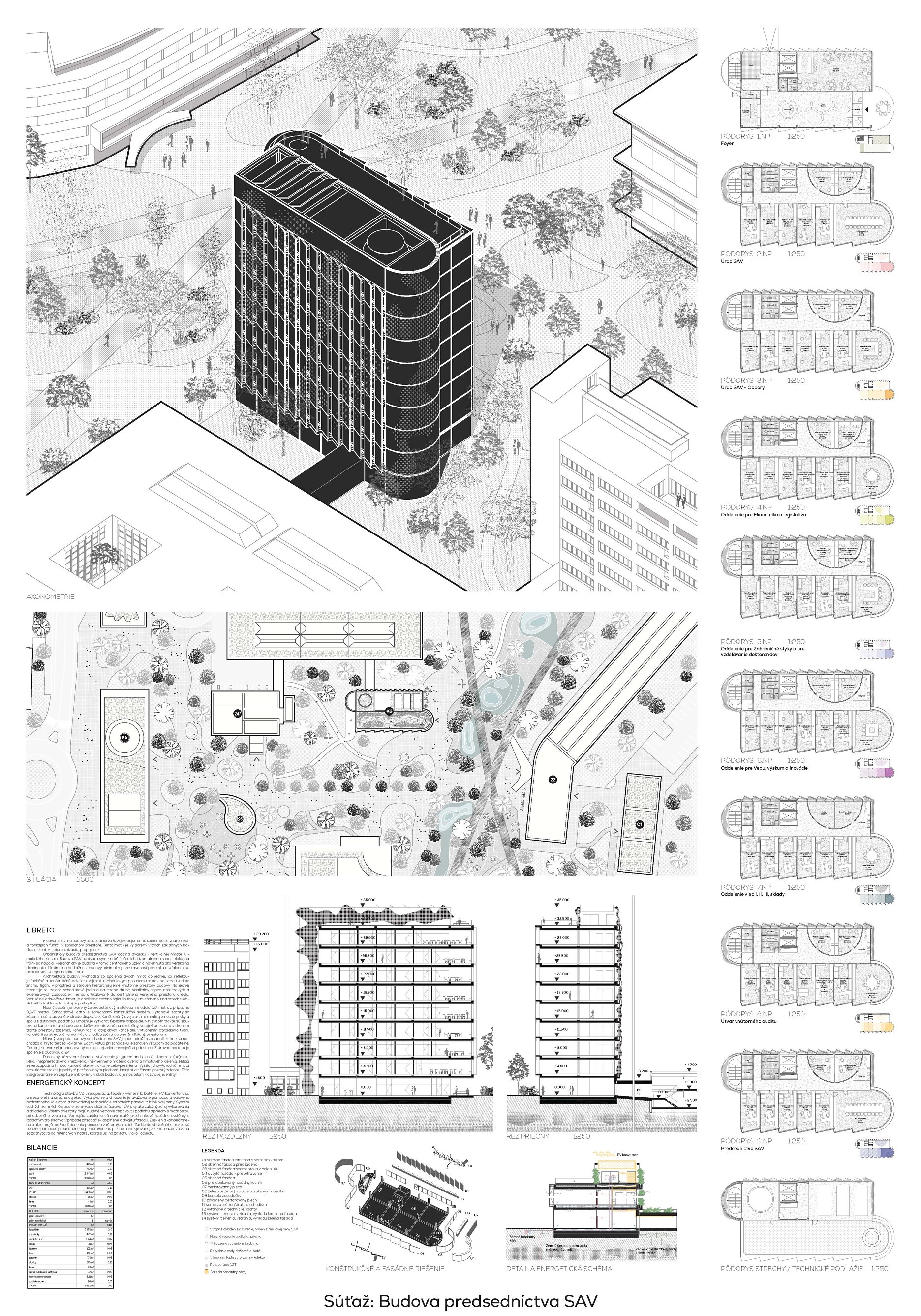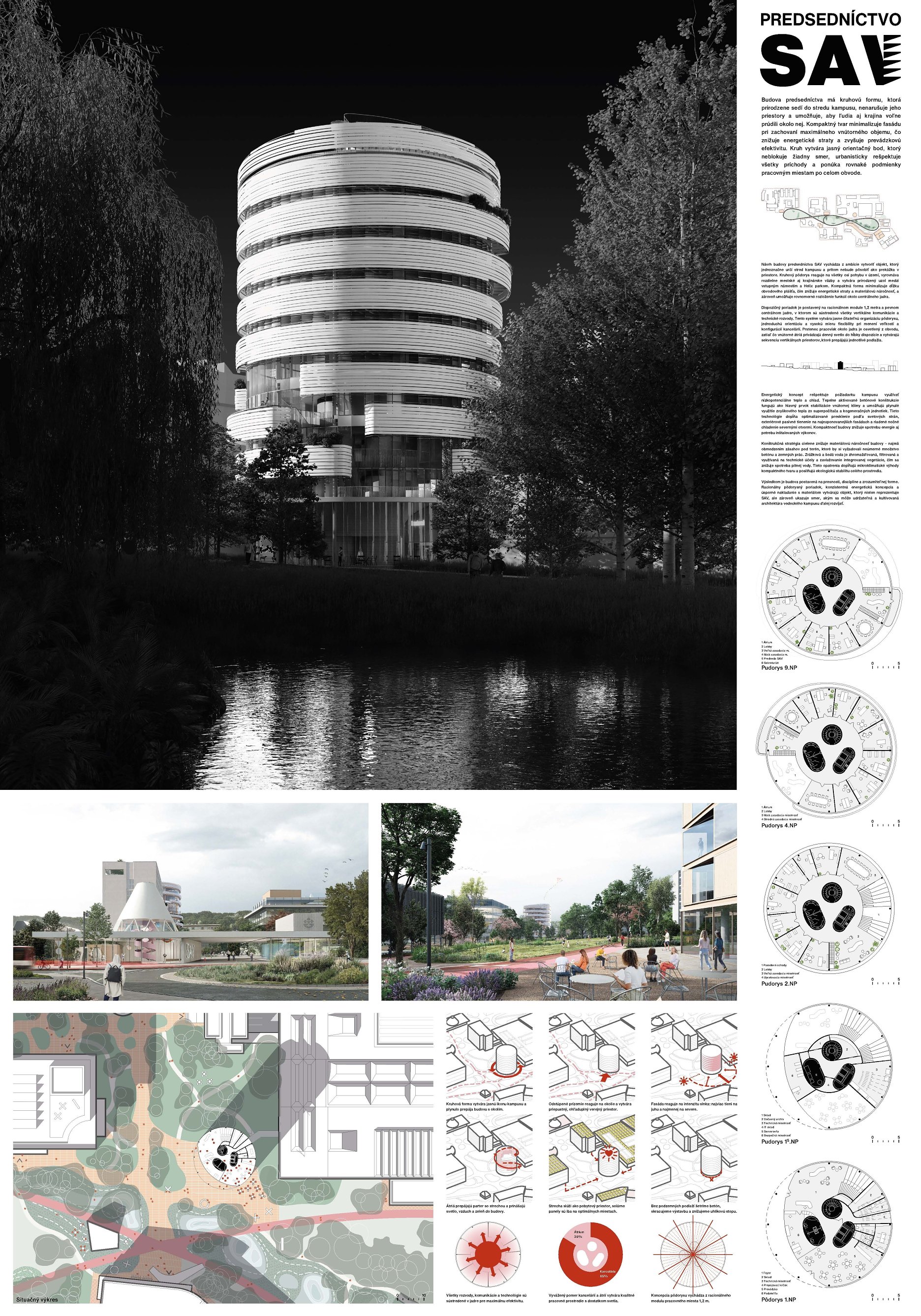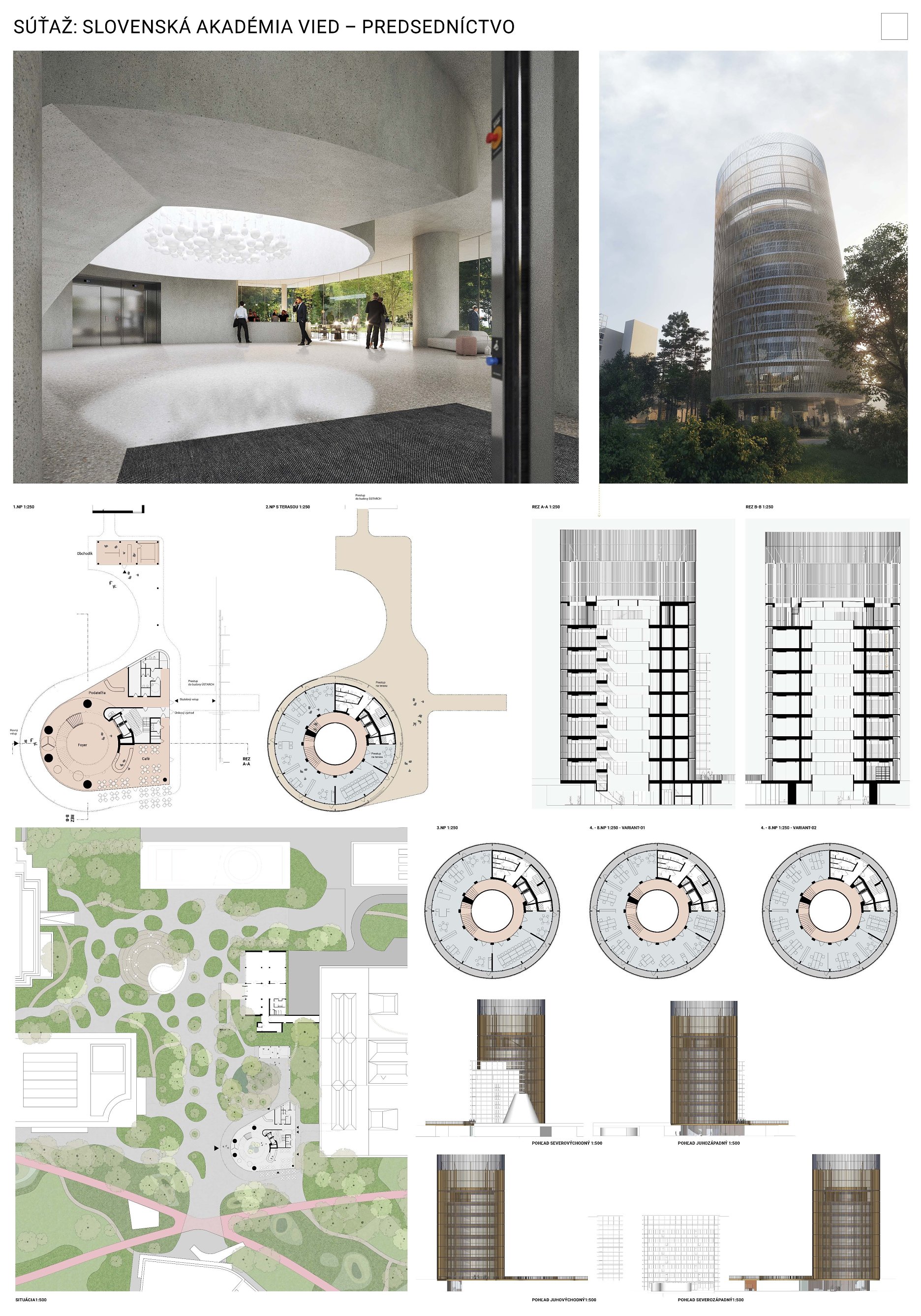 Návrh je hmotovo členený na tri jasne čitateľné objemy, ktoré tvoria kompozíciu hlavného traktu a dvojice bočných krídel. Hlavný trakt vystupuje ako deväťpodlažný objem za existujúcou vstupnou budovou SAV a v mierke aj urbanistickom osadení ju primerane dopĺňa. Za problematické však porota považuje riešenie hlavného preplávajúceho halového priestoru: jeho priestorové a kompozičné napojenie na hlavné urbanistické osi územia nie je presvedčivé a svojou výškou a proporciami pôsobí neprimerane monumentalizovaným, až chrámovým dojmom, ktorý prekračuje mierku a charakter požadovaného zadania. Architektonické, materiálové a farebné stvárnenie fasád ostatných častí objektu pôsobí dôstojne a kultivovane, v zásade v súlade s reprezentatívnymi požiadavkami predsedníctva SAV. Napriek tomu typické dispozičné členenie jednotlivých podlaží nepôsobí priestorovo vyzrete a „vyčistene“ - nadmerný počet zalomení a nároží a presvetlenej komunikácie generuje komplikovanú a málo prehľadnú vnútornú štruktúru.