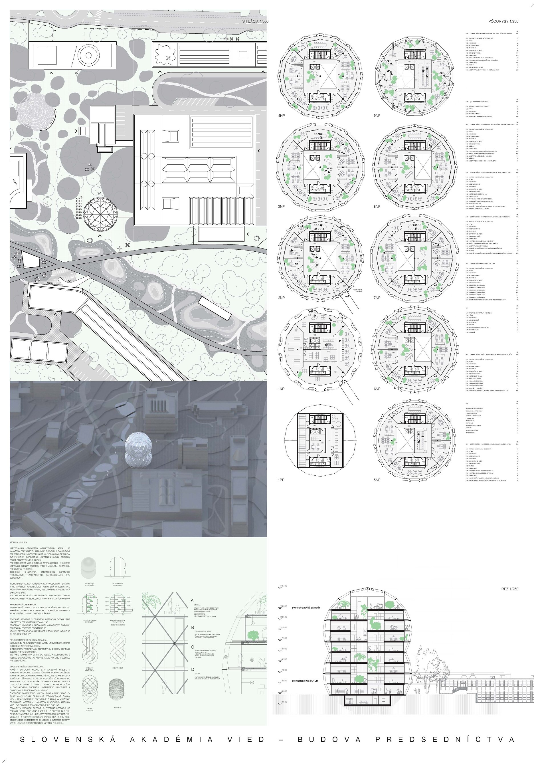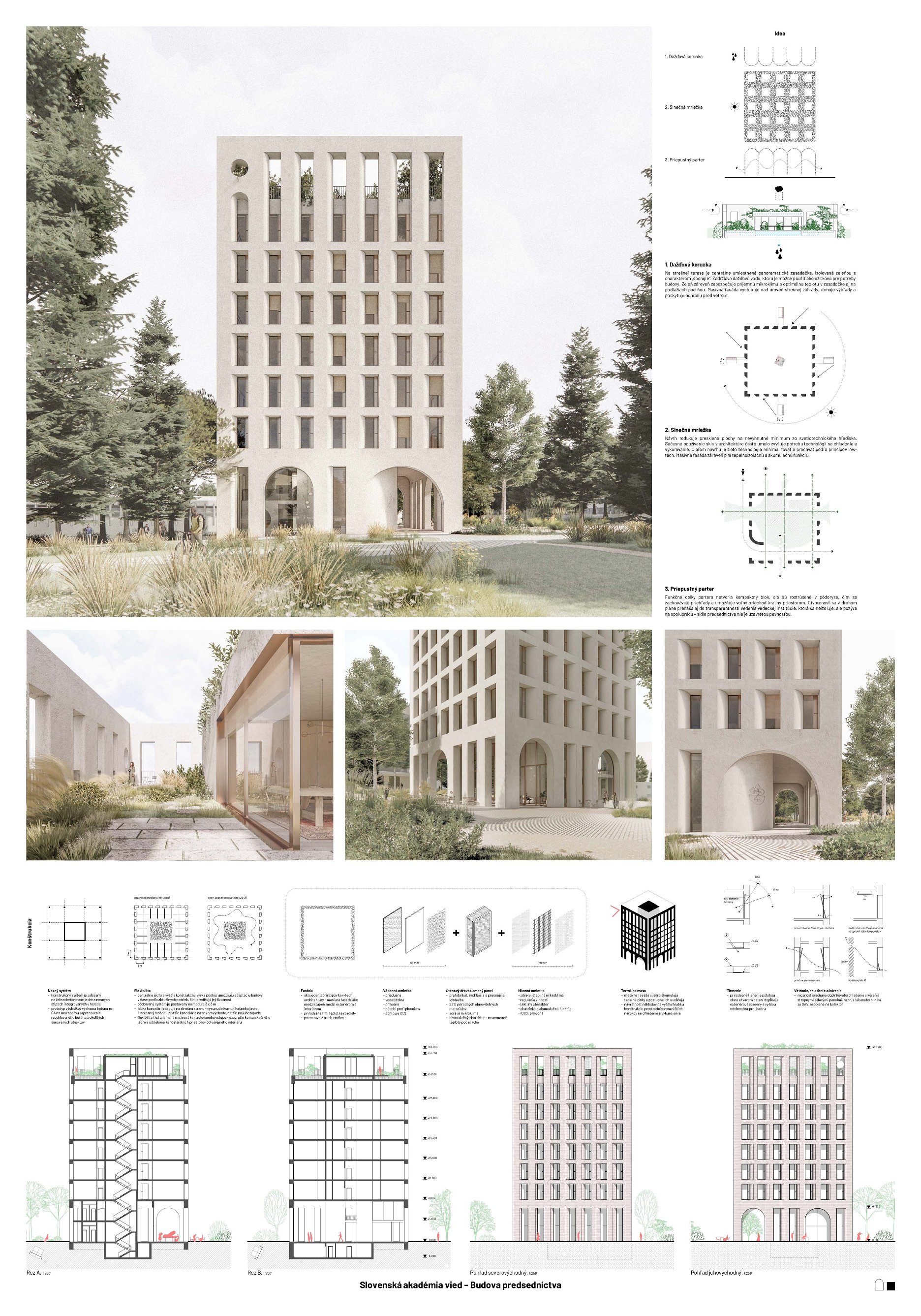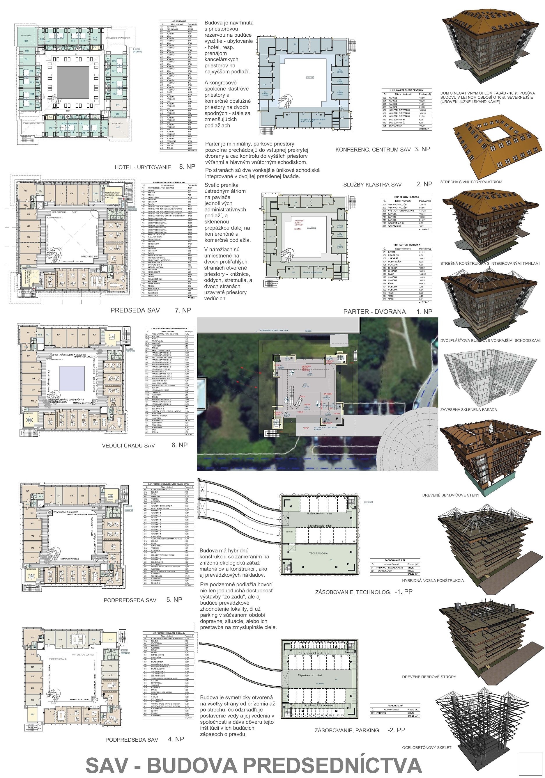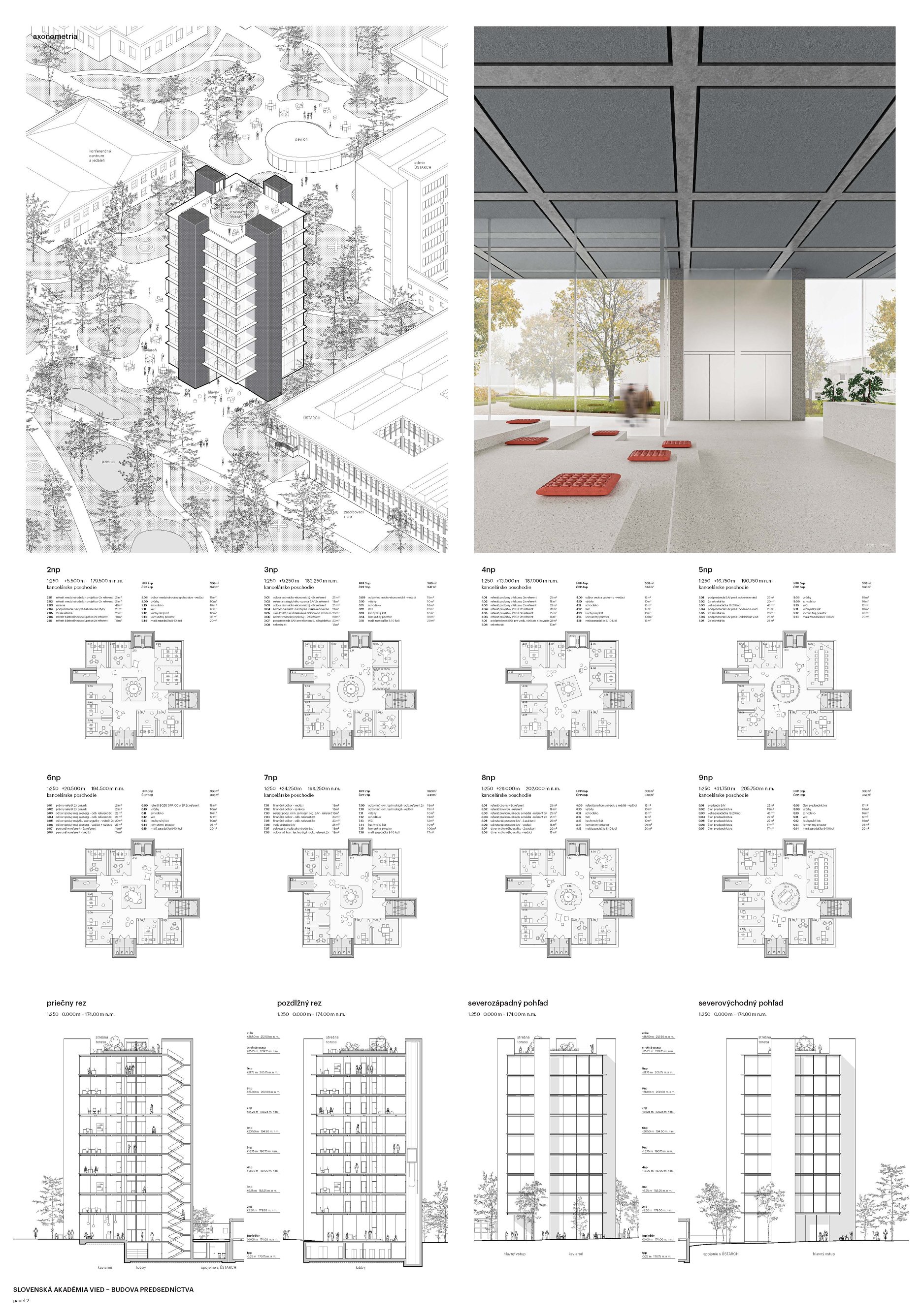 Návrh je hmotovo členený na tri jasne čitateľné objemy, ktoré tvoria kompozíciu hlavného traktu a dvojice bočných krídel. Hlavný trakt vystupuje ako deväťpodlažný objem za existujúcou vstupnou budovou SAV a v mierke aj urbanistickom osadení ju primerane dopĺňa. Za problematické však porota považuje riešenie hlavného preplávajúceho halového priestoru: jeho priestorové a kompozičné napojenie na hlavné urbanistické osi územia nie je presvedčivé a svojou výškou a proporciami pôsobí neprimerane monumentalizovaným, až chrámovým dojmom, ktorý prekračuje mierku a charakter požadovaného zadania. Architektonické, materiálové a farebné stvárnenie fasád ostatných častí objektu pôsobí dôstojne a kultivovane, v zásade v súlade s reprezentatívnymi požiadavkami predsedníctva SAV. Napriek tomu typické dispozičné členenie jednotlivých podlaží nepôsobí priestorovo vyzrete a „vyčistene“ - nadmerný počet zalomení a nároží a presvetlenej komunikácie generuje komplikovanú a málo prehľadnú vnútornú štruktúru.