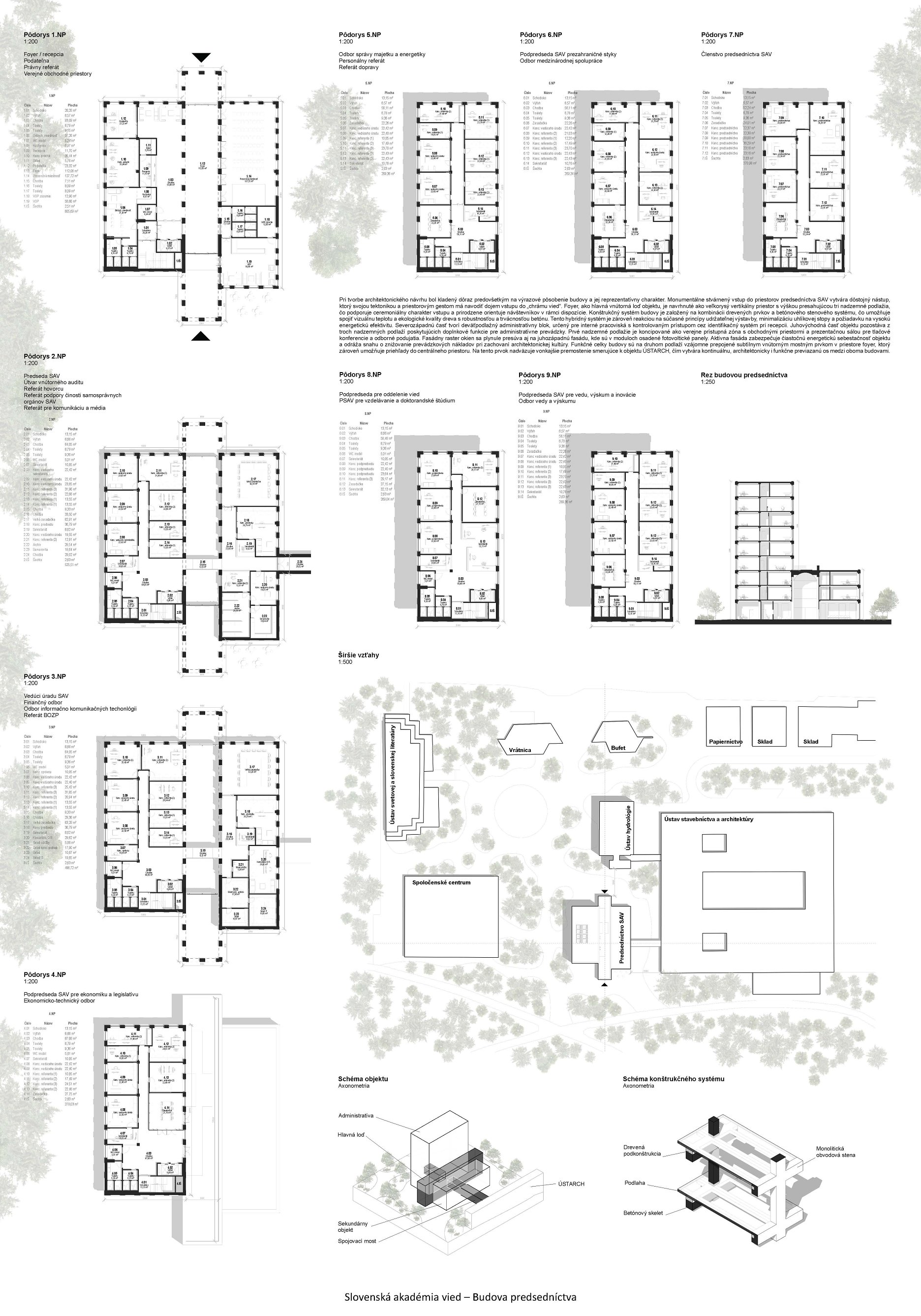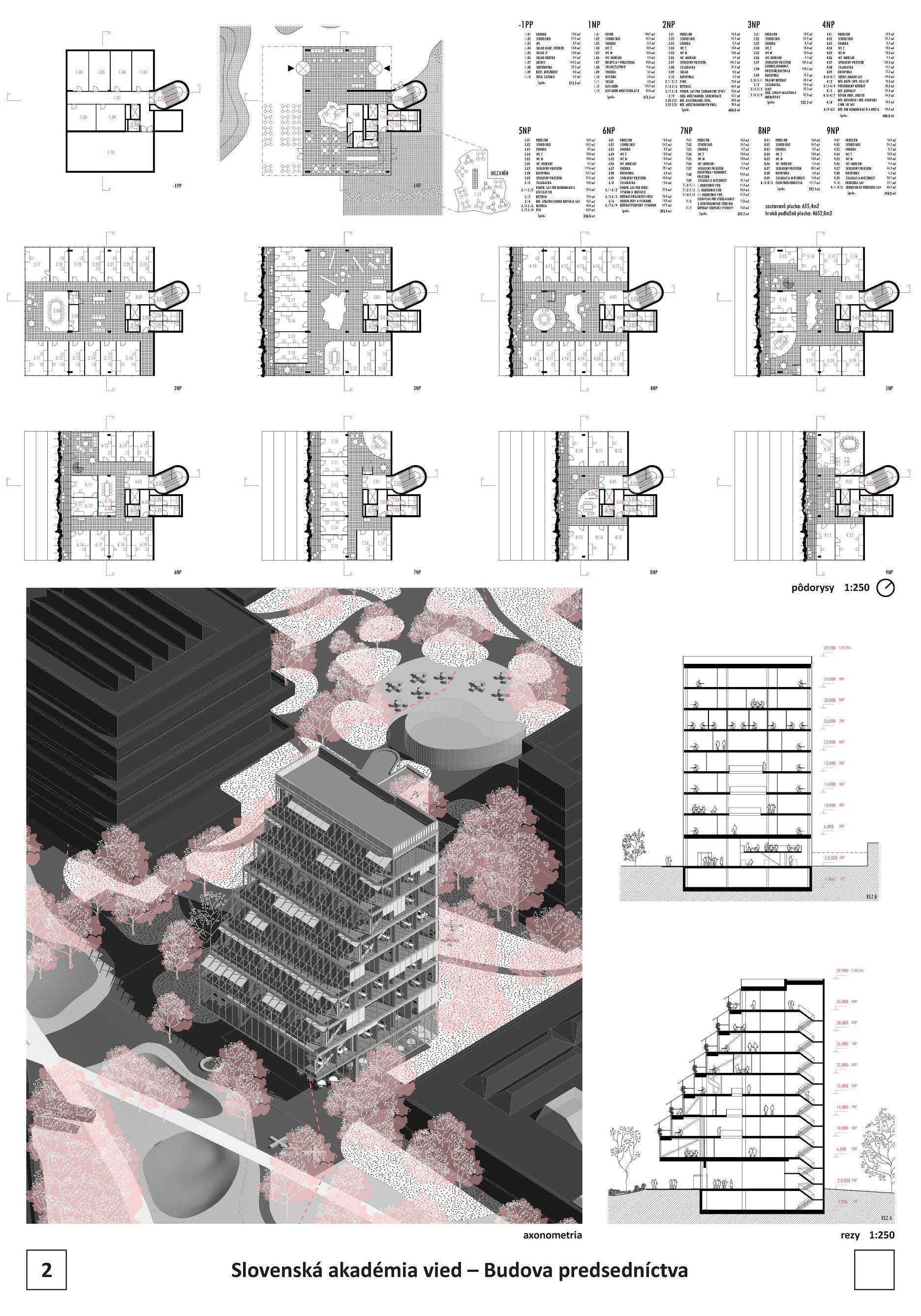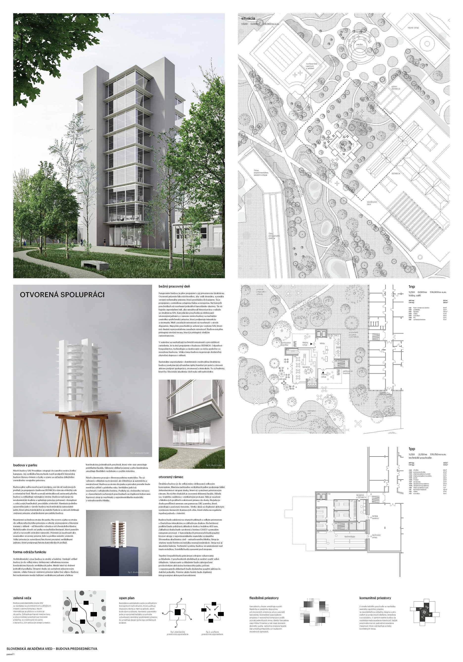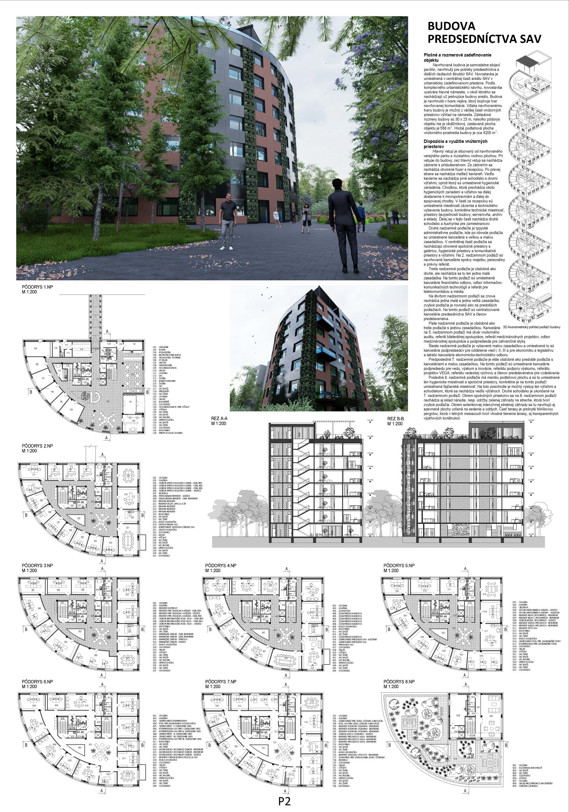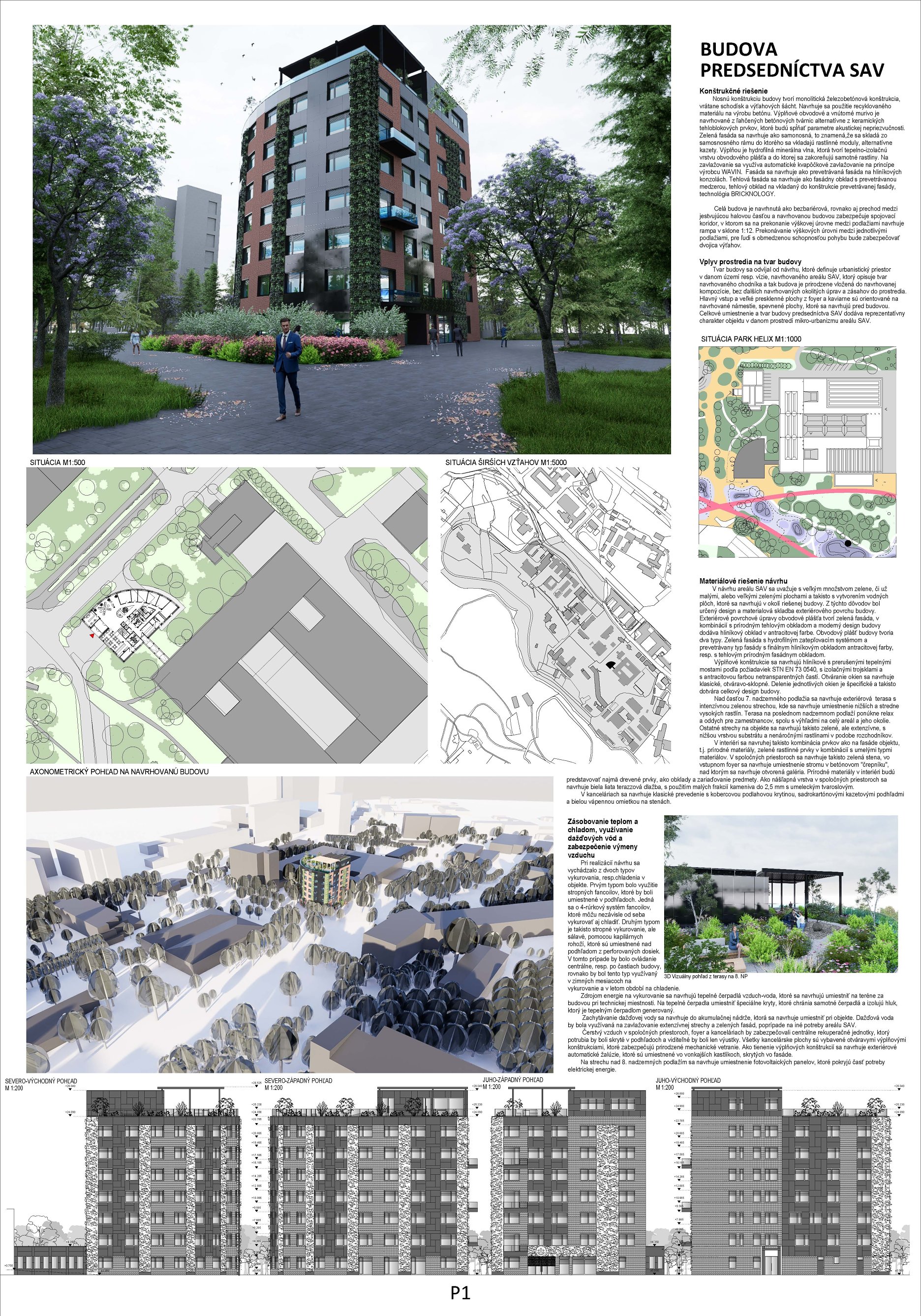 Návrh je hmotovo členený na tri jasne čitateľné objemy, ktoré tvoria kompozíciu hlavného traktu a dvojice bočných krídel. Hlavný trakt vystupuje ako deväťpodlažný objem za existujúcou vstupnou budovou SAV a v mierke aj urbanistickom osadení ju primerane dopĺňa. Za problematické však porota považuje riešenie hlavného preplávajúceho halového priestoru: jeho priestorové a kompozičné napojenie na hlavné urbanistické osi územia nie je presvedčivé a svojou výškou a proporciami pôsobí neprimerane monumentalizovaným, až chrámovým dojmom, ktorý prekračuje mierku a charakter požadovaného zadania. Architektonické, materiálové a farebné stvárnenie fasád ostatných častí objektu pôsobí dôstojne a kultivovane, v zásade v súlade s reprezentatívnymi požiadavkami predsedníctva SAV. Napriek tomu typické dispozičné členenie jednotlivých podlaží nepôsobí priestorovo vyzrete a „vyčistene“ - nadmerný počet zalomení a nároží a presvetlenej komunikácie generuje komplikovanú a málo prehľadnú vnútornú štruktúru.
