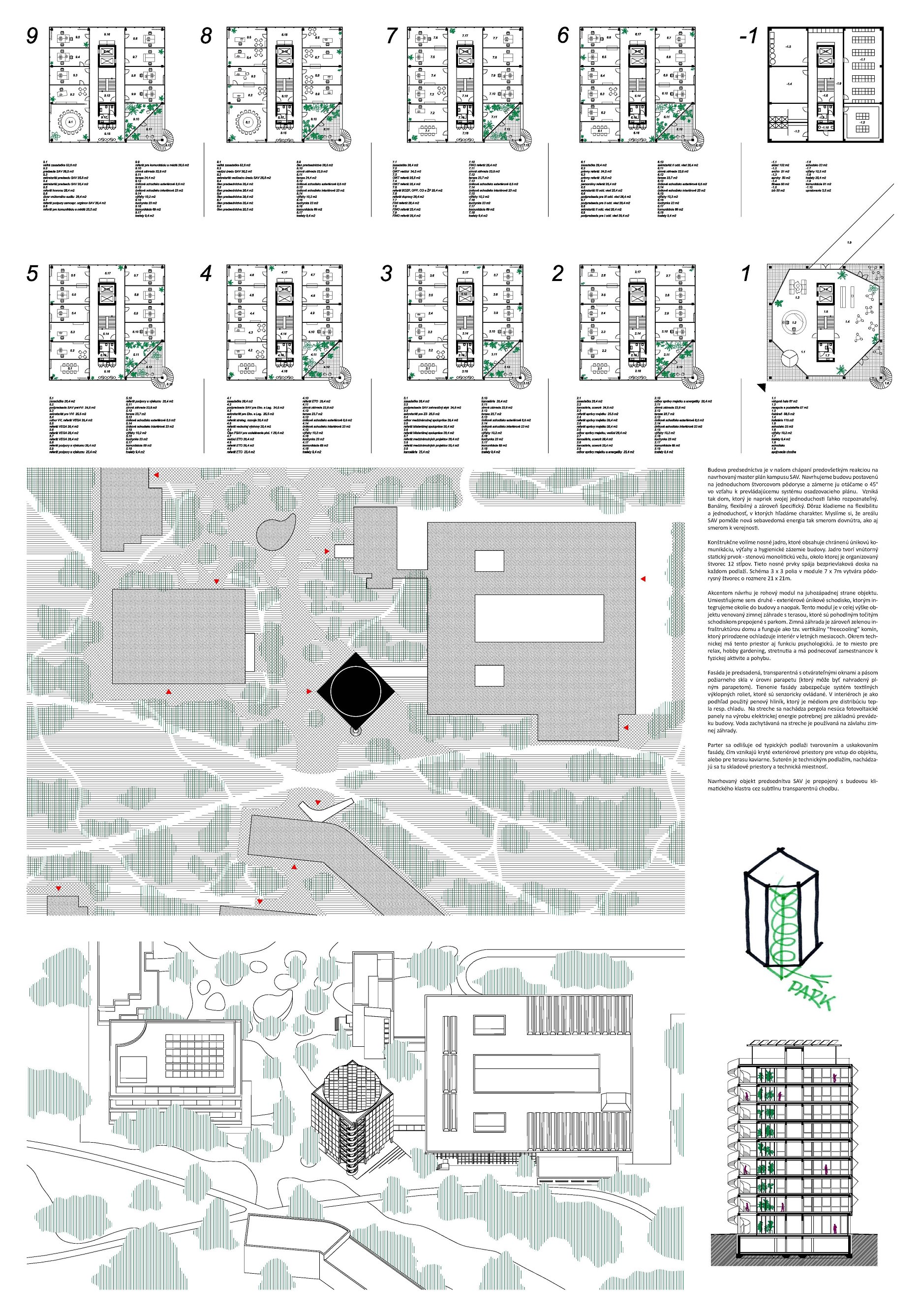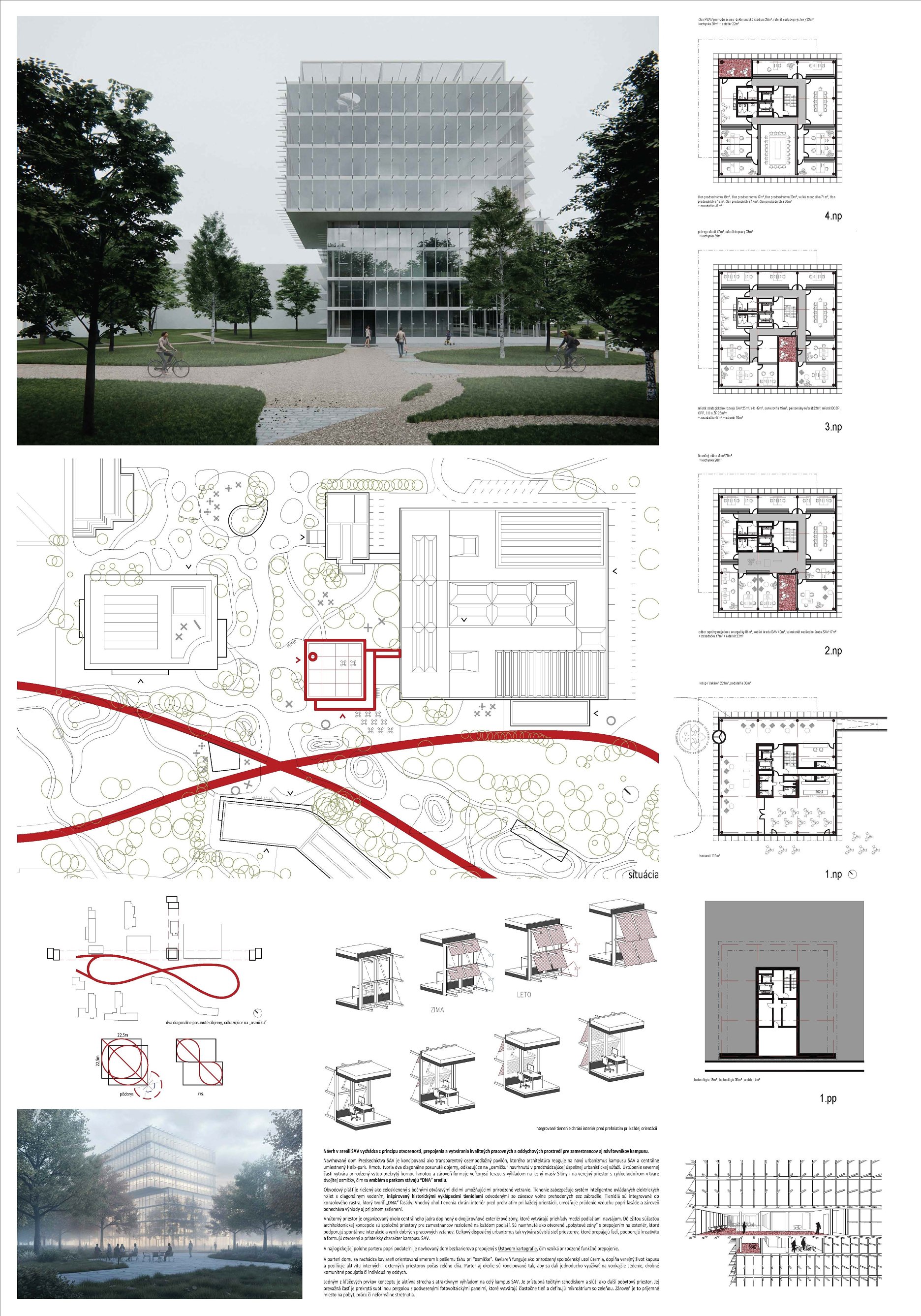 Štyri servisné betónové jadrá vytiahnuté na obvod pôdorysu definujú zároveň konštrukčný princíp domu, jeho vnútorné usporiadanie a celkový architektonický výraz. Uvážlivo dotiahnutý kahnovský princíp obslužných a obsluhovaných priestorov vytvára vhodné predpoklady pre dispozičné a prevádzkové riešenie ako v čiastočne verejnom prízemí, tak aj v typických administratívnych podlažiach. Stavebne uvoľneným prízemím sa parter prirodzene prepája so svojim okolím a park sa stáva súčasťou domu. Dom sebavedomo, avšak s istým rešpektom, dopĺňa existujúcu urbanistickú kompozíciu objektov na centrálnej prístupovej osi. Vertikálna hmota čitateľne rytmizovaná solidnými jadrami tvorí dobre zapamätateľný orientačný prvok v mierke celého vedeckého parku. Administratívne podlažia vďaka uvoľnenému stredu umožňujú variabilitu usporiadania pracovných priestorov, zdieľaný stred zároveň stimuluje tímovú spoluprácu a vytvára predpoklady pre rozvoj vnútornej siete spoločenských väzieb. Minimálna zastavaná plocha a kompaktný objem činia návrh jedným z kapacitne najúspornejších. V porovnaní s ostatnými návrhmi napĺňa tento návrh v najvyššej miere základné predpoklady zadávateľa na otvorenosť, adaptabilitu a flexibilitu, umožňujúcu budúcu transformáciu spôsobom skutočne racionálnym a logicky premysleným. Nutné úpravy riešenia protipožiarnej bezpečnosti návrhu sú riešiteľné bez oslabenia zvoleného konceptu.