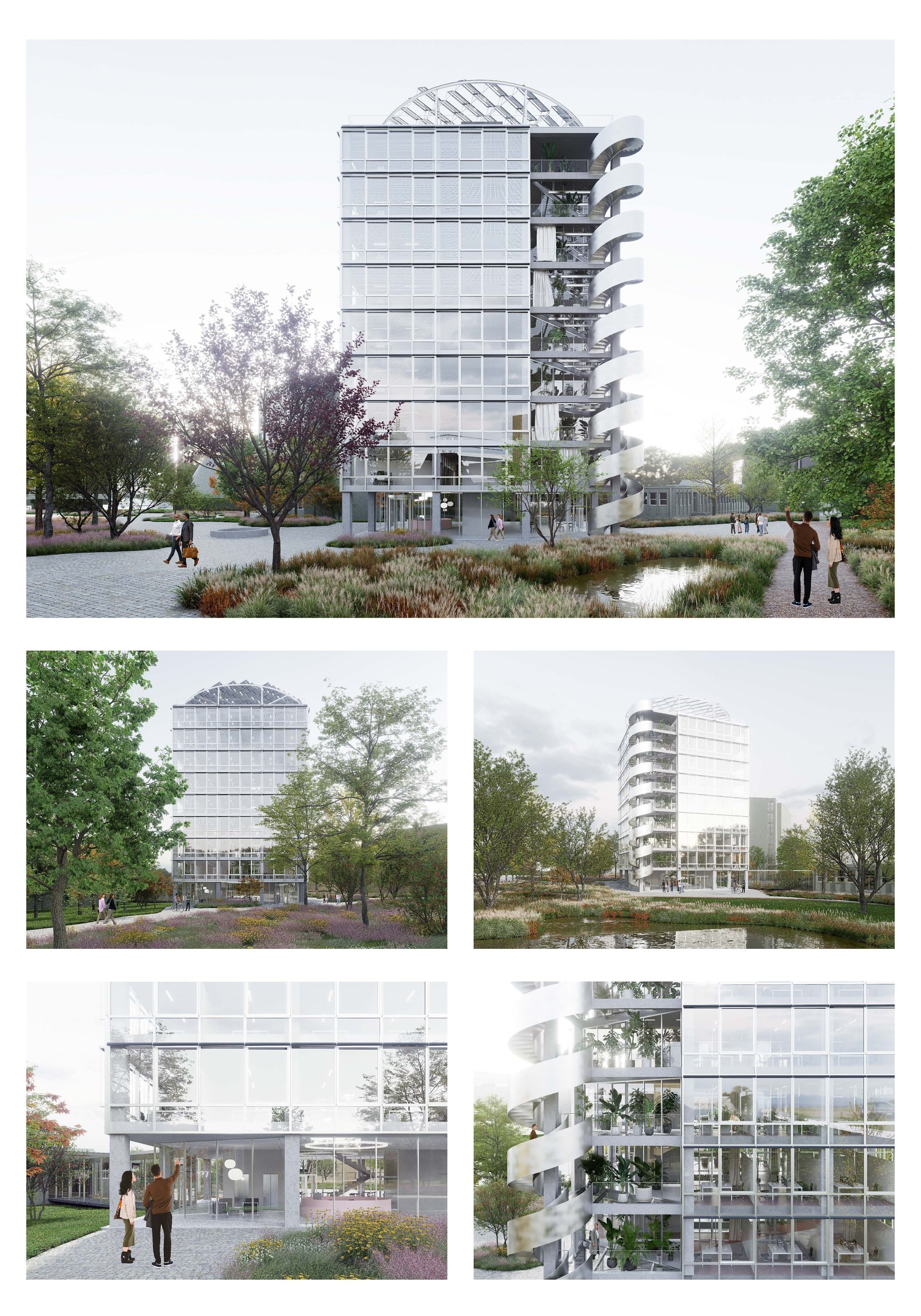 Z urbanistického hľadiska je návrh prijateľný a v primeranej miere rešpektuje spracovanú urbanistickú štúdiu. Pôdorysné pootočenie hmoty smerom do vstupného námestia porota hodnotí pozitívne. Fasádne riešenie pôsobí atraktívne, avšak postráda výraznejšie zasadenie do kontextu areálu a nadčasovejšie tvarové riešenie. Návrh sa vyznačuje efektívnou dispozičnou schémou. Kladne bola hodnotená strešná pobytová záhrada na najvyššom podlaží a kvalitne navrhnuté vstupné reprezentatívne priestory. Porota však postráda pobytové a komunitné priestory na typických podlažiach. Celková prezentácia návrhu je konzistentná a vizuálne presvedčivá. Za prínosné by porota považovala jasnejšiu komunikáciu flexibility riešenia a otvorenosti voči prípadnému dopracovaniu návrhu po ukončení súťaže.