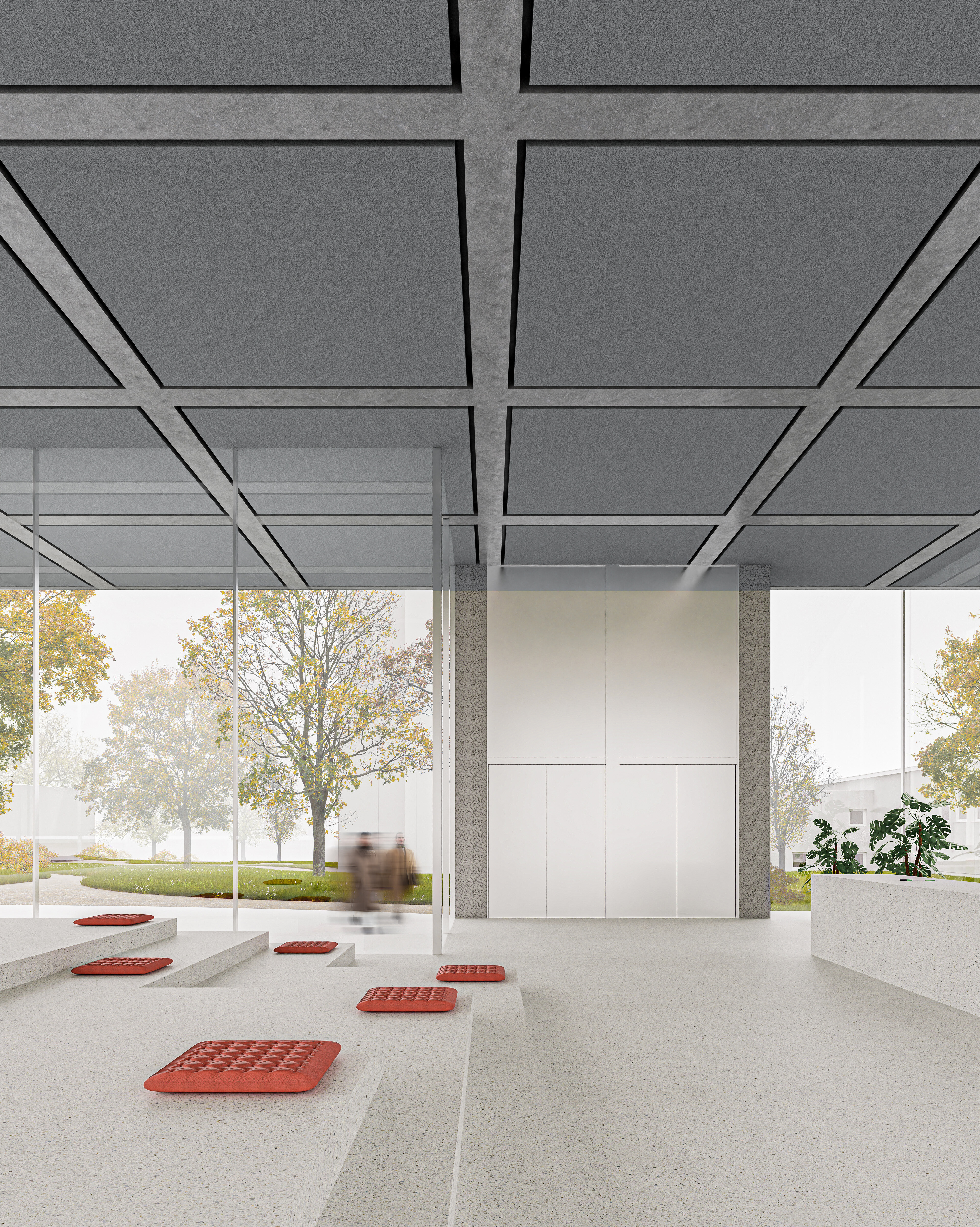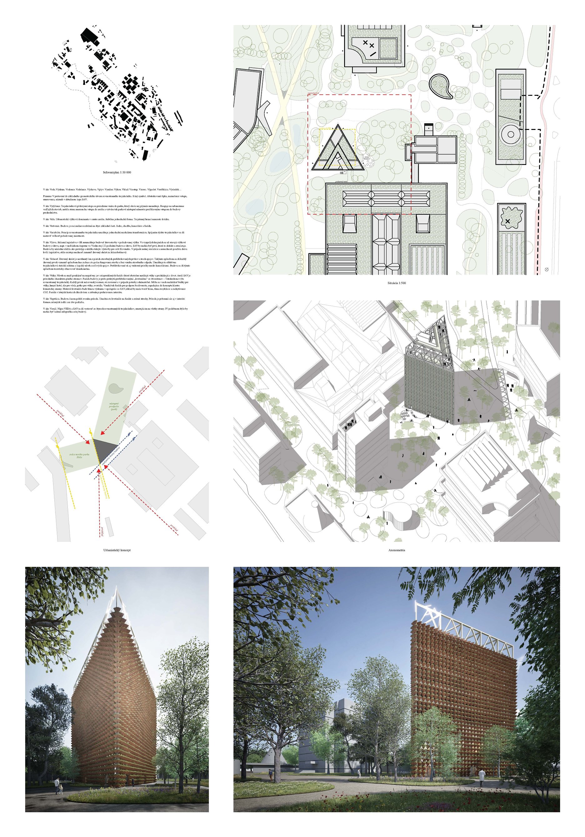 Návrh spomedzi všetkých predložených riešení najexpanzívnejším spôsobom dopĺňa existujúcu urbanistickú štúdiu. Deje sa tak predovšetkým vytvorením vnútorného átria a vložením sprievodných funkcií, ako sú hotel a rozsiahle podzemné parkovanie, ktoré sú z hľadiska zadania pre daný účel nečakané a prevádzkovo aj investične nežiadúce. Celkový architektonický výraz je umocnený kónickým roztváraním hmoty s výraznou strešnou rímsou, čo formuje silnú, až príliš dominantnú siluetu v rámci areálu. Tento hmotový a tvarový akcent podľa názoru poroty neadekvátne zasahuje do mierky a priestorovej štruktúry areálu a priľahlého verejného priestoru a vzhľadom na potreby a očakávania vyhlasovateľa predstavuje neprimerane naddimenzovaný objem s priamym dopadom na výrazne zvýšené investičné náklady.