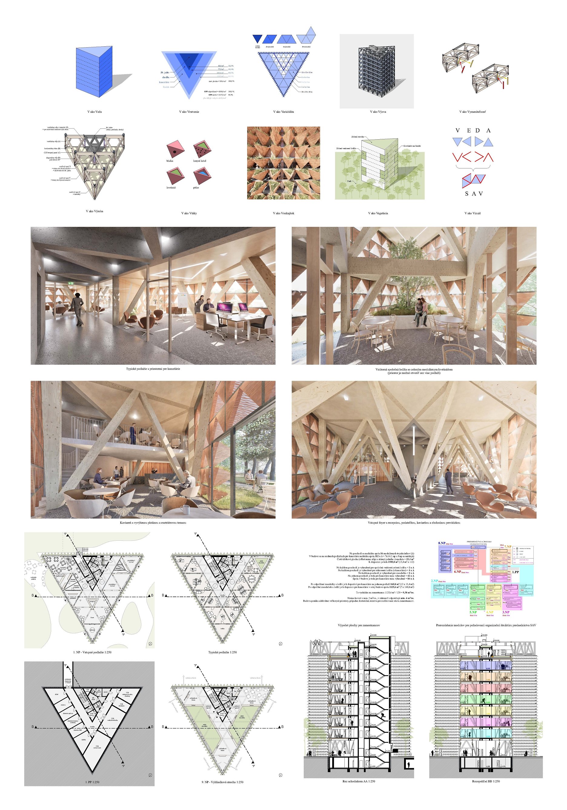 Návrh zaujímavým trojuholníkovým pôdorysným tvarom adekvátne reaguje na okolitú urbanistickú koncepciu aj na ťažiskové osi areálu. Jeho jednoznačné architektonické stvárnenie priťahuje pozornosť a pôsobí ako ťažisková budova, čo porota oceňuje. Symbol písmena „V“, pretavený do základného geometrického útvaru rovnostranného trojuholníka, je konzistentne premietaný do konštrukčného princípu, fasády, dispozície, detailov a ďalších prvkov . Táto formálna dôslednosť však často vedie k technicky komplikovaným, nákladným a prevádzkovo ťažko udržateľným riešeniam. Príťažlivá fasáda objektu zároveň nedostatočne komunikuje funkciu predsedníctva a administratívnych častí ako otvorenej, transparentnej inštitúcie; naopak, pôsobí skôr uzatvoreným dojmom, akoby interiér budovy zostával „schovaný“ za výraznou obálkou. Z hľadiska konštrukčného riešenia porota považuje návrh za problematický najmä v súvislosti s deklarovaným použitím drevených konštrukčných prvkov vo väzbe na platné požiadavky požiarnej bezpečnosti, ktoré môžu významne obmedziť alebo až znemožniť realizovateľnosť návrhu v navrhovanej podobe.