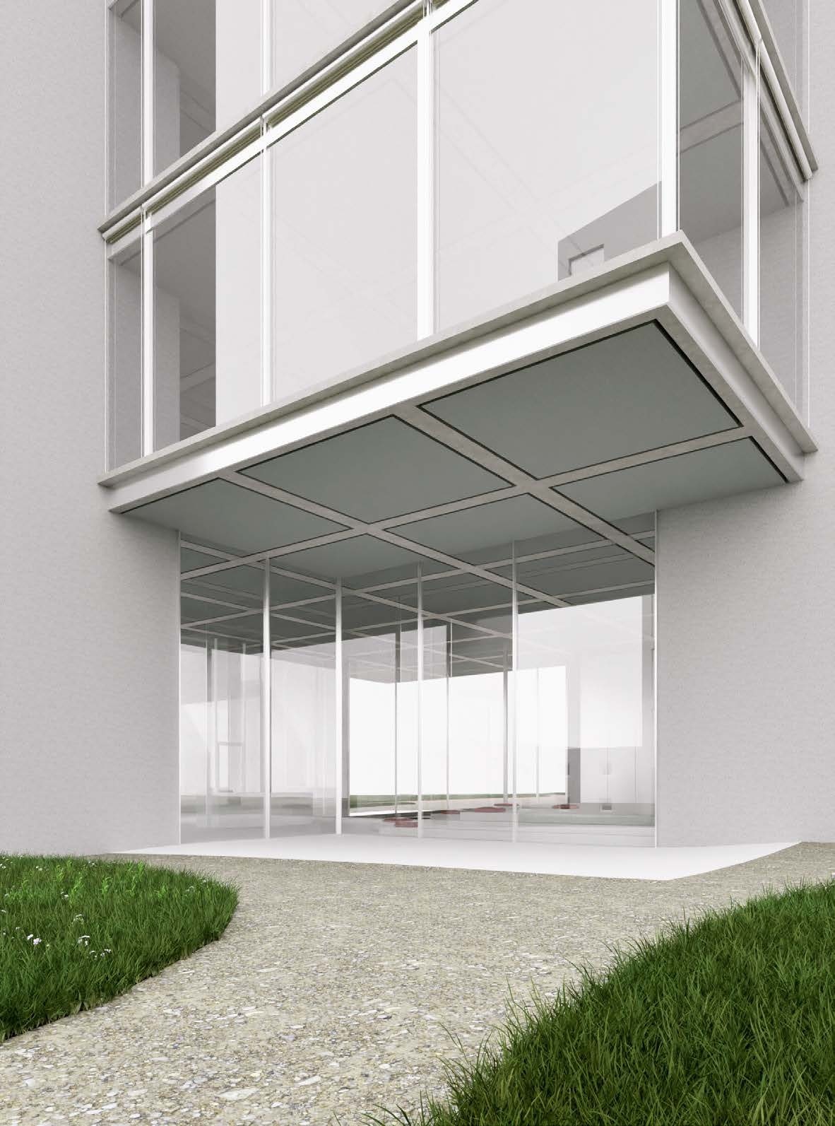 Navrhovaná kaskádová figúra budovy vytvára kompozične unikátne a rôznorodé kancelárske aj spoločné priestory, ktoré umožňujú dispozíciu členiť a variovať podľa aktuálnych požiadaviek investora. Svojim situovaním a prevádzkou je budova zasadená do prostredia v súlade s urbanistickou víziou areálu. Avšak z kompozičného a architektonického hľadiska hlavná terasová fasáda sa otáča smerom do zeleného úbočia a naopak pri pohľade do urbanistického a prevádzkového centra, ktoré sa považuje za dôležitý reprezentačný a nástupný priestor, ponecháva iba plnú stenu s keramickou mozaikou s vysunutým komunikačným jadrom. Budova nespĺňa očakávaný reprezentačný charakter predovšetkým od hlavného vstupu do areálu.