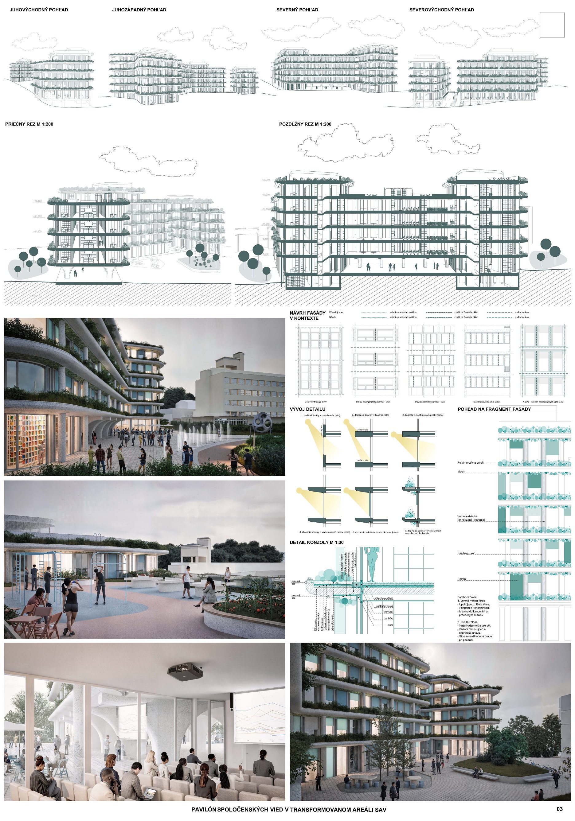 Predložený návrh pavilónu spoločenských vied vhodne urbanisticky uzatvára predmetné územie a kompozíciou dvoch rôzne vysokých hmôt dobre kompozične reaguje na susediaci objekt Chemického ústavu, ako aj svahovitý terén areálu. Architektúra stavby je jednoduchá, racionálna a jej nosným prevádzkovým a vizuálnym prvkom sa stáva centrálne átrium hlavnej budovy. Priestory jednotlivých kancelárii sú proporčne správne navrhnuté a do budúcna umožňujú ich flexibilnú adaptáciu. Porota taktiež kladne hodnotila pavilónový charakter objektu, avšak exteriérové stvárnenie predmetnej stavby dostatočne neevokuje jej funkčnú náplň. Za negatívum návrhu z hľadiska prevádzky boli zase považované úzke a tmavé chodby typických podlaží, neoptimálne riešený vstupný priestor s komplikovaným pohybom po budove a absenciou výťahov prístupných priamo zo vstupného lobby.