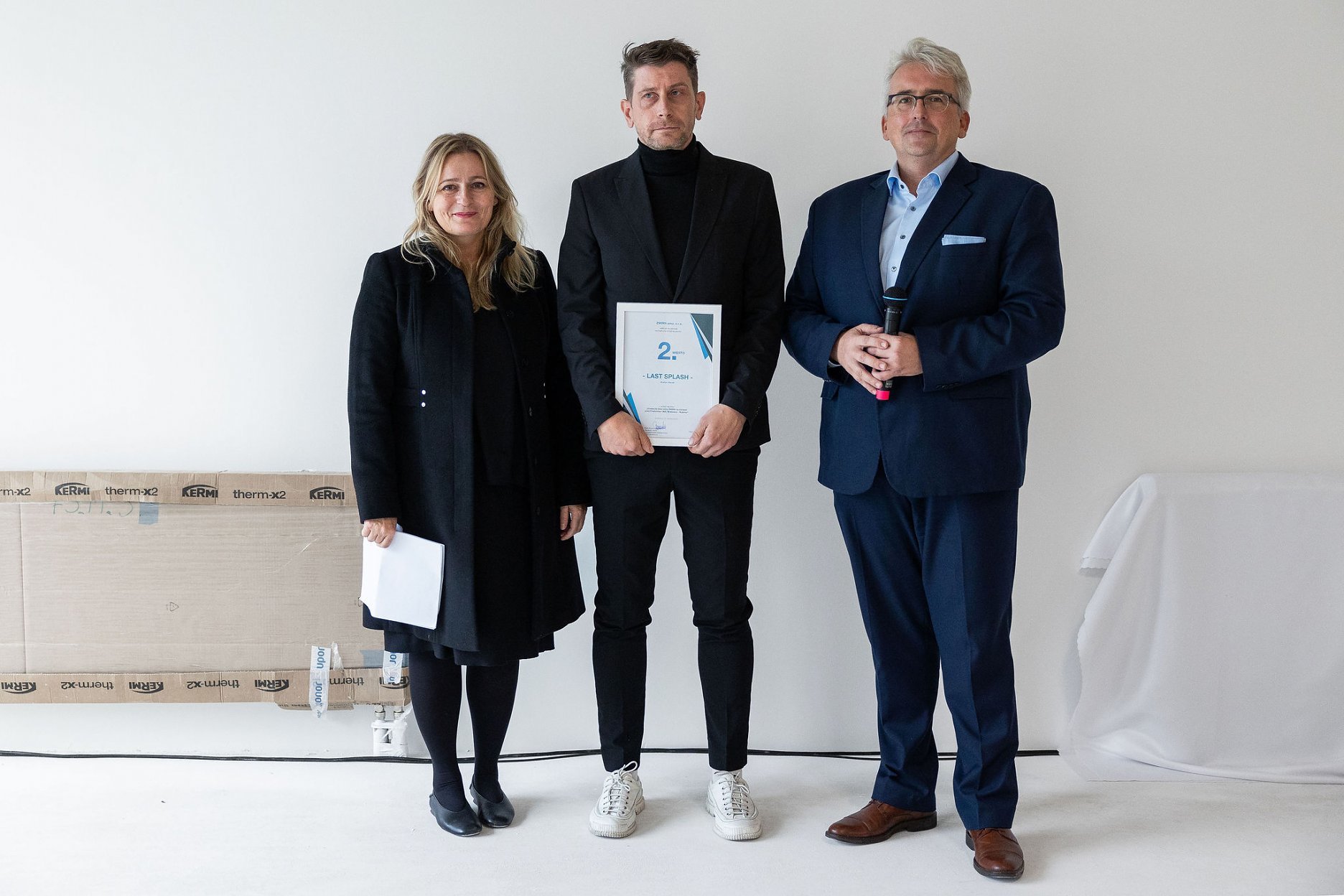 Návrh diela "Last Splash“ pracuje s výstupom z garáží a návrhom impozantnej veľkej kvapky, ktoré obkolesuje kruhový výstup. Autor navrhol v kvapke na streche výstupu sedenie a možnosť pozorovať okolie z výšky. Porota ocenila tematické zameranie diela smerom k pôvodnému riečisku Dunaja, k nivám, ktoré tu historicky existovali. Ekologický kontext tiež porota ocenila. Návrh pôsobí veľkolepo, s dizajnérskou estetikou a efektom kvapky.