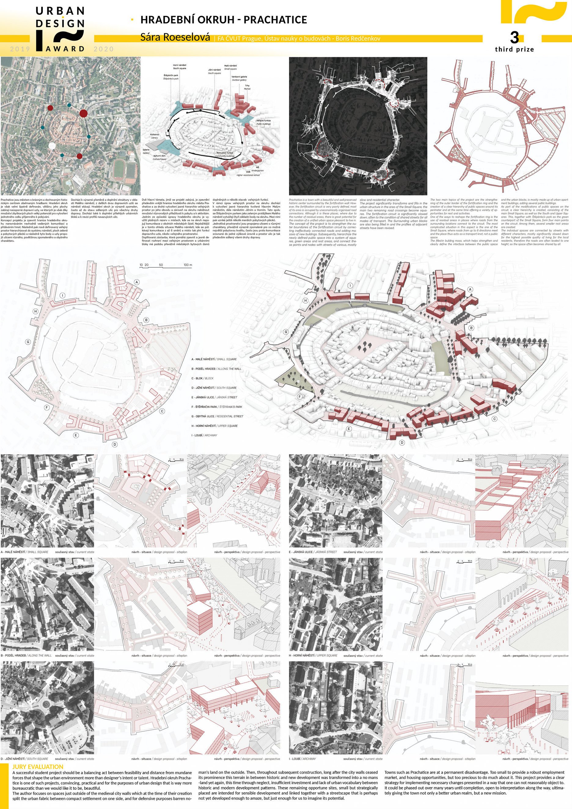 Práce je zpracována od širších vztahů přes komplexní urbanistický návrh až k podrobnému řešení bloků budov. Urbanistická struktura je logicky uspořádaná, zajímavě komponovaná, odpovídající poloze ve městě, místy možná zbytečně nekompaktní. Porota pozitivně hodnotila práci s výškovým uspořádáním zástavby. I přes některé výtky k uspořádání parteru porota ocenila pečlivý a promyšlený návrh veřejných prostranství a excelentní vizualizace, které naprosto jasně dokládají atmosféru navrhovaných prostorů. Práce vznikla ve třetím ročníku a je výsledkem tříhodinového urbanistického ateliéru, ve kterém měli studenti první možnost zpracovat urbanistický návrh. Přesto je jak kvalita návrhu, tak i jeho zpracování a prezentace na naprosto profesionální úrovni, která nepochybně zaslouží udělené ocenění. Porota se těší na další návrhy a zanedlouho jistě i realizace obou autorů.