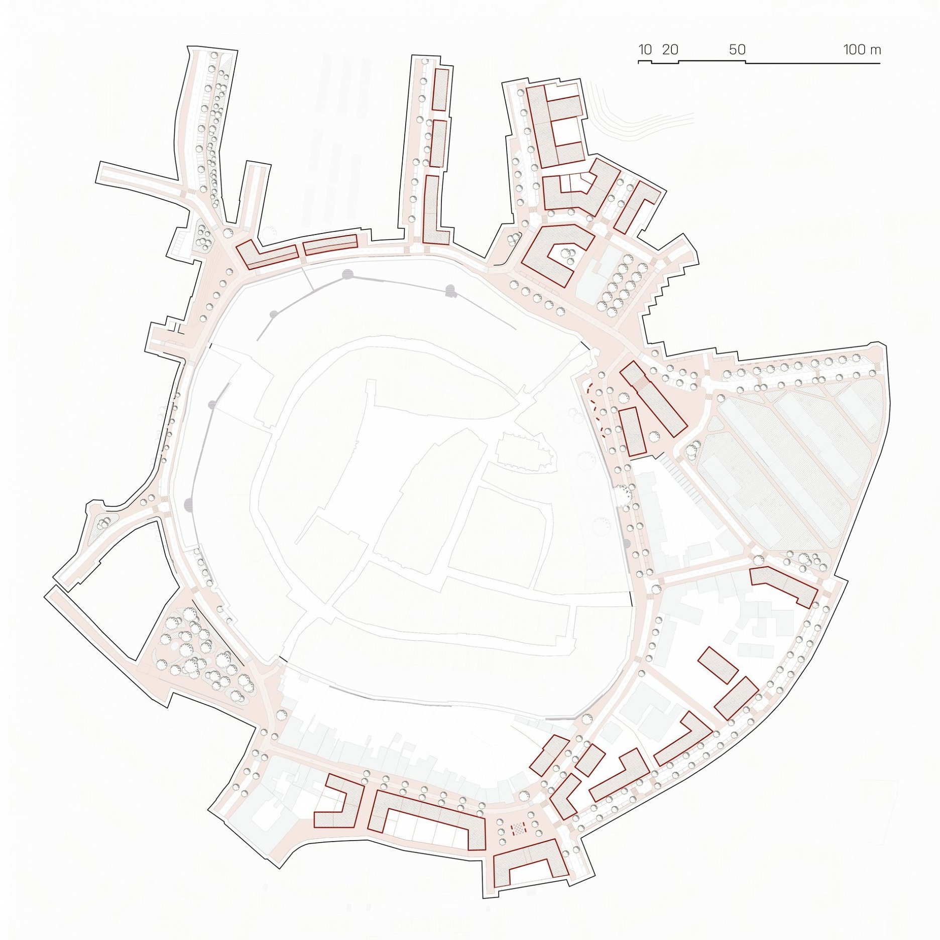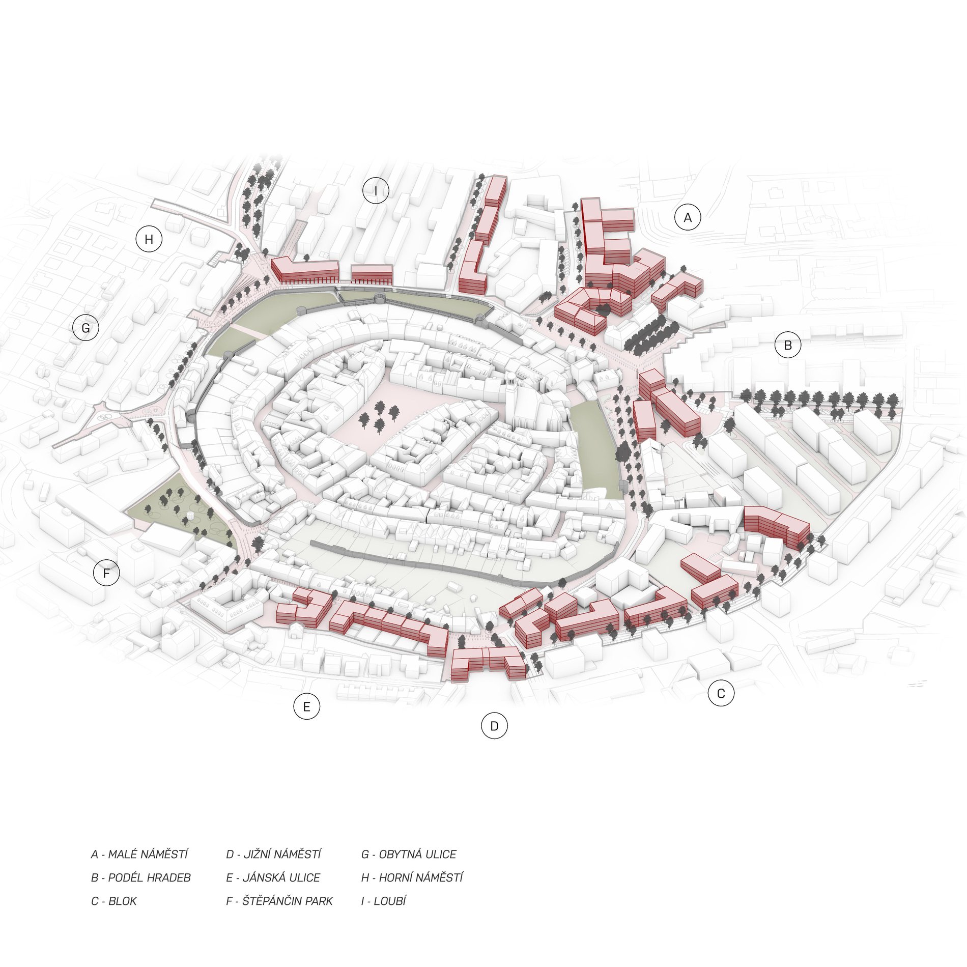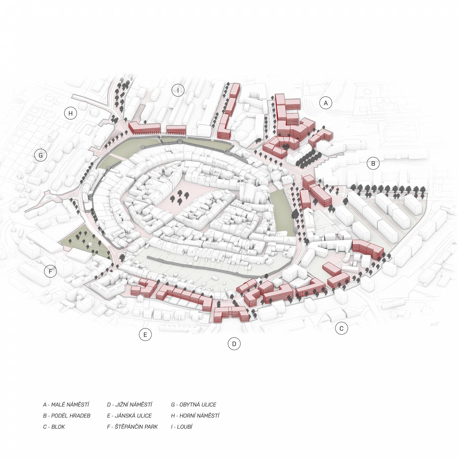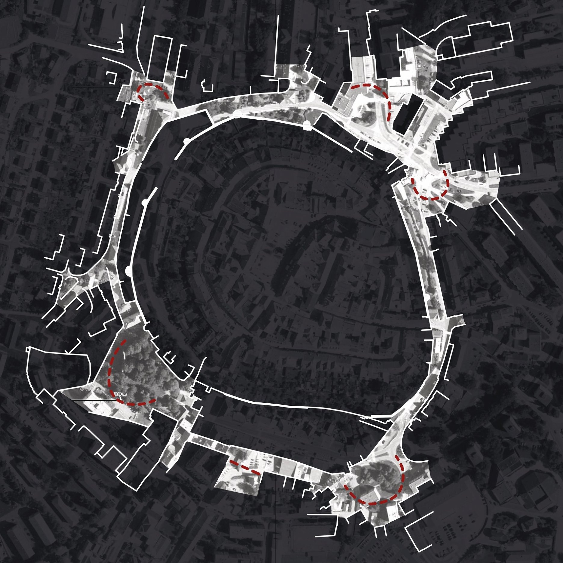 Návrh si klade dva cíle. Prvním z nich je dodefinovat velmi nejasnou vnější hranici okruhu a vytvořit na něm hierarchicky jasný soubor veřejných prostranství propojených ulicemi různých charakterů. Hlavním bodem na okruhu zůstává Malé náměstí, kterému je výraznými zásahy navrácena jeho funkce. Zelený protipól mu tvoří Štěpánčin park věnovaný kulturním stavbám. Tyto hlavní body jsou doplněny o další dvě náměstí a několik pobytových plácků. V neposlední řadě dochází k výraznému zpomalení, zobytnění a ozelenění ulic tvořících hradební okruh. I díky mnoha příležitostem k zastavění se tak z něho stává souvislá a pobytově příjemná vrstva města."
