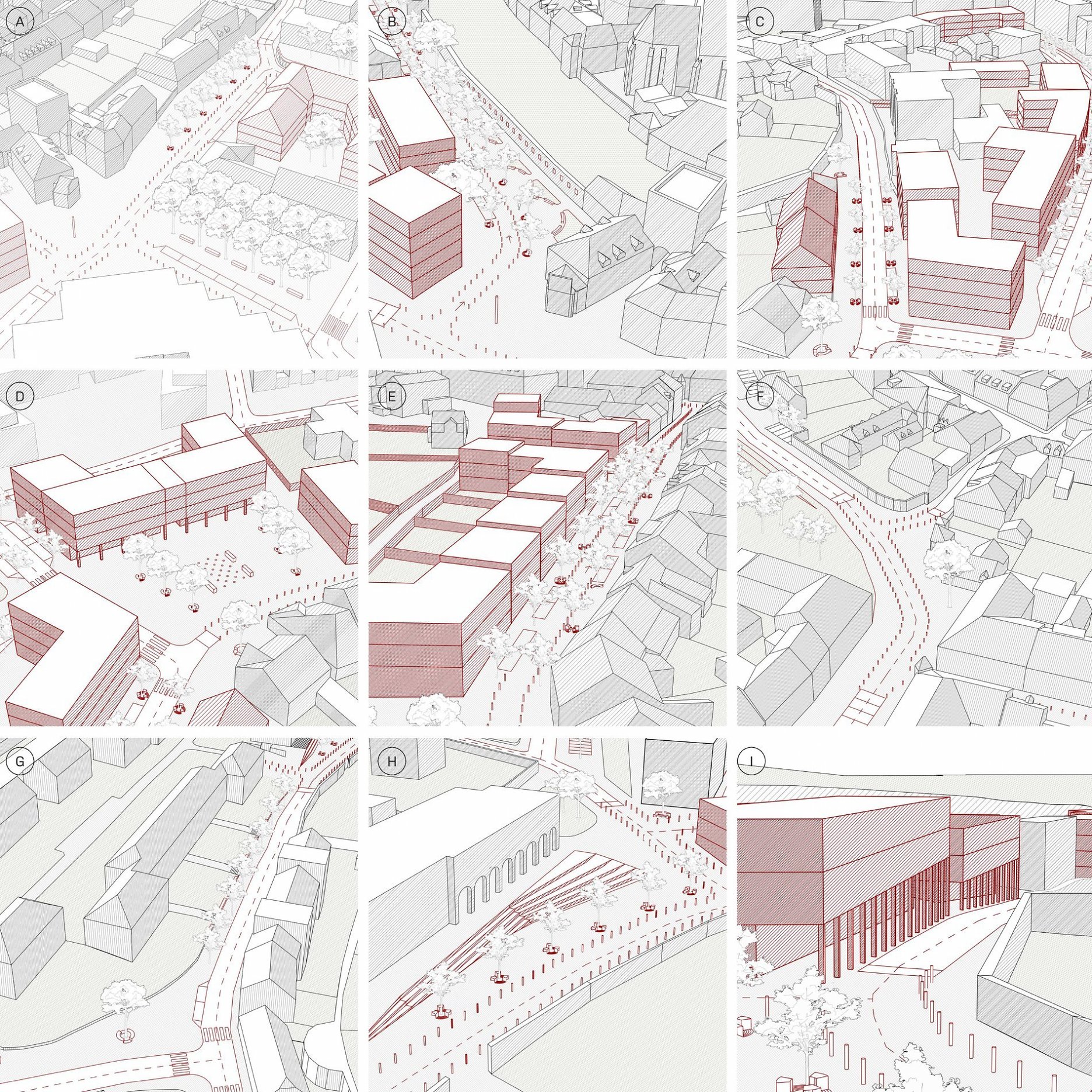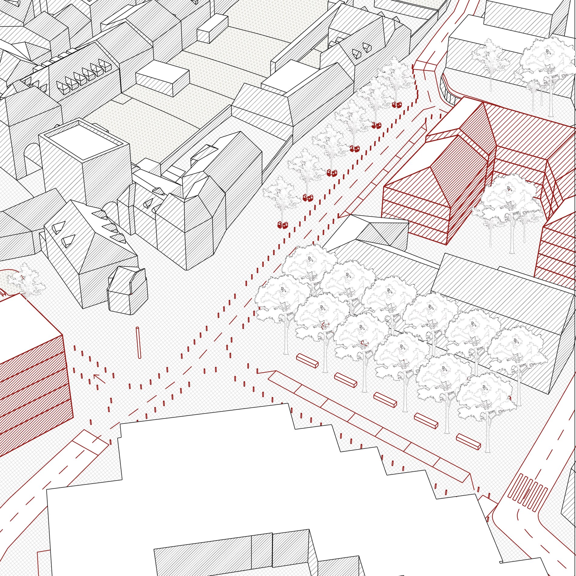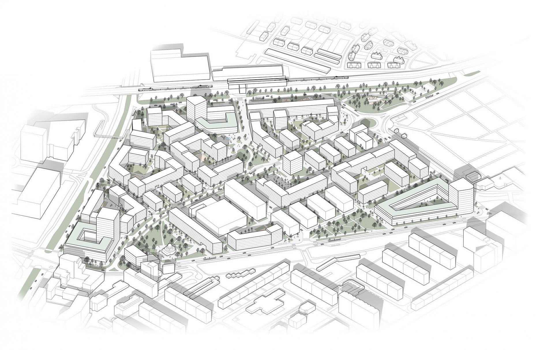 Hlavní prostorovou páteří projektu je nová síť veřejného prostoru sever-jih s velmi jemnými proporcemi veřejného prostoru a menšími a většími zelenými veřejnými náměstími. Tato síť je definována jedinečnou funkční kombinací bydlení, kancelářských prostor a veřejných funkcí.