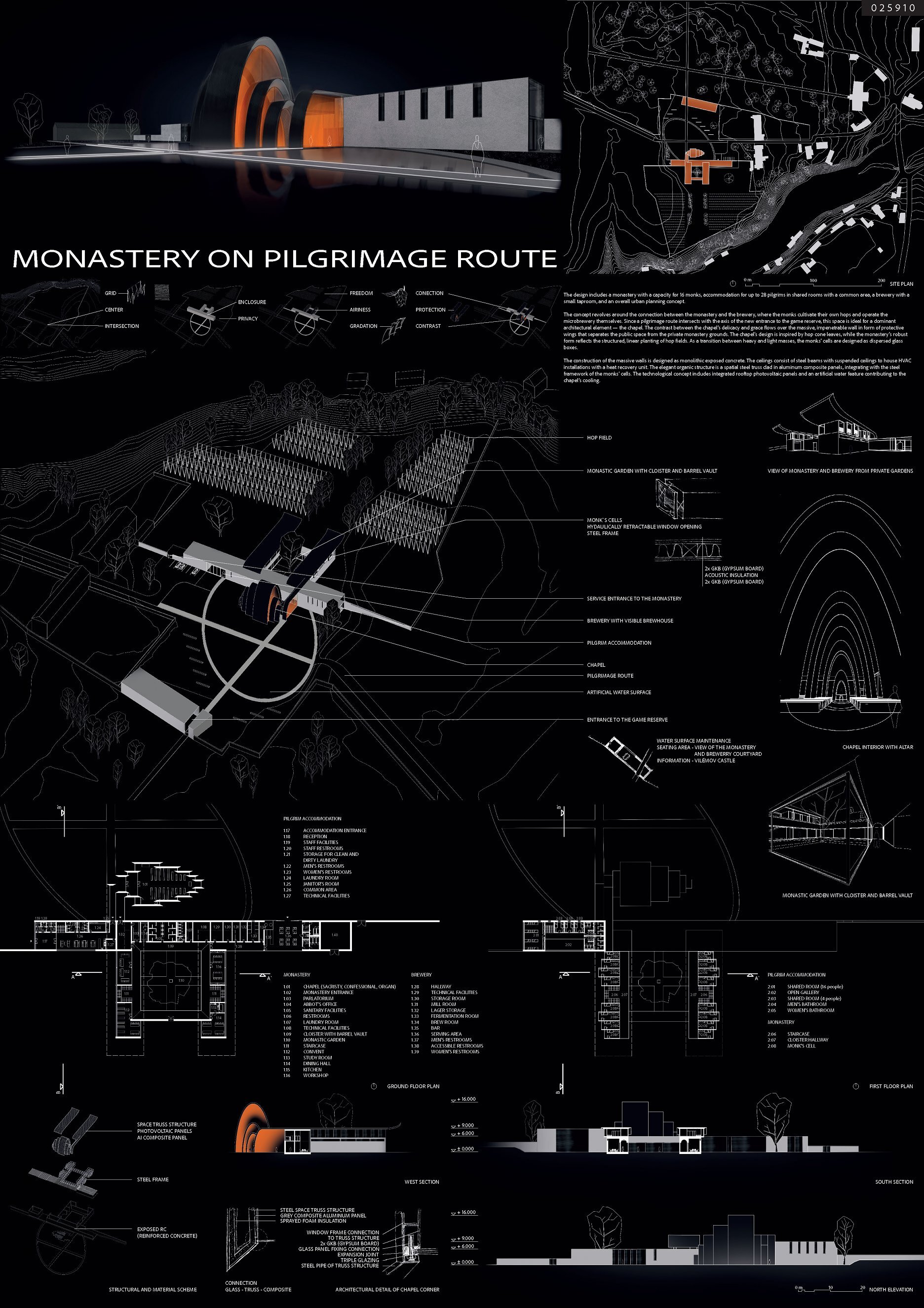 Návrh kláštora situovaného na pútnickej trase Via Czechia predstavuje mimoriadne premyslené a vyzreté riešenie, ktoré v sebe spája silný spirituálny koncept s presnou architektonickou artikuláciou. Urbanistické osadenie jednotlivých objemov pôsobí až ideálne – hlavné hmoty sú usporiadané s veľkou citlivosťou voči okoliu, ako aj voči návštevníkom.