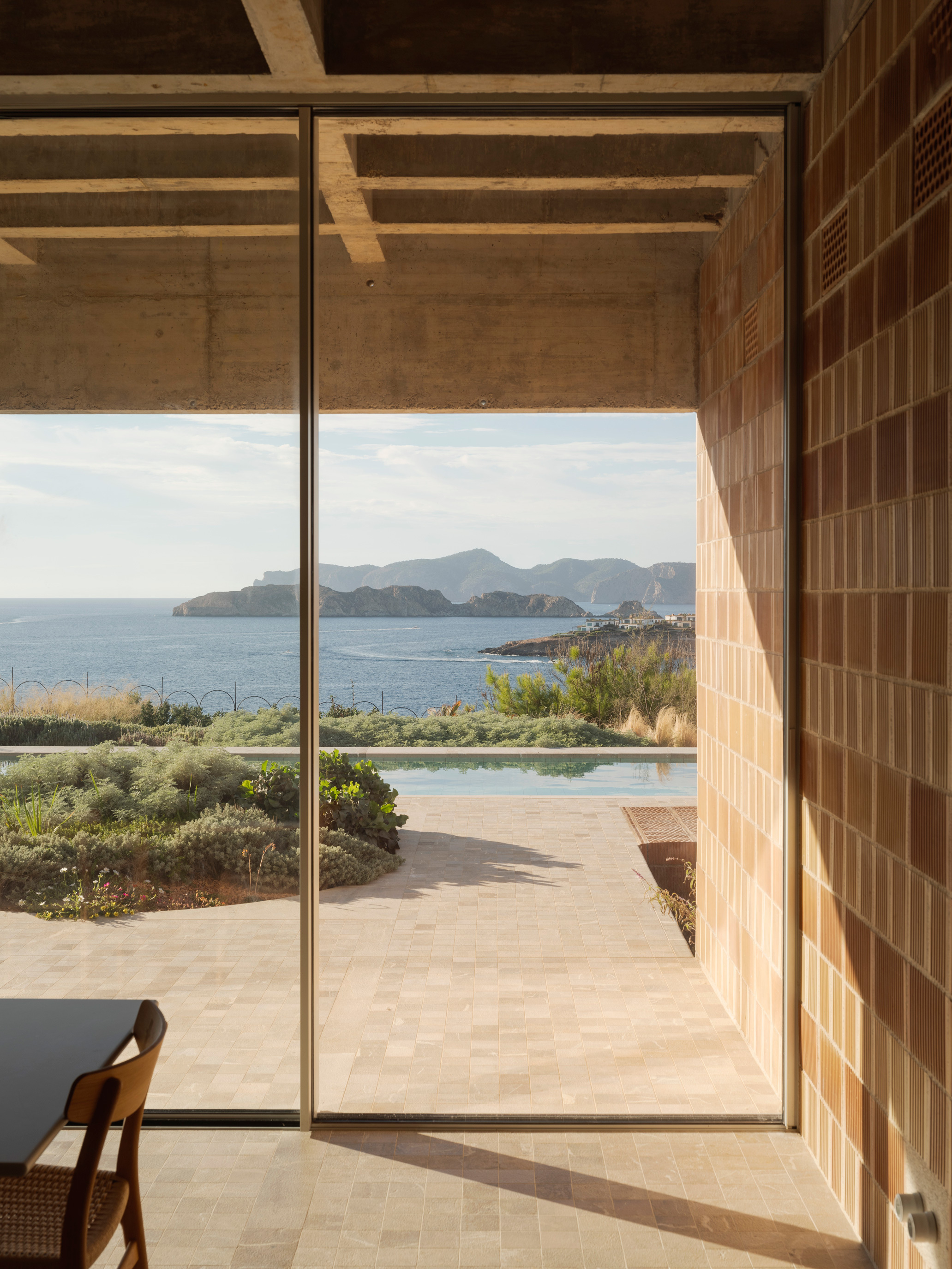 Dve paralelné steny rámujú výhľady na more a zároveň poskytujú súkromie. Dôležitá je konštrukčná úprimnosť. Tri vrstvy režného muriva vytvárajú originálnu a funkčnú textúru, ktorá zároveň definuje rozmedzie medzi súkromím a prepojením s okolitým svetom. Výsledkom je sebavedomá, no zároveň subtílna odpoveď na špecifickú krajinu útesu nad morom.