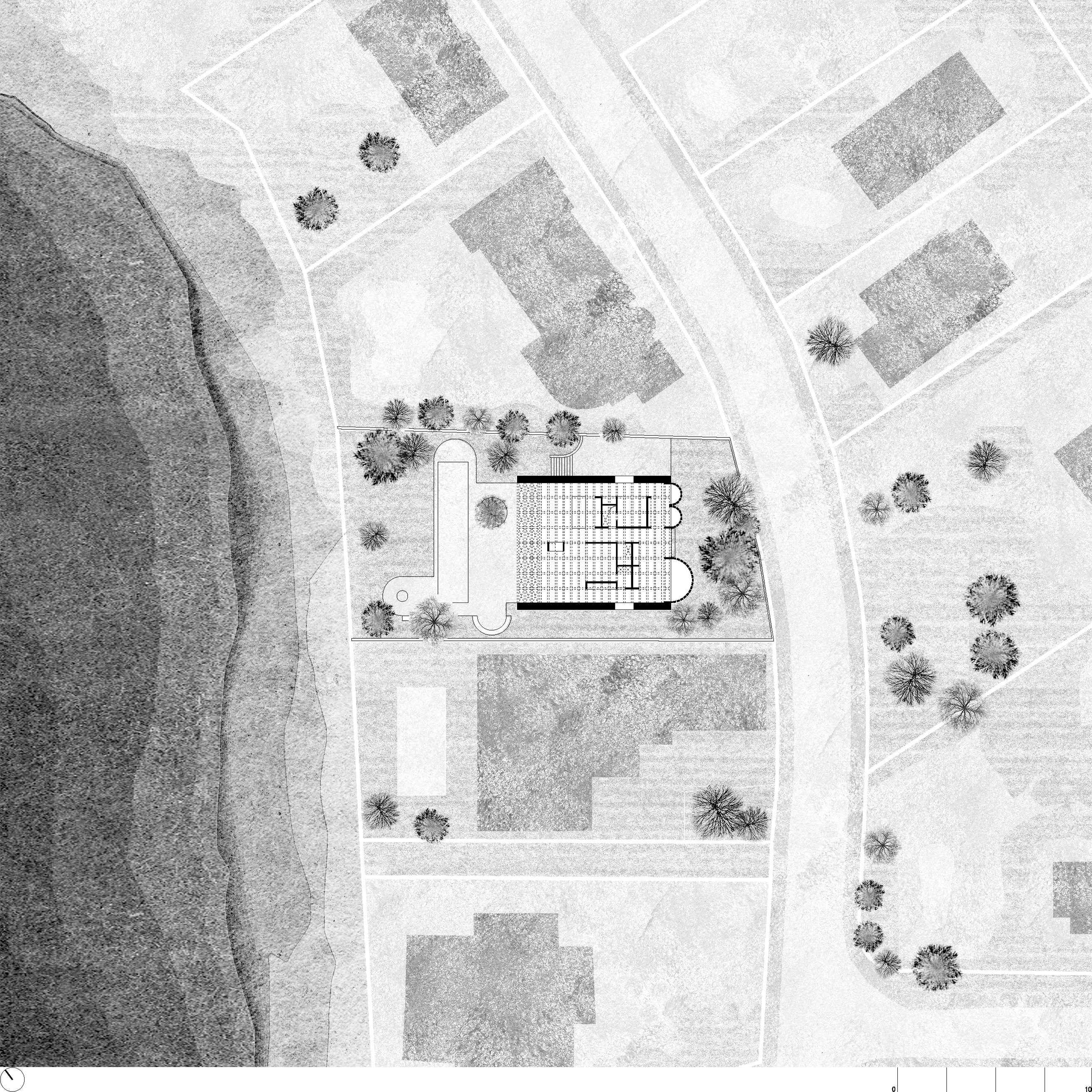 Stavba vznikla na pozemku s plochou približne 800 m² (cca 20 × 40 m), orientovanom v osi východ–západ. Kontrast k striedmej forme domu pri pohľade z ulice tvorí podoba zo strany útesu. Architektúra sa do krajiny otvára do krajiny ako séria terás a medzipriestorov, kde sa život prelína s vonkajším svetom.