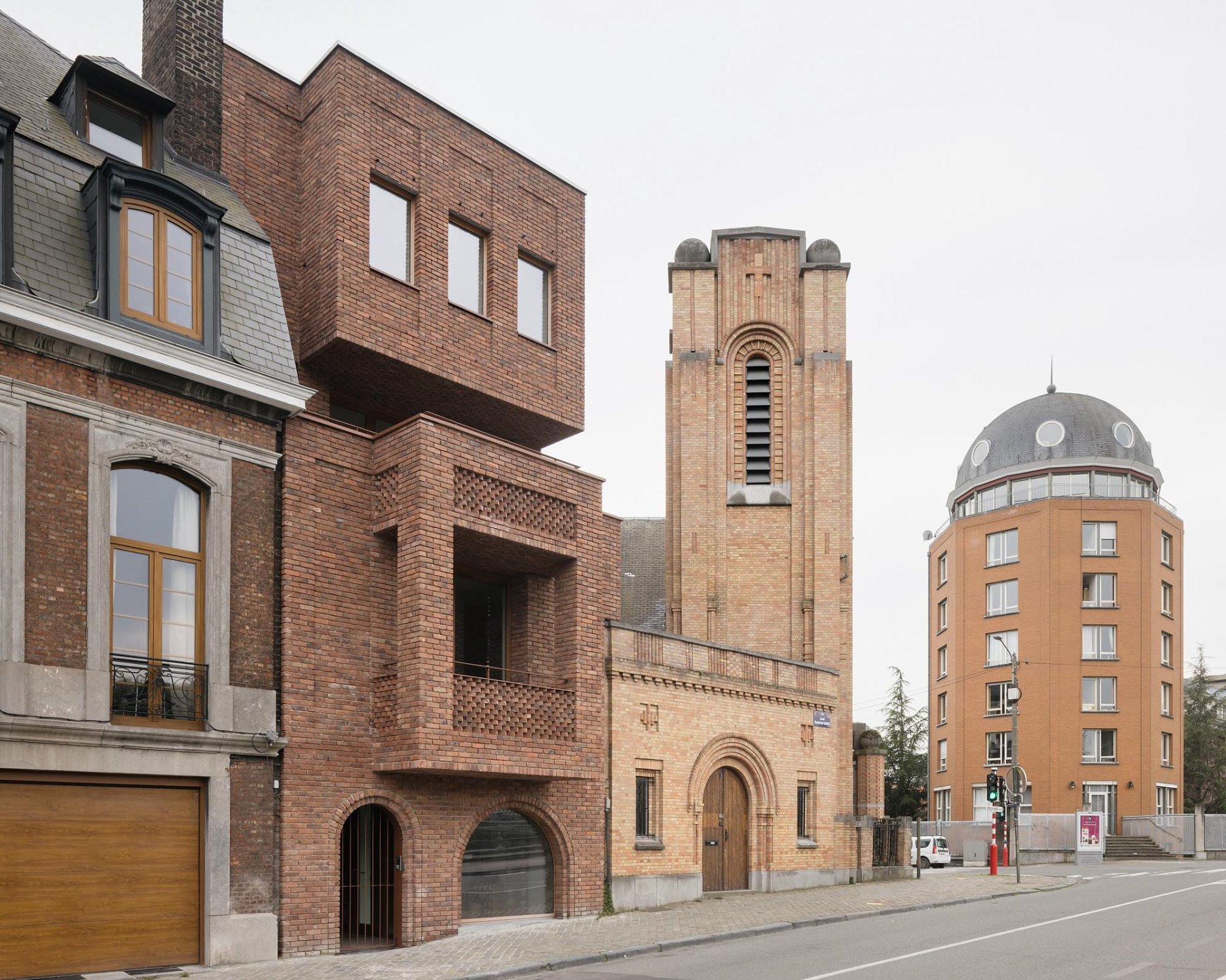 Nový polyfunkčný dom s dvoma bytmi a kanceláriami na nábreží Quai Godefroid Kurth v Lutychu vytvára rafinovaný dialóg medzi minulosťou a súčasnosťou. Skulpturálne tehlové objemy pretvárajú tradičné formy, ako sú arkierové okná, parapety či komíny, pri zachovaní identity jedného materiálu. Výsledkom je odvážne, ale citlivé začlenenie do mestského prostredia medzi neoklasicistickým domom a protestantským kostolom, ktoré odráža modernistické aj ľudové vplyvy.