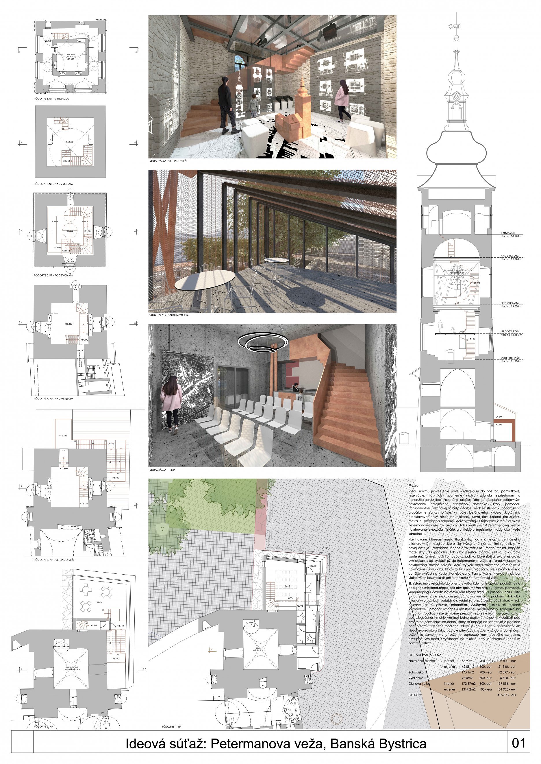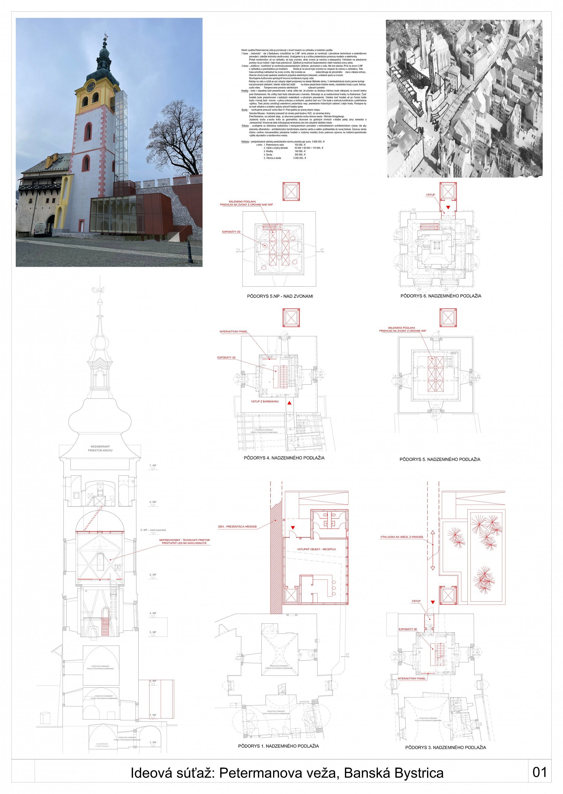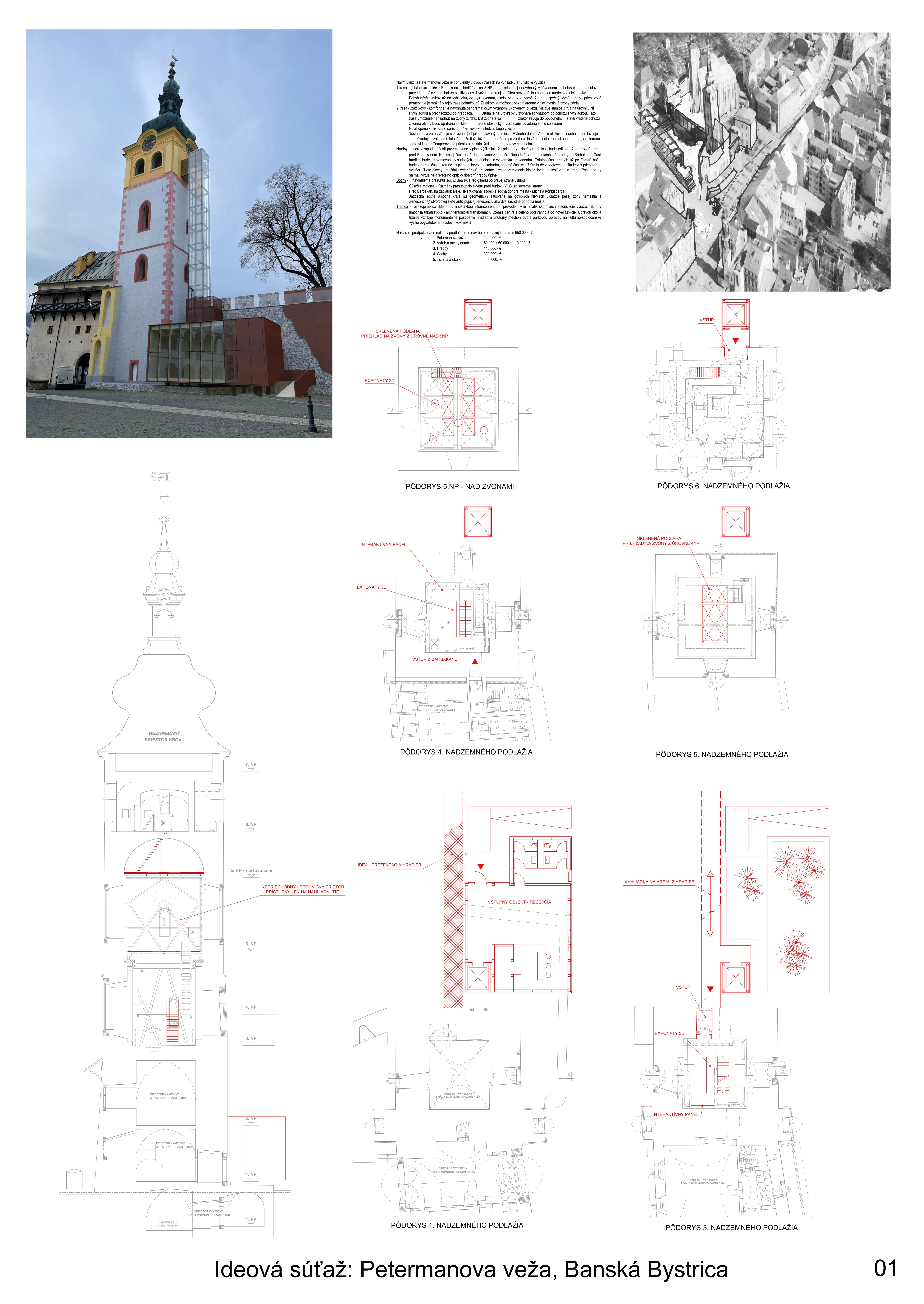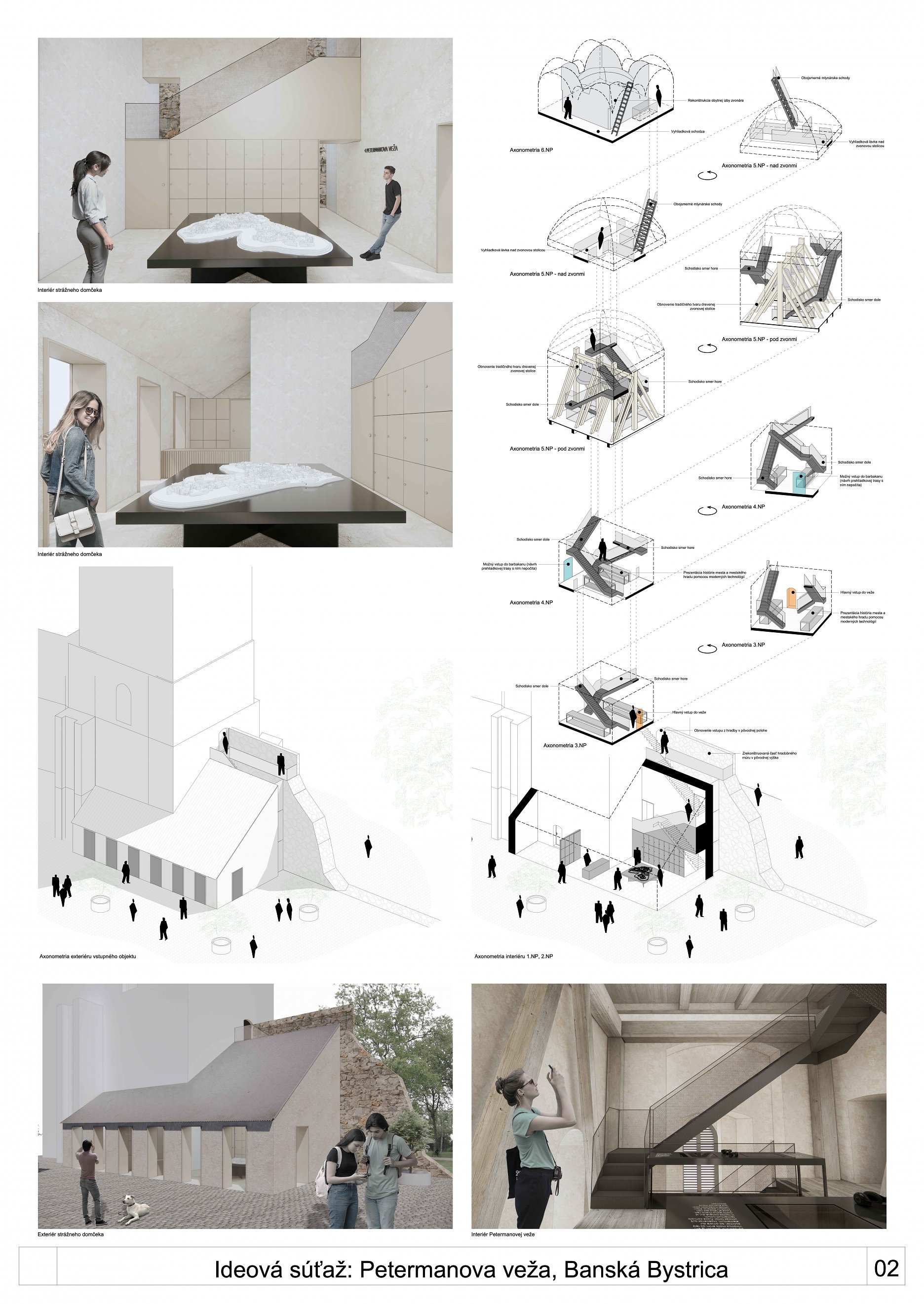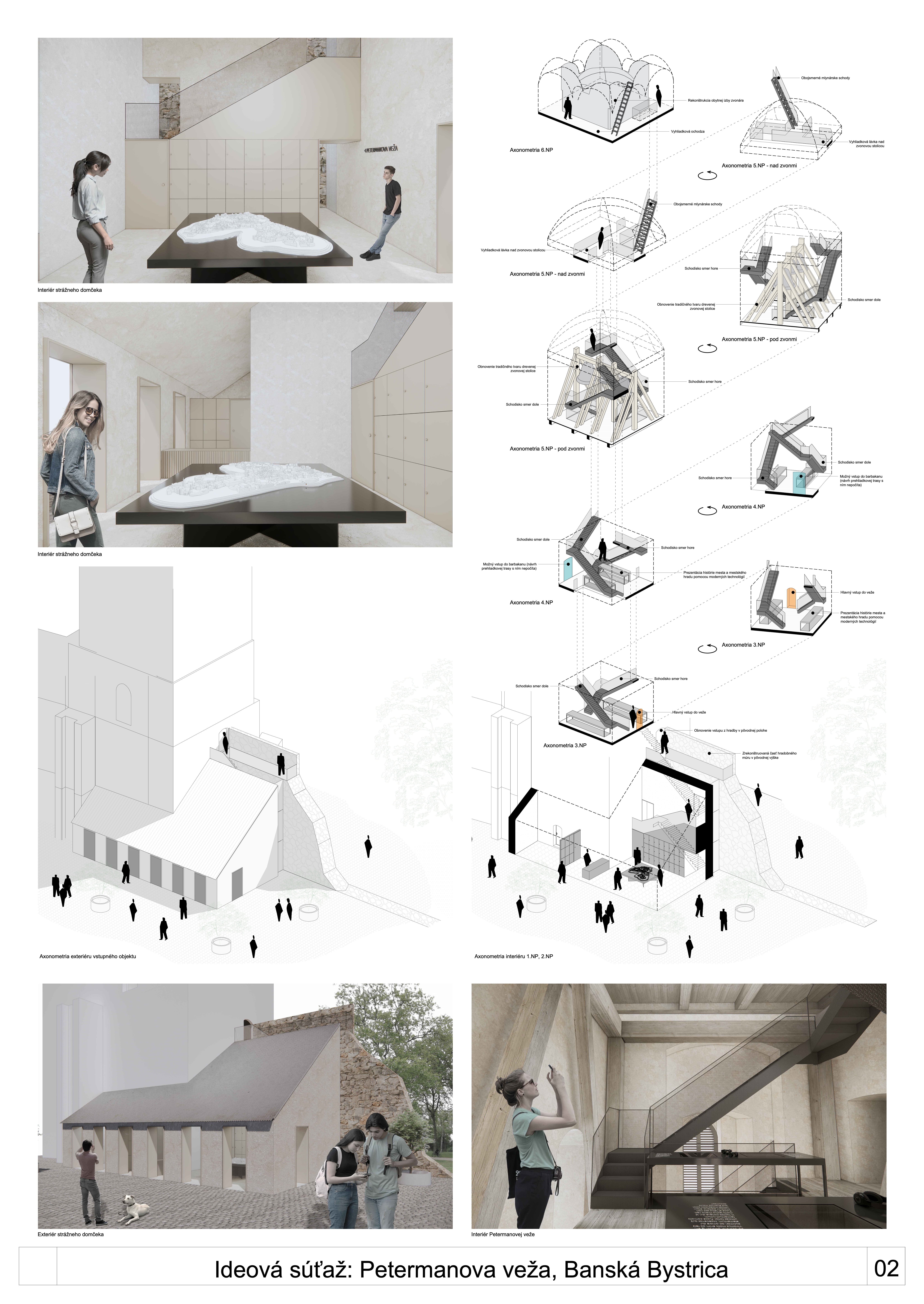 V predloženom návrhu je prezentovaná iba situácia na 3. - 5. NP veže, nie je riešené ani  sprístupnenie úrovne vyhliadky pod jej strechou. To je popísané iba v texte (prístup na 6.NP -  doplneným sekundárnym rebríkovým schodiskom).