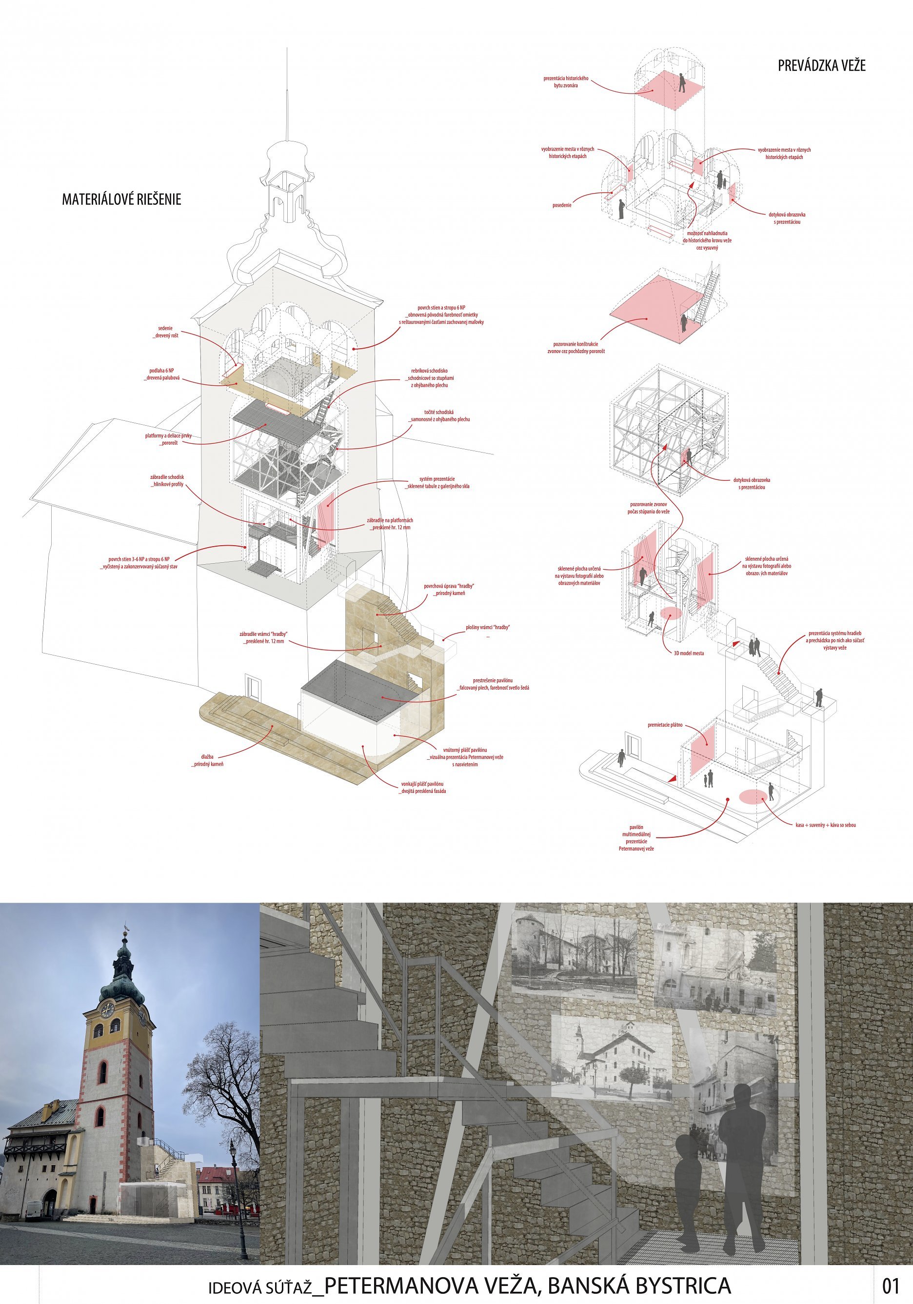 • Zdvojené široké točité schodisko, ktoré nesie integrované súčasti expozície a súčasne je  vyhliadkovým prvkom veže. Je spojnicou medzi najnižším bodom v 3. NP v mieste niekdajšieho  vstupu do veže a najvyšším bodom v 5. NP pod zvonmi. V návrhu je prezentovaný model dreveného  špirálového schodiska s trajektóriou expozície zdola - nahor, zhora - nadol a späť, ktoré je vsadené  do priestorovej oceľovej konštrukčnej mriežky.