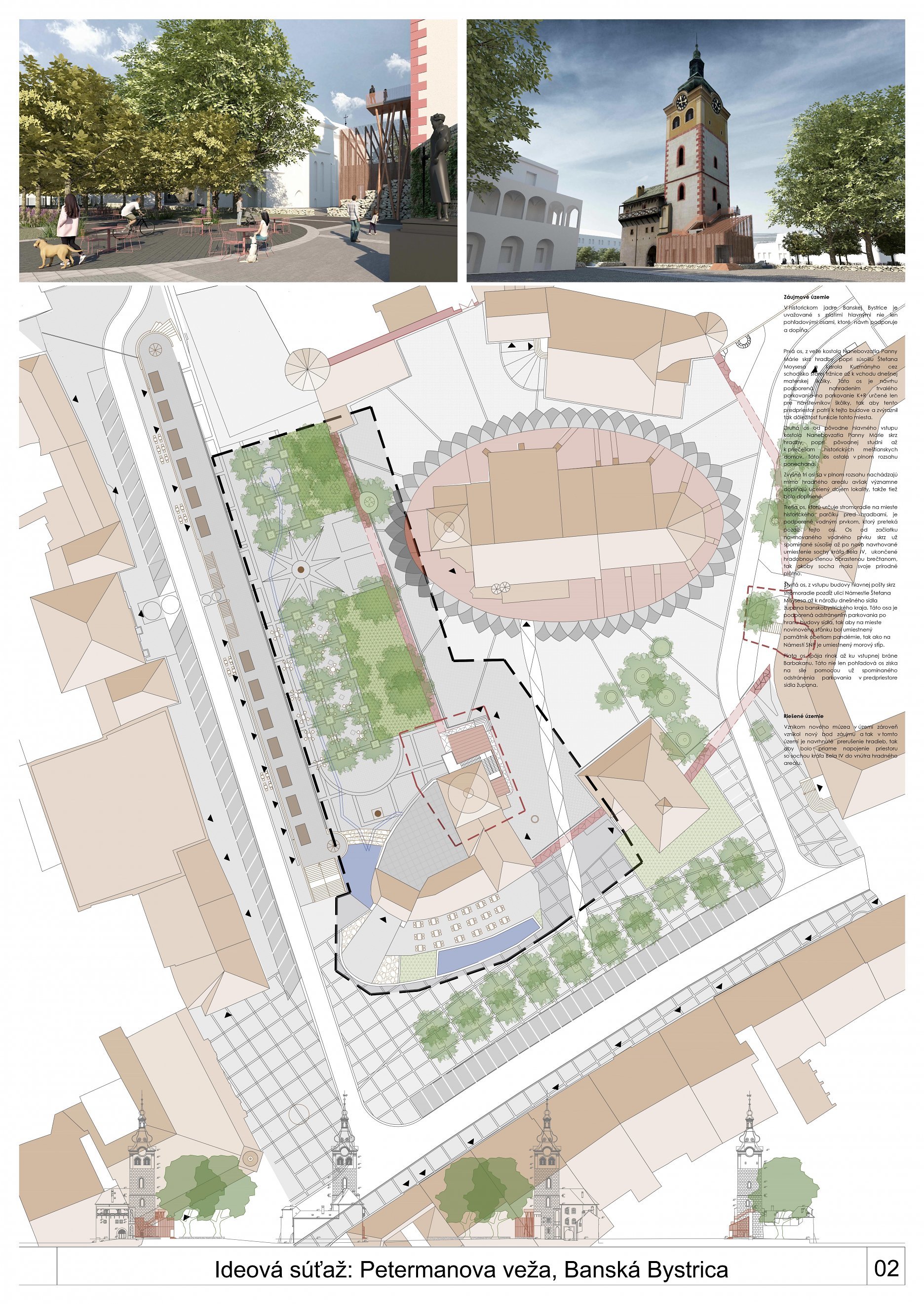 Návrh pôsobí spomedzi všetkých návrhov najpriateľskejšie k okoliu a k pamiatke, prístavba (vstupný objekt) veže je navrhnutá primerane a citlivo. Predložené riešenie má potenciál sa rozvíjať, prístupy  a prepojenia priestorov sú navrhnuté vhodne.