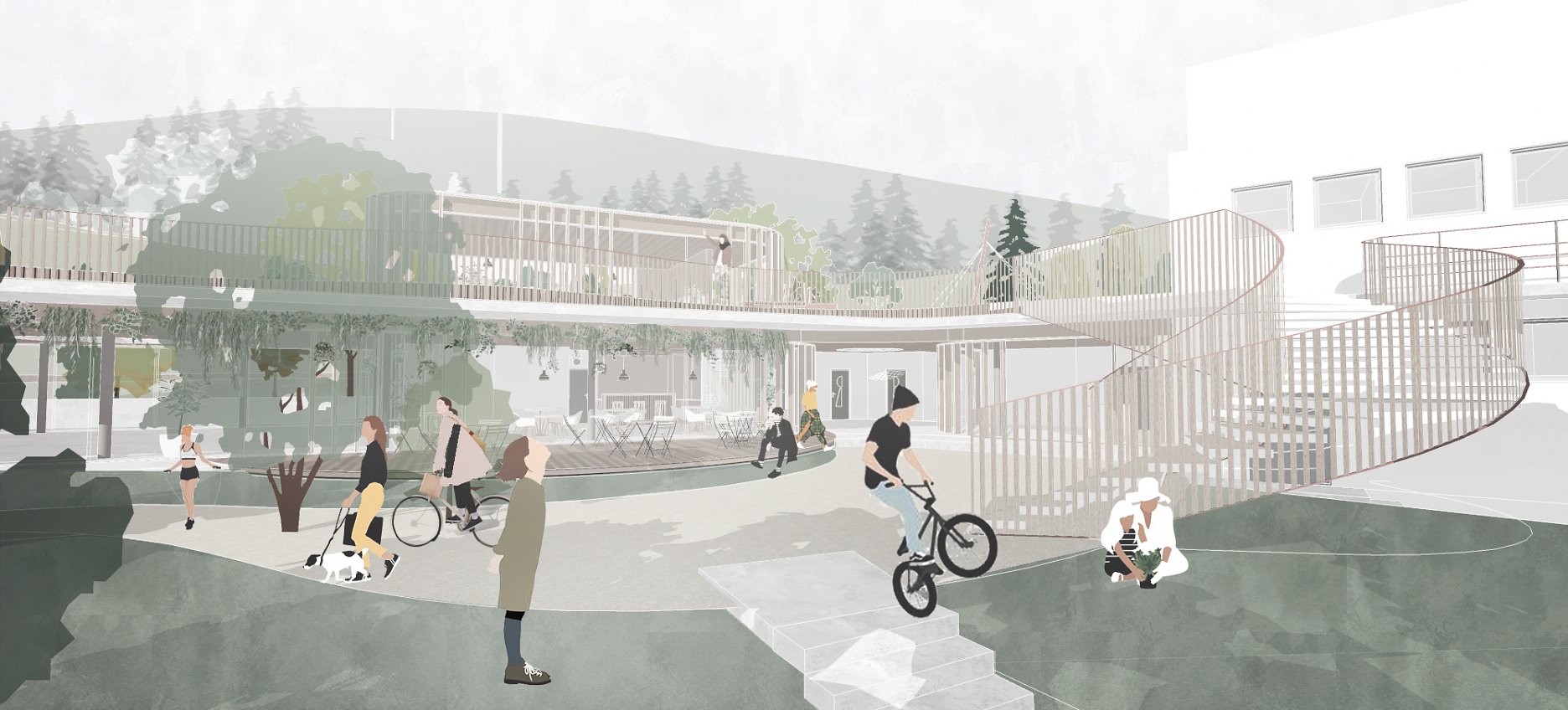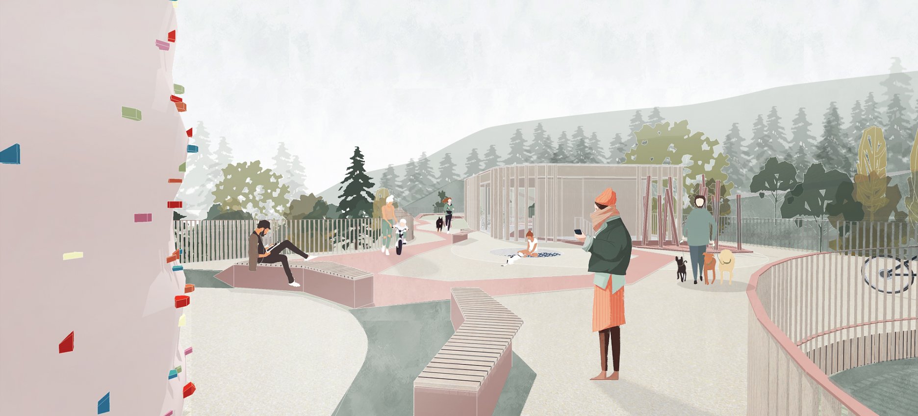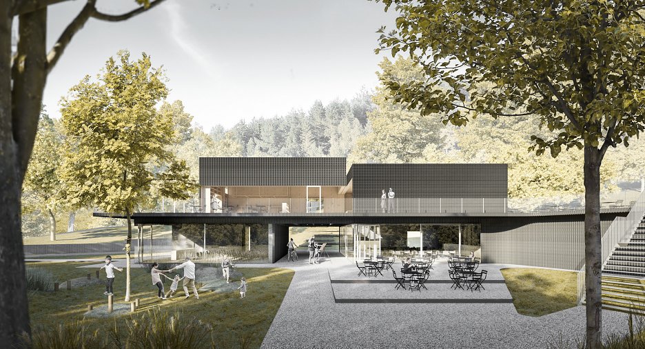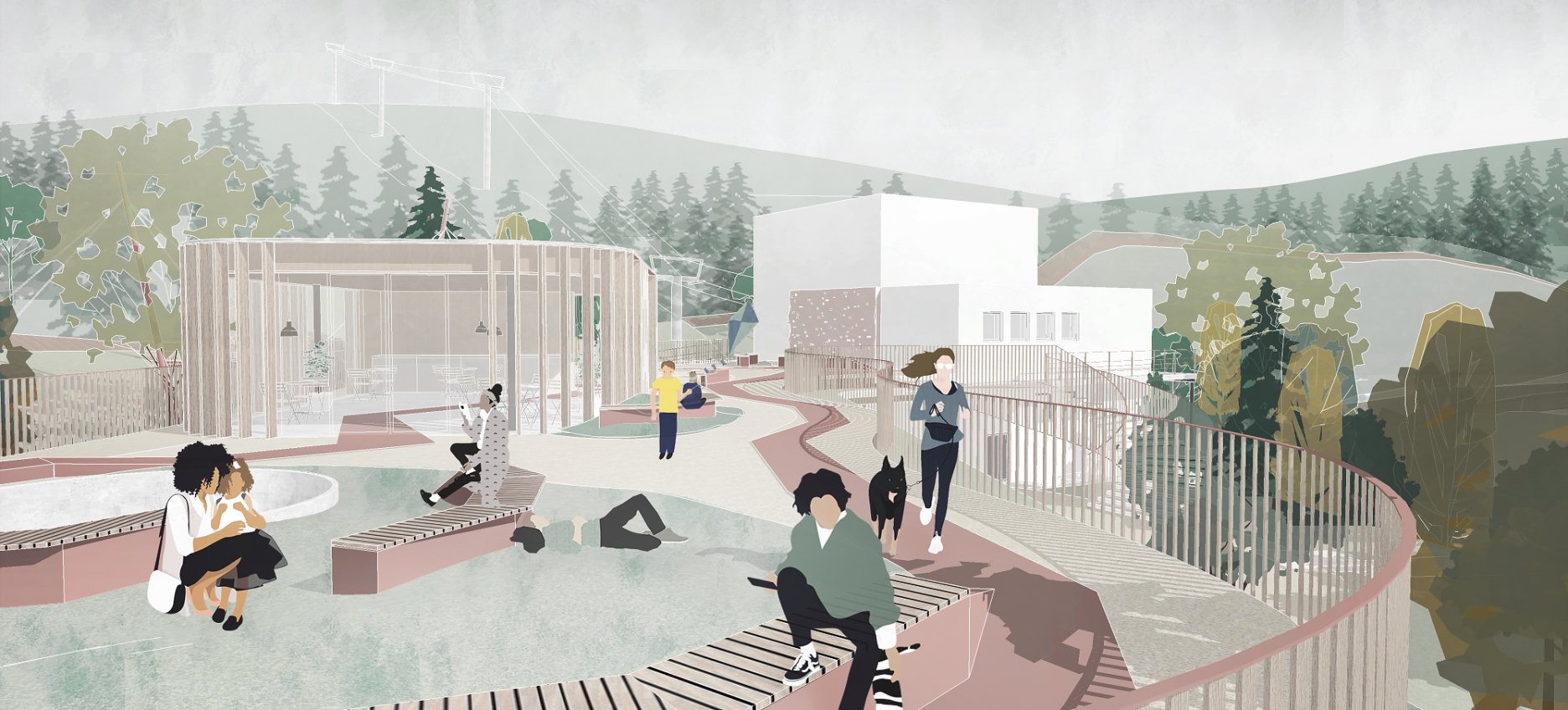 Dolná stanica lanovky je v návrhu exponovaná do podoby solitéru technickej stavby.