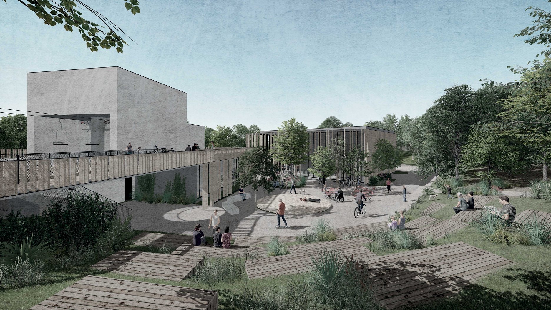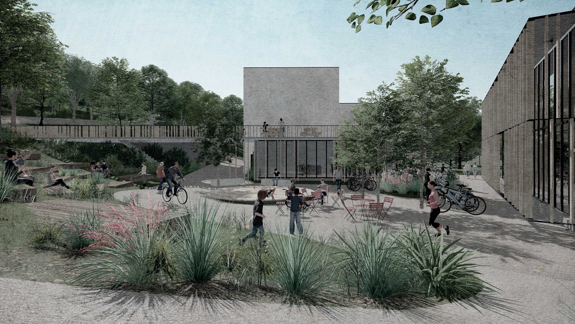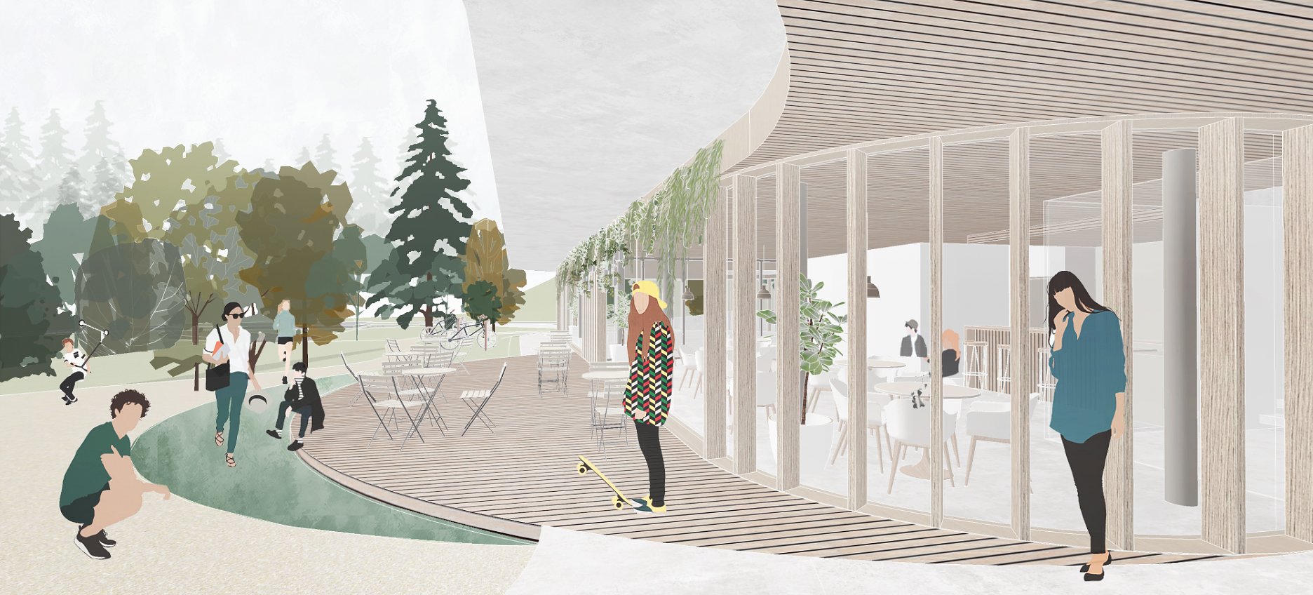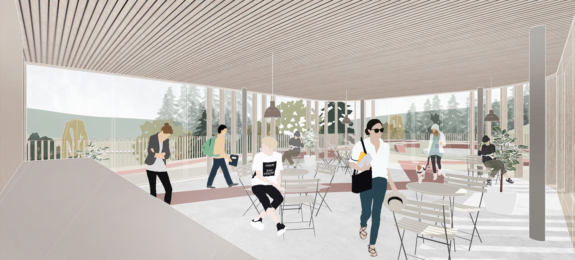 Dolná stanica lanovky je v návrhu exponovaná do podoby solitéru technickej stavby.