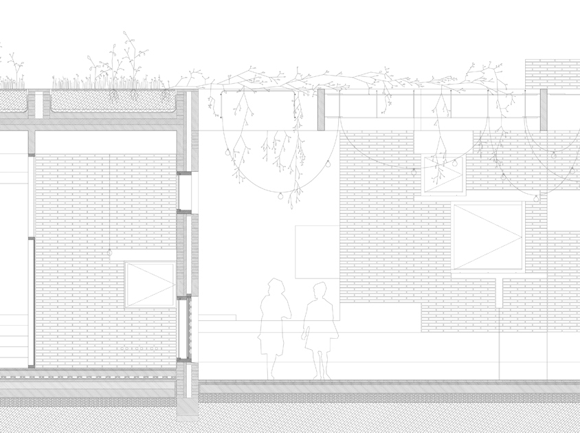 Solídnej materialite plnej tehly sekundujú vzdušné predsadené fasády novostavby. Efekt polotransparentného plášťa dosiahli architekti plochým uloženým dutých keramických tvaroviek, ktoré v tomto prípade nemusia plniť nosnú funkciu. Výrazný geometrický raster pokračuje v podobe deliacich priečok aj v interiéri. Fyzicky oddelené, ale opticky prepojené priestory spadajú do filozofie návrhu otvorenej vzdelávacej inštitúcie.
