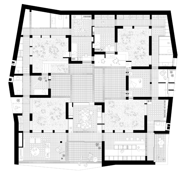 Rodinný dom, v svahovitom vnútrozemskom teréne Malorky, je súdobou interpretáciou klasického archetypu miestneho átriového domu (Za plochými fasádami ukryté arkády, verandy, terasy..) Striktná vonkajšia geometria, vymedzená štvorcovým pôdorysom, obohnaným betónovými múrmi, ukrýva bohatý vnútorný svet átrií a polootvorených obytných miestností. Architekti sa snažia obrúsiť rozhranie interiér – exteriér a vytvoriť celoročne využiteľný priestor, tienený zelenými pergolami. Ďalšou z priorít bolo začlenenie stavby do krajiny. Odpoveďou je miestny kameň, ako súčasť obvodových stien, zelené strechy, a zemitá farebnosť murovaných konštrukcií. V interiéroch sú murované steny natreté bielou farbou, v exteriéri je ich jasný zemitý tón zjemnený zemitými prímesami.