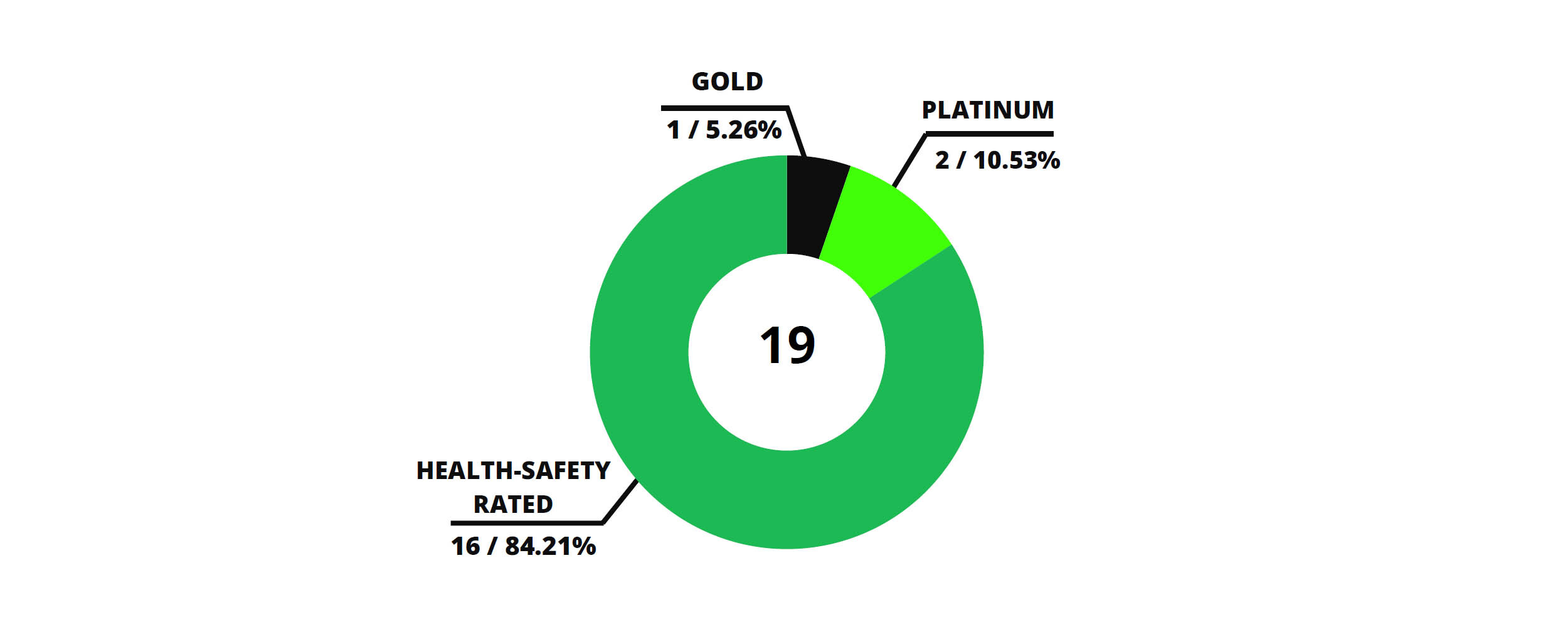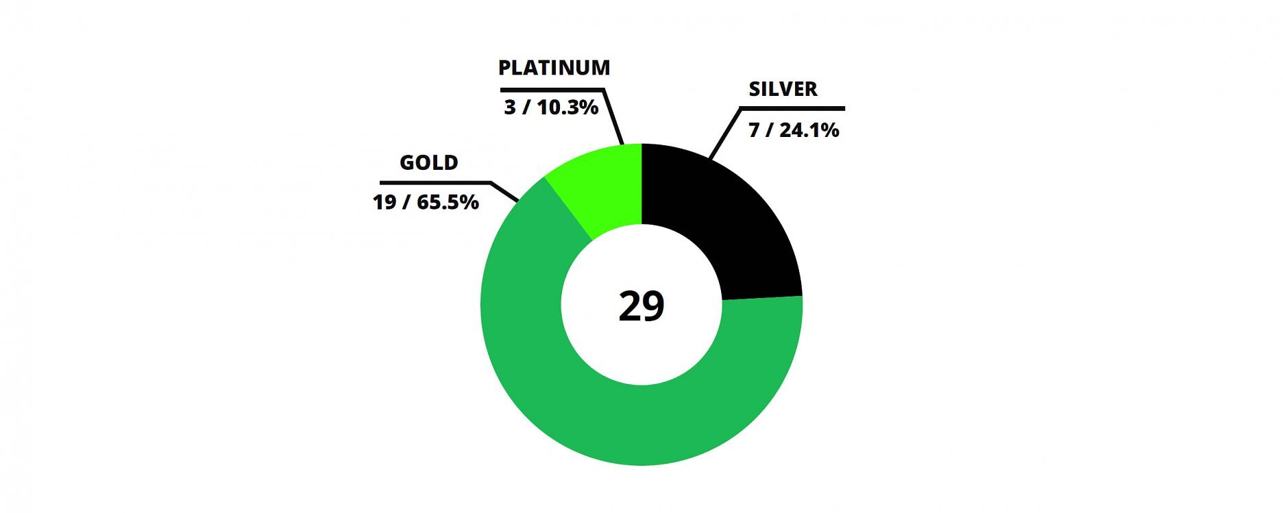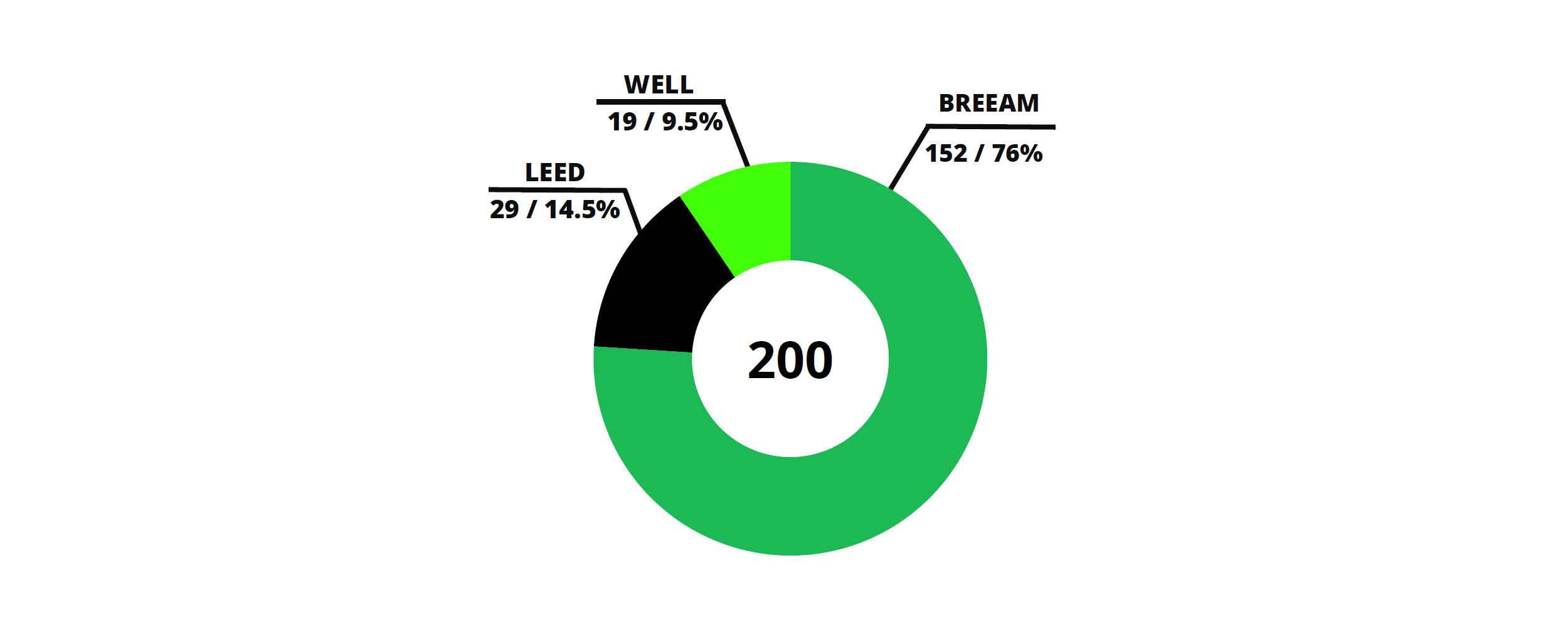 Certifikované sú primárne budovy, pri ktorých nie je známy nájomca (Core and Shell). Práve v tejto skupine sa nachádza 17 administratívnych budov, pričom aj (zatiaľ) jediný certifikovaný hotel má LEED certifikát.