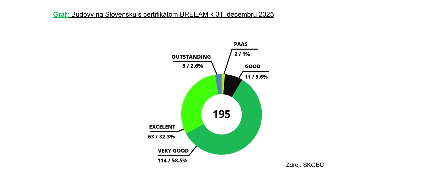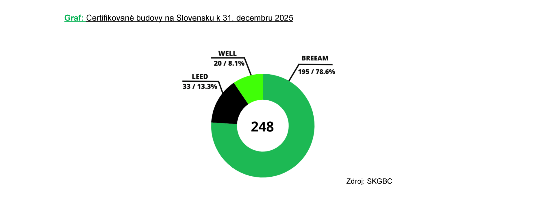 Ku koncu roka 2025 sme na Slovensku evidovali 141 budov, ktoré bodli certifikované počas prevádzky (56,9 %) a 107 novostavieb certifikovaných pred uvedením do užívania.