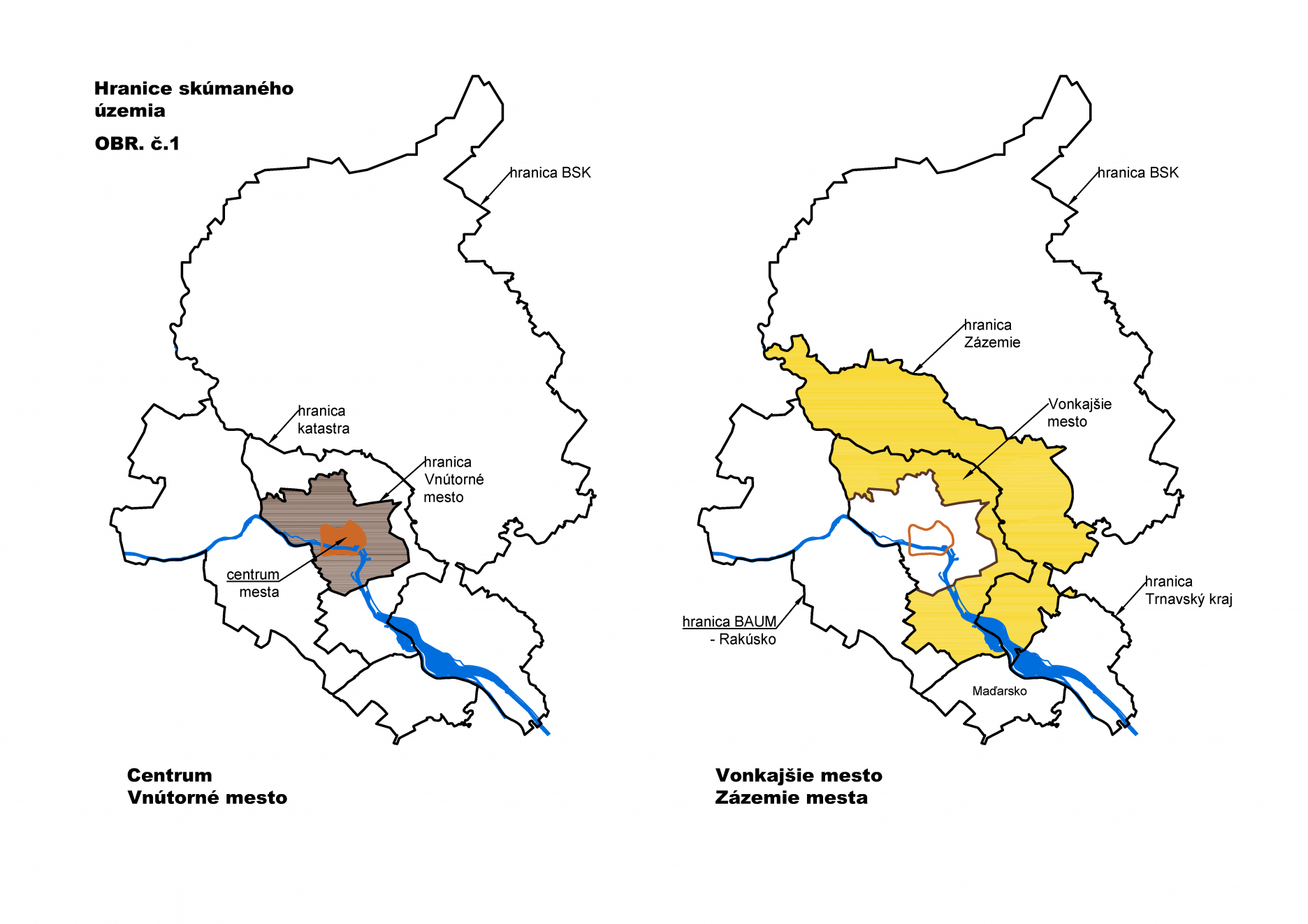 Bratislava a zázemie mesta - je znázornená na úvodnom obrázku - obálke. Vymedzenie územia vychádza zo súčasného stavu a predpokladaného vývoja zázemia mesta. Je to časť aglomerácie Bratislavy, ktorá je pomerne riedko zastavaná a nadväzuje na kataster mesta. Samotné územie katastra mesta Bratislava môžeme podľa charakteru zástavby a urbanistickej štruktúry členiť na: a/ Centrum mesta, b/. Vnútorné mesto a c/ Vonkajšie mesto. Zázemie mesta je rozdelené na 6 častí: pri členení boli dodržané hranice katastrálnych území príslušných obcí. /obrázok č.1/