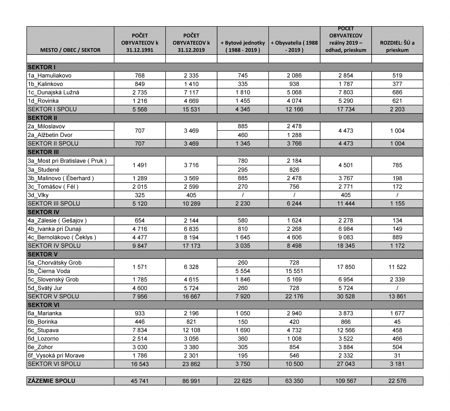Bratislava so zázemím sa stala cieľom dochádzky a aj cieľom pre trvalejší pobyt pre mnohých obyvateľov z celého Slovenska a aj zo zahraničia. Práve vďaka neustálemu prúdeniu obyvateľov do Bratislavy sa stalo jej mestské prostredie dynamickým a rozvíja sa. Najväčším potenciálom mesta sa postupne stávajú ľudia. Koľko obyvateľov, ľudí dnes žije v zázemí Bratislavy? Podľa prieskumu autora je to k 31.12.2018 minimálne 109.546 obyvateľov, hoci údaje ŠÚ SR uvádzajú 83.402 obyvateľov, čo je o viac ako 26 tisíc menej. Prieskum vychádzal z porovnania máp geodézie z roku 1987 a 2018 a zisťovania počtu rodinných a bytových domov, ktoré sa v konkrétnych obciach a mestách v zázemí Bratislavy za 30 rokov postavilo. Údaje zo sčítania z roku 1991 sú známe a stačilo pripočítať prírastok. Počet obyvateľov bol určený obložnosťou 2,8 obyvateľa na jeden byt. Daná metóda je určite presnejšia ako údaje zo SIM kariet. Postavené nové domy sú viditeľné in situ a aj v google maps. Zistený údaj je dôležitý najmä pri prepočtoch, ktoré používajú dopravní inžinieri pri optimalizácii modelov dochádzky do jadra aglomerácie a zdôvodňovaní potreby intervalov použitej prepravy. Tabuľka č.5 zobrazuje zistené údaje v skúmaných obciach, mestách v Zázemí Bratislavy.