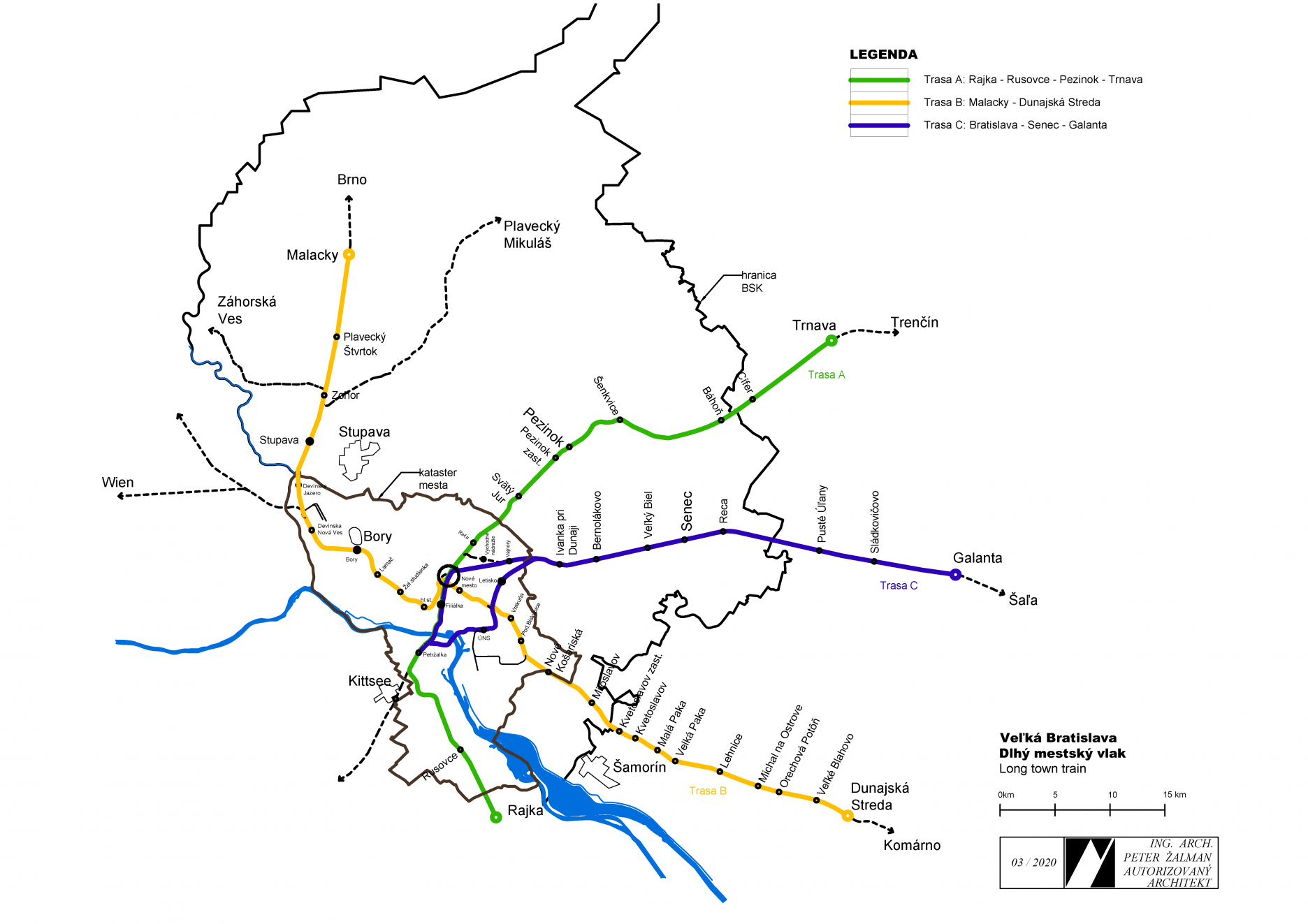 Prezentovaný návrh, obrázok č. 7 a 8 zobrazuje variantu Dlhého mestského vlaku a Krátkeho mestského vlaku, Obe sústavy majú tri základné trasy. Trasa A vedie v smere sever – juh z Pezinka do Rajky (Short Train), alebo v prípade Long Train z Trnavy do Rajky. Trasa B vedie v smere západ – východ zo Zohoru do Šamorína, alebo z Malaciek do Dunajskej Stredy. Trasa C smeruje z východu do Centra Bratislavy formou okružnej trasy. Krátky vlak so Senca, dlhý vlak z Galanty.