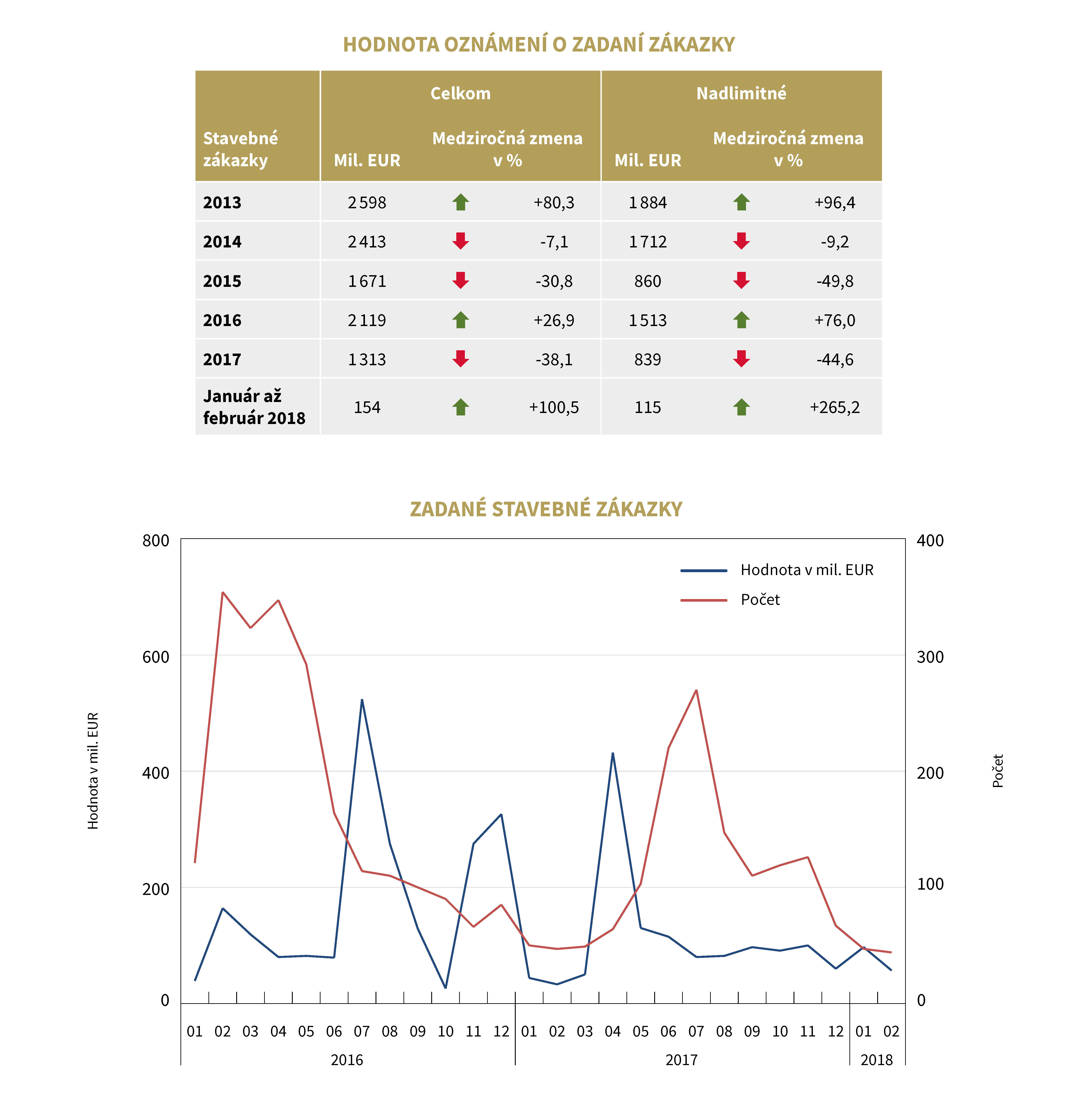 V januári až februári 2018 bolo oznámených 298 verejných stavebných zákaziek, a to v celkovej hodnote 406 mil. EUR. Počet zákaziek vzrástol o 34,8 percenta, no ich hodnota poklesla o 32,1 percenta. V prvých dvoch mesiacoch roka 2018 boli zadané verejné stavebné zákazky za 154 mil. EUR, čo predstavuje nárast o 100,5 percenta.